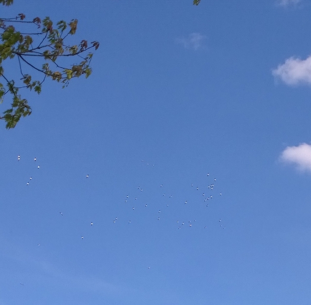 Hard to see but a flock of circling Pelicans