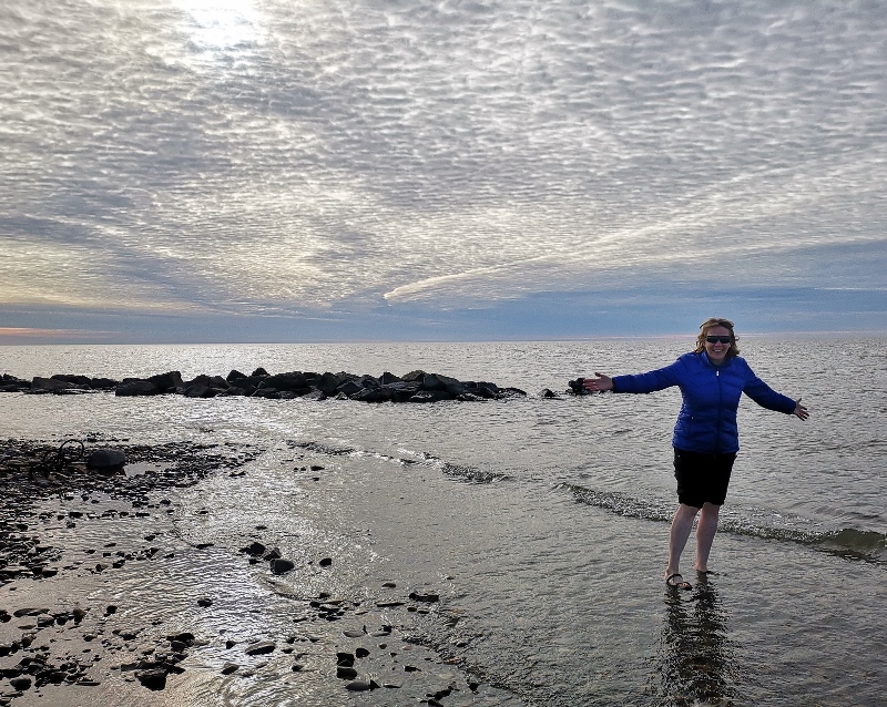 Sharon gets her feet wet in the Arctic Ocean, the water is freezing!