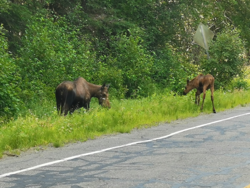 Moose cow and calf along road