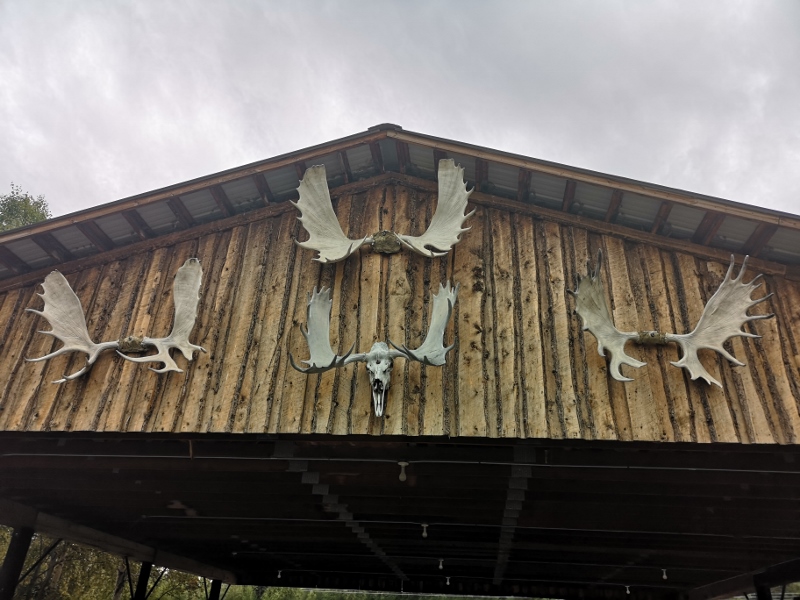 Antler display over airplane hangar