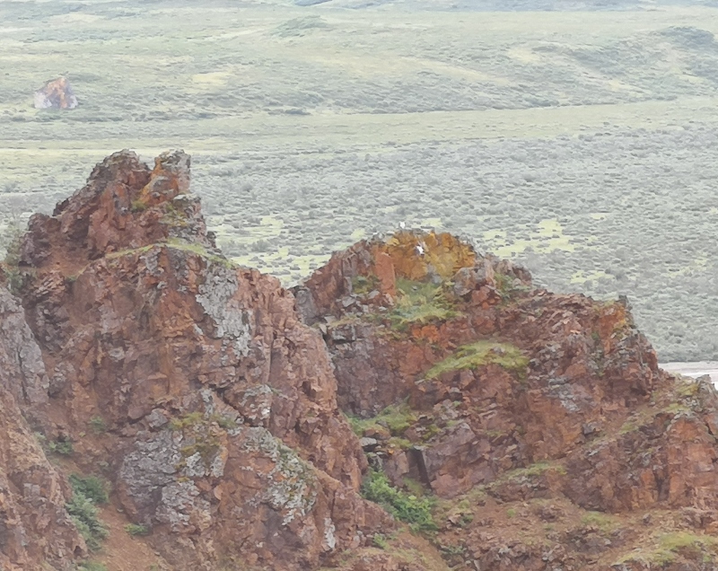 The two white dots on the rock are rare Gyr Falcons