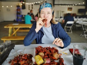 Sharon learns to suck the Crawfish heads for the tastey juices.
