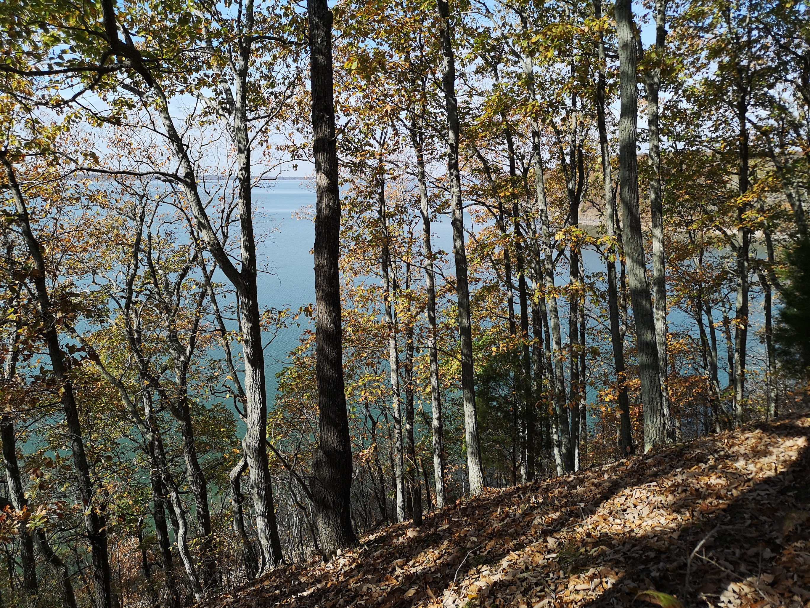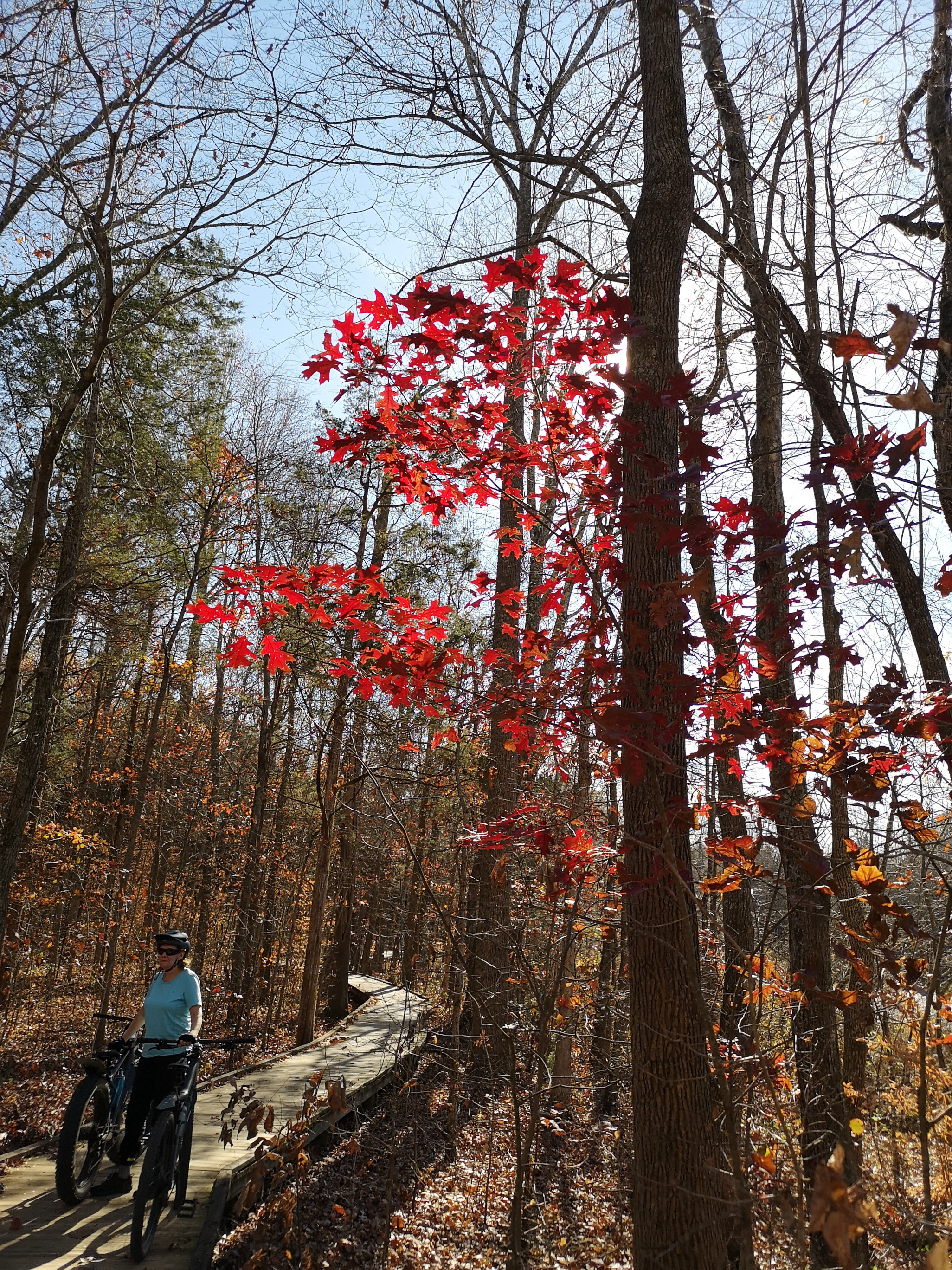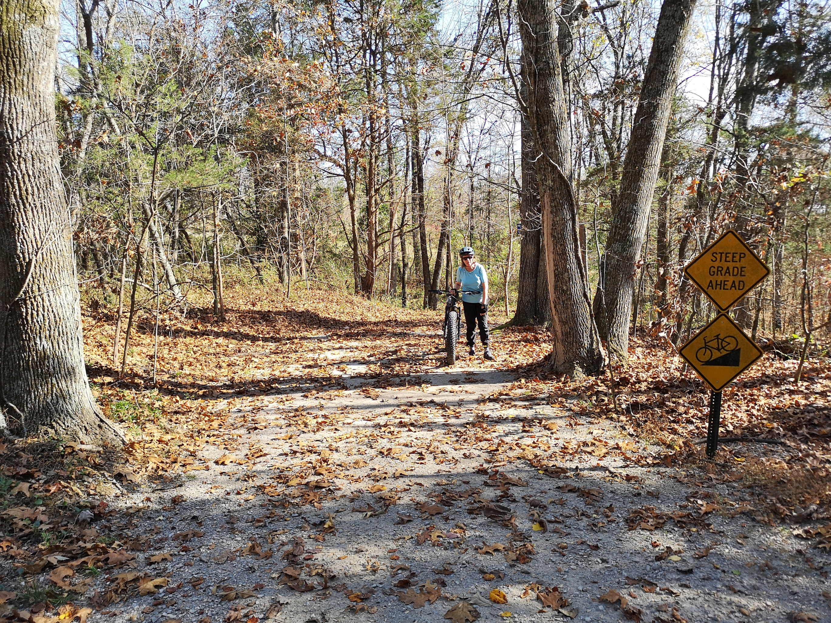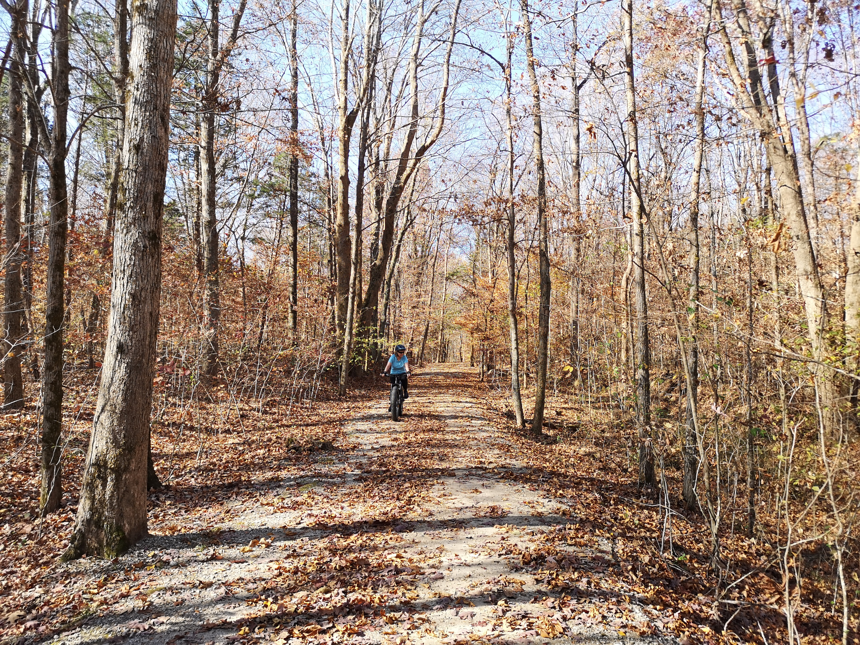 The main MTB trail in the park was the full Canal Loop so we started off the next morning on the 21 km route. The trail is a single-track trail listed as moderate to difficult. We found the sections on the east side of the main road moderate and the sections on the west side difficult. We started off with lots of switch backs and the rocks and roots were a little tricky to see due to most of the leaves having fallen. We found some strange, rusted metal wreckage that almost seemed like part of an aircraft engine? We went along the canal and under the bridge and then on the west side we started to encounter lots of up and downhill sections. Of course, the downhill I found fun but the hike a bike up hills not so much. We also went by a fire lookout tower with some transmitters on it. We had our lunch looking over Kentucky Lake and even saw another barge go by. The trail eventually circled back by the North Visitor Centre and then crossed the road and went back to moderate difficulty. We saw young eagles, turkey vultures, rabbits, armadillo’s, deer, and lots of grey squirrels. Overall, an excellent MTB loop.