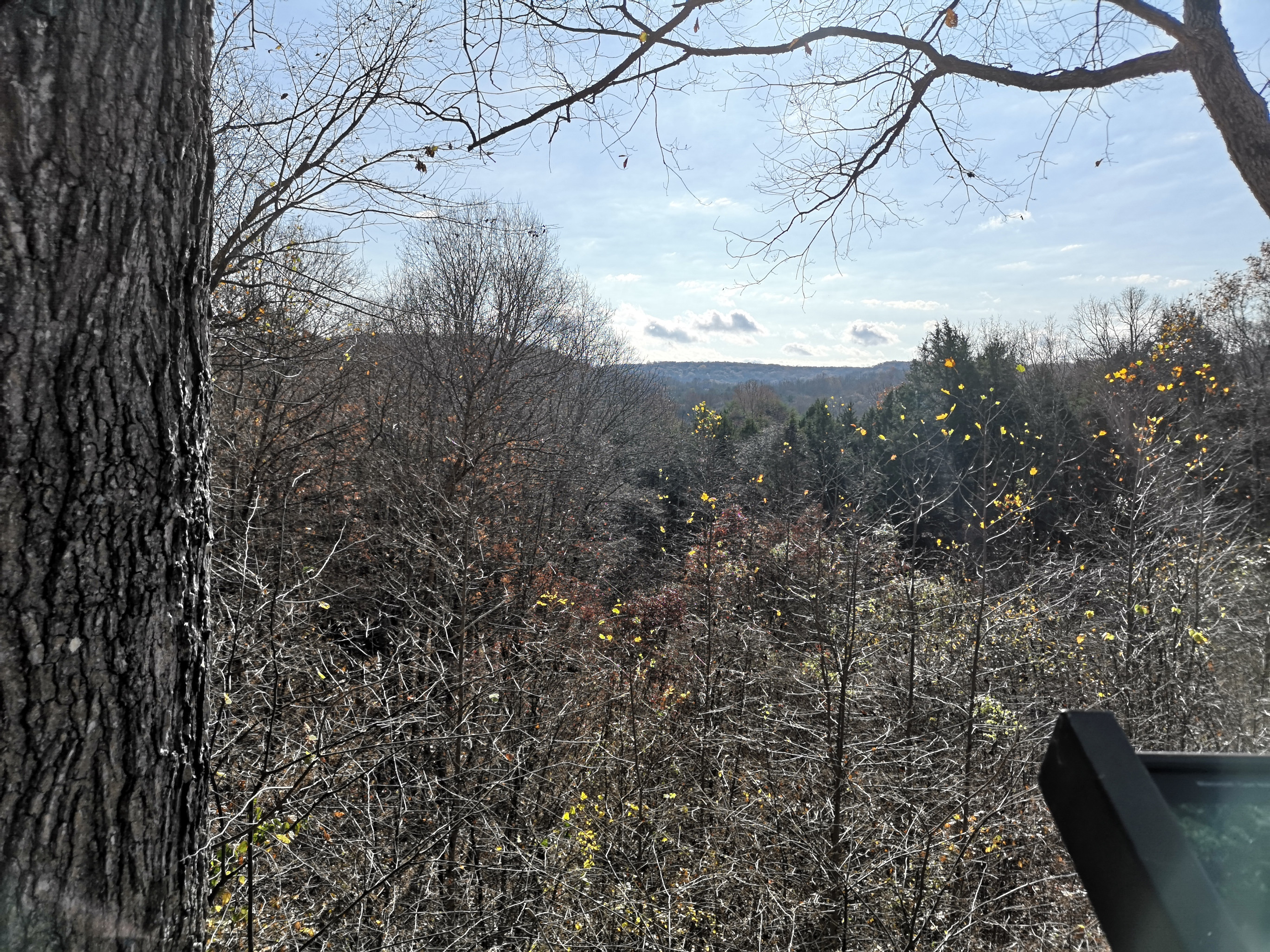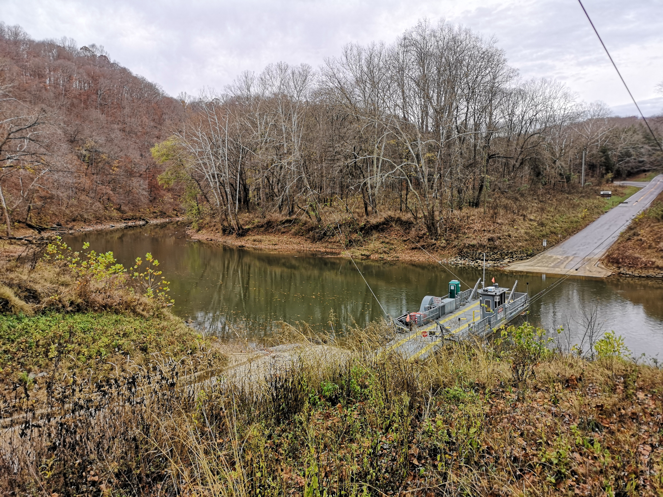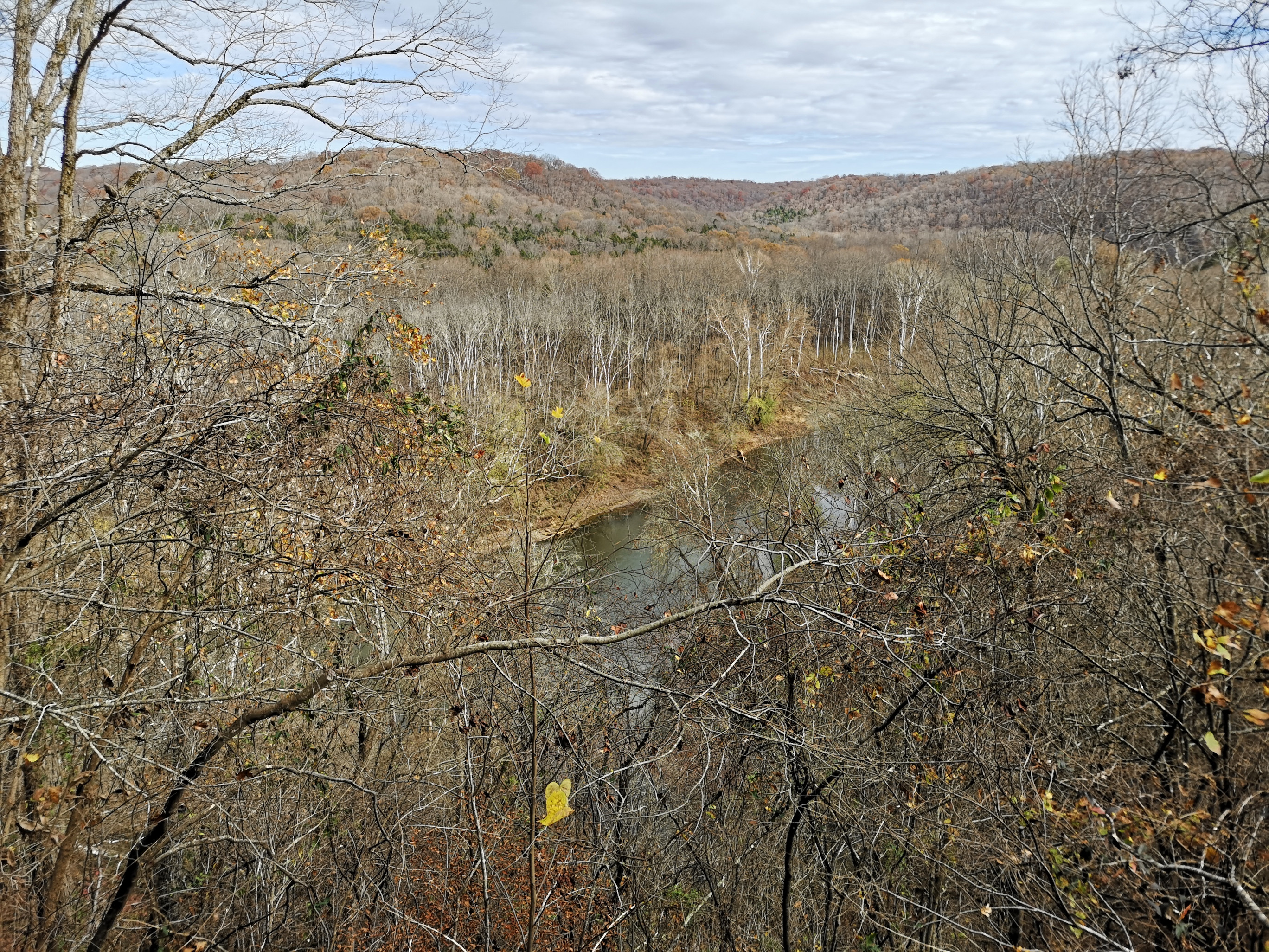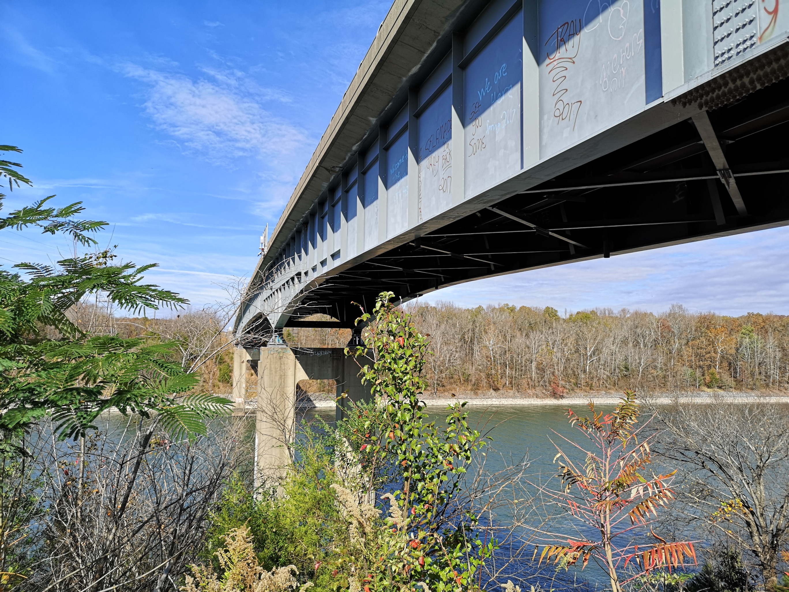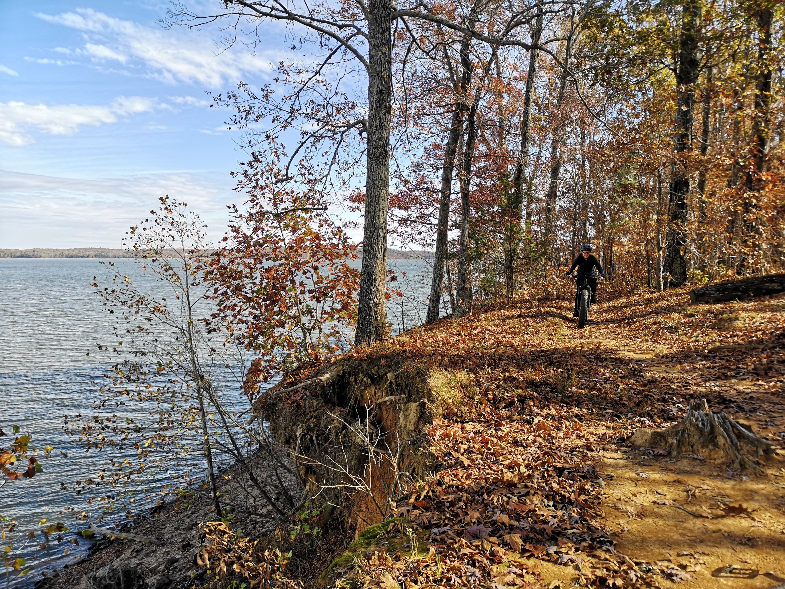The main MTB trail in the park was the full Canal Loop so we started off the next morning on the 21 km route. The trail is a single-track trail listed as moderate to difficult. We found the sections on the east side of the main road moderate and the sections on the west side difficult. We started off with lots of switch backs and the rocks and roots were a little tricky to see due to most of the leaves having fallen. We found some strange, rusted metal wreckage that almost seemed like part of an aircraft engine? We went along the canal and under the bridge and then on the west side we started to encounter lots of up and downhill sections. Of course, the downhill I found fun but the hike a bike up hills not so much. We also went by a fire lookout tower with some transmitters on it. We had our lunch looking over Kentucky Lake and even saw another barge go by. The trail eventually circled back by the North Visitor Centre and then crossed the road and went back to moderate difficulty. We saw young eagles, turkey vultures, rabbits, armadillo’s, deer, and lots of grey squirrels. Overall, an excellent MTB loop.