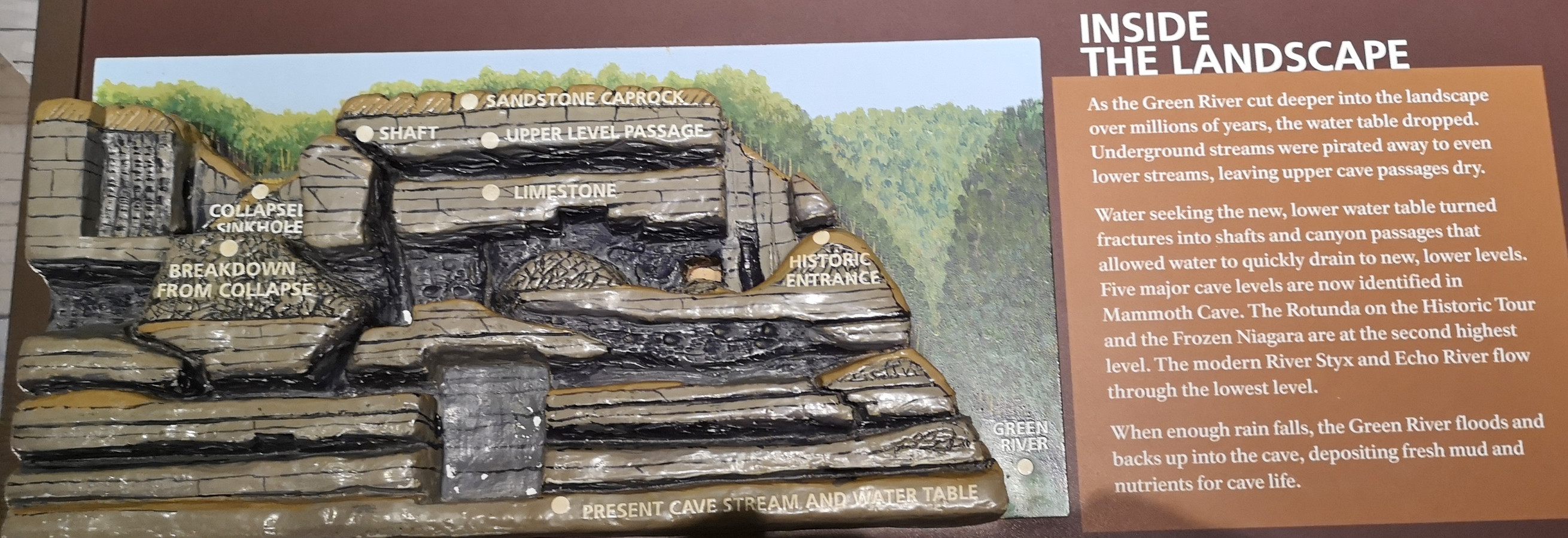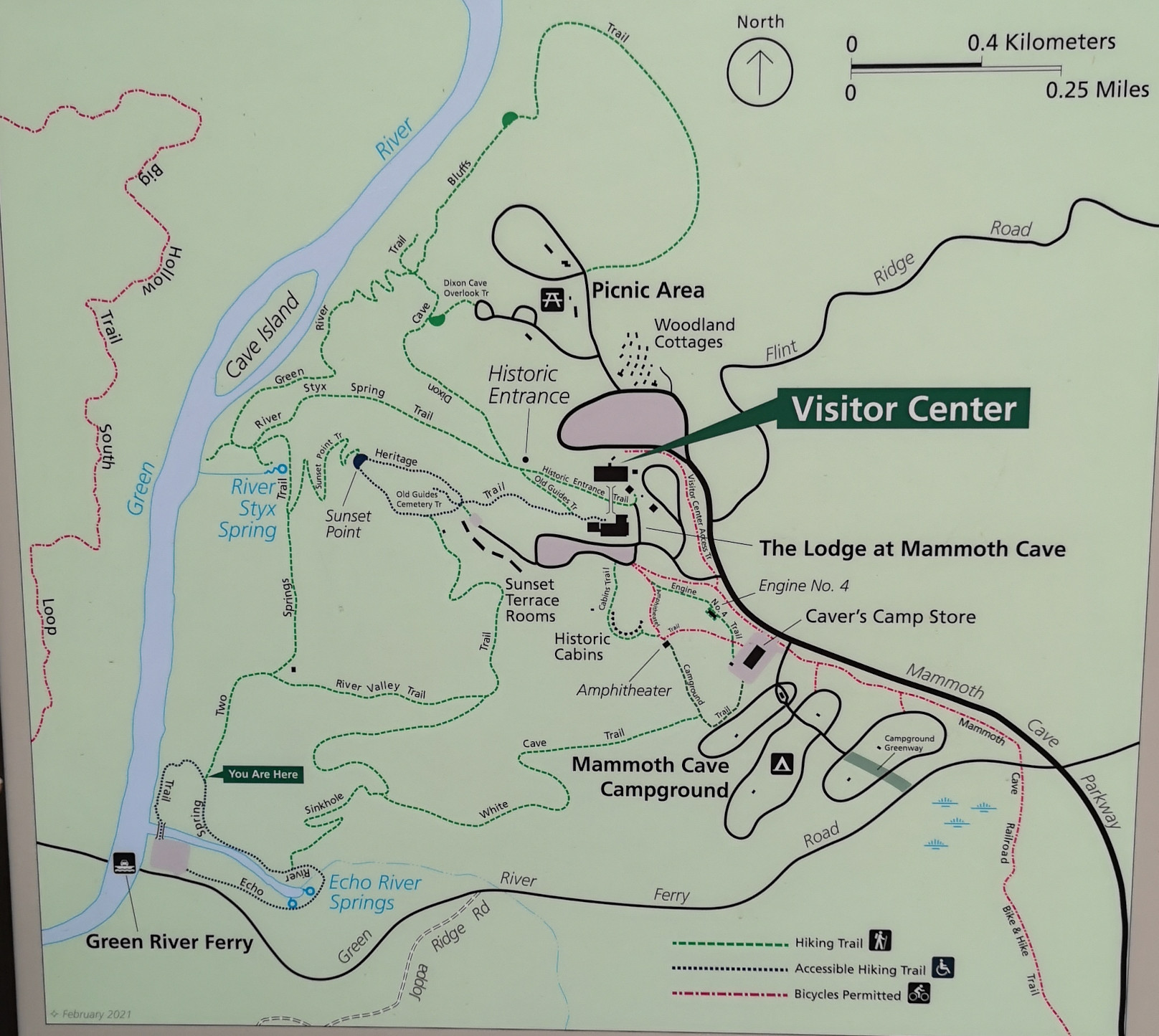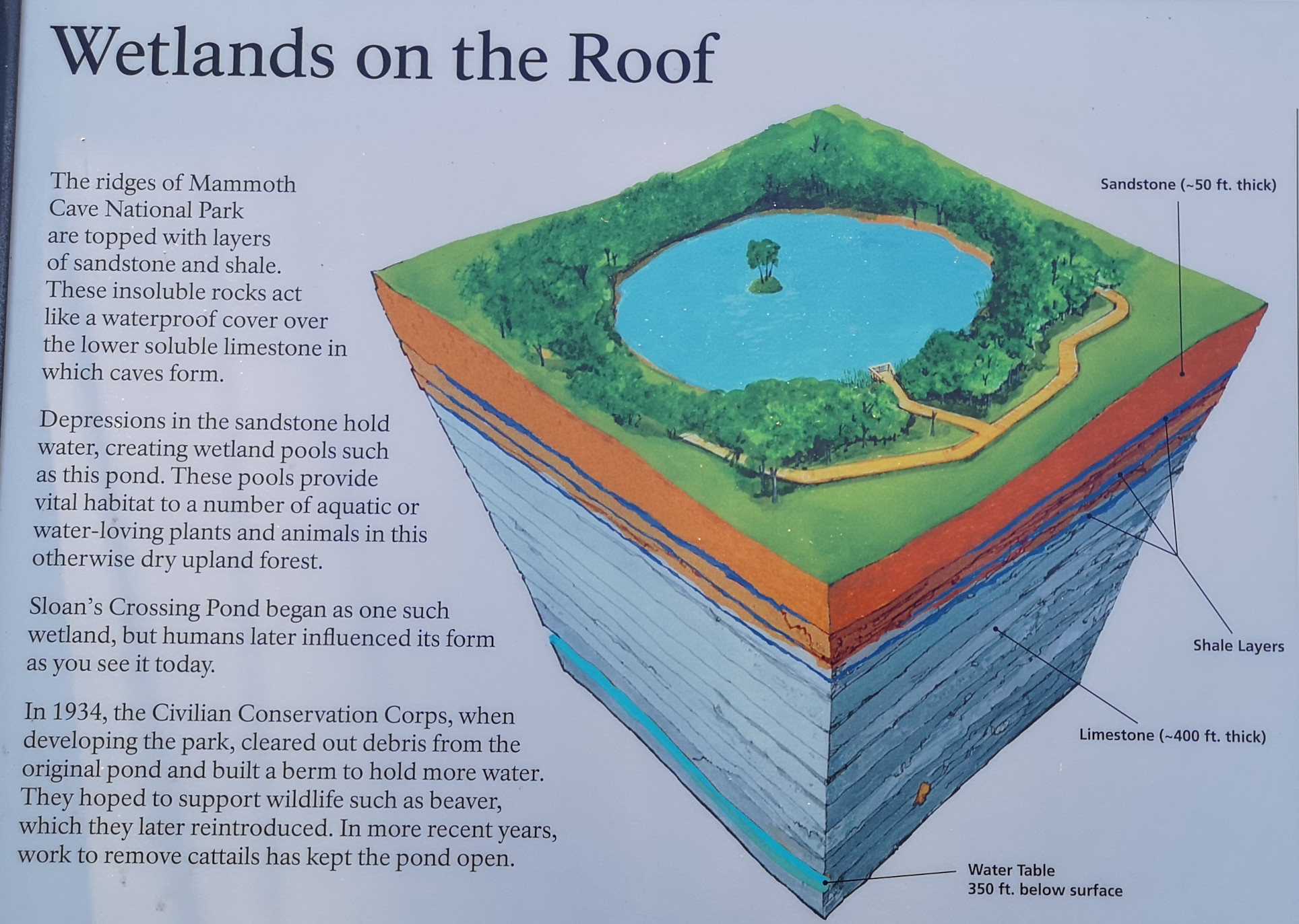We were glad we added an extra day as it was perfect weather for our bike ride along the old Mammoth Cave Railroad trail. It was a nice trail but did have a few very steep hills. That’s when you take the opportunity to enjoy nature and hike your bike up the hill 😊One of the first overlooks was Doyle Valley which was just on the edge of the Appalachian Mountains, so it created quite a challenge for the railway. They built a trestle in 1886 and it was finally demolished in 1961. This valley was mainly farmland prior to the park reverting it to forest. Our next stop was Sloan’s Crossing Pond which was a depression in the sandstone layer above Mammoth Cave where the water could pool creating a wetland. We passed by the Dripping Springs escarpment where you could see the layers of sandstone and limestone and then proceeded down a really long hill (down is fun, up not so much) until we went by Diamond Caverns. We finally made it to the entrance sign and carried on into Park City so we could see the ruins of Bell’s Tavern, where we had lunch. Then we retraced our route all the way back to the campground for a total of 28 kms.