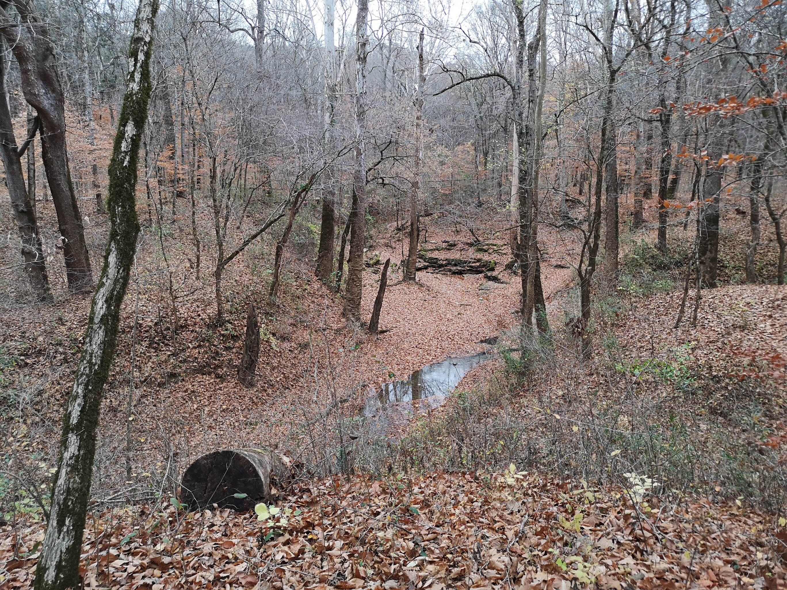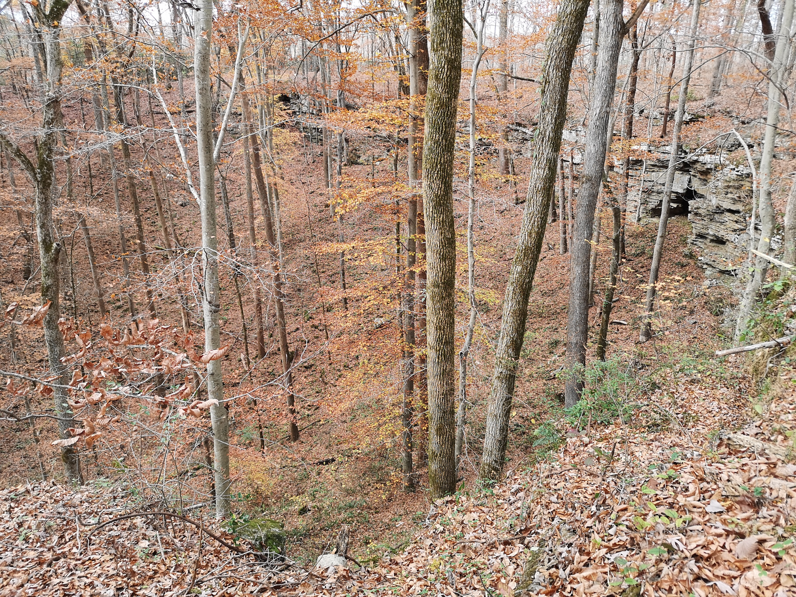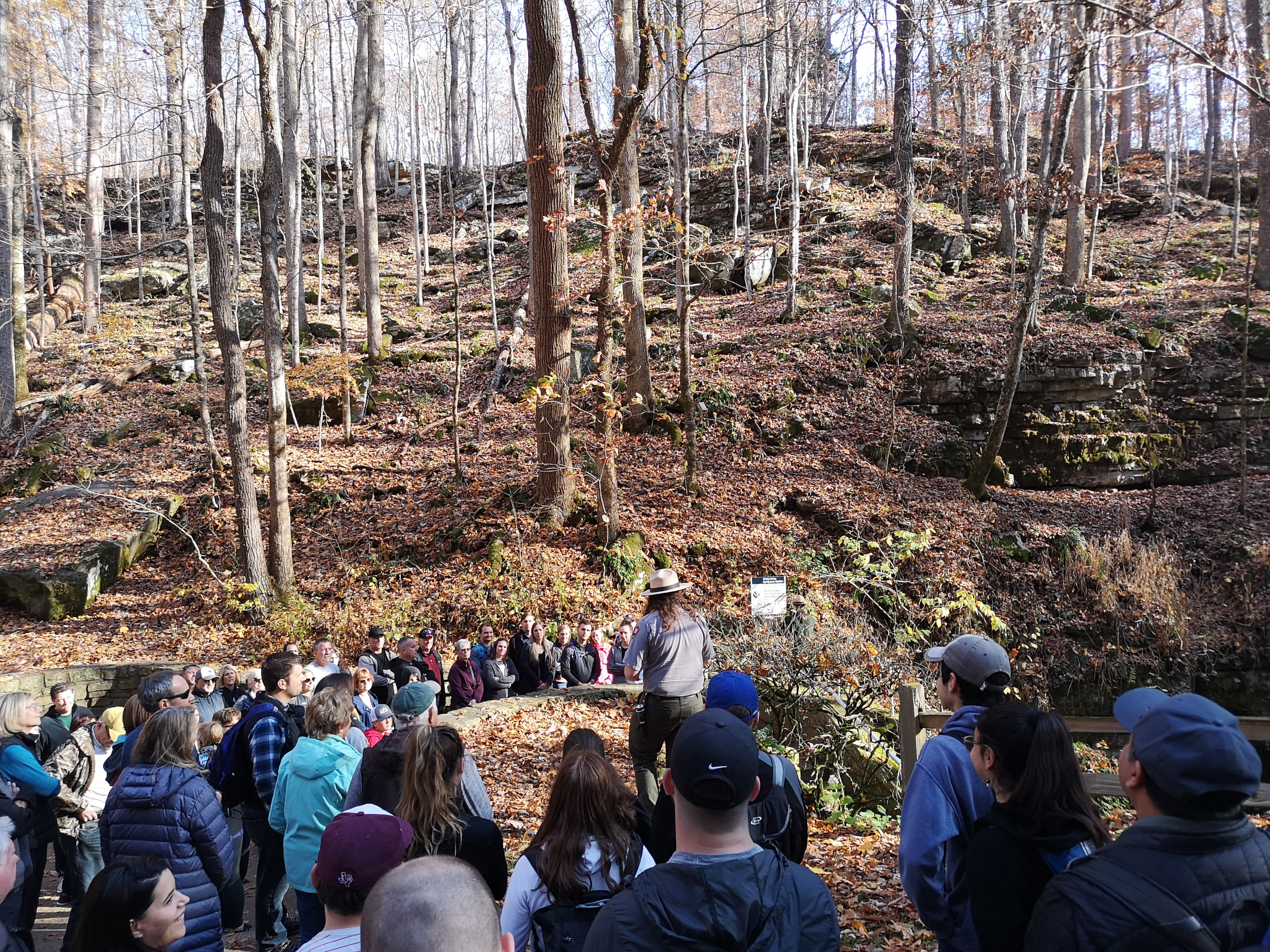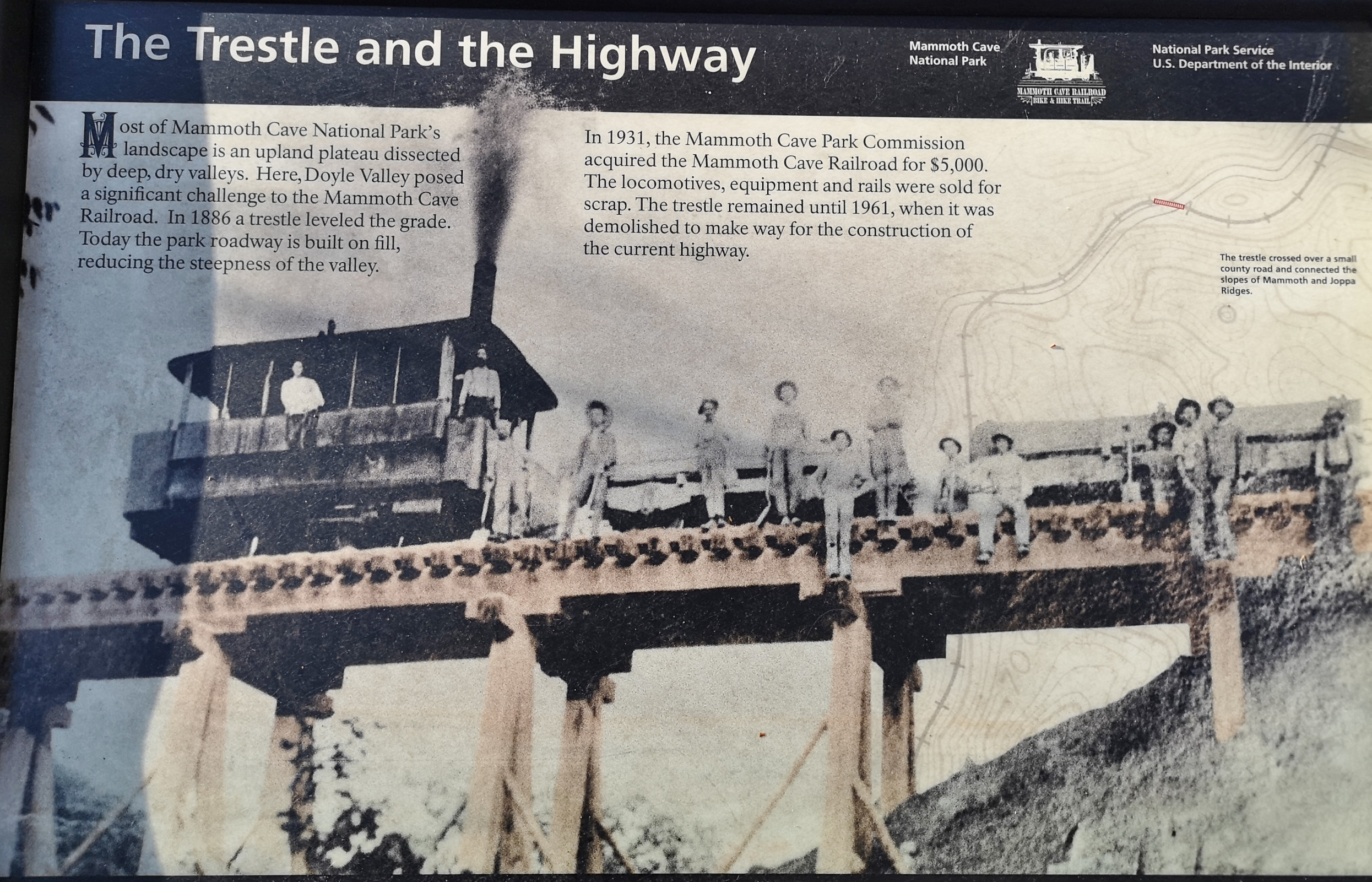 We were glad we added an extra day as it was perfect weather for our bike ride along the old Mammoth Cave Railroad trail. It was a nice trail but did have a few very steep hills. That’s when you take the opportunity to enjoy nature and hike your bike up the hill 😊One of the first overlooks was Doyle Valley which was just on the edge of the Appalachian Mountains, so it created quite a challenge for the railway. They built a trestle in 1886 and it was finally demolished in 1961. This valley was mainly farmland prior to the park reverting it to forest. Our next stop was Sloan’s Crossing Pond which was a depression in the sandstone layer above Mammoth Cave where the water could pool creating a wetland. We passed by the Dripping Springs escarpment where you could see the layers of sandstone and limestone and then proceeded down a really long hill (down is fun, up not so much) until we went by Diamond Caverns. We finally made it to the entrance sign and carried on into Park City so we could see the ruins of Bell’s Tavern, where we had lunch. Then we retraced our route all the way back to the campground for a total of 28 kms.
