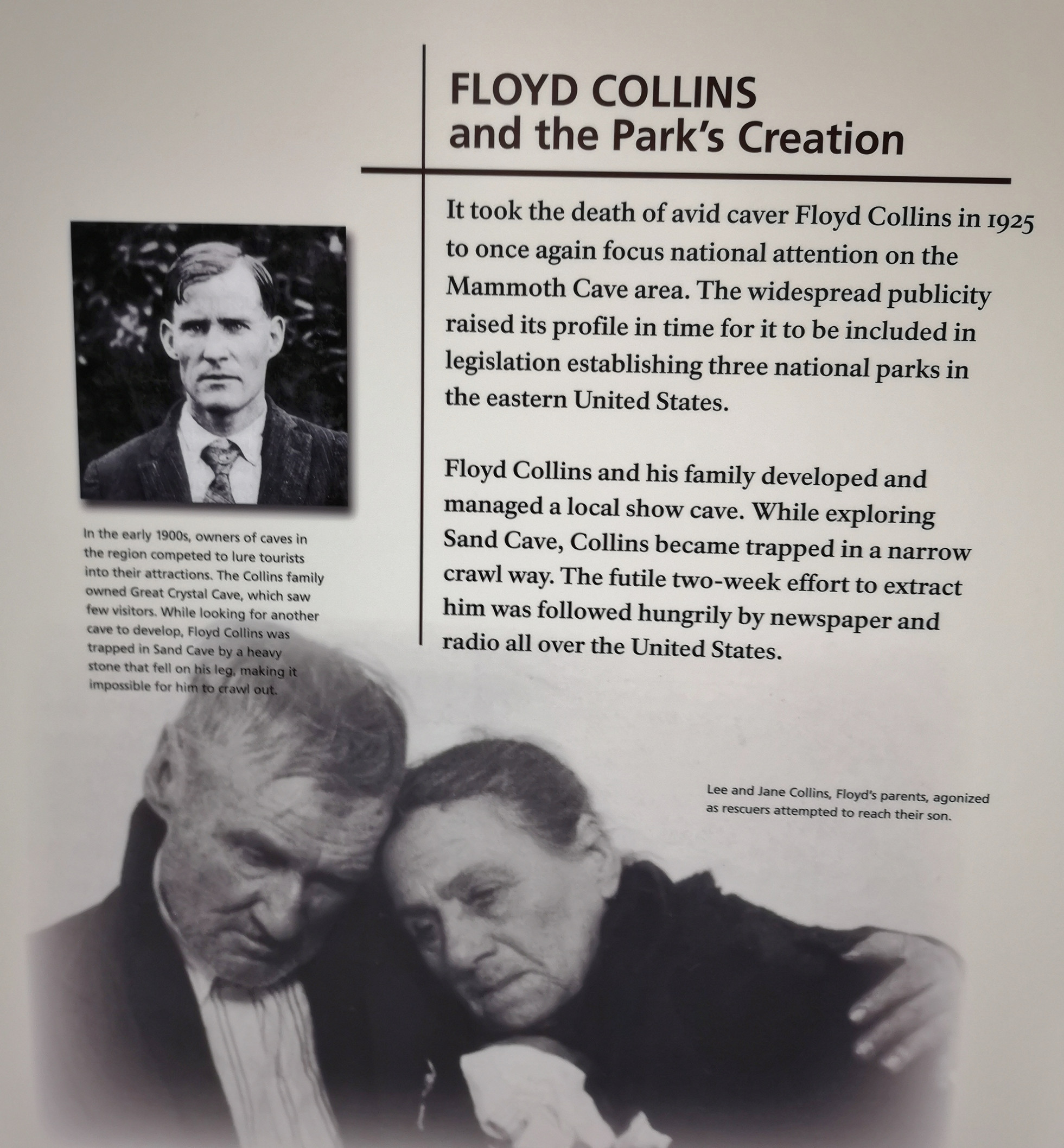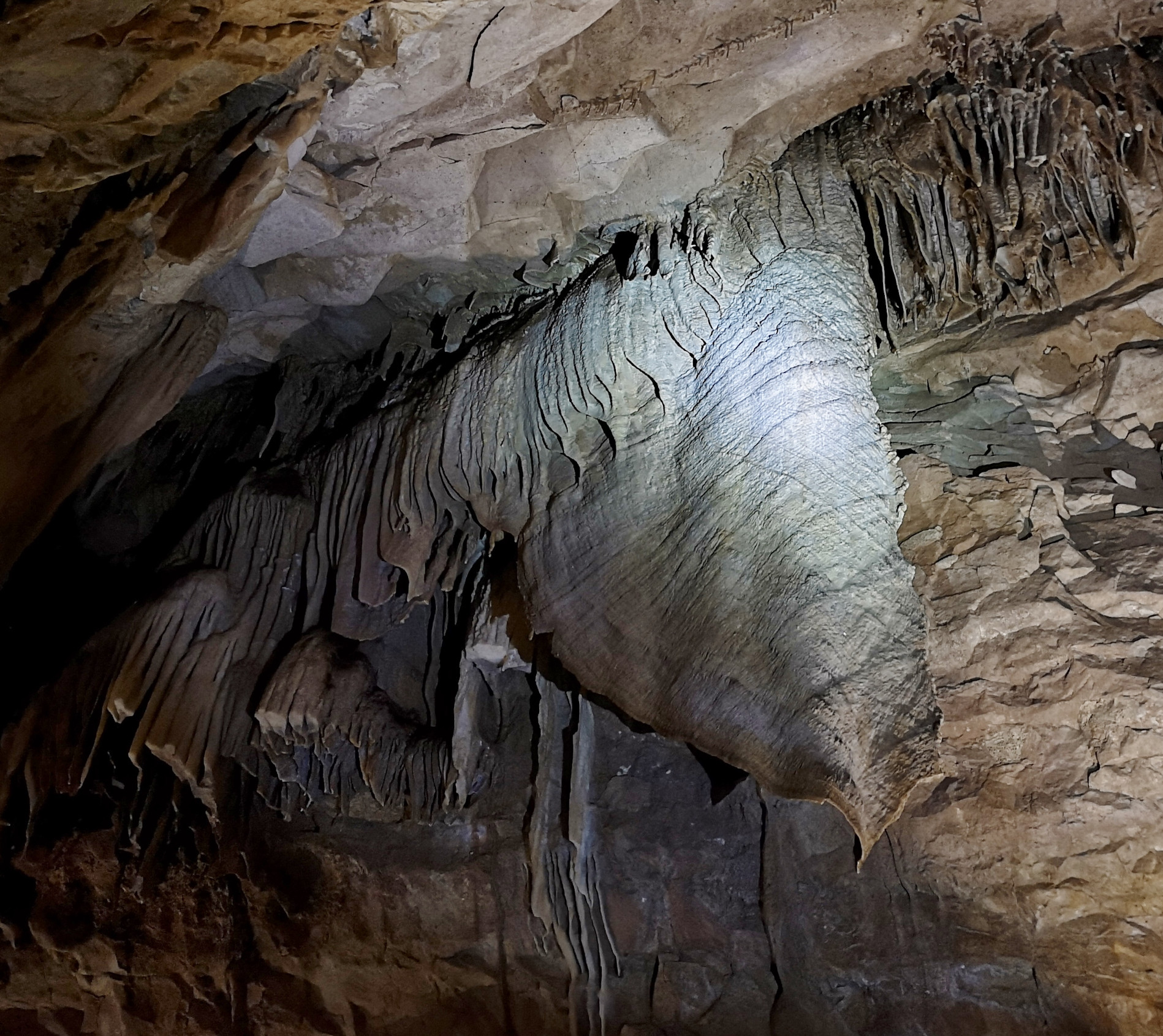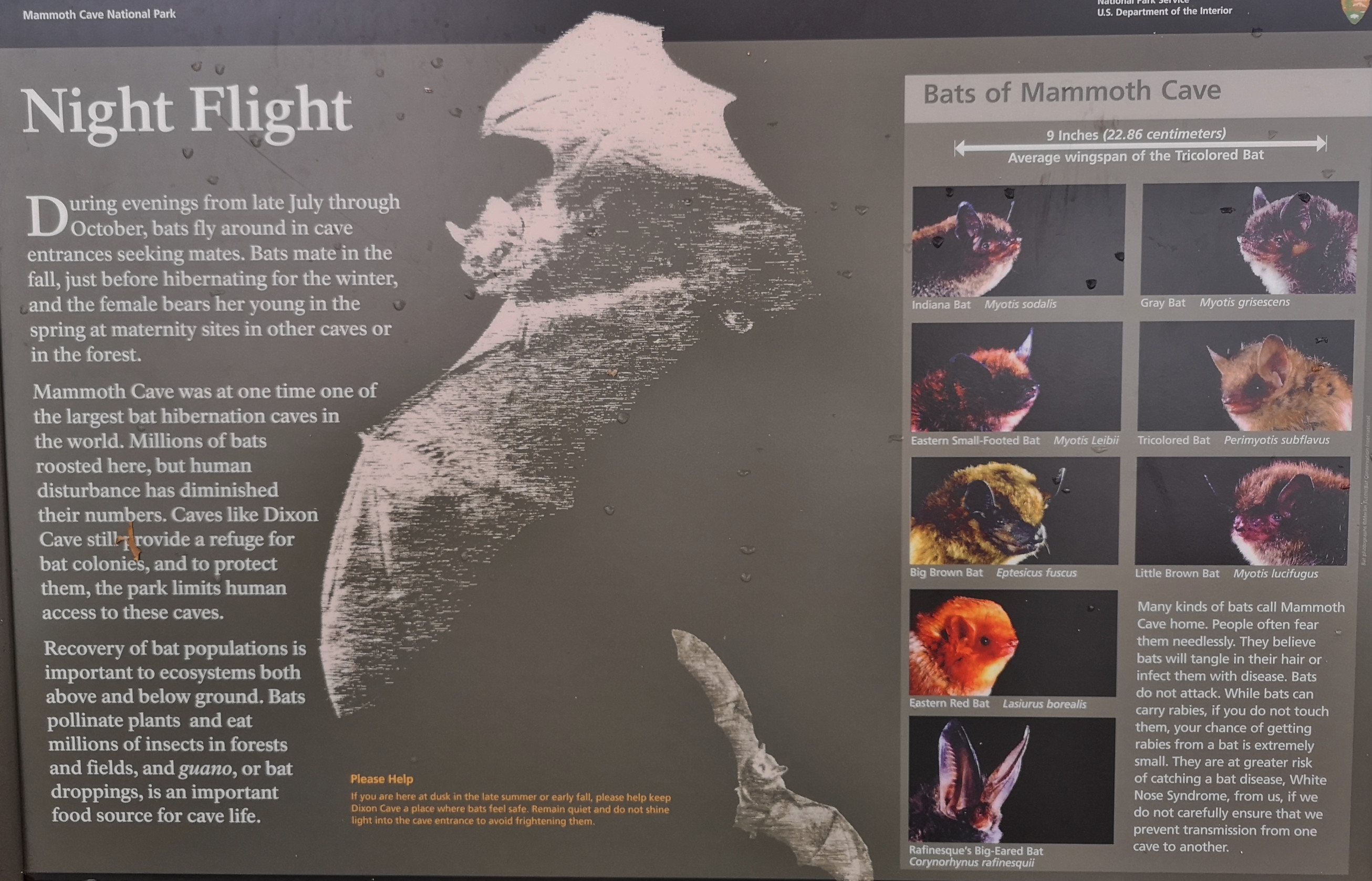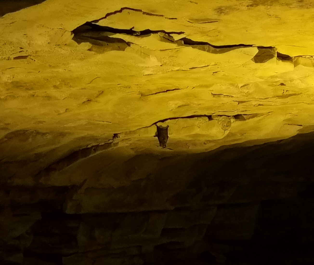 In the afternoon we did the Wondering Woods tour and we only had 7 people plus the guide so a much better sized group. We took a 25-minute bus ride where the guide gave the history of the area including the cave wars. In the earlier days there was competition to have people tour your specific cave. Later the park service started buying up properties and farms from the locals and a lot of animosity was created towards the park due to the tactics that were used to obtain the 53,000 acres of land. We turned off onto a closed side road that lead to the Wondering Woods Cave. This tour has not been offered very long and was just run now due to the closure of one of the other tours. In the cave we saw another little brown bat and several cave crickets, but the amazing part was all the formations in the cave. We saw, flows, stalactites (c for close to the ceiling), stalagmites (g for grow from the ground), crystal formations, soda straws, and shawls! The other cool thing was that you could see from one end of the cave to the other. On the way back in the bus the guide told us the story of Floyd Collins who was a local cave guide that got stuck in Sand Cave for two weeks but unfortunately perished. It was a national news story at the time.