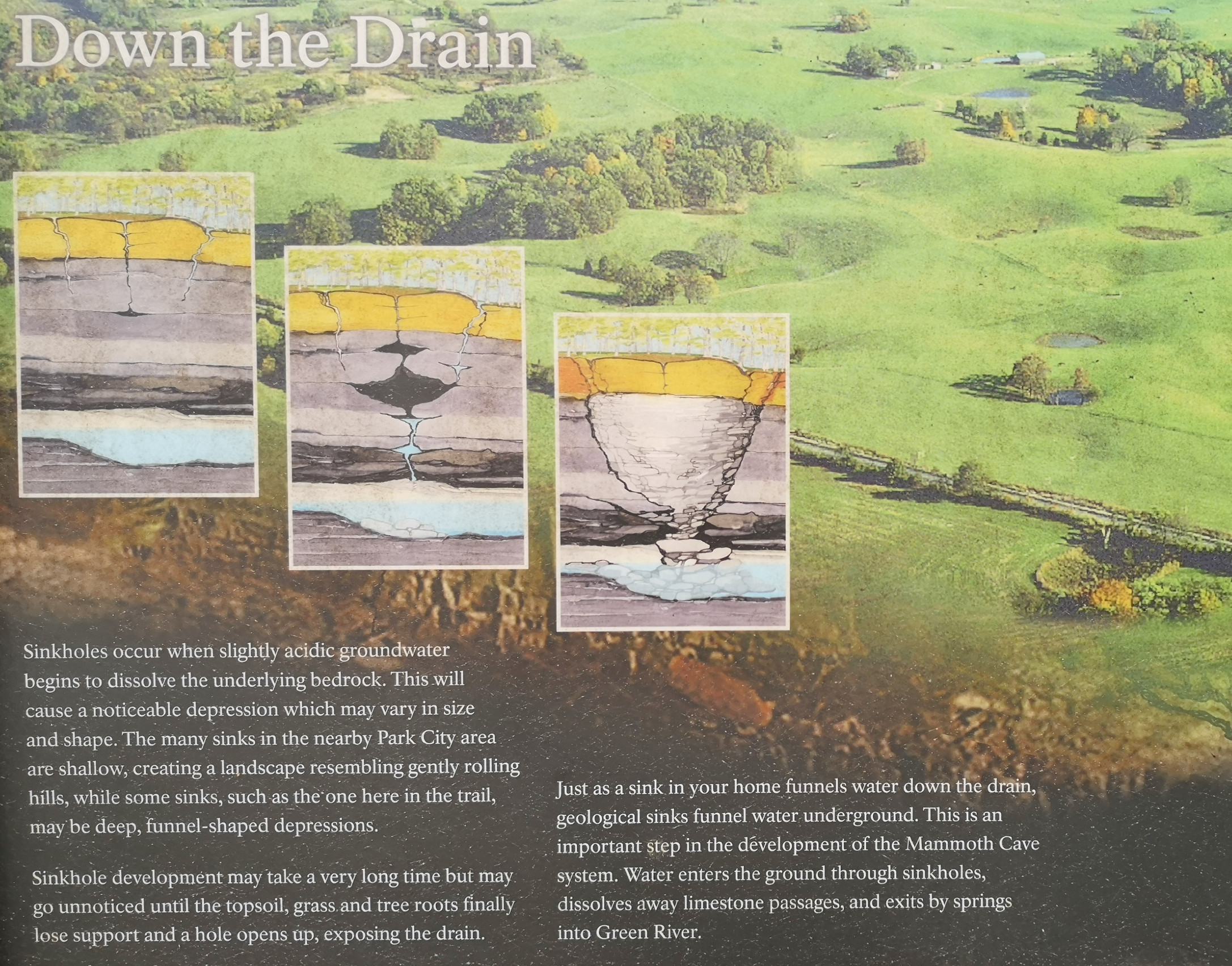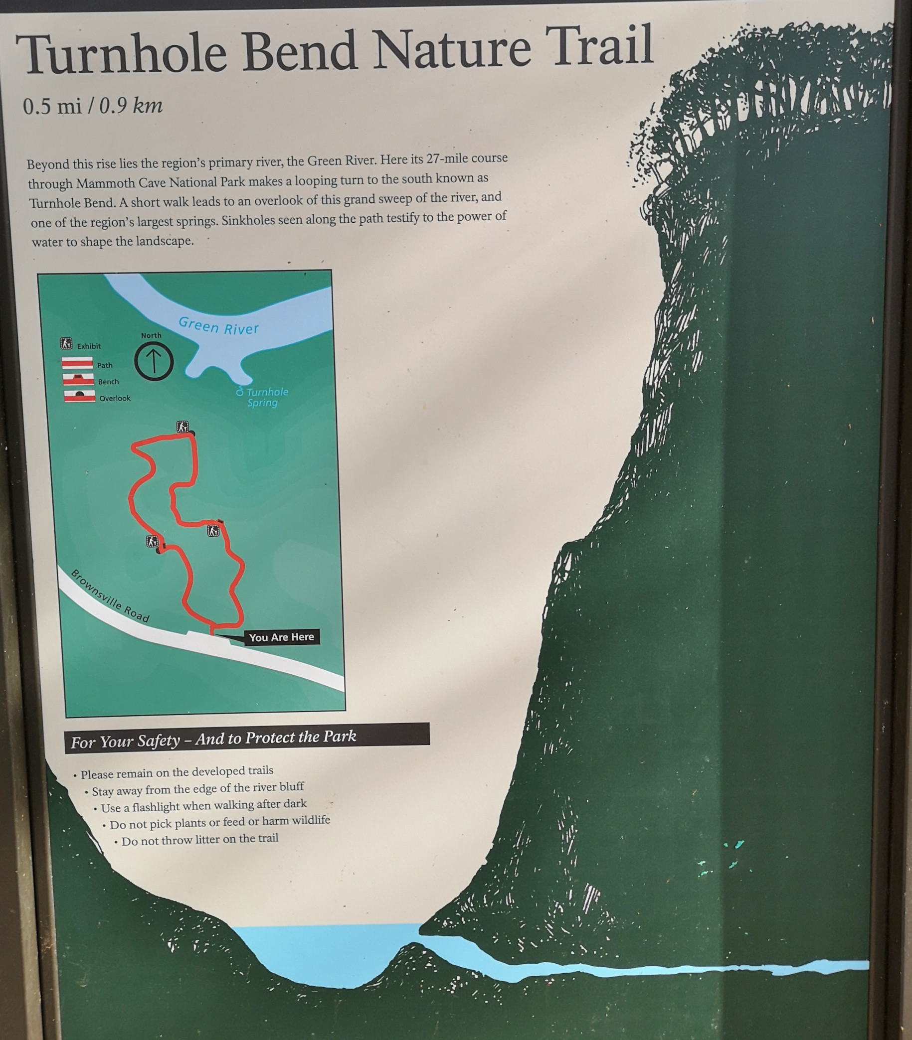 The following day we left Mammoth Cave NP but before leaving we stopped to do a short hike on the Turnhole Bend Nature Trail. There were 2 excellent examples of sinkholes that had formed, creating a path for water to get into the caves and an overlook for the Turnhole Bend Spring that takes the water into the Green River.