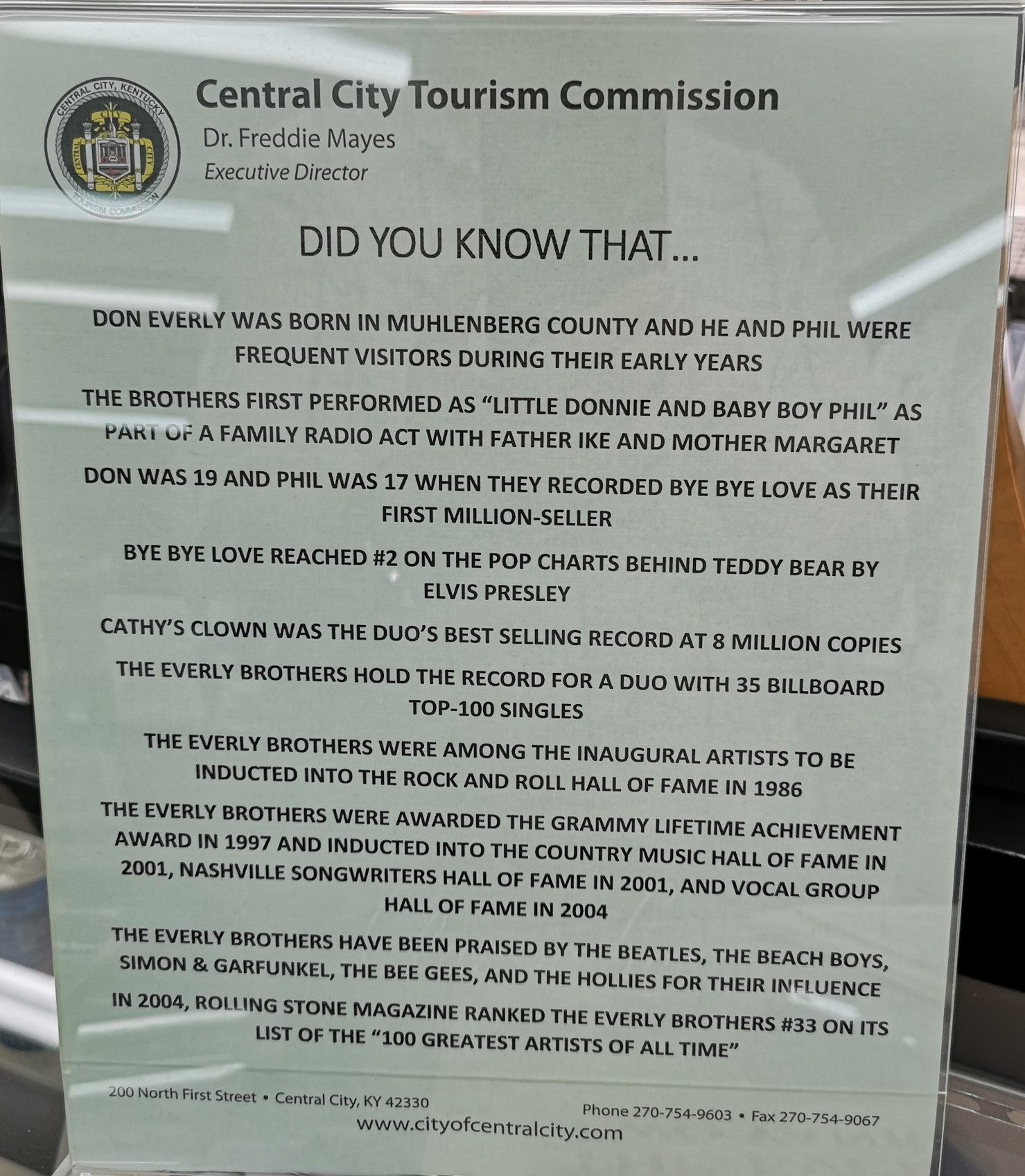 Our next destination was Land Between Two Lakes but on the way we stopped in Central City Kentucky to get some groceries and we found out the town had an Everly Brothers monument. Since Sharon’s dad really liked the Everly Brothers we decided to get some photos at the monument but then it had a really good small museum with musical artifacts about the Everly Brothers, Merle Travis, Jim Walker, and John Prine, all who were from the area. The museum was in an old car dealership. The music museum in the front/sales area and some historical cars in the garage bays. It was definitely worth the stop, especially since the host was extremely friendly and gave us all kinds of stories about the area.