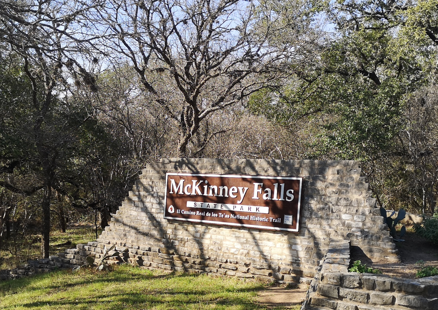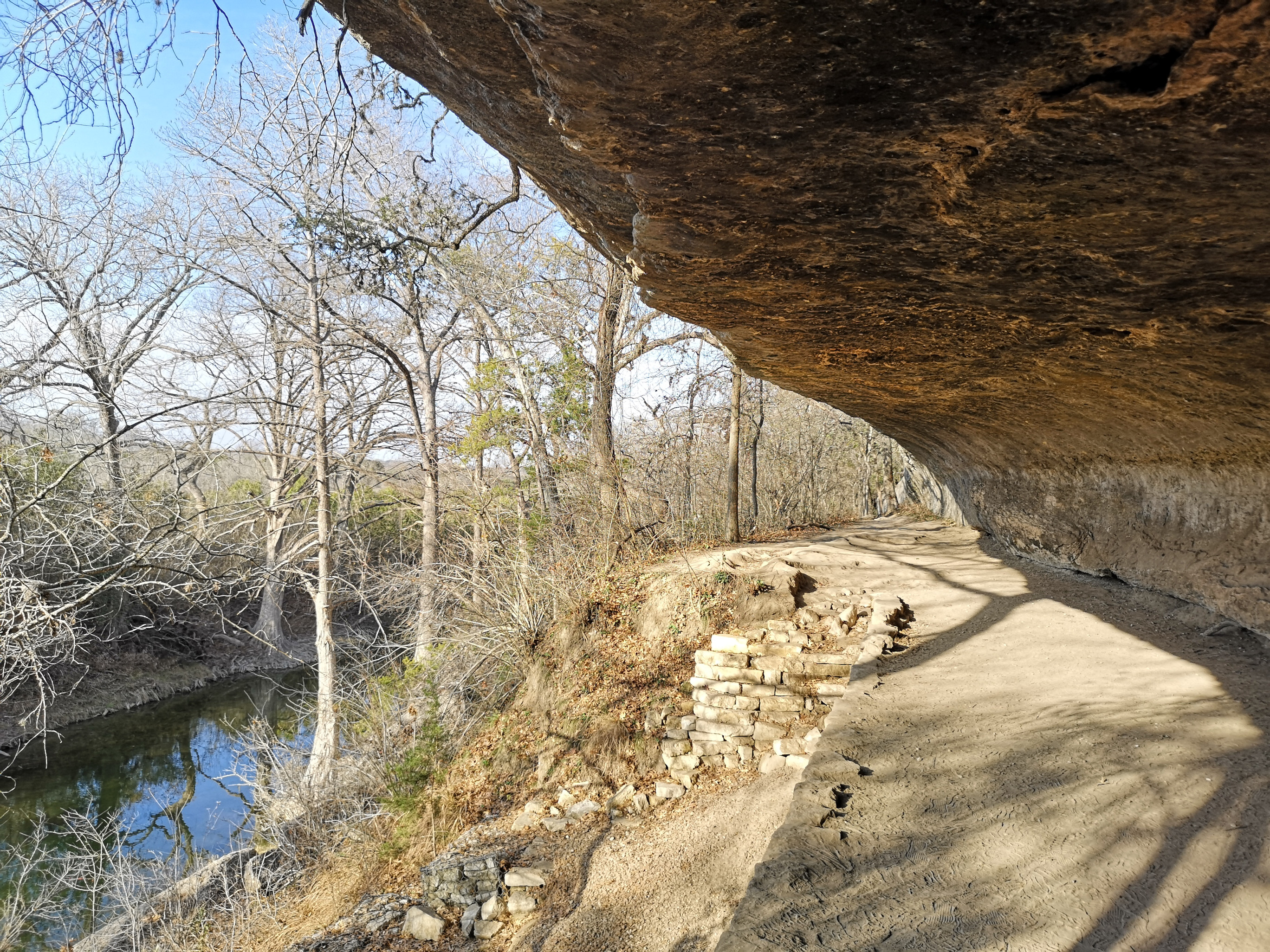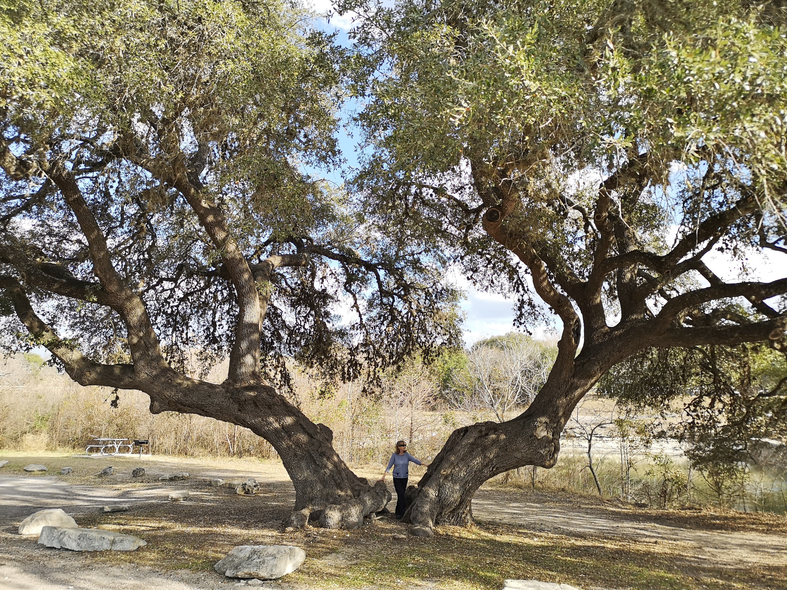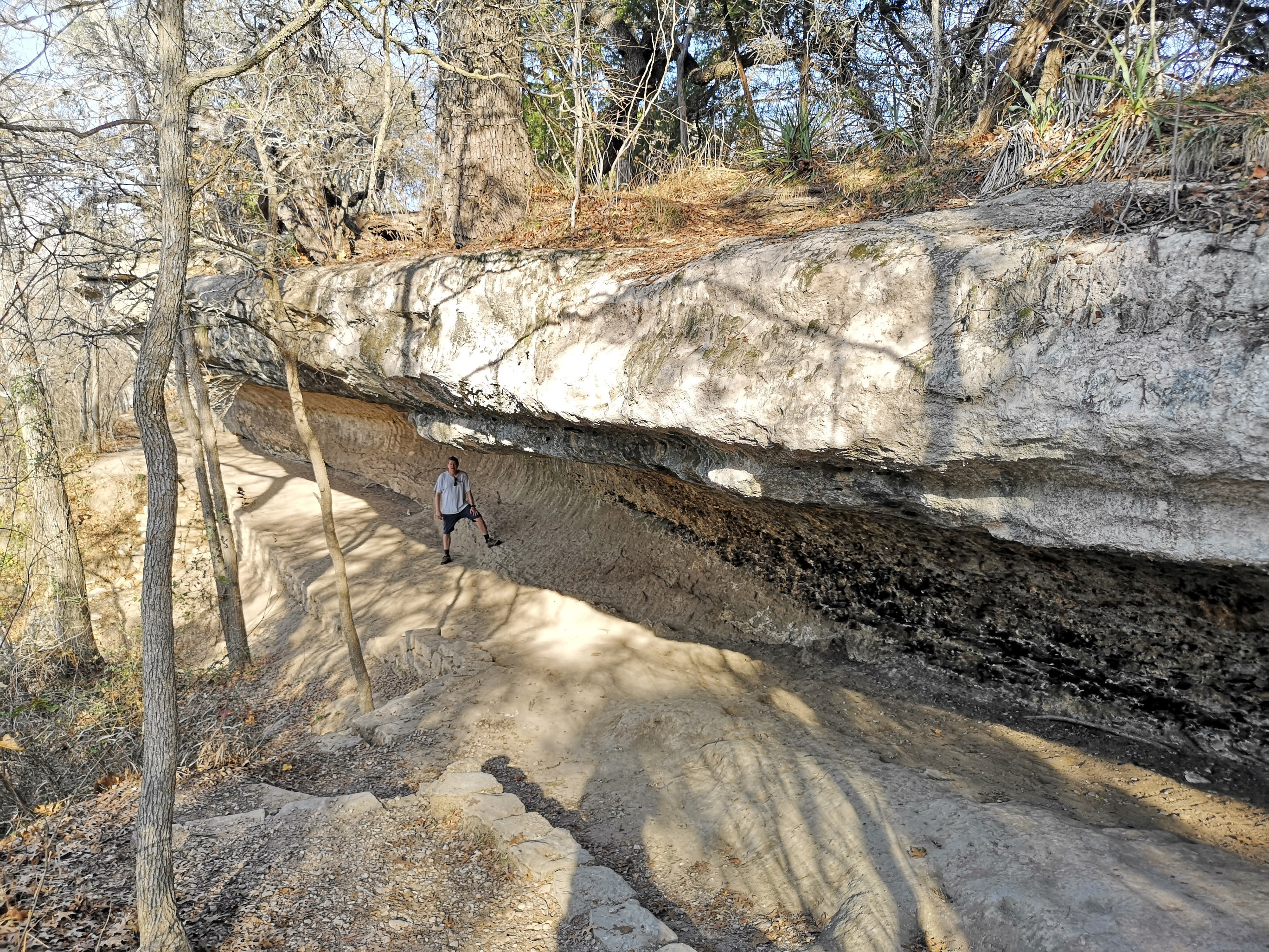 Next stop was McKinney Falls SP close to Austin. This is a large, popular park, which is why we could only book it during the week. After getting setup we hiked the Onion Creek trail to the Horse Trainer’s Cabin (where I ripped one of my favourite shirts on some barb wire), saw the Smith Visitor Centre and Upper McKinney Falls, hiked the Rock Shelter trail to see the 100′ tall 500-year-old Bald Cyprus called Old Baldy, and then saw the Rock Shelter used by the Native Americans over 8000 years ago. We walked to the Lower Falls over a massive area of limestone that was part of the 2500-mile road stretching from Mexico to Louisiana called the El Camino Real. An important river crossing for over 400 years, and we too crossed the river to go see the old McKinney Homestead and the Grist Mill (total 6 kms).
