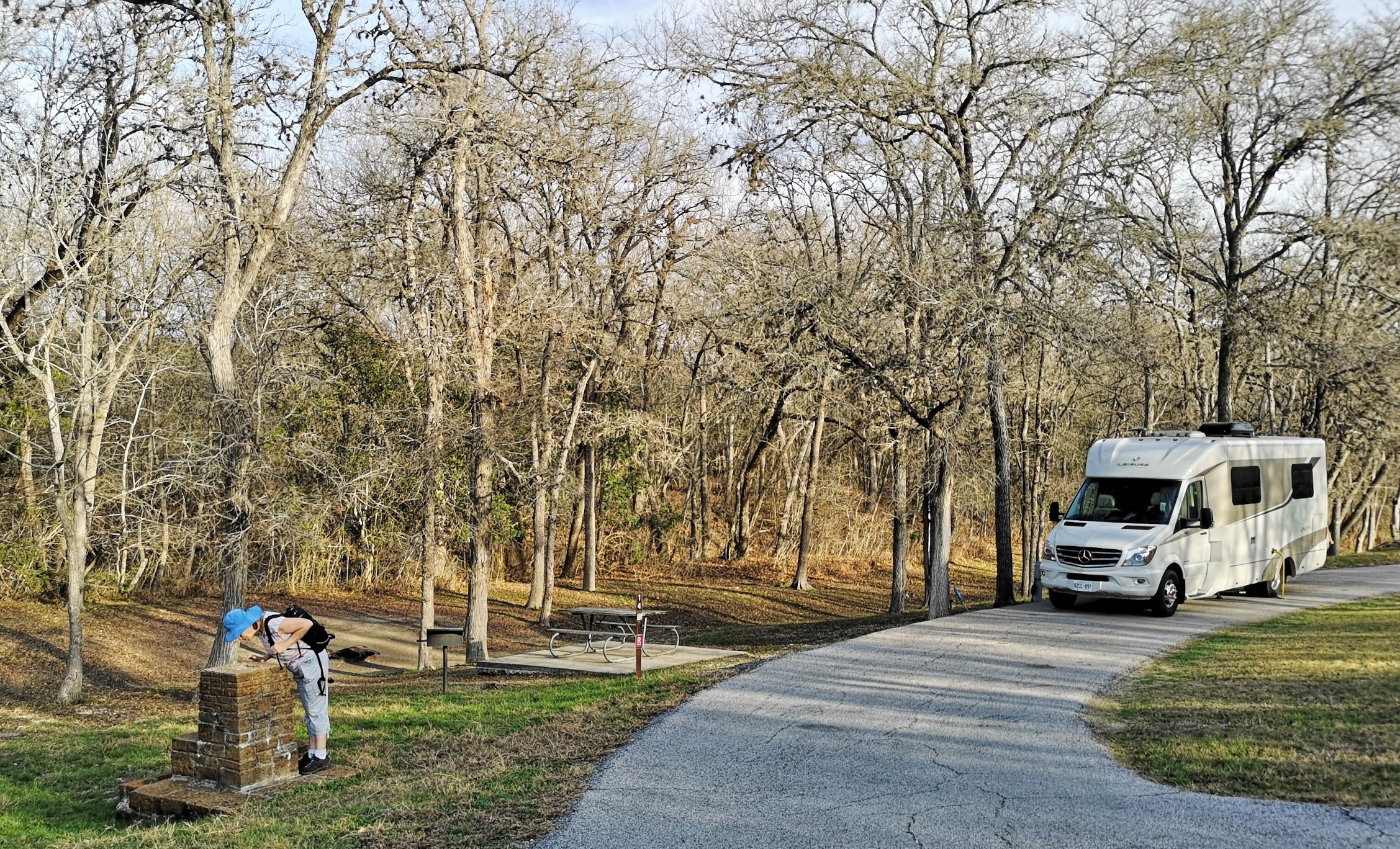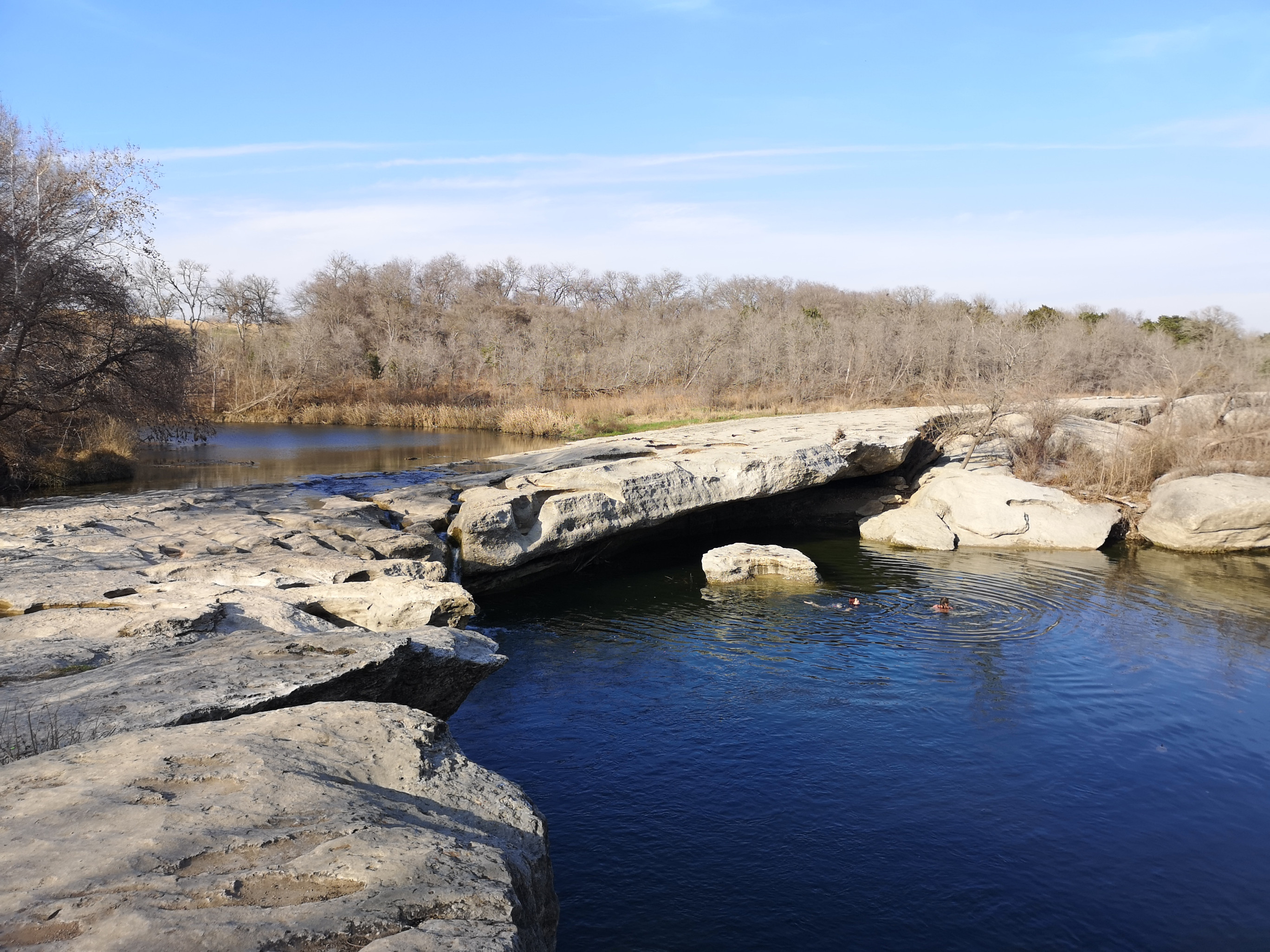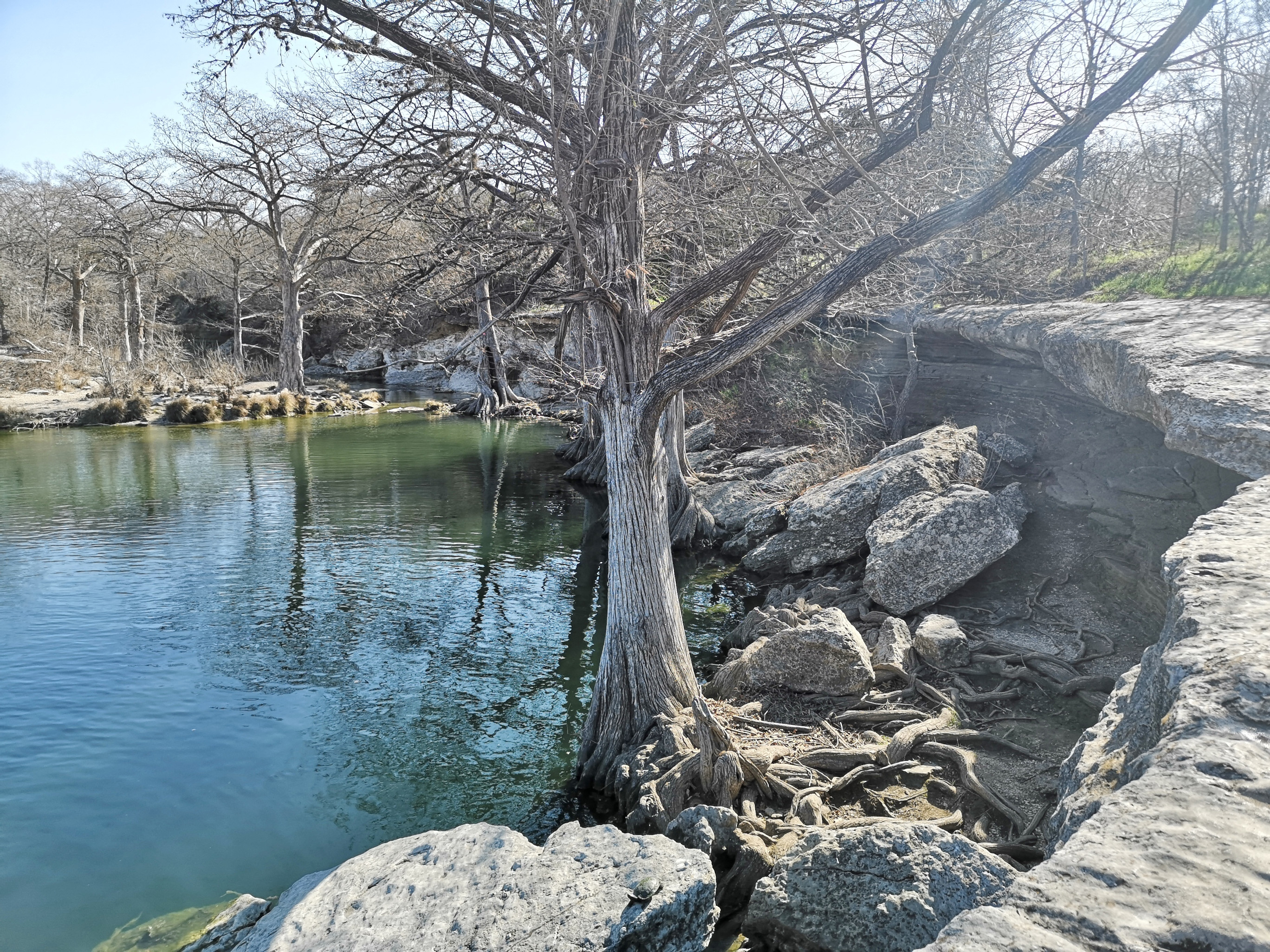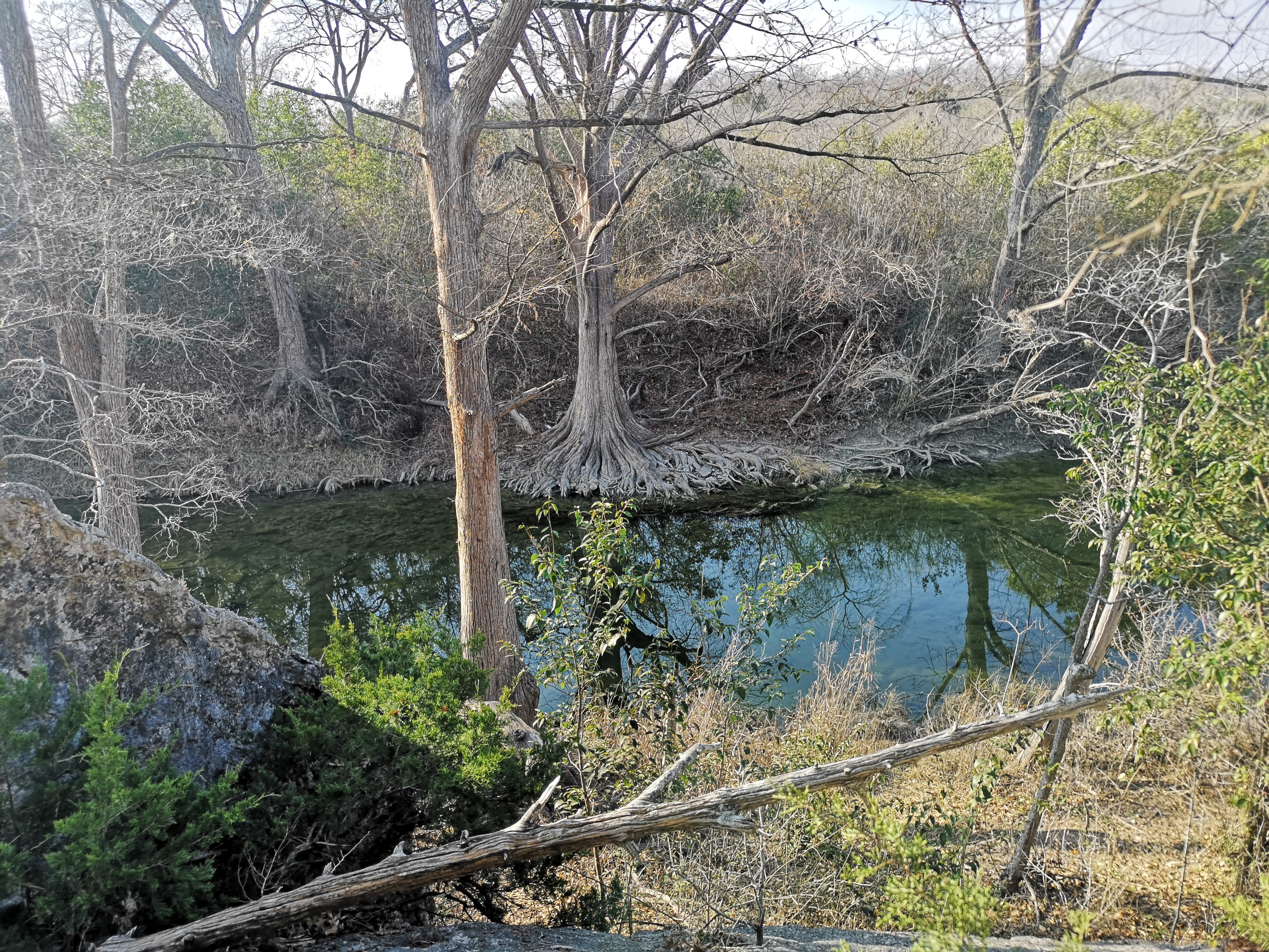 Next stop was McKinney Falls SP close to Austin. This is a large, popular park, which is why we could only book it during the week. After getting setup we hiked the Onion Creek trail to the Horse Trainer’s Cabin (where I ripped one of my favourite shirts on some barb wire), saw the Smith Visitor Centre and Upper McKinney Falls, hiked the Rock Shelter trail to see the 100′ tall 500-year-old Bald Cyprus called Old Baldy, and then saw the Rock Shelter used by the Native Americans over 8000 years ago. We walked to the Lower Falls over a massive area of limestone that was part of the 2500-mile road stretching from Mexico to Louisiana called the El Camino Real. An important river crossing for over 400 years, and we too crossed the river to go see the old McKinney Homestead and the Grist Mill (total 6 kms).