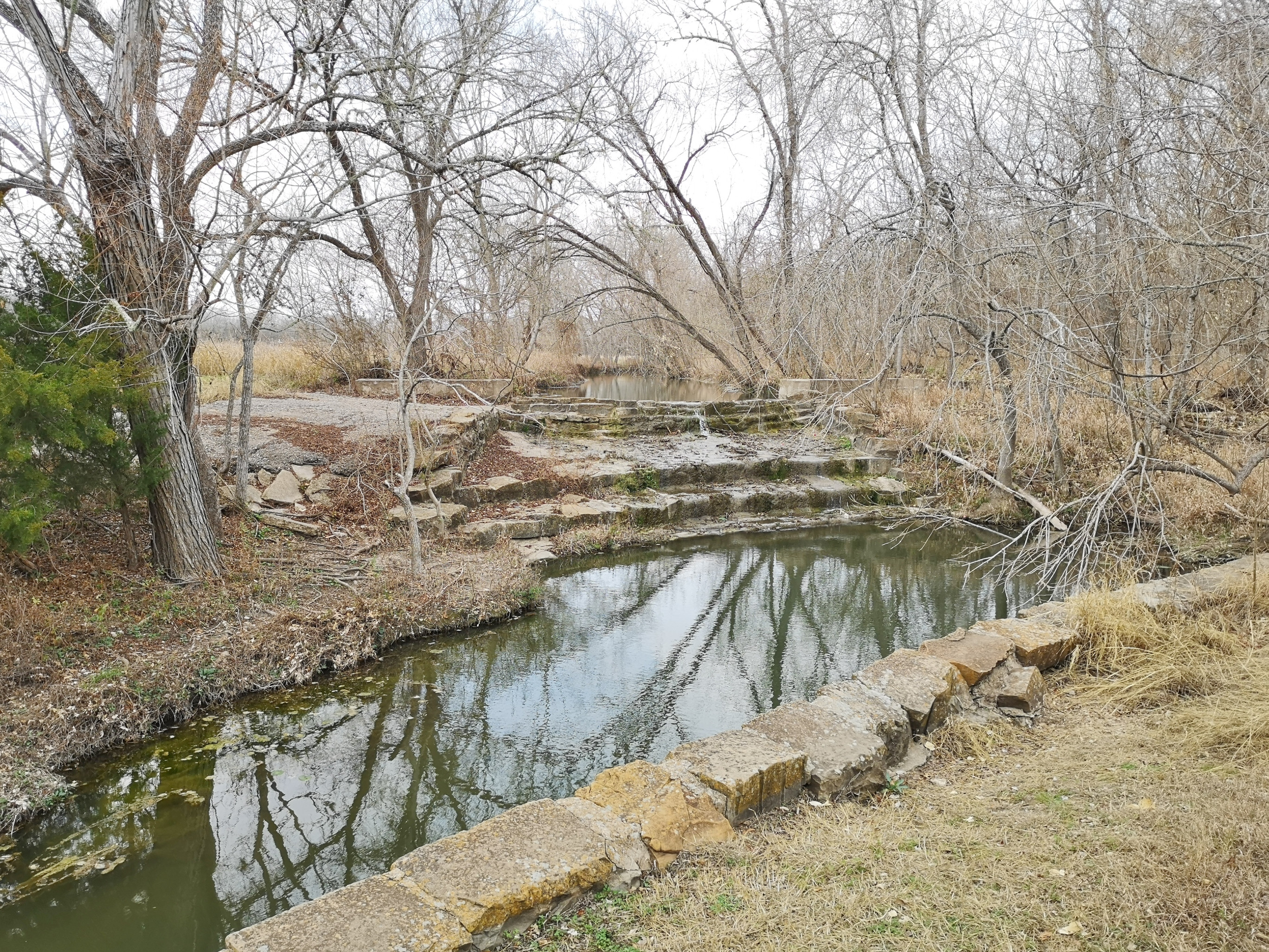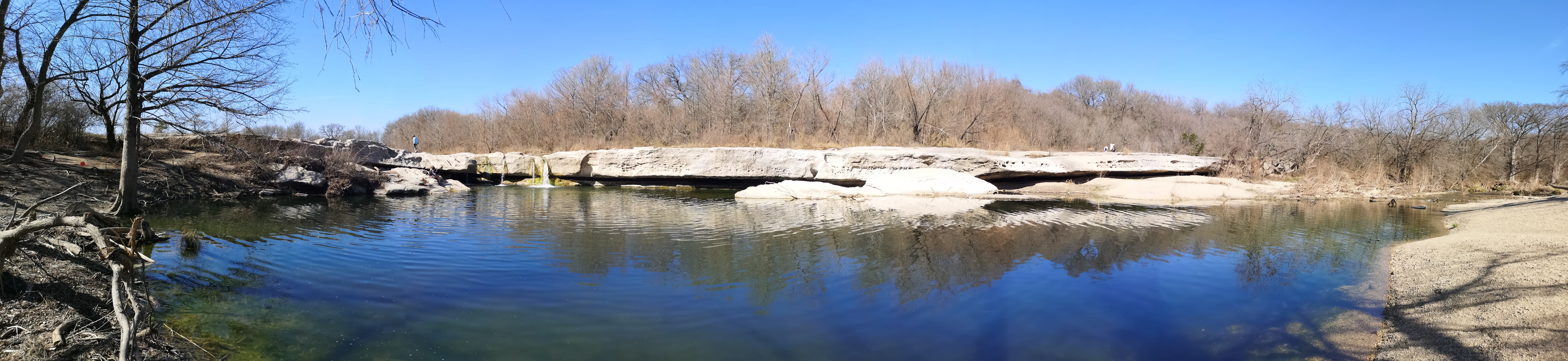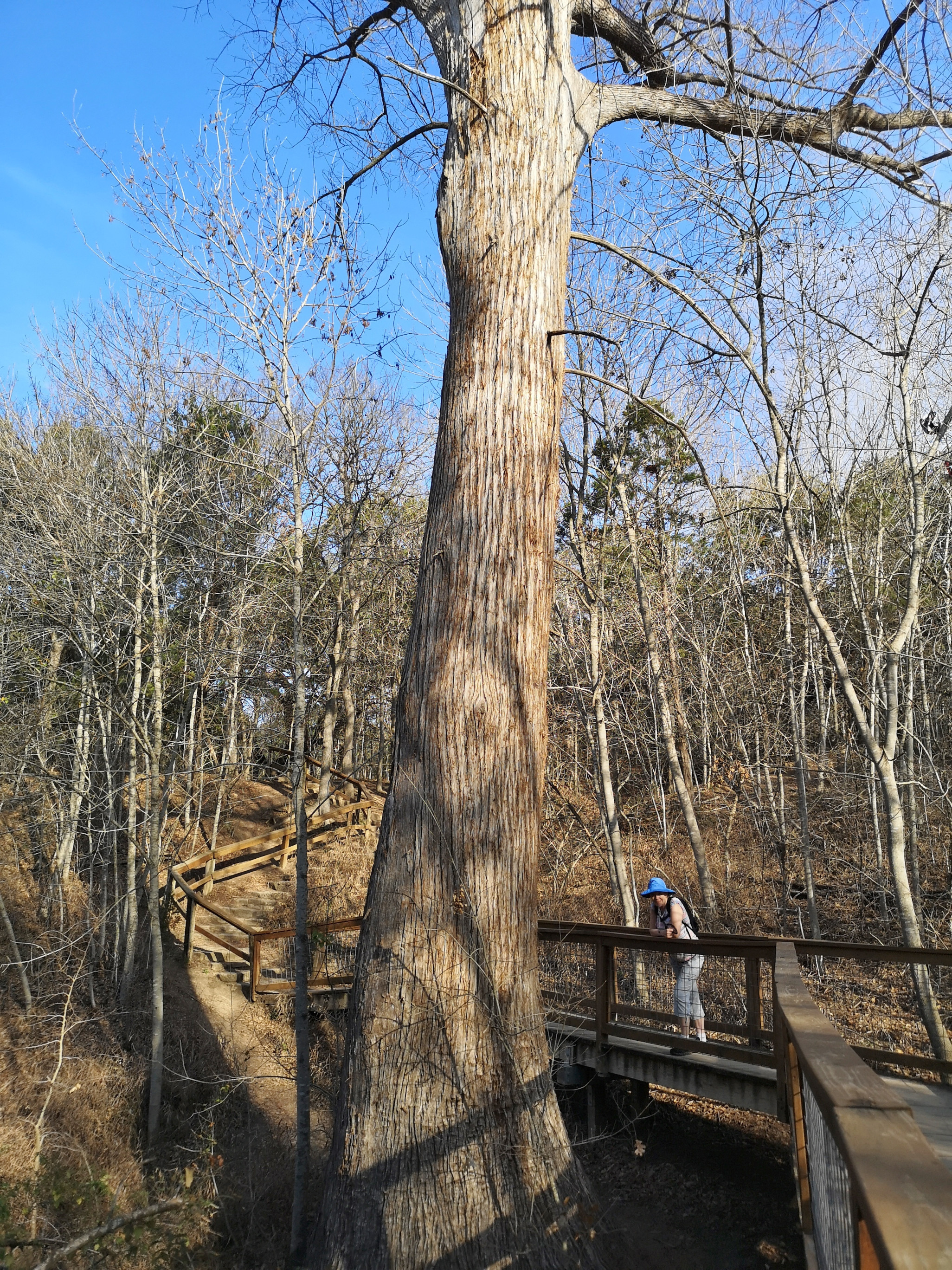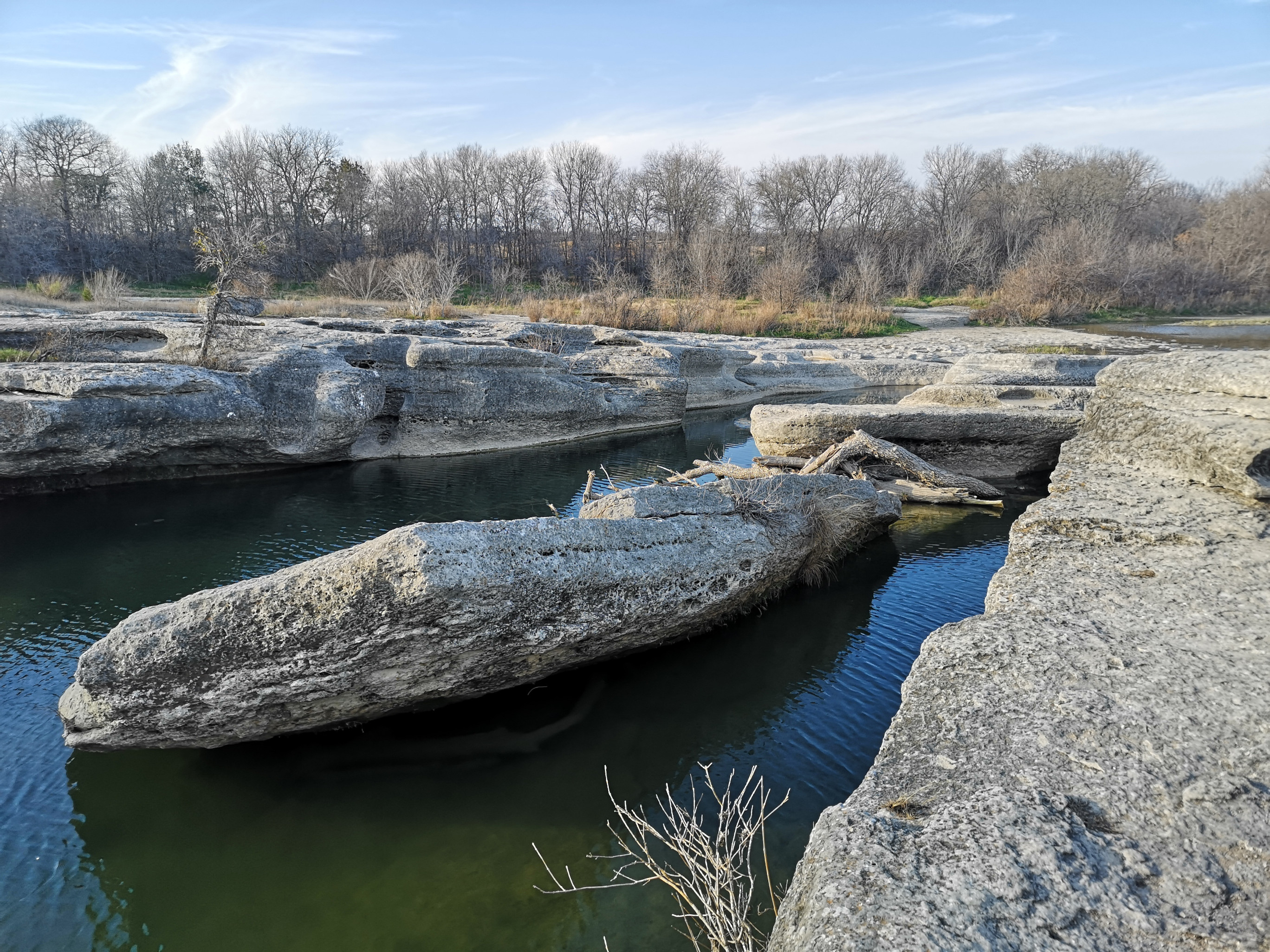 Next stop was McKinney Falls SP close to Austin. This is a large, popular park, which is why we could only book it during the week. After getting setup we hiked the Onion Creek trail to the Horse Trainer’s Cabin (where I ripped one of my favourite shirts on some barb wire), saw the Smith Visitor Centre and Upper McKinney Falls, hiked the Rock Shelter trail to see the 100′ tall 500-year-old Bald Cyprus called Old Baldy, and then saw the Rock Shelter used by the Native Americans over 8000 years ago. We walked to the Lower Falls over a massive area of limestone that was part of the 2500-mile road stretching from Mexico to Louisiana called the El Camino Real. An important river crossing for over 400 years, and we too crossed the river to go see the old McKinney Homestead and the Grist Mill (total 6 kms).