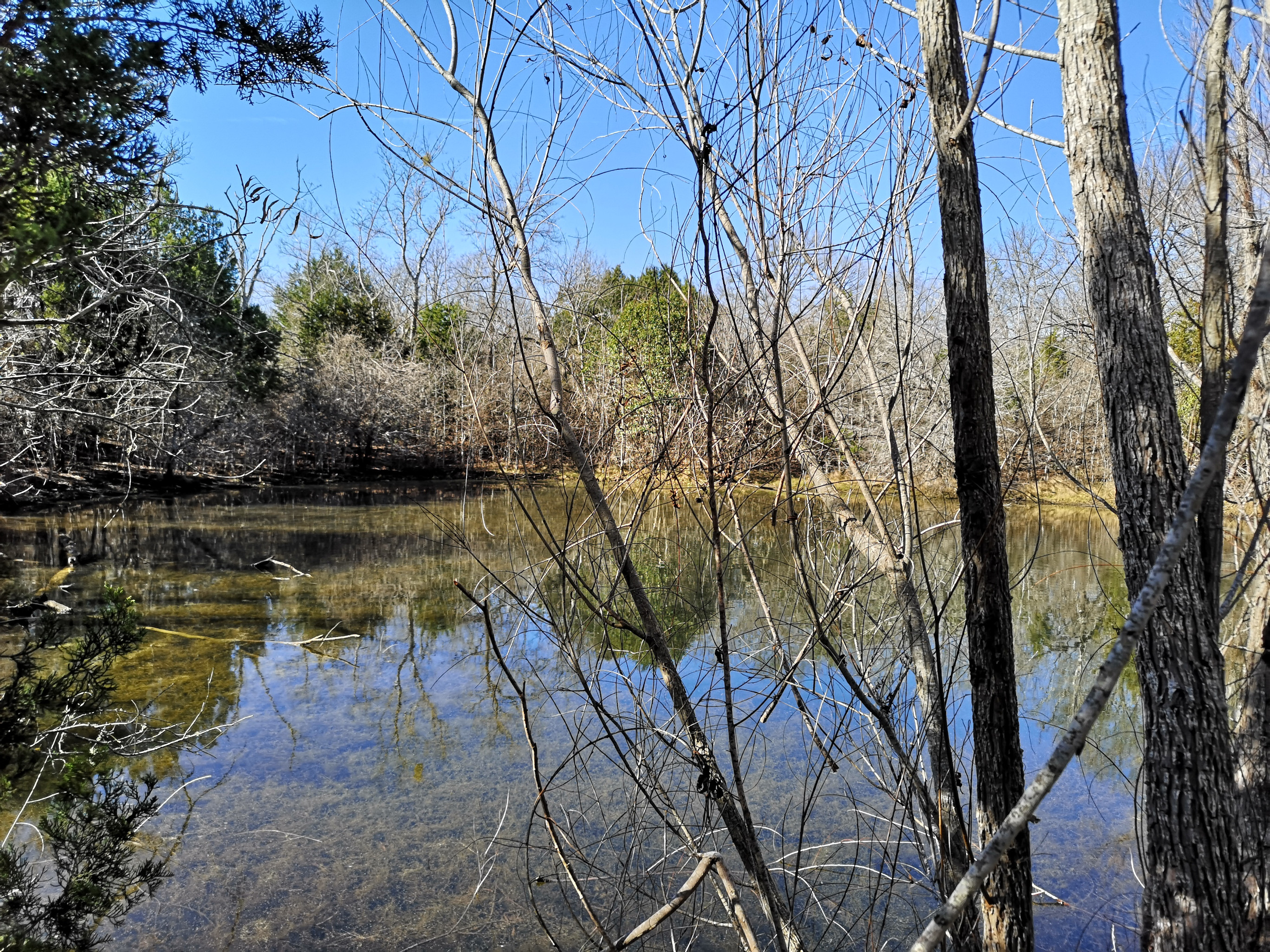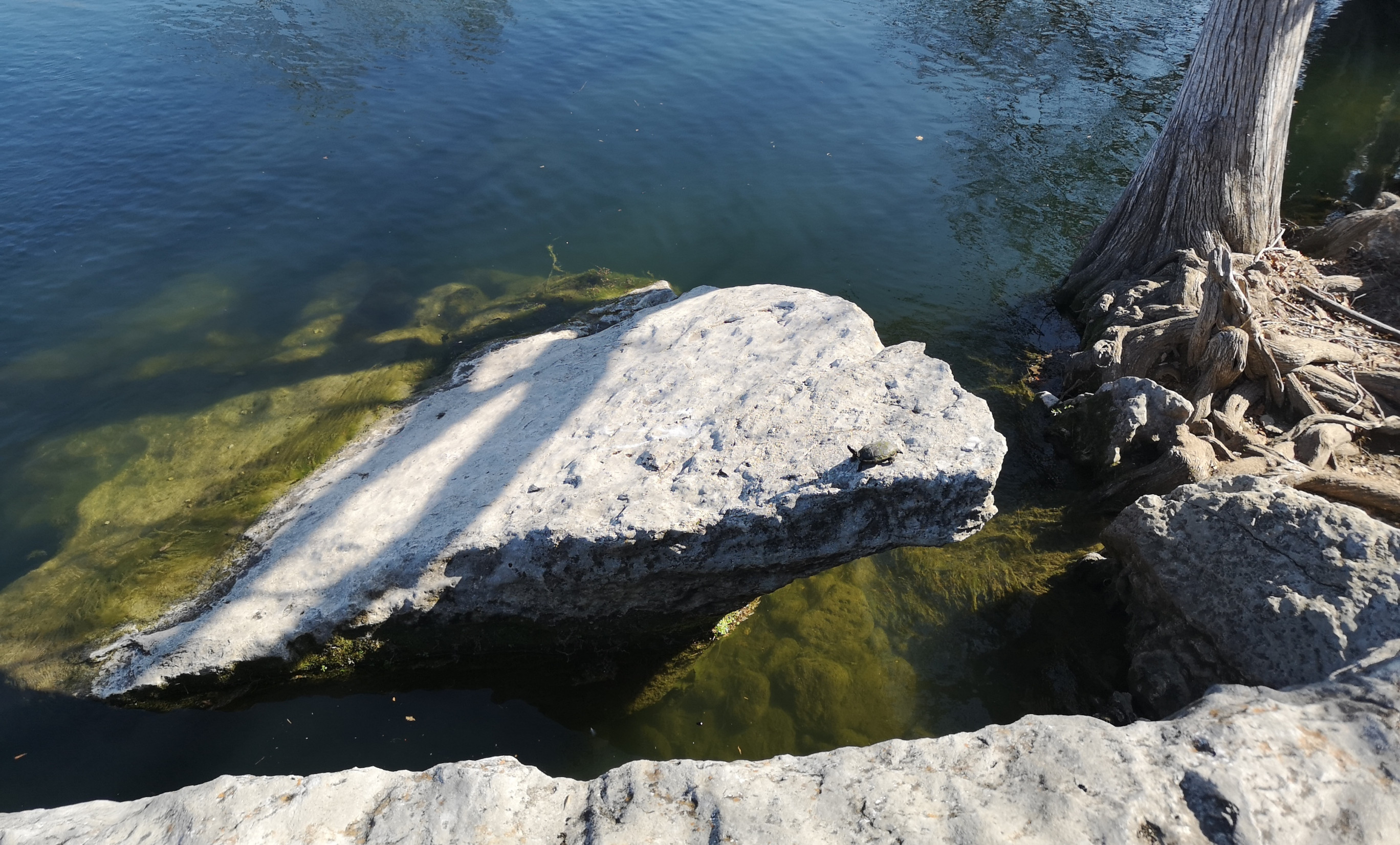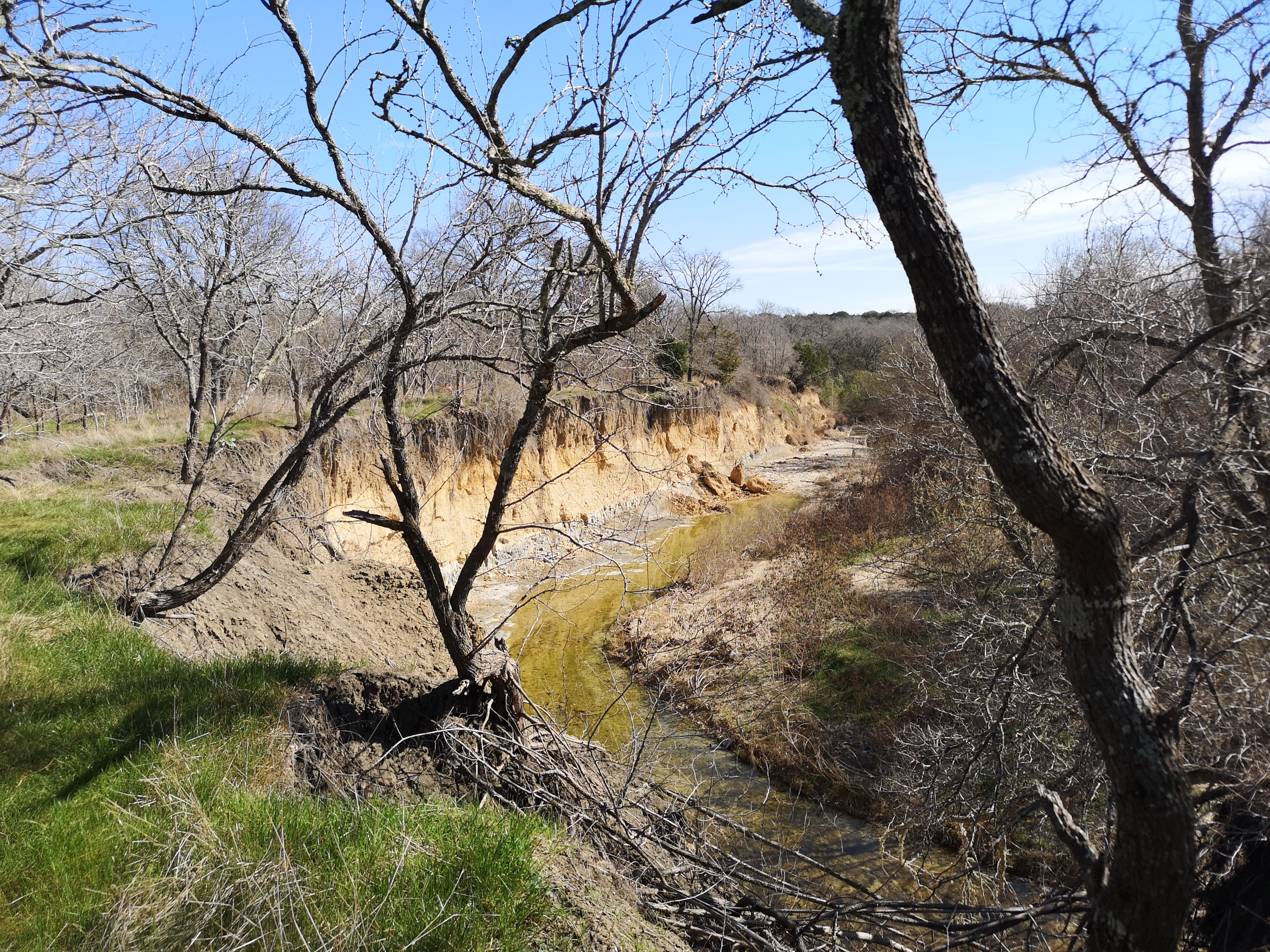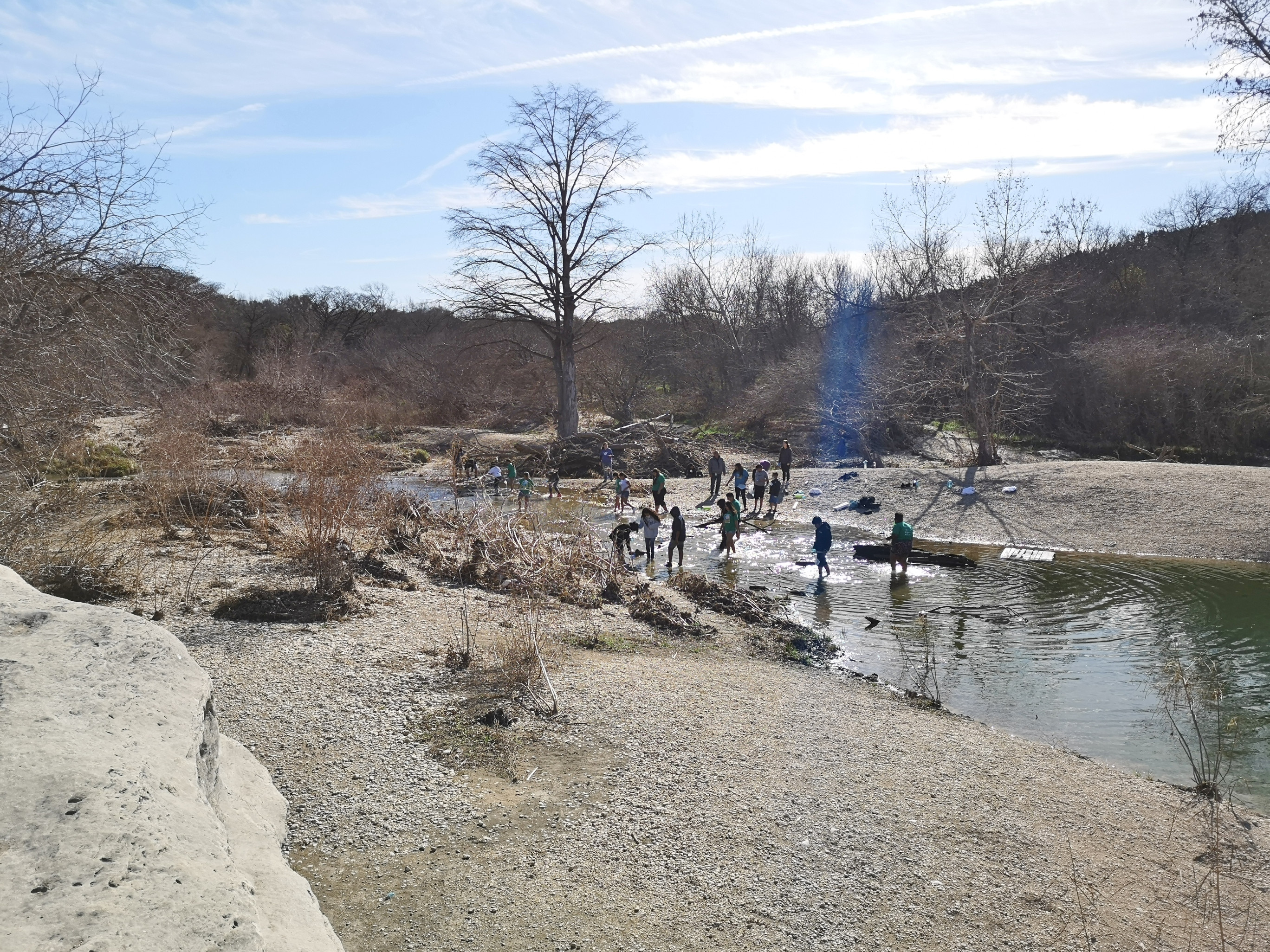 Next stop was McKinney Falls SP close to Austin. This is a large, popular park, which is why we could only book it during the week. After getting setup we hiked the Onion Creek trail to the Horse Trainer’s Cabin (where I ripped one of my favourite shirts on some barb wire), saw the Smith Visitor Centre and Upper McKinney Falls, hiked the Rock Shelter trail to see the 100′ tall 500-year-old Bald Cyprus called Old Baldy, and then saw the Rock Shelter used by the Native Americans over 8000 years ago. We walked to the Lower Falls over a massive area of limestone that was part of the 2500-mile road stretching from Mexico to Louisiana called the El Camino Real. An important river crossing for over 400 years, and we too crossed the river to go see the old McKinney Homestead and the Grist Mill (total 6 kms).