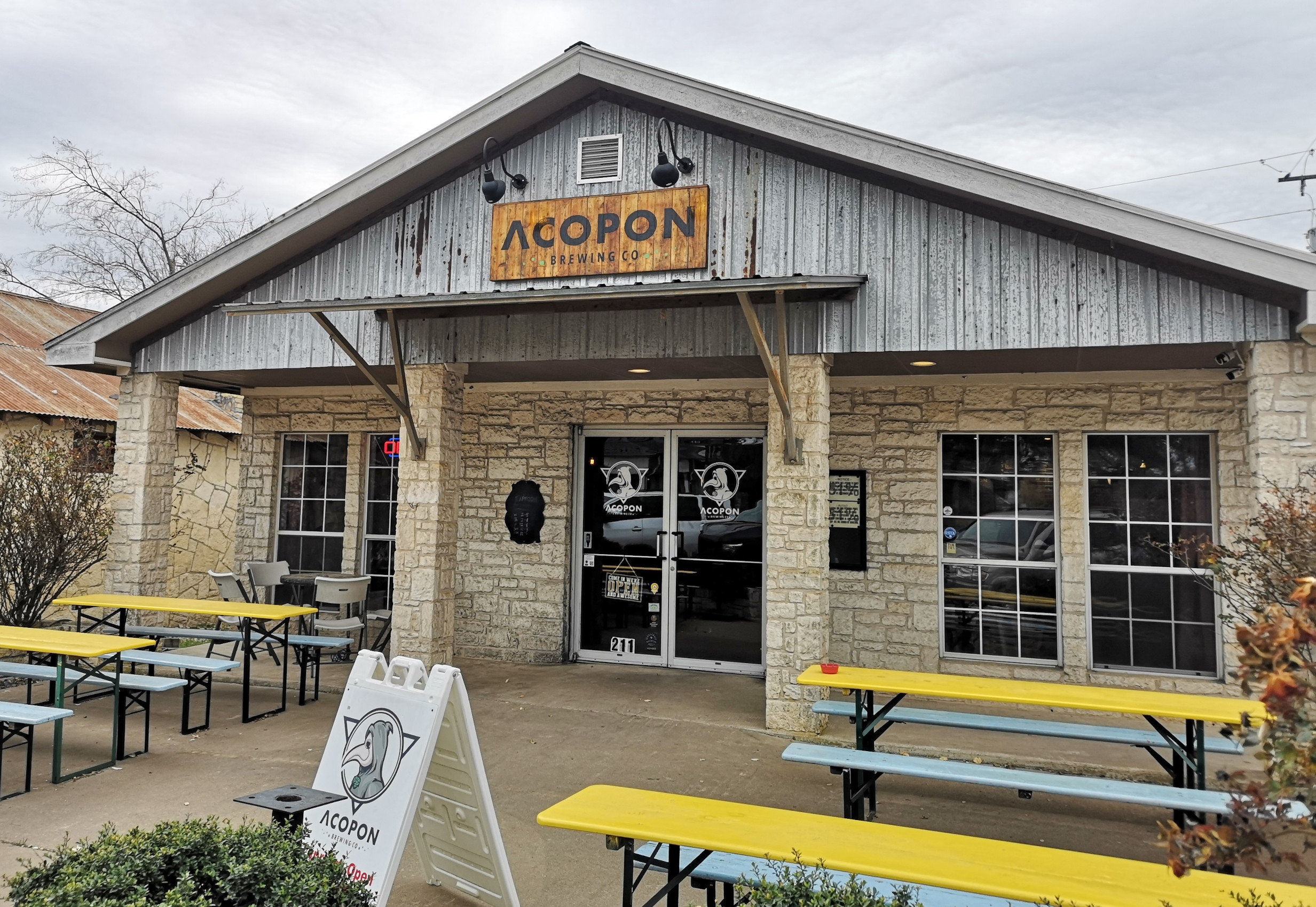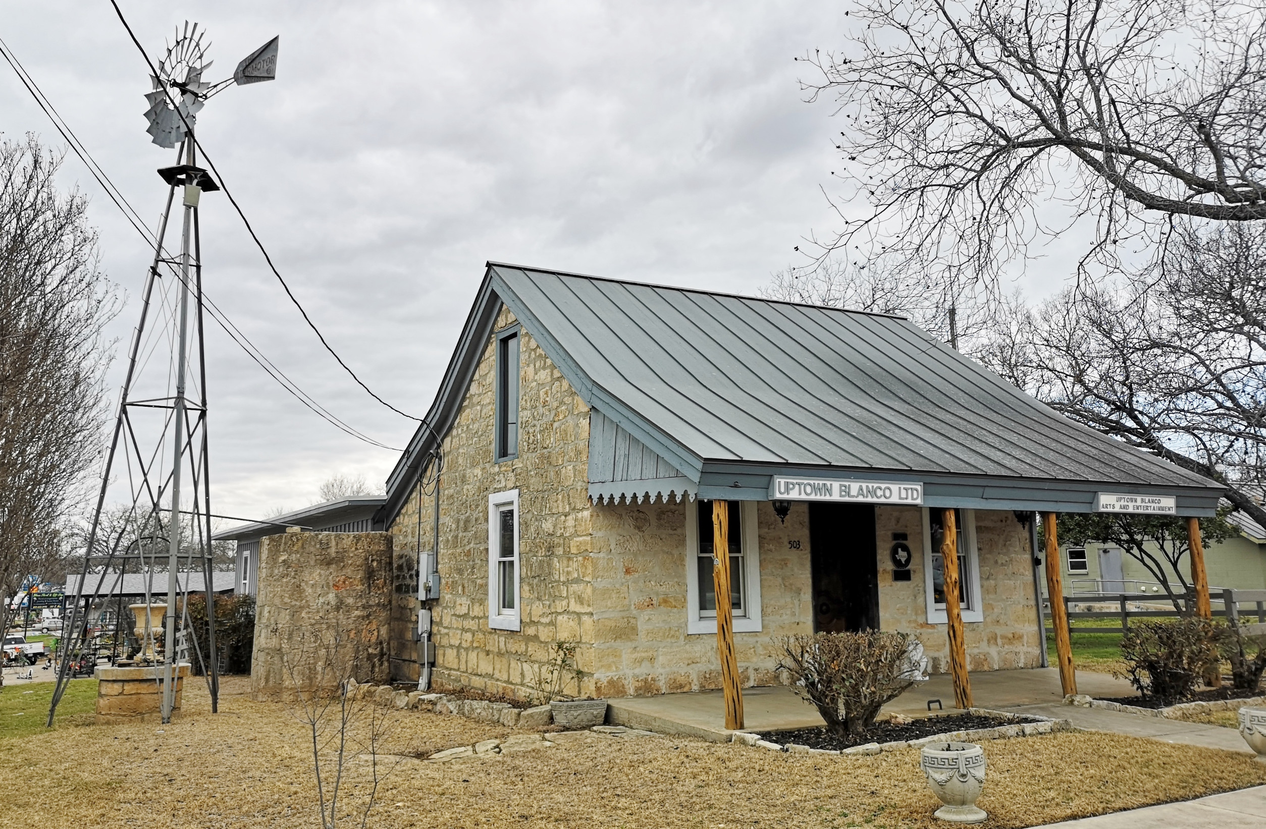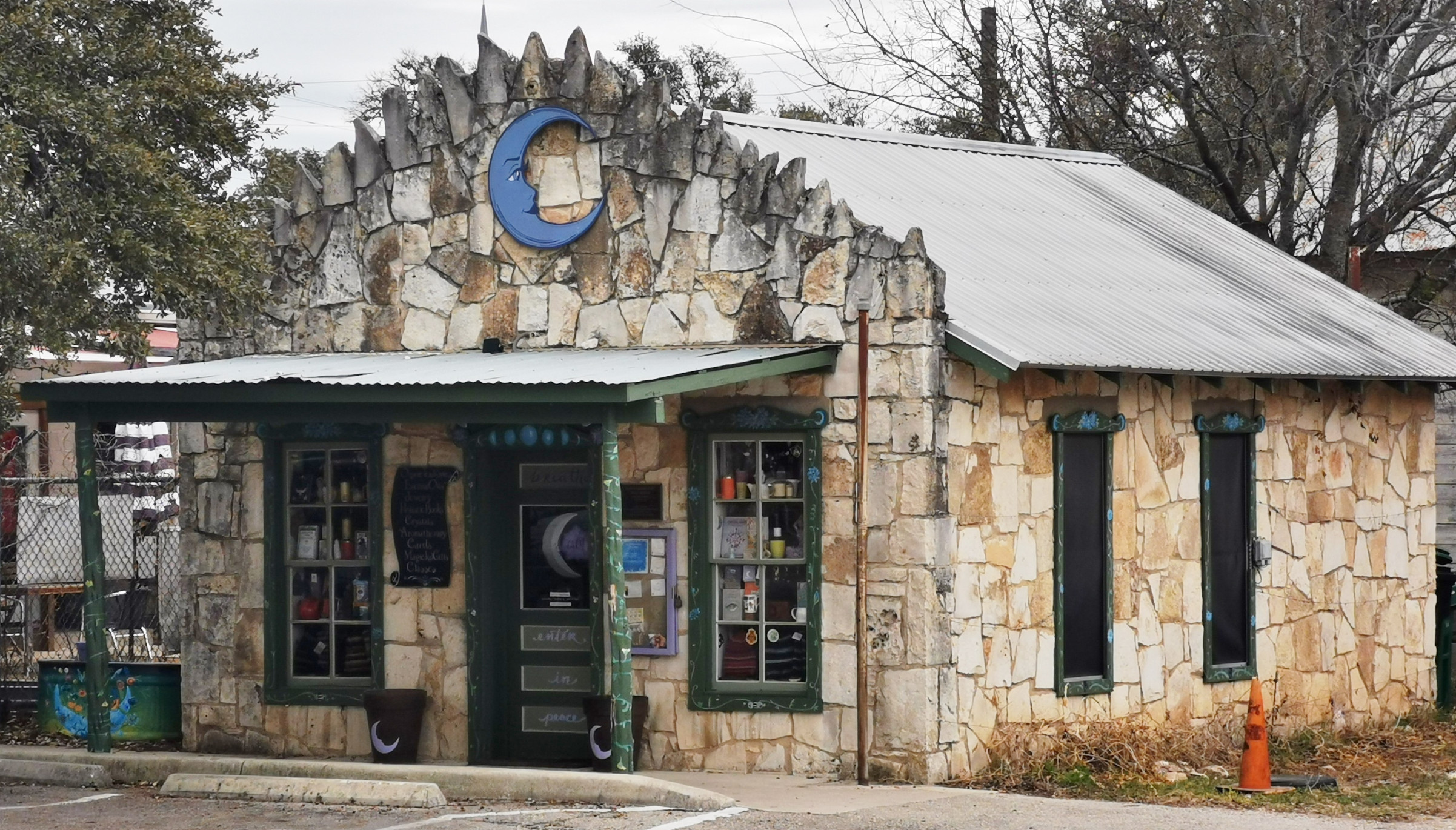 When we left McKinney Falls SP, we were heading SW to Blanco SP, but our research showed that there were 32 breweries, wineries and distilleries in the Dripping Springs area that we would be driving through, so we decided to make some stops. Our first stop was Acopon Brewing Company and the brewmaster said they didn’t have any food for lunch so he said we could walk across the street to the British Bakery and pick up food to bring back. They had some really interesting things there, so we tried the Puff Chicken Pot Pie, the Jalapeno Sausage Roll, the Scotch Egg, and a Chocolate Peanut Butter Brownie. We took the food back to the brewery and I bought a flight of beer which included, Society #7 Chocolate Cherry Milk Porter, Saturnalia IPA, Clockwork IPA, and the Baykok Imperial Stout. I really liked 3 of the 4 beers and we also really liked the British Bakery food! A cool feature at this brewery was that you could buy cans of the draft beer to go. He filled the can with the draft I picked, put a lid on it, and put it in a press to seal it, so naturally I bought a couple to go.😉 After lunch Sharon checked out some of the historic buildings and shops in Dripping Springs and the slide shows one built in 1937 that served as a barbershop and post office.