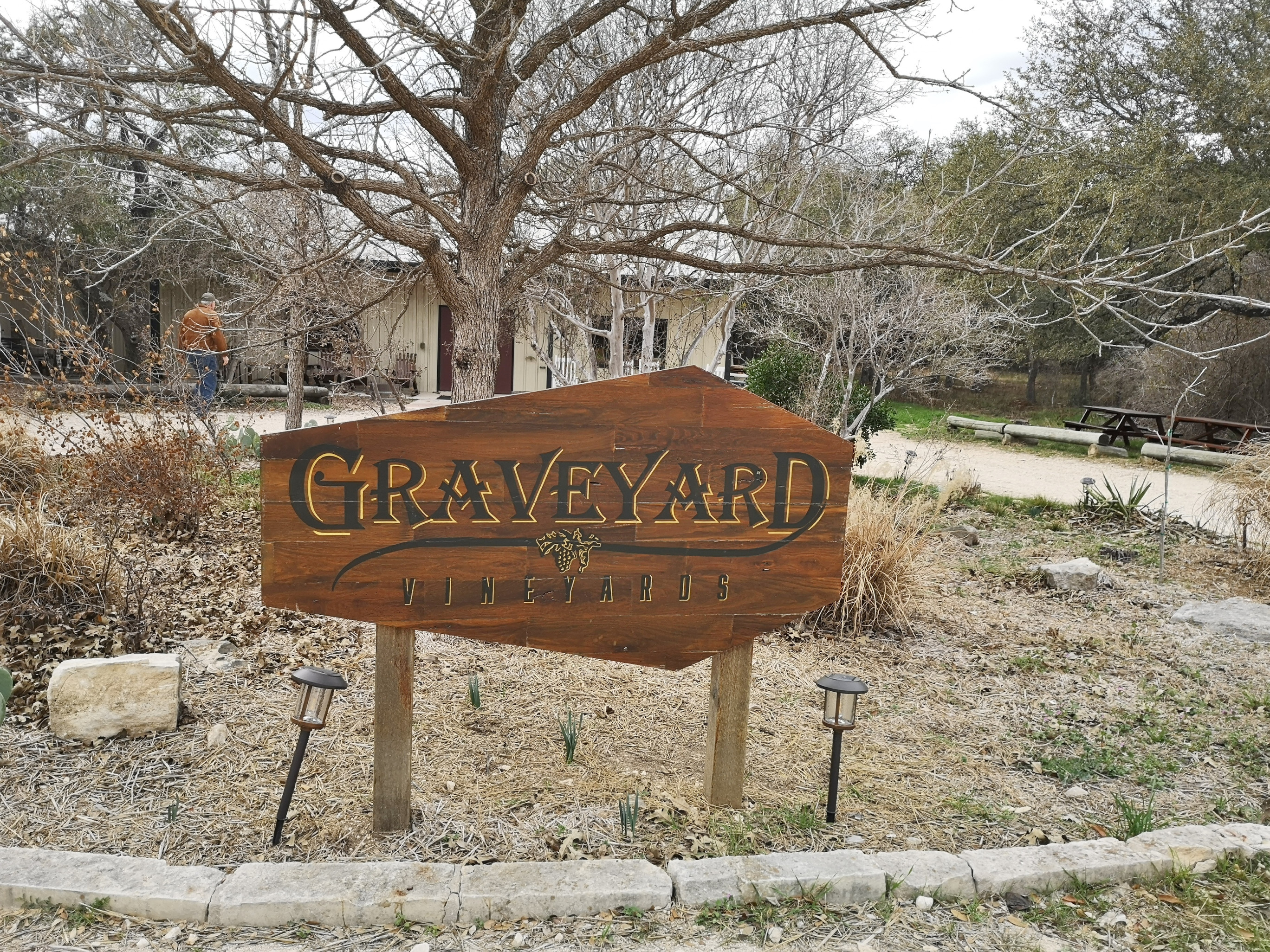 Since we went to a brewery, we thought we would also try Graveyard Vineyards just off the main road, we liked the name as it reminded us of Coffin Ridge Winery back home. We didn’t know when we chose it that it was not a Texas winery but instead a Paso Robles California winery that just had a tasting room in Texas. However, it turned out they had excellent wines, some of the best we’ve tried on this trip, so we shared a red tasting flight and then bought 3 bottles.