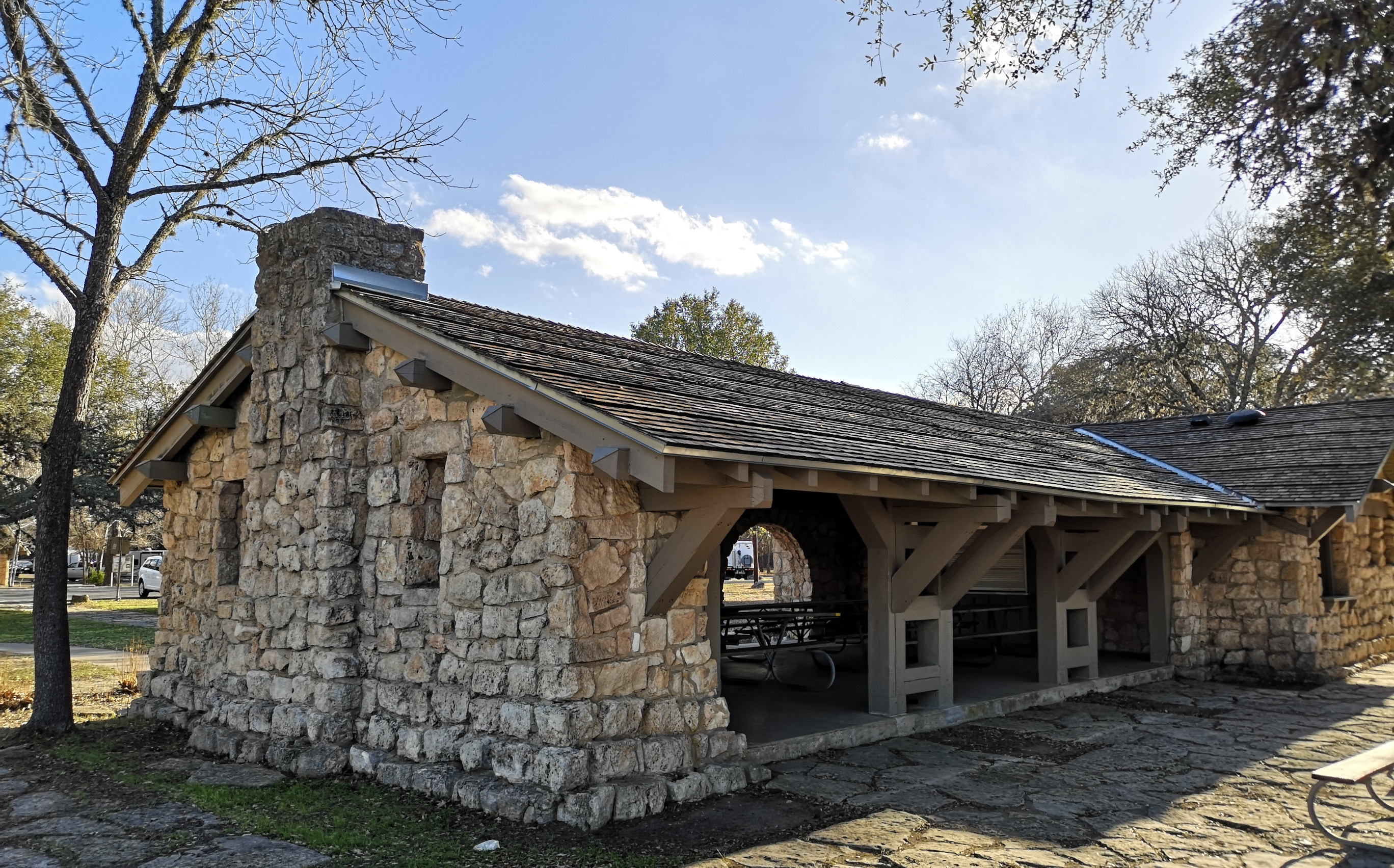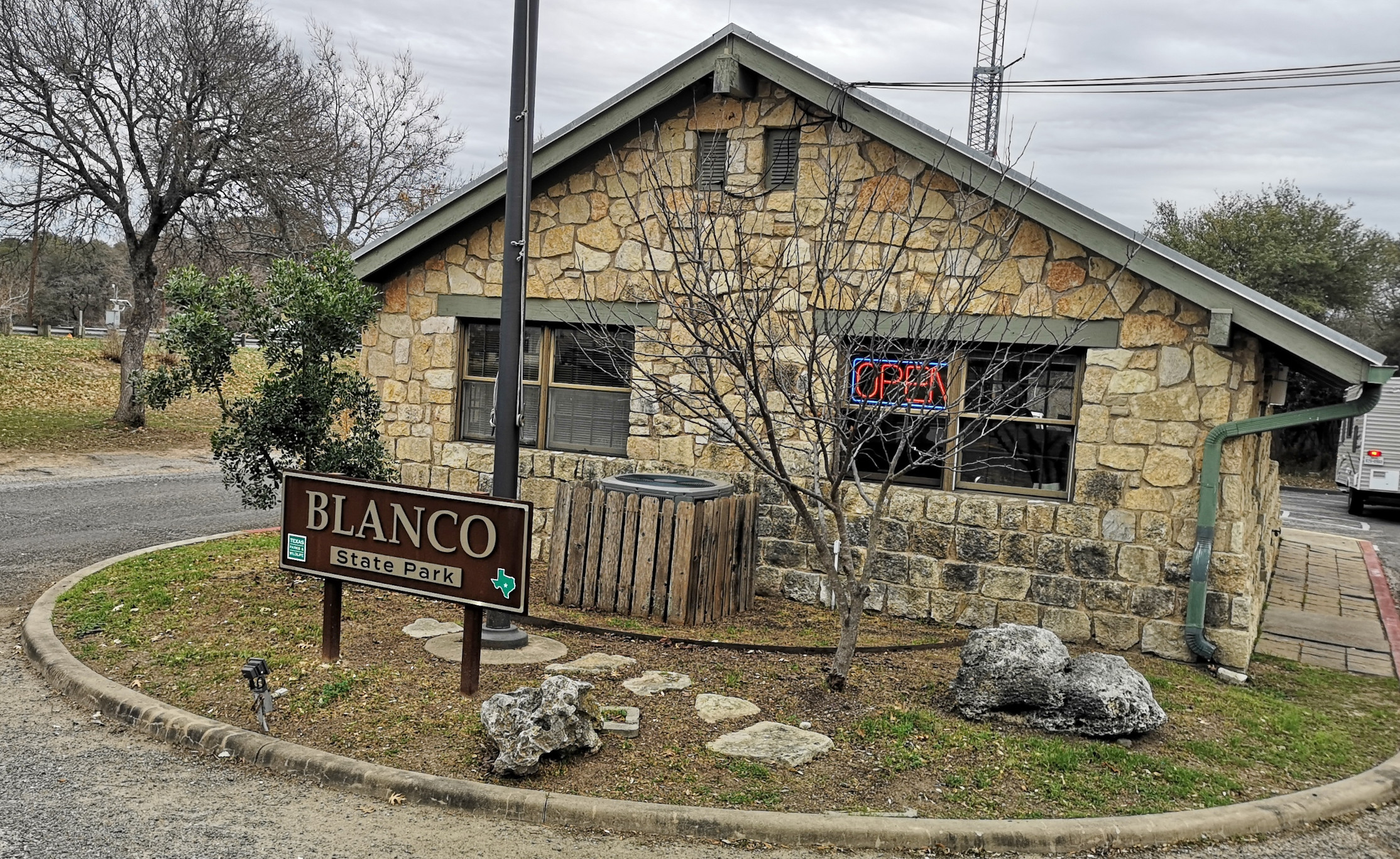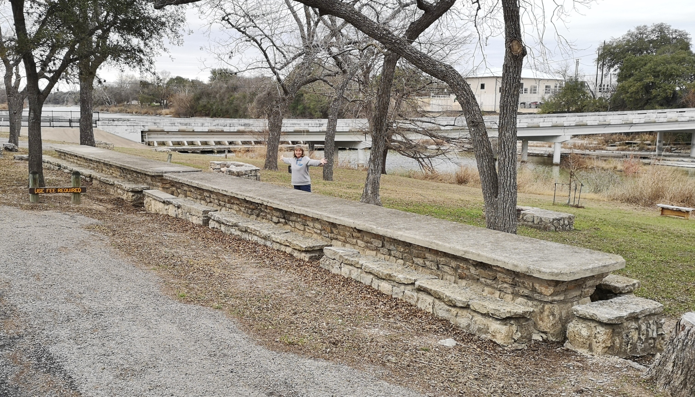 Blanco SP is a relatively small park but we had picked it because we could get a campsite for the weekend. It basically straddles the Blanco River right in the town of Blanco and was built by the CCC in 1933. After checking in you drive across a low water crossing to get to the campsites. We had done some grocery shopping before arriving, so the first thing Sharon did was sample the really good Blue Bell ice cream we had purchased😉 Reason being, the RV freezer doesn’t keep ice cream hard so you need to eat it right away! After that we did a short walk around the campground and down the river to see some of the CCC built structures.