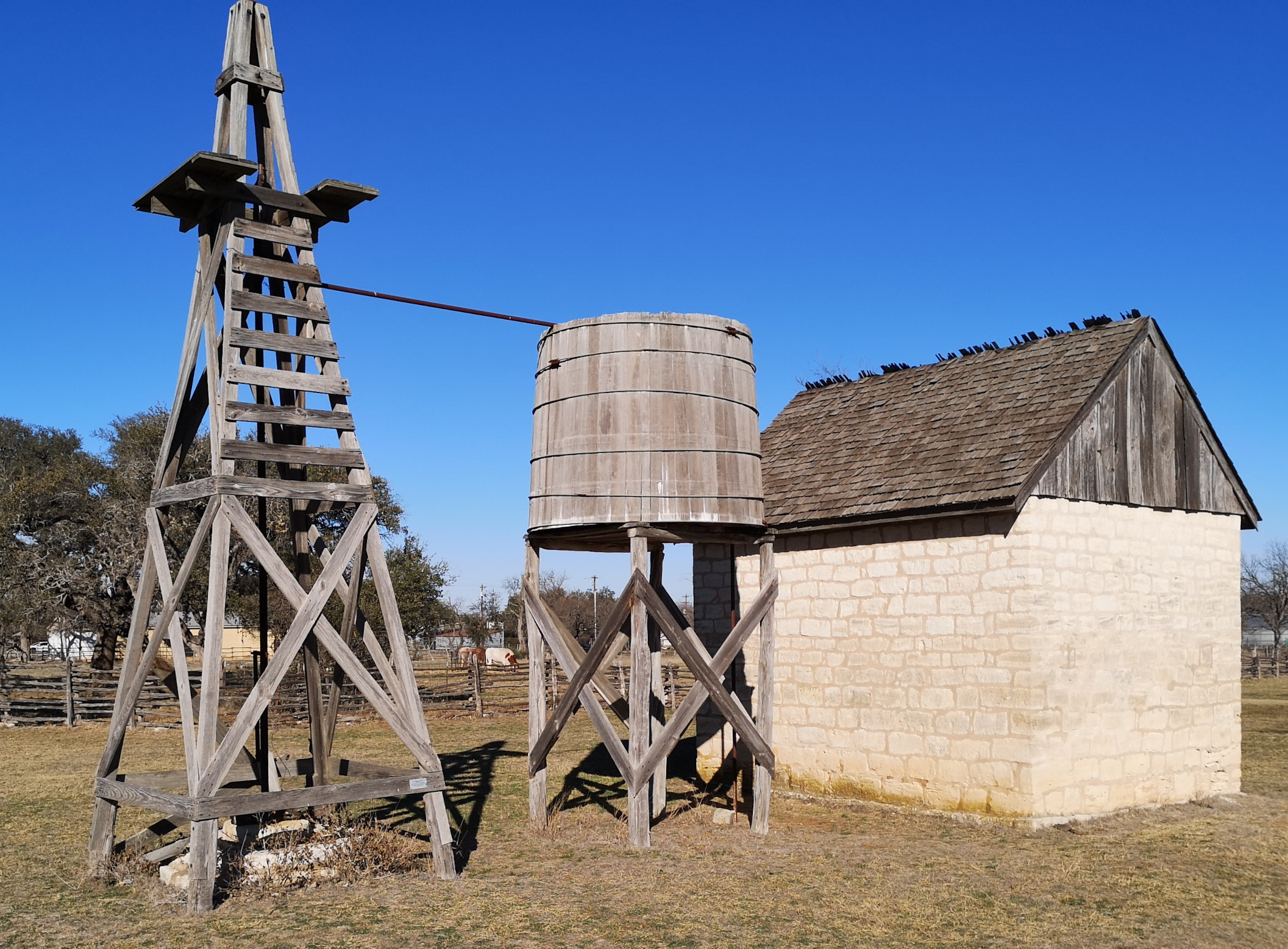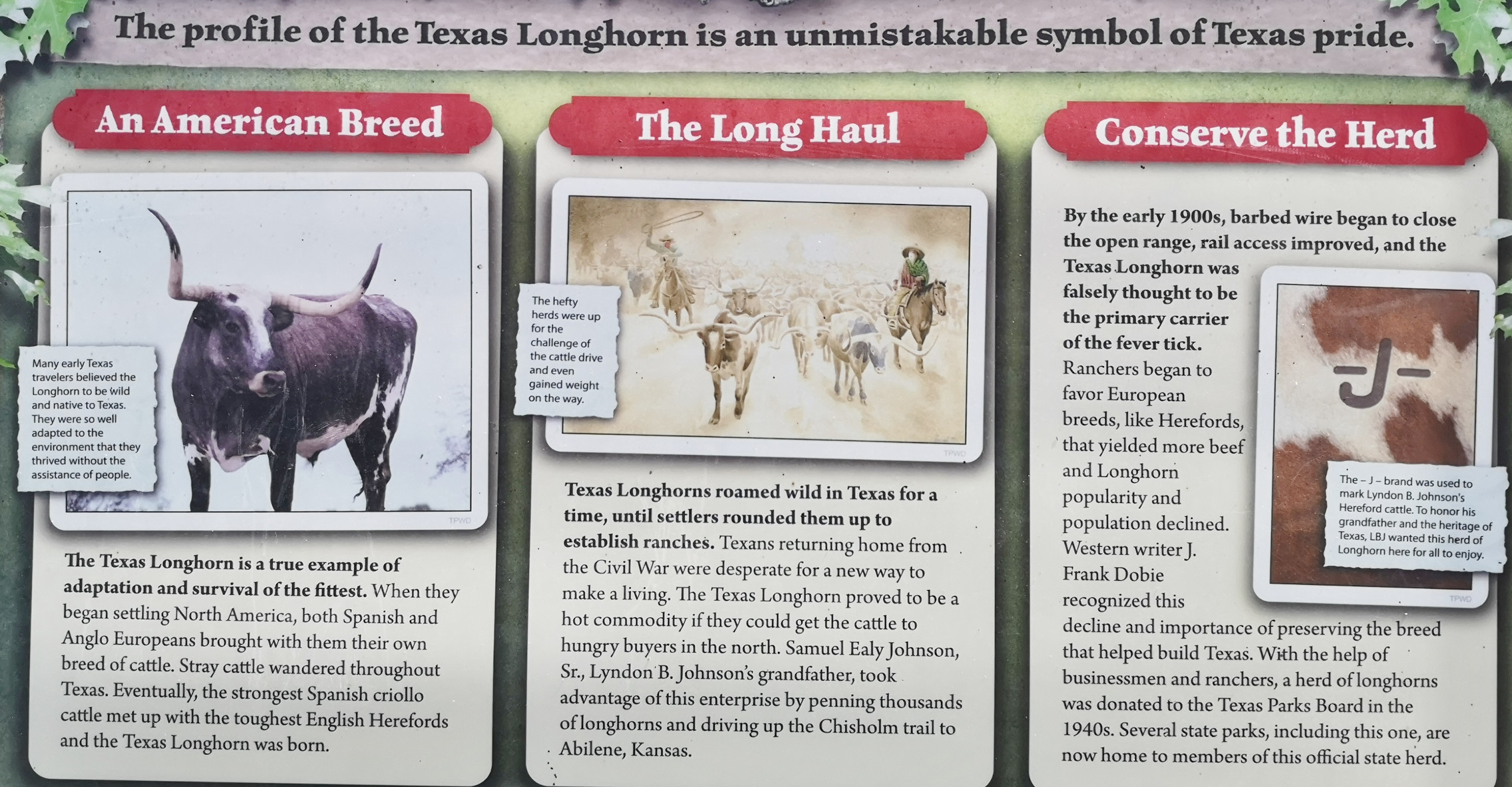This information came from the exhibits and after that we proceeded to do a walking tour to see his boyhood home, and the Johnson Settlement where they had the information about LBJ’s parents and grandparents, the Dog-Trot cabin, the Bruckner Barn, James Polk Johnson Barn, the Windmill, Water Tank and Cooler House, and some longhorn steers.