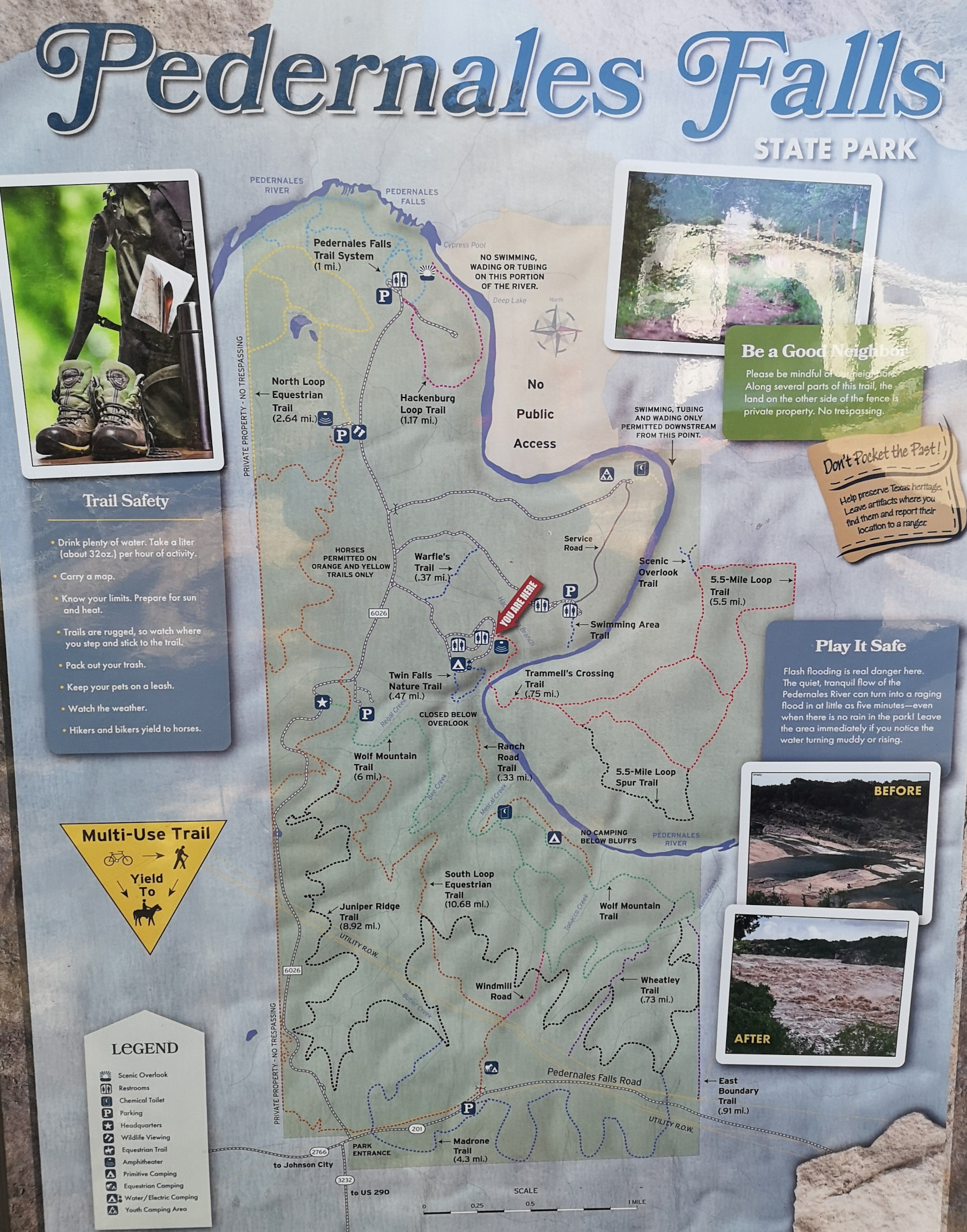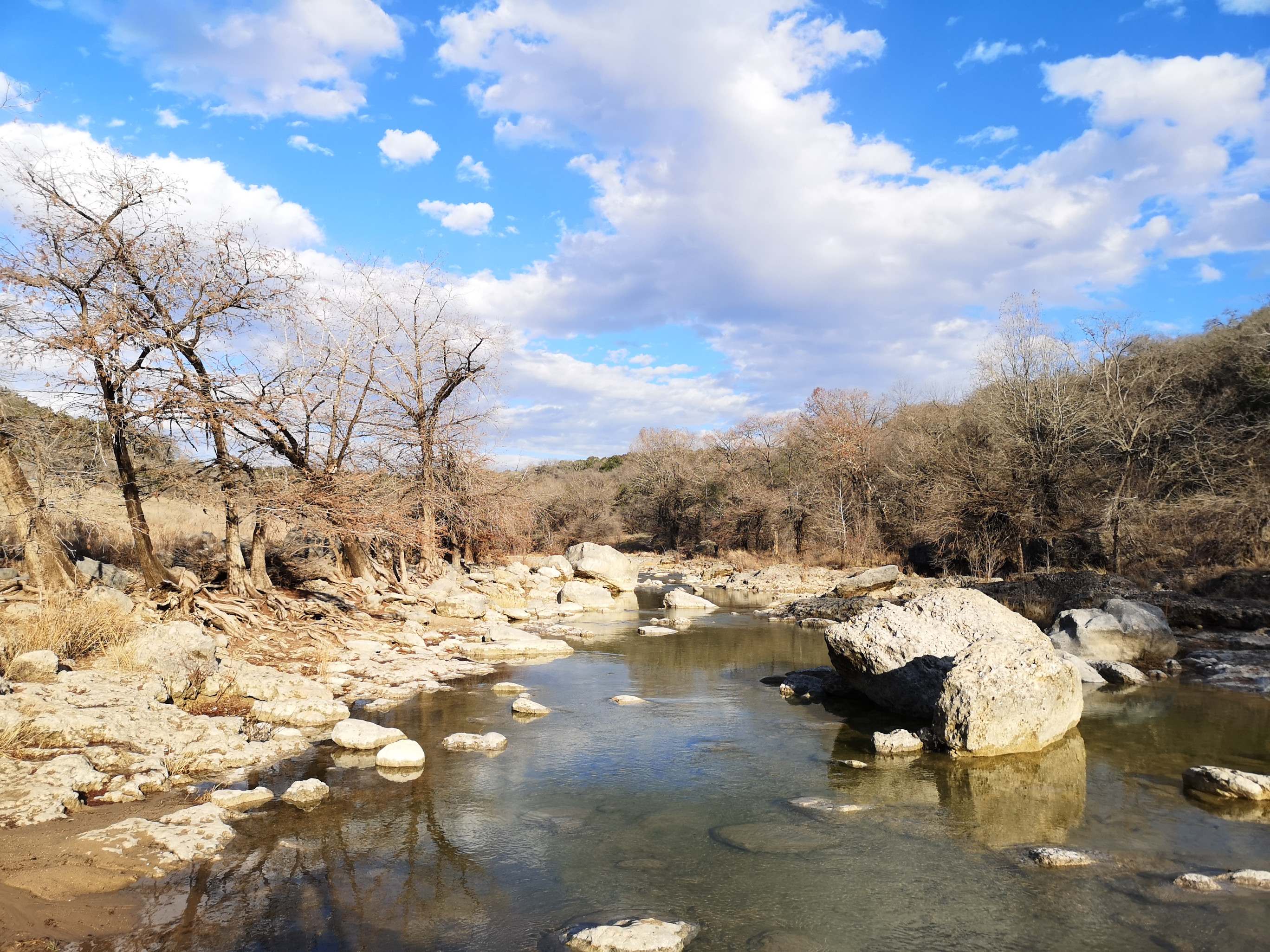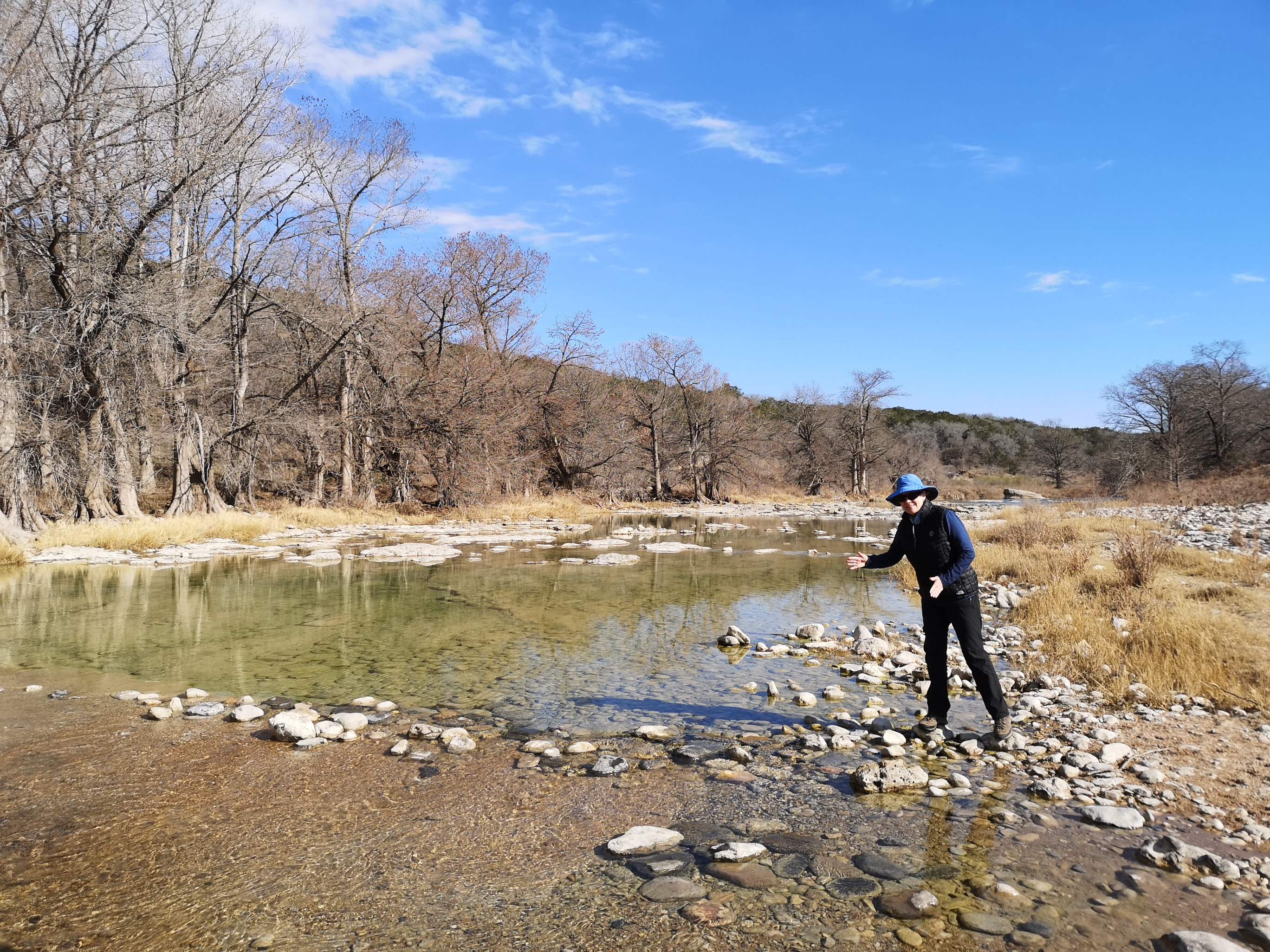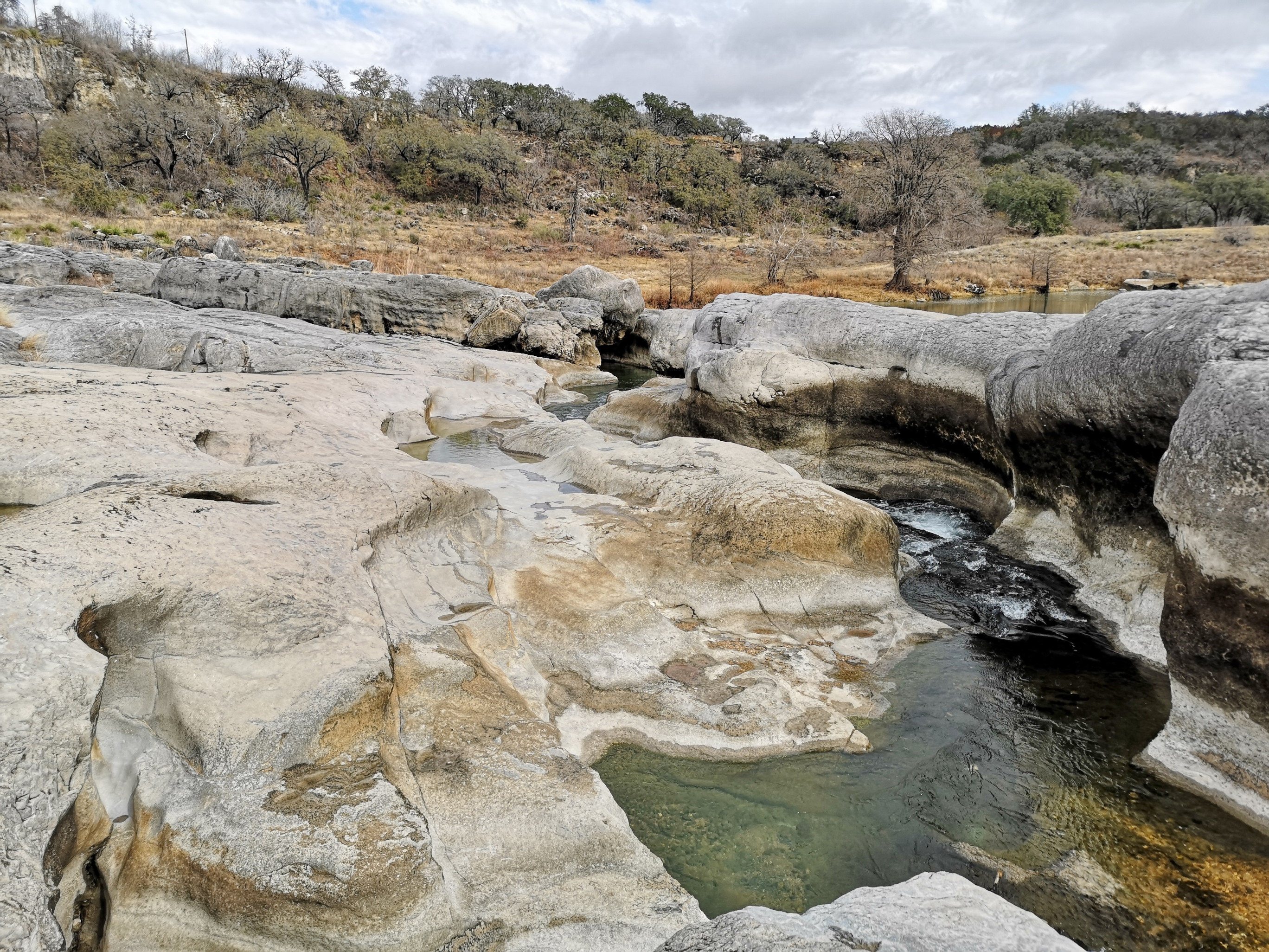 Once we finished at the historical park, we had a short drive to Pedernales Falls SP. We arrived at 5 pm and checked in but when we went to our site it had a 3.8-degree slope and even if we used all of our levelling blocks, we wouldn’t be able to get into an acceptable range so we went back to the office and luckily the ranger swapped us into another site that was available for 4 nights. This park turned out to be another one of our favourites for this trip due to the hiking, Mountain Biking, and geological features. On the first day we decided to do a hike so we crossed the Pedernales River at Trammell’s Crossing (you could step on stones so your feet didn’t get too wet) and then had a steep climb until we got to the junction to do the 5.5-Mile Loop Spur and then on to the actual 5.5 Mile Loop trail, eventually ending up both the river and hill country overlooks. At the one overlook we met a Texan who was doing some warmup hikes for an upcoming trip to Scotland, so we talked about what we had done on our 2 trips to Scotland. On the way back to the campground we did the Twin Falls Nature trail which reminded us of areas in the Bruce Peninsula but of course with different vegetation (12.5 km total).