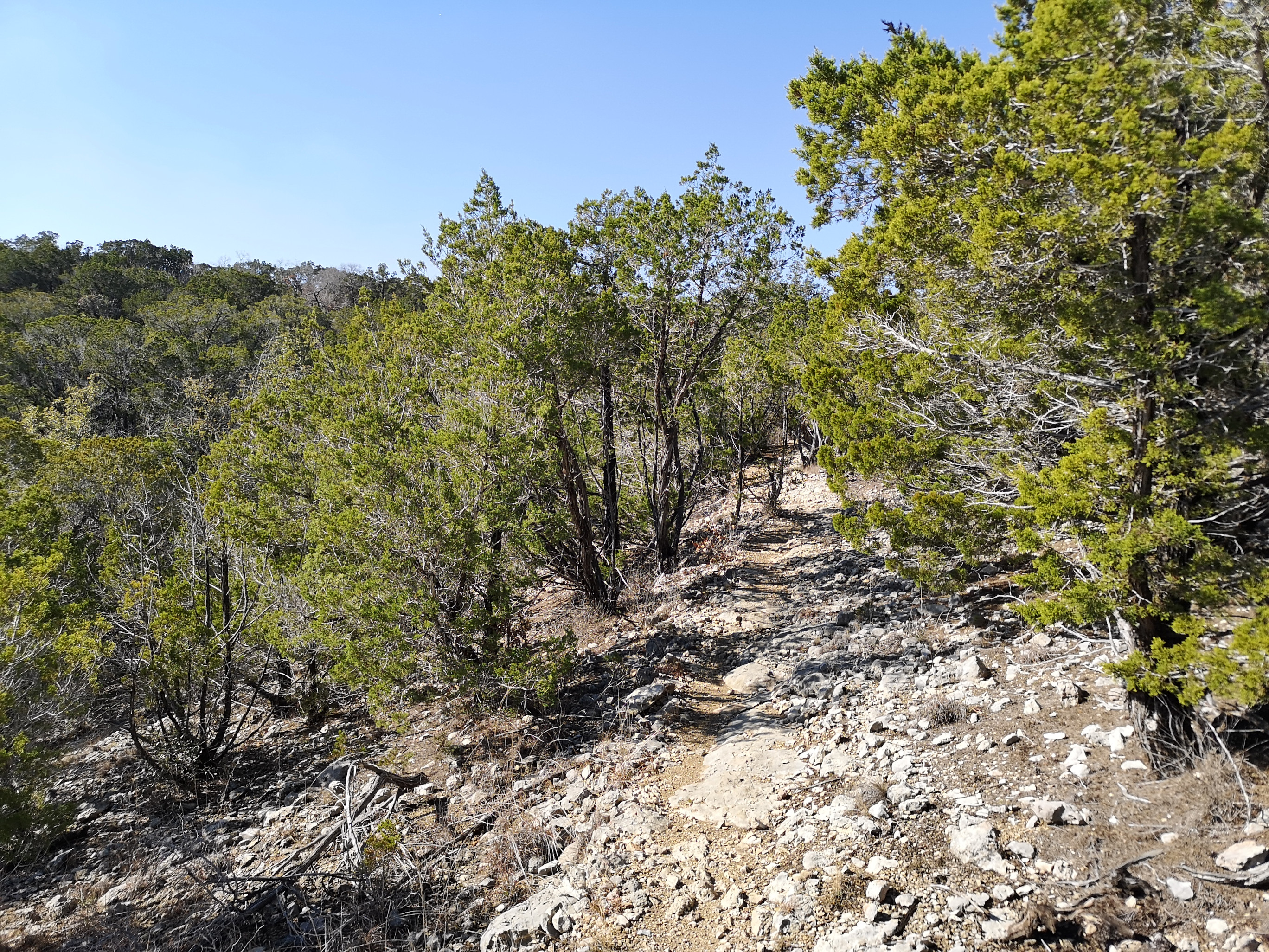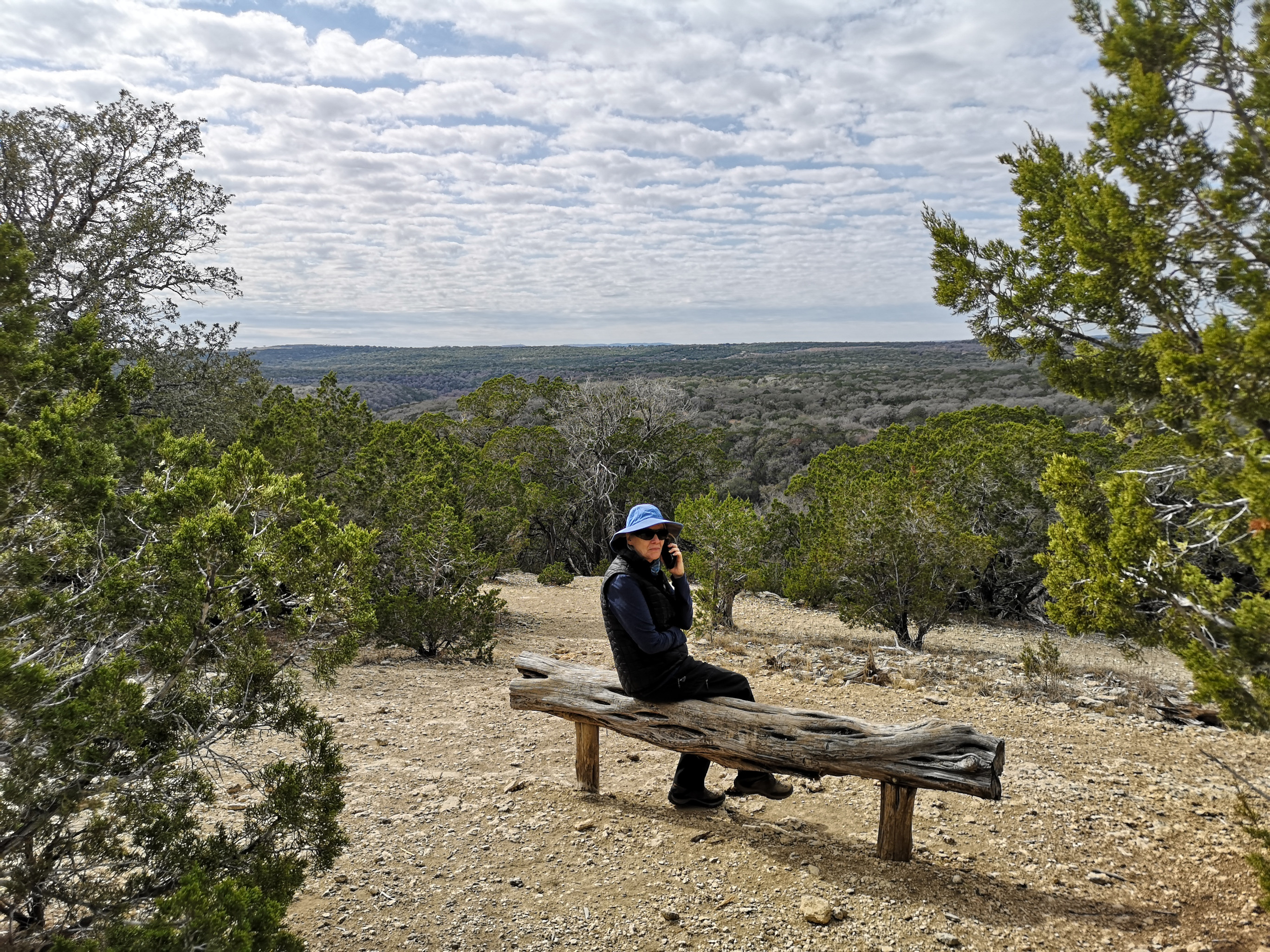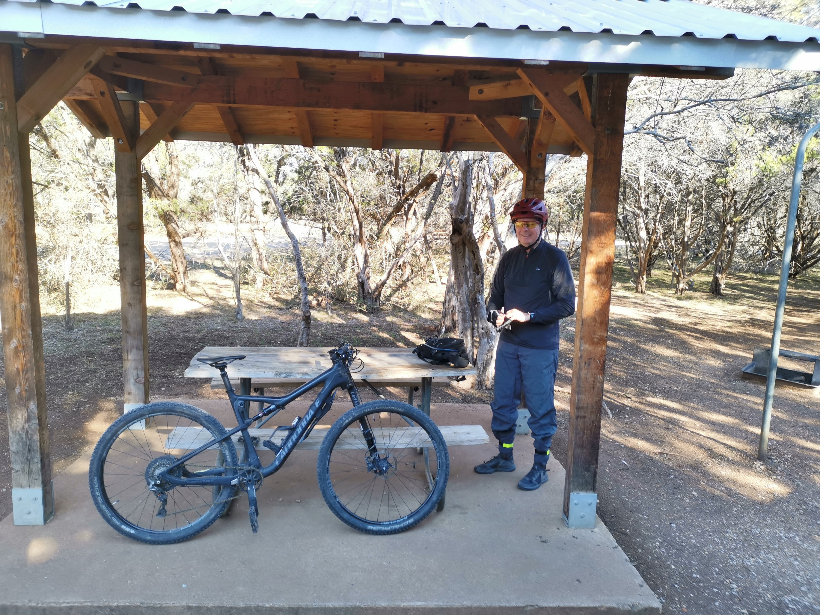 The next day it was raining in the morning but cleared in the afternoon so we drove the RV over to Pedernales Falls and did about 6 kms of wandering around the falls area and the Hackenburg loop. The falls were more of a trickle but the rock formations and how the water carved out the limestone was cool to see. Some people call it a horizontal falls because the water is flowing across and down this carved limestone. There are lots of warnings about flash floods but it’s these floods that help shape the landscape of the park. They say 6 inches of fast-moving water can knock a person off their feet! The minute you see brown water go to higher ground. They also have a monitoring system they use to warn people. Similar to our rocks at home, this used to be an ocean floor so there are lots of fossils in the rocks. The greenish hue of the ponds was a nice contrast with the rock colours and the blue sky. When we got back to the campground, we met Kris and Susan and their dog Basil as they were asking us about the Komo bike carrier. They had also ridden part of the Juniper Ridge MTB Trail so they gave me some pointers for what I had planned the next day. Sharon decided it wasn’t a trail for her.