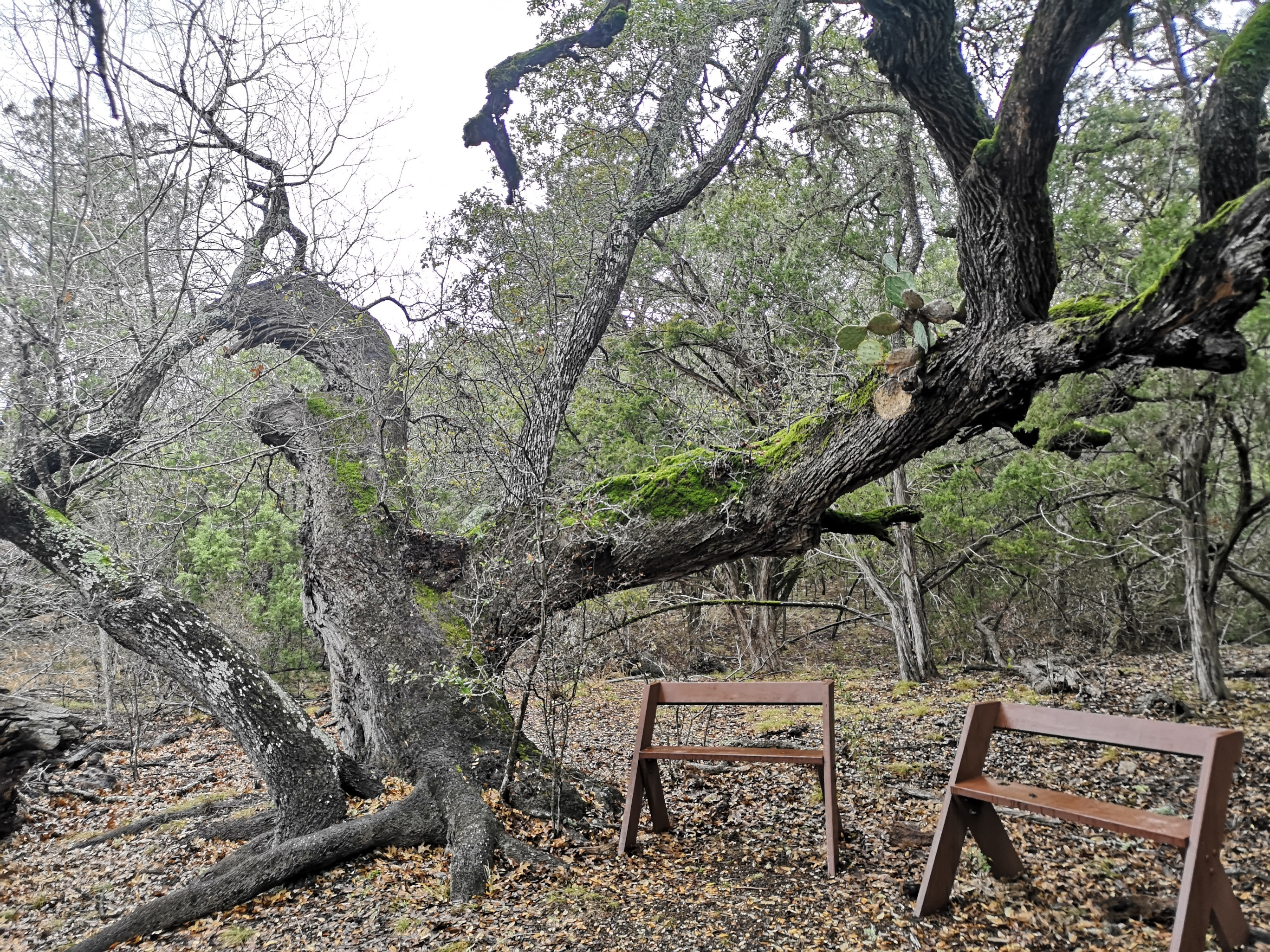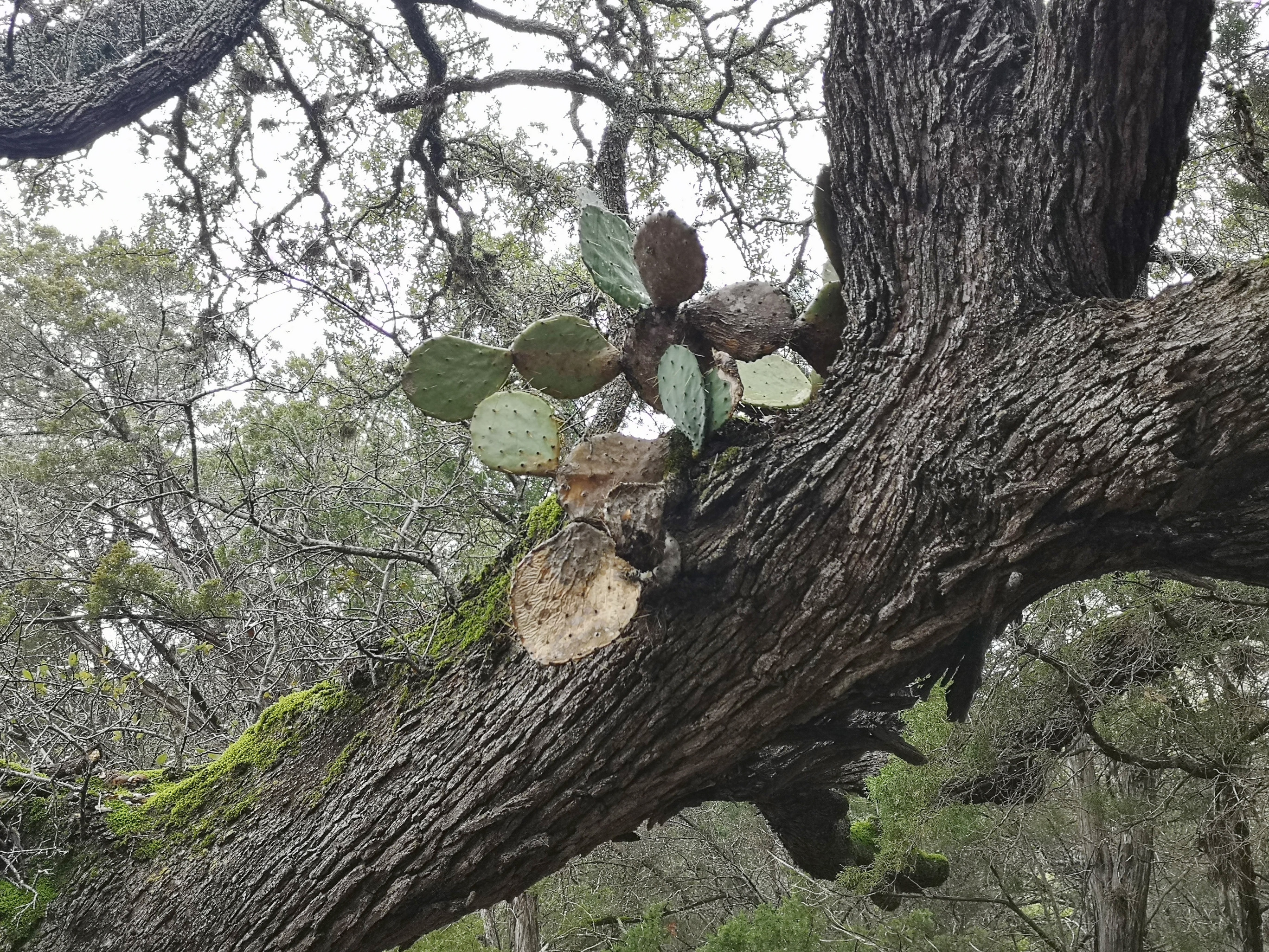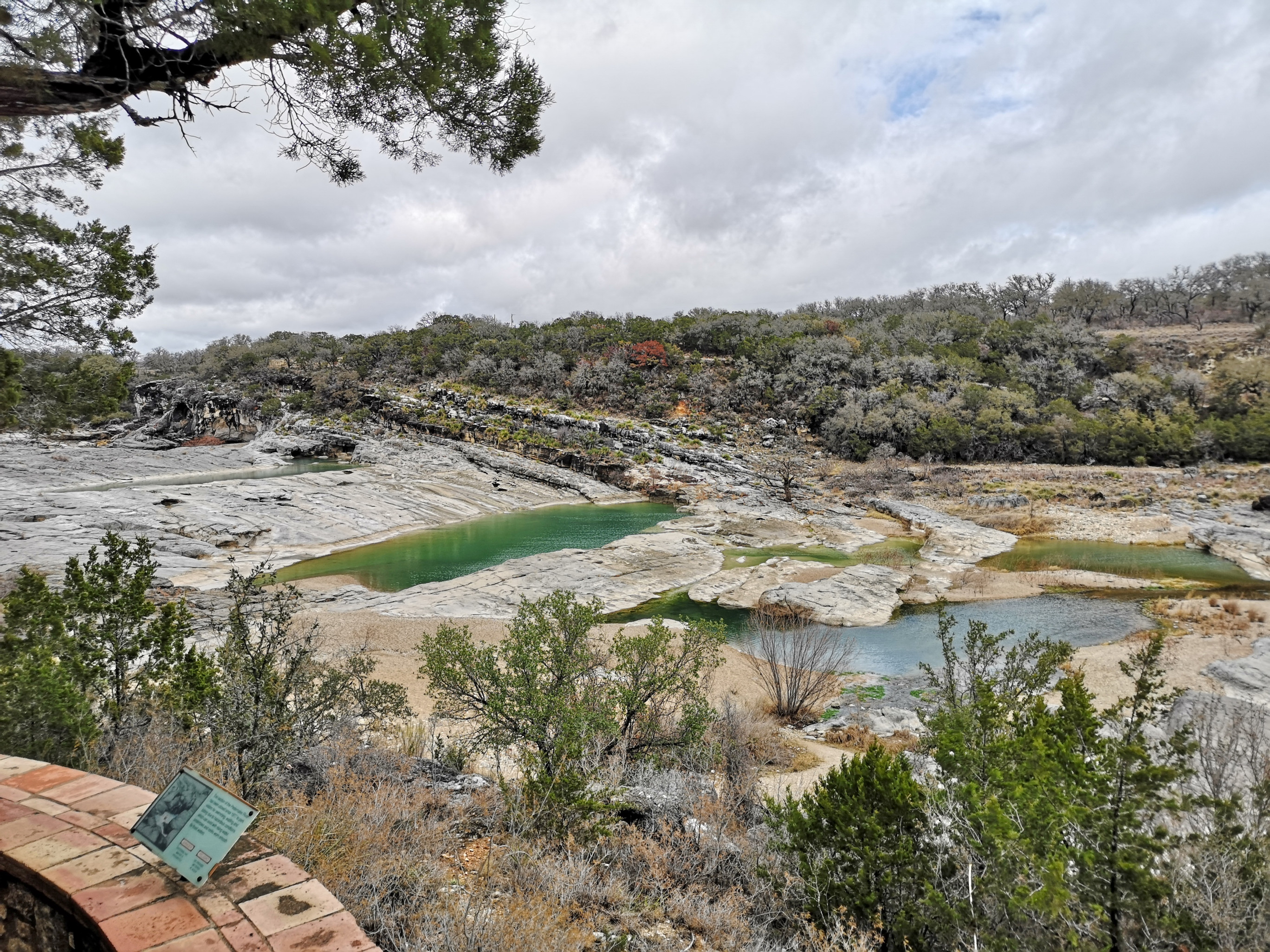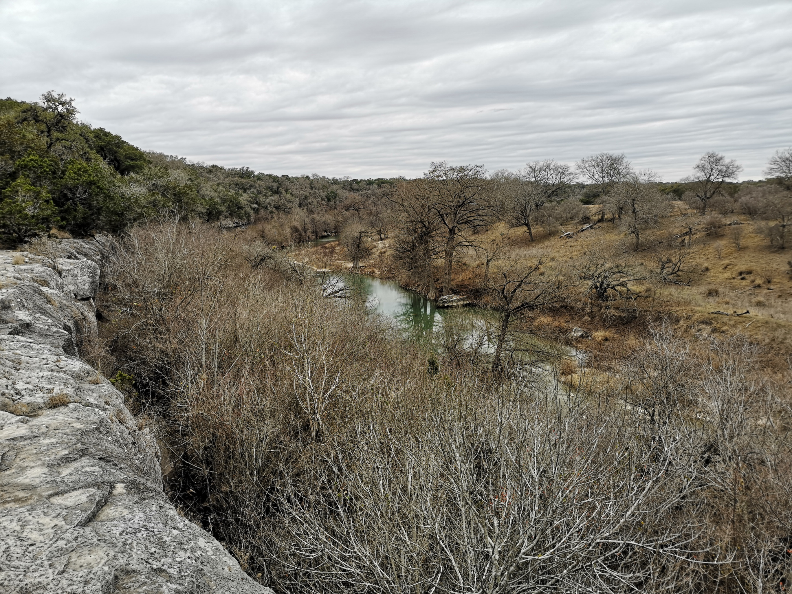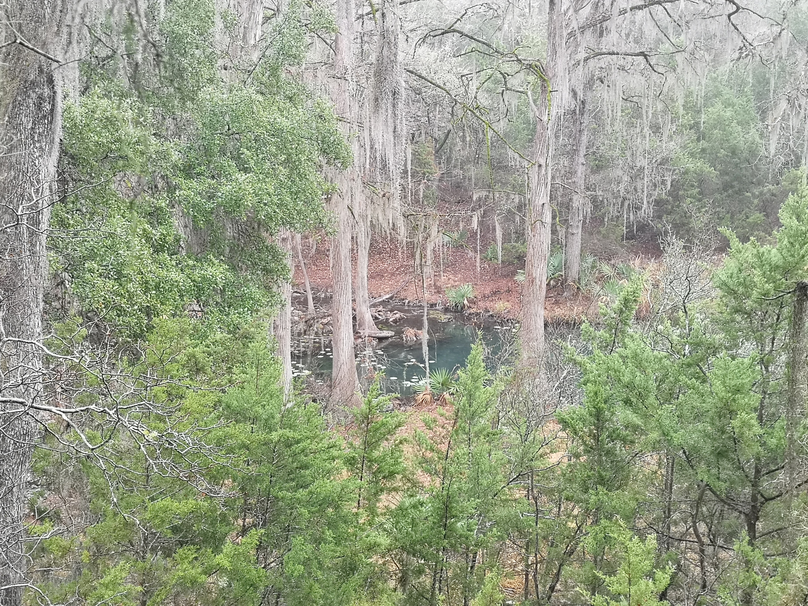 The following day we had booked a volunteer led tour of Honey Creek State Natural area that started at 9 am. This area is not open to the public except for the Saturday morning led tours. The volunteers told us that Honey Creek actually was more acres than Guadalupe River SP. It was lightly raining on Saturday morning and basically rained for most of the 3 hour tour so it was good we had our rain gear with us and we were glad they hadn’t cancelled the tour. We met at the Rust House and read about the history of the Rust family. They had 2 volunteers leading the group and a volunteer in training. They mainly spoke about the various plants we saw and also about the geology. We actually thought they would give more history about the settlers in the area like the Rust German family. For example we learned that the male Ash Juniper trees have the small cones and the female trees had berries that the animals and birds like. We also saw a bird blind where they try to catch an invasive bird species (we can’t remember the name). Then we came to an overlook for Honey Creek and it’s impossible for the photos to do justice to the green/aqua colour of the creek since we had such a grey day. Then we went down beside the creek and were totally blown away by the beauty of the area. When we left the creek, we climbed back up the escarpment and saw a large Live Oak and amazingly there was a Prickly Pear Cactus living on one of it’s branches. Honey Creek was such a beautiful unique area and we were glad we were able to come on a weekend and get slots on the guided tour.