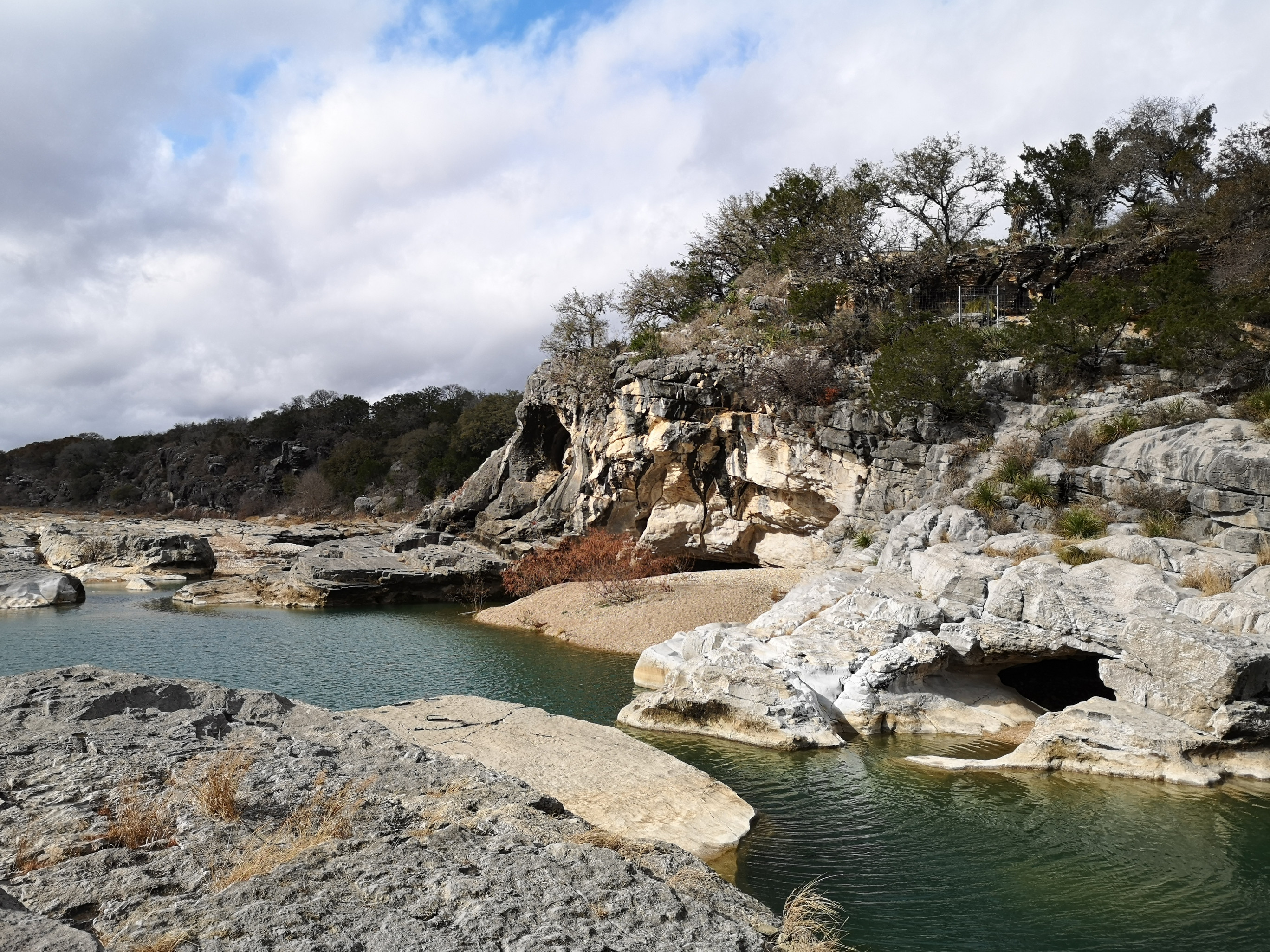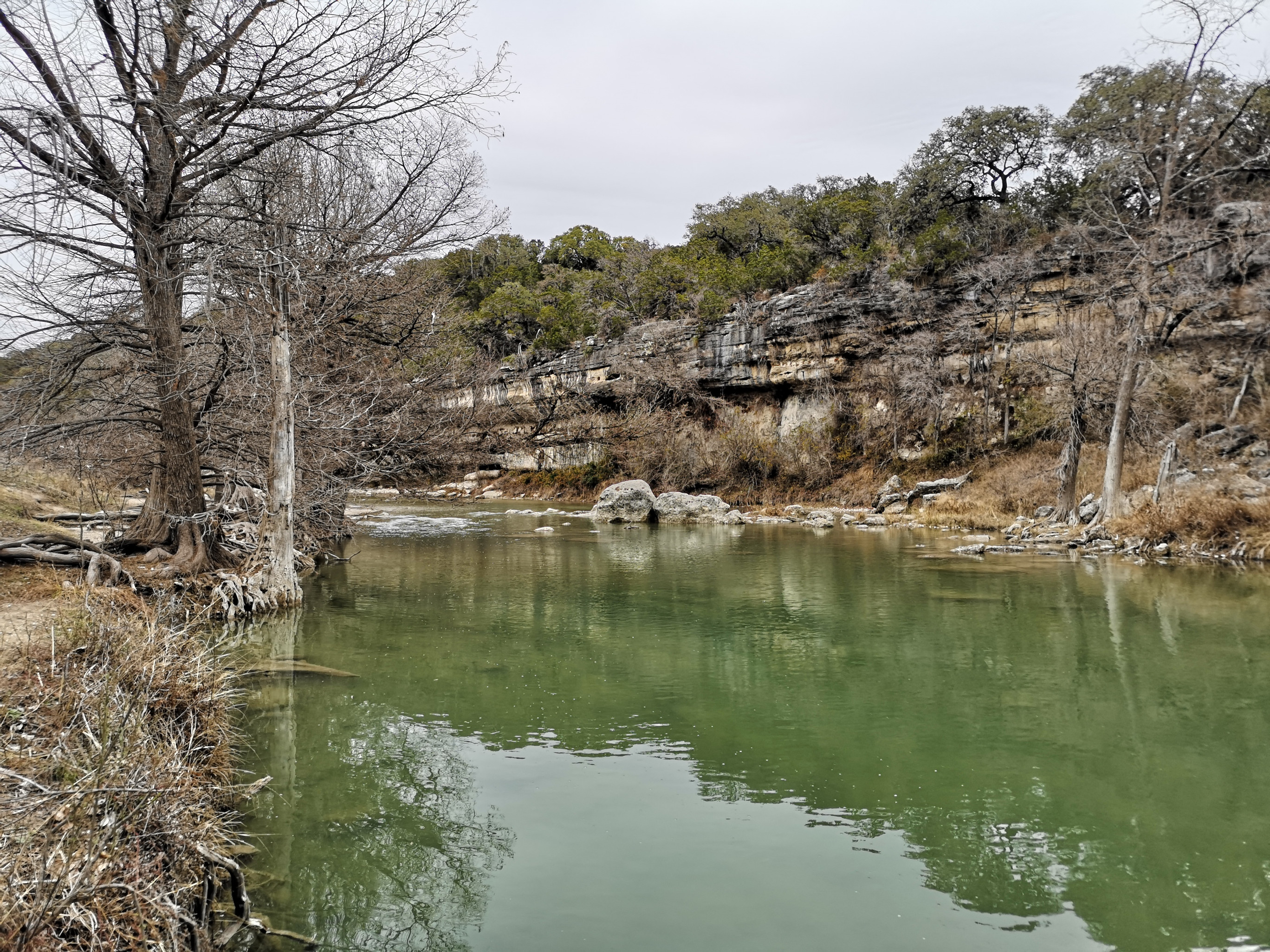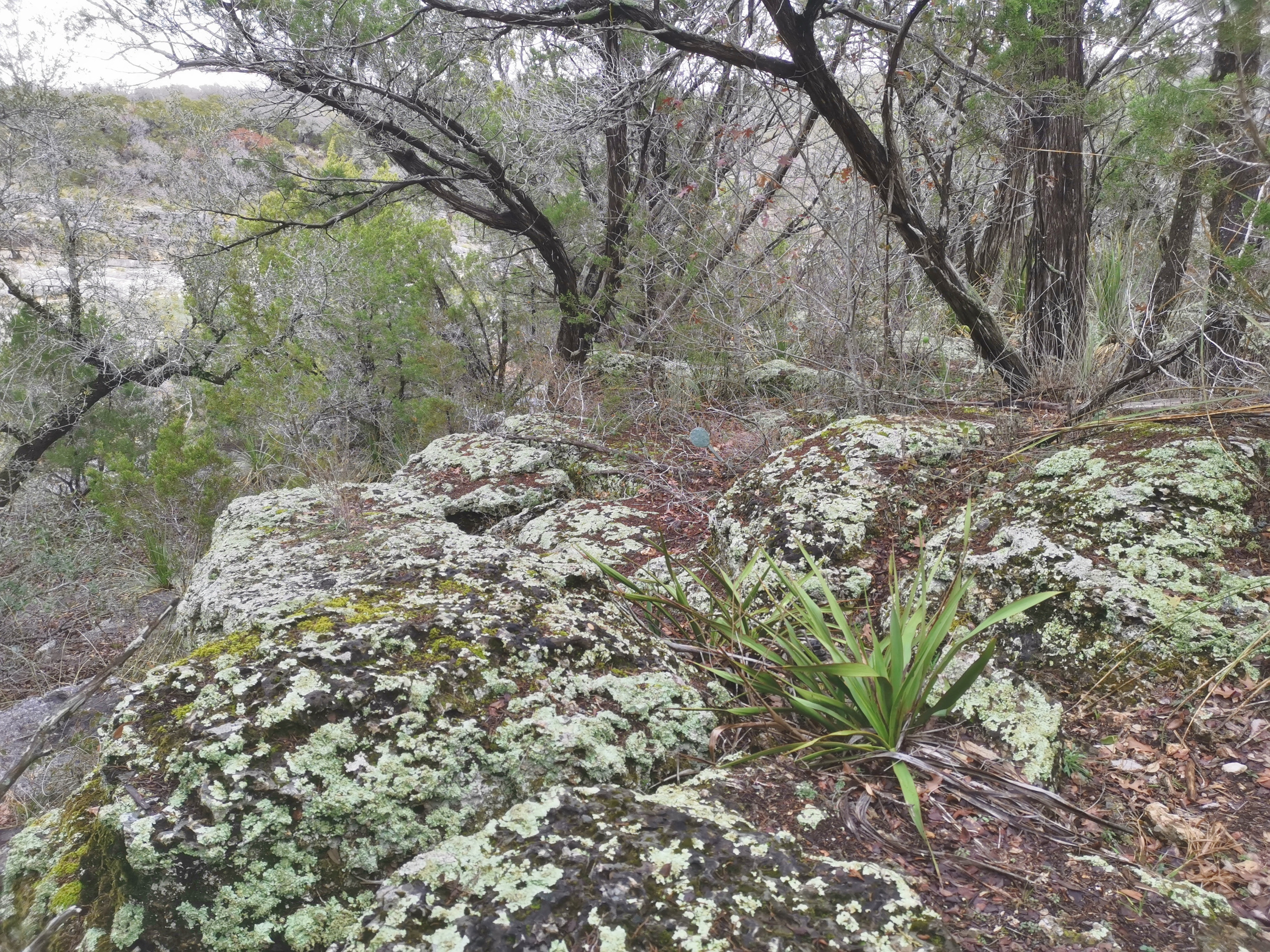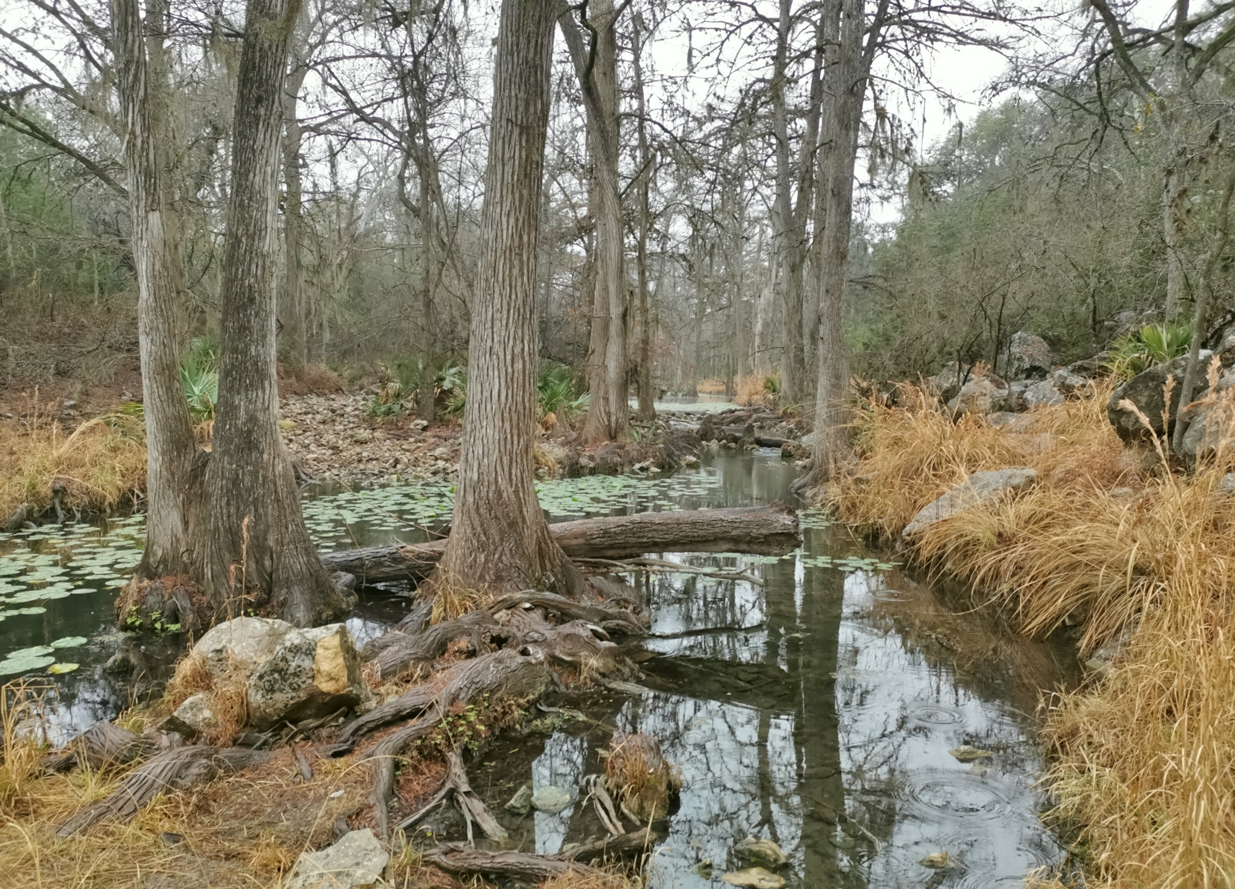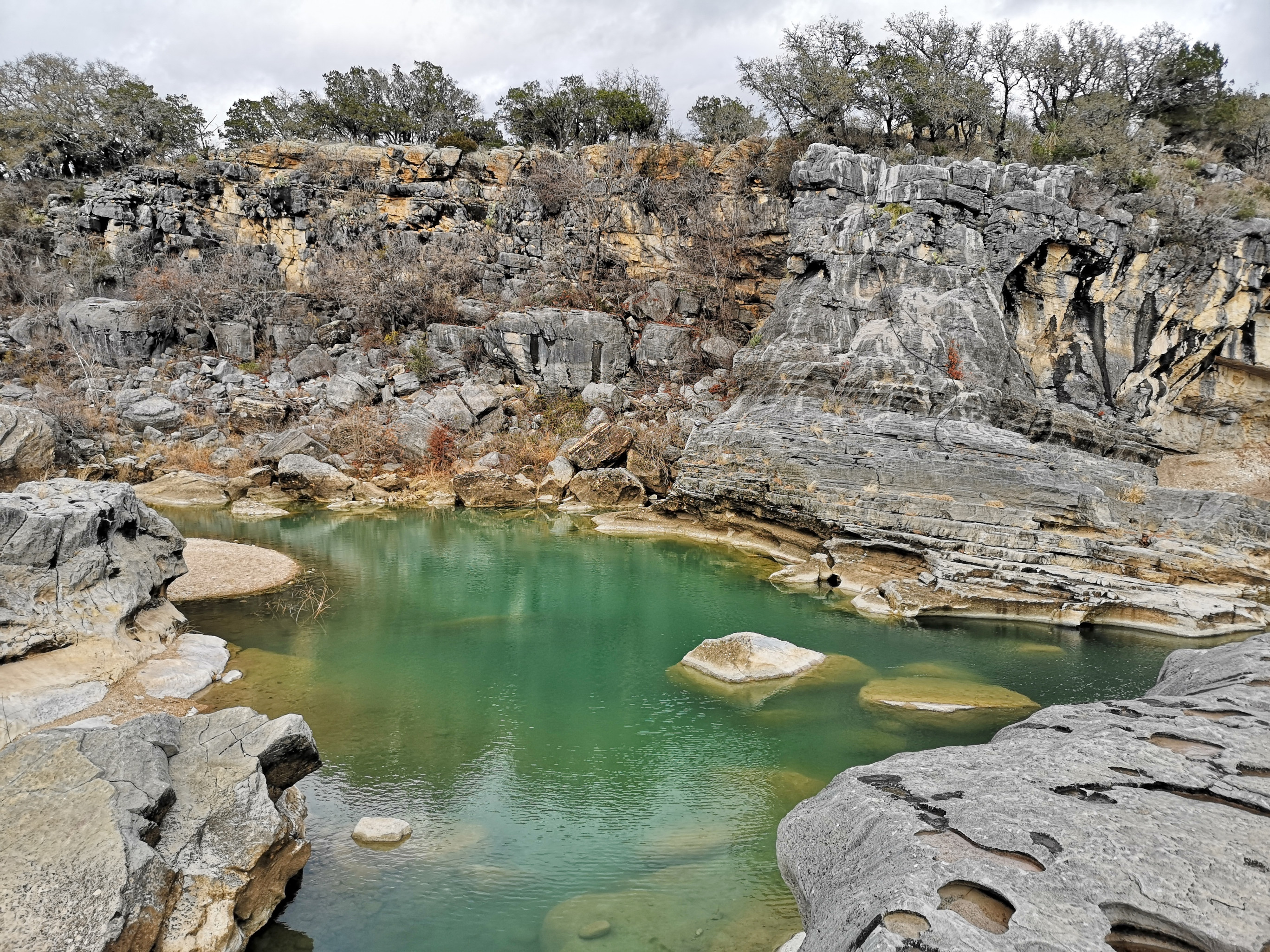 The following day we had booked a volunteer led tour of Honey Creek State Natural area that started at 9 am. This area is not open to the public except for the Saturday morning led tours. The volunteers told us that Honey Creek actually was more acres than Guadalupe River SP. It was lightly raining on Saturday morning and basically rained for most of the 3 hour tour so it was good we had our rain gear with us and we were glad they hadn’t cancelled the tour. We met at the Rust House and read about the history of the Rust family. They had 2 volunteers leading the group and a volunteer in training. They mainly spoke about the various plants we saw and also about the geology. We actually thought they would give more history about the settlers in the area like the Rust German family. For example we learned that the male Ash Juniper trees have the small cones and the female trees had berries that the animals and birds like. We also saw a bird blind where they try to catch an invasive bird species (we can’t remember the name). Then we came to an overlook for Honey Creek and it’s impossible for the photos to do justice to the green/aqua colour of the creek since we had such a grey day. Then we went down beside the creek and were totally blown away by the beauty of the area. When we left the creek, we climbed back up the escarpment and saw a large Live Oak and amazingly there was a Prickly Pear Cactus living on one of it’s branches. Honey Creek was such a beautiful unique area and we were glad we were able to come on a weekend and get slots on the guided tour.