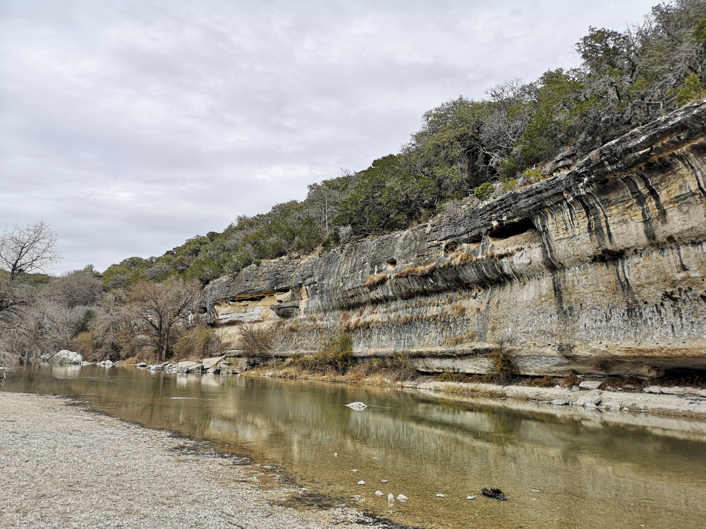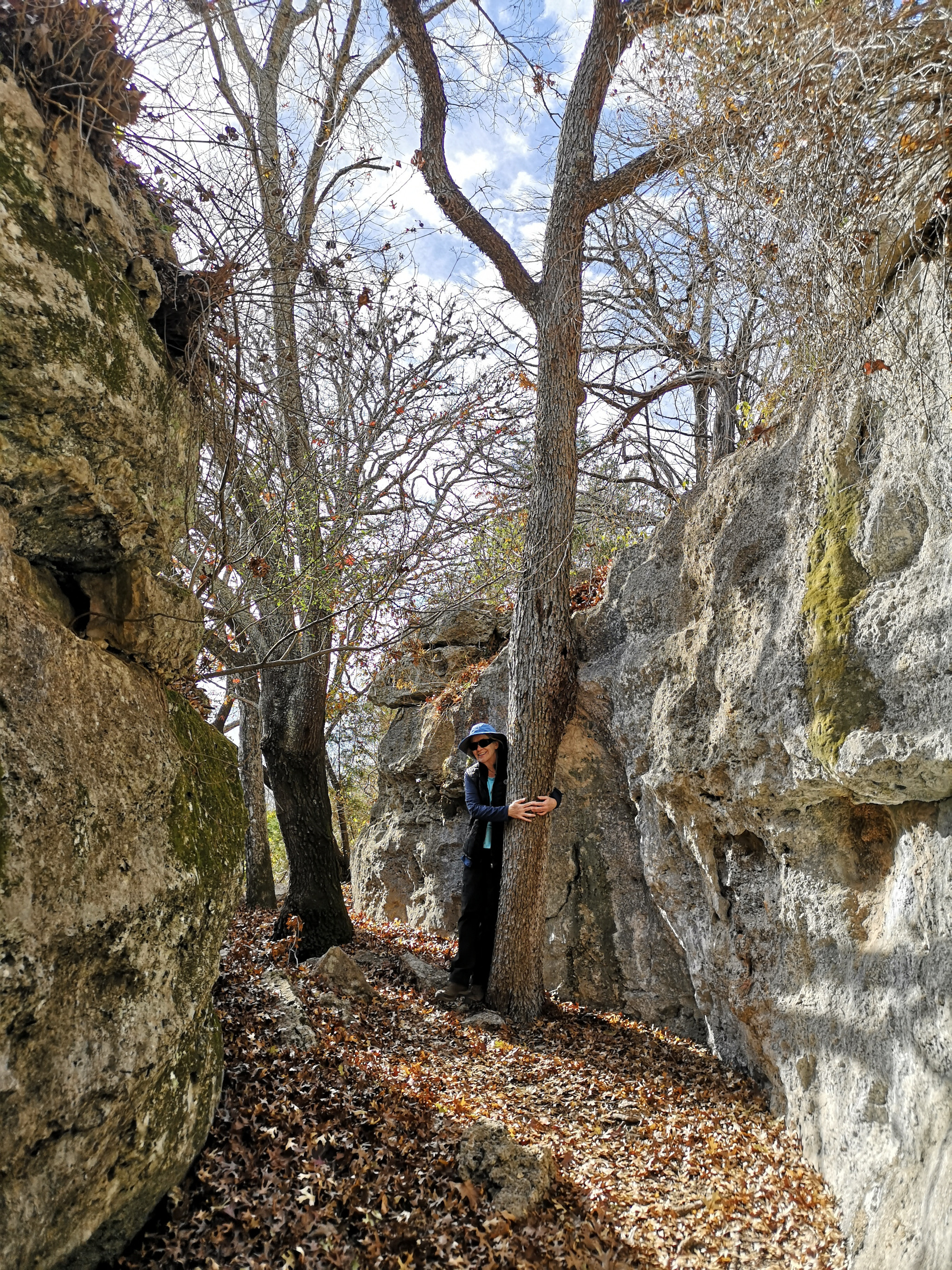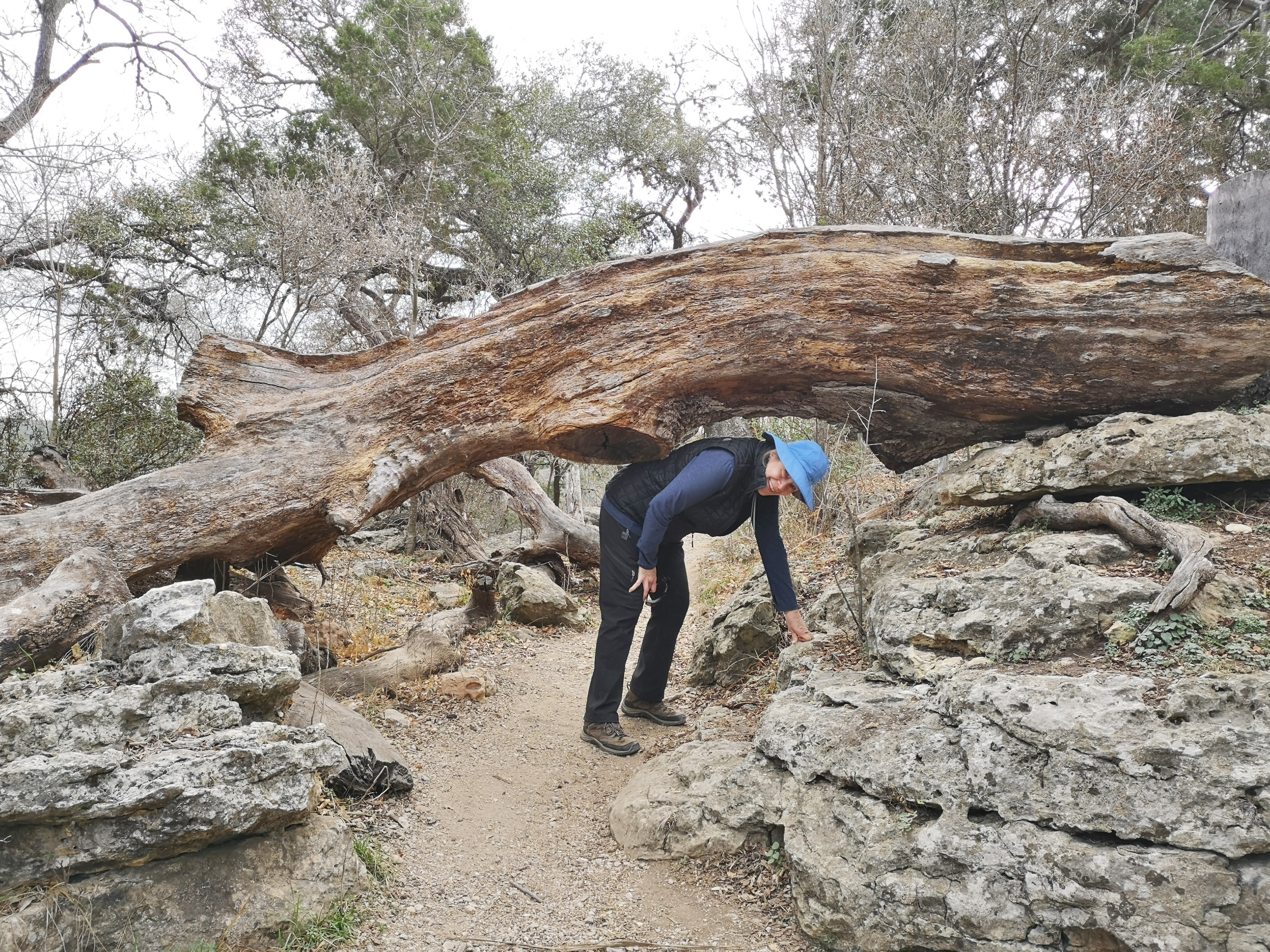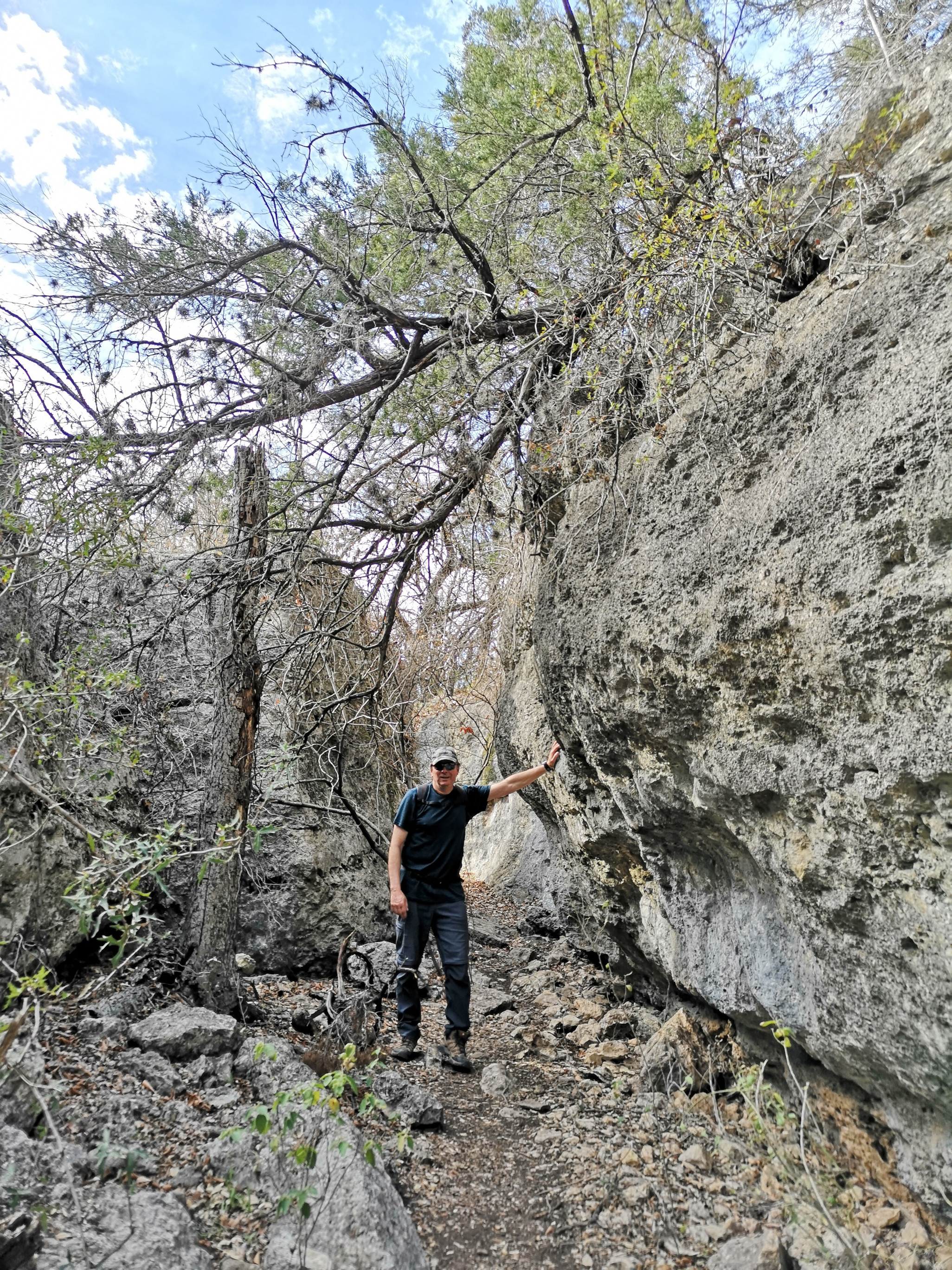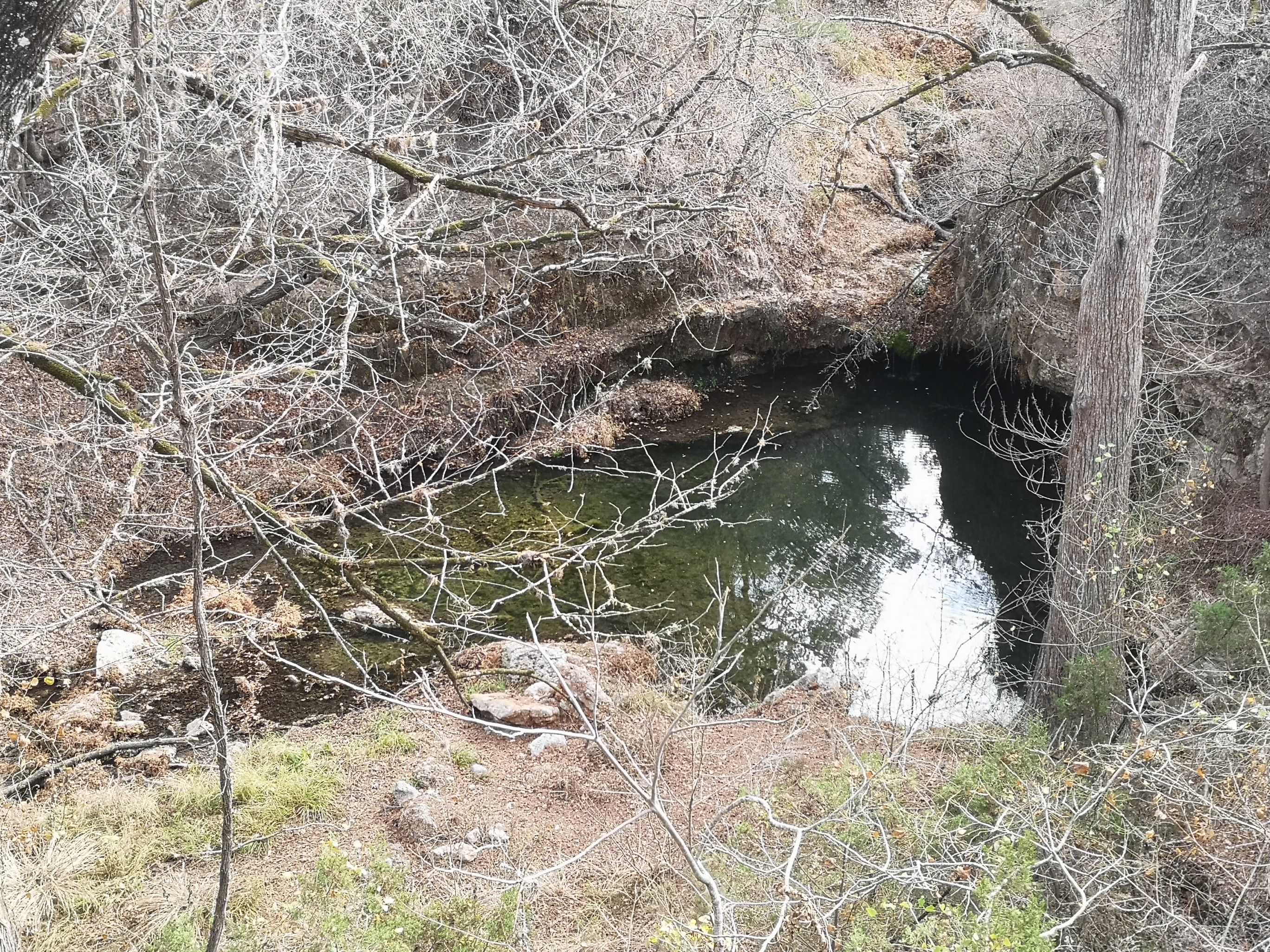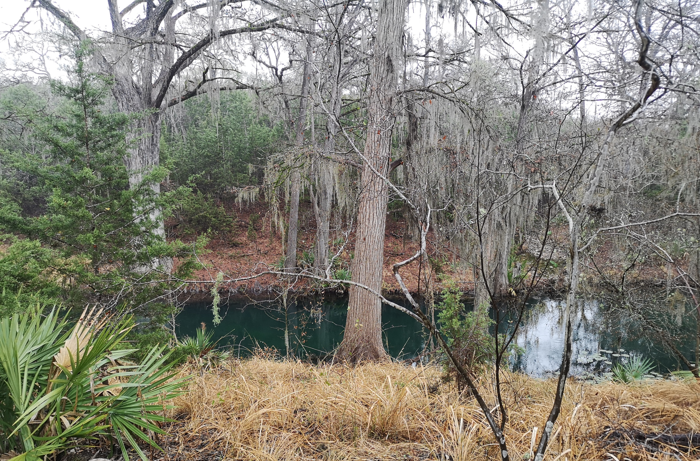 The following day we had booked a volunteer led tour of Honey Creek State Natural area that started at 9 am. This area is not open to the public except for the Saturday morning led tours. The volunteers told us that Honey Creek actually was more acres than Guadalupe River SP. It was lightly raining on Saturday morning and basically rained for most of the 3 hour tour so it was good we had our rain gear with us and we were glad they hadn’t cancelled the tour. We met at the Rust House and read about the history of the Rust family. They had 2 volunteers leading the group and a volunteer in training. They mainly spoke about the various plants we saw and also about the geology. We actually thought they would give more history about the settlers in the area like the Rust German family. For example we learned that the male Ash Juniper trees have the small cones and the female trees had berries that the animals and birds like. We also saw a bird blind where they try to catch an invasive bird species (we can’t remember the name). Then we came to an overlook for Honey Creek and it’s impossible for the photos to do justice to the green/aqua colour of the creek since we had such a grey day. Then we went down beside the creek and were totally blown away by the beauty of the area. When we left the creek, we climbed back up the escarpment and saw a large Live Oak and amazingly there was a Prickly Pear Cactus living on one of it’s branches. Honey Creek was such a beautiful unique area and we were glad we were able to come on a weekend and get slots on the guided tour.