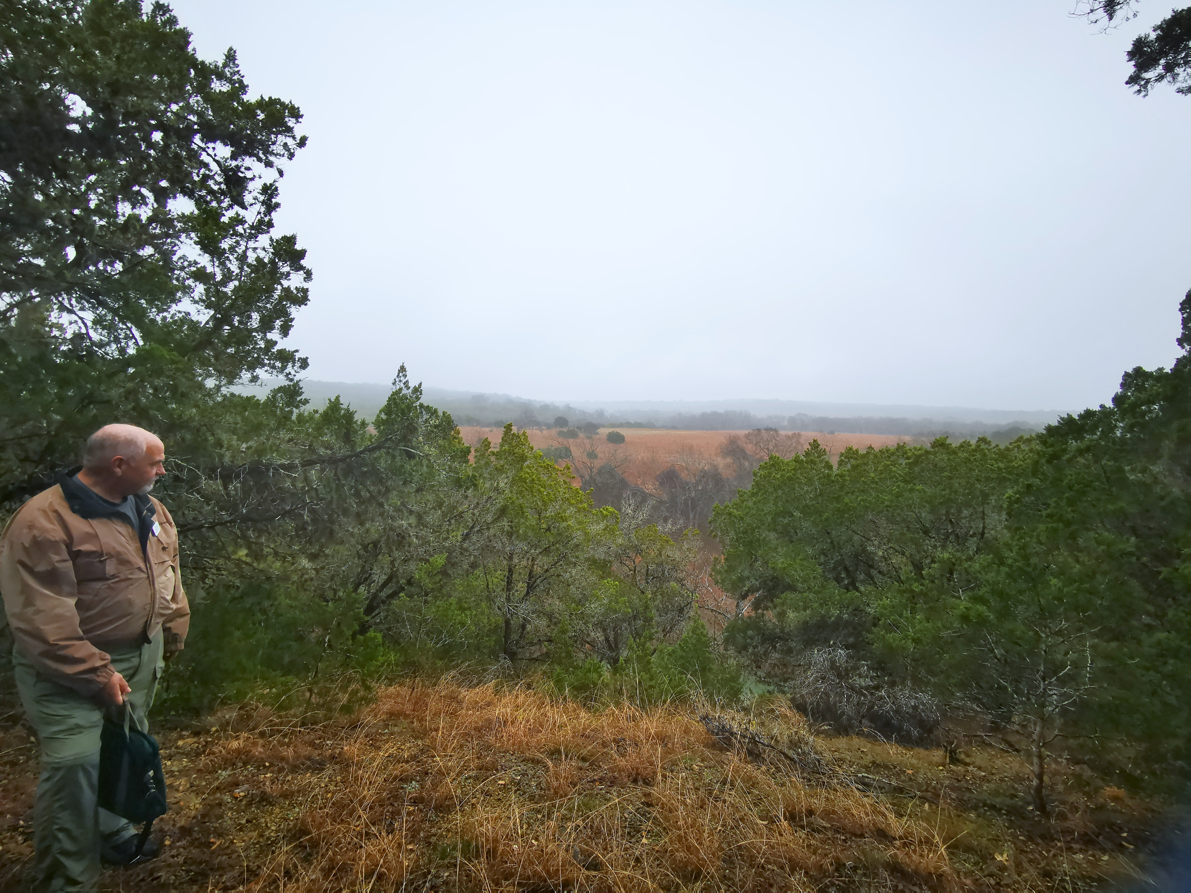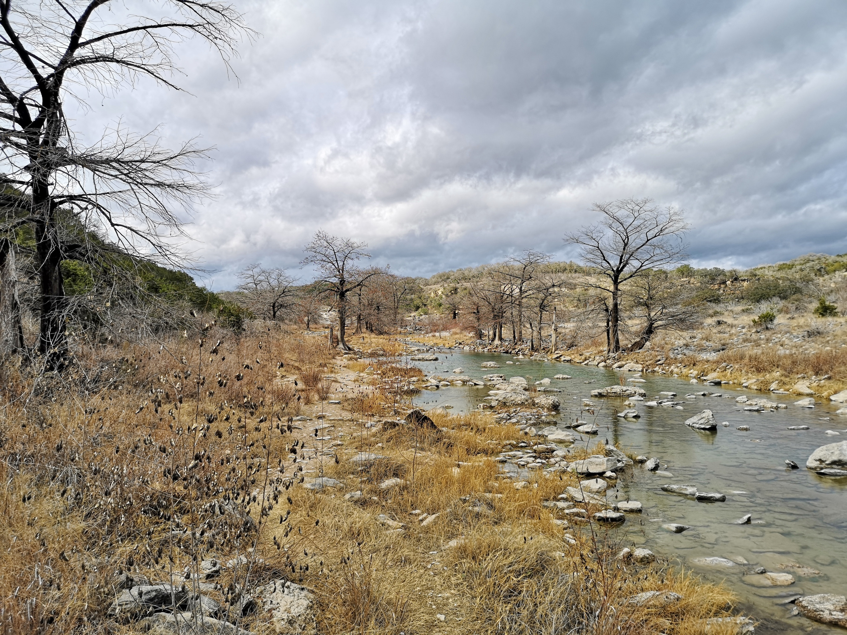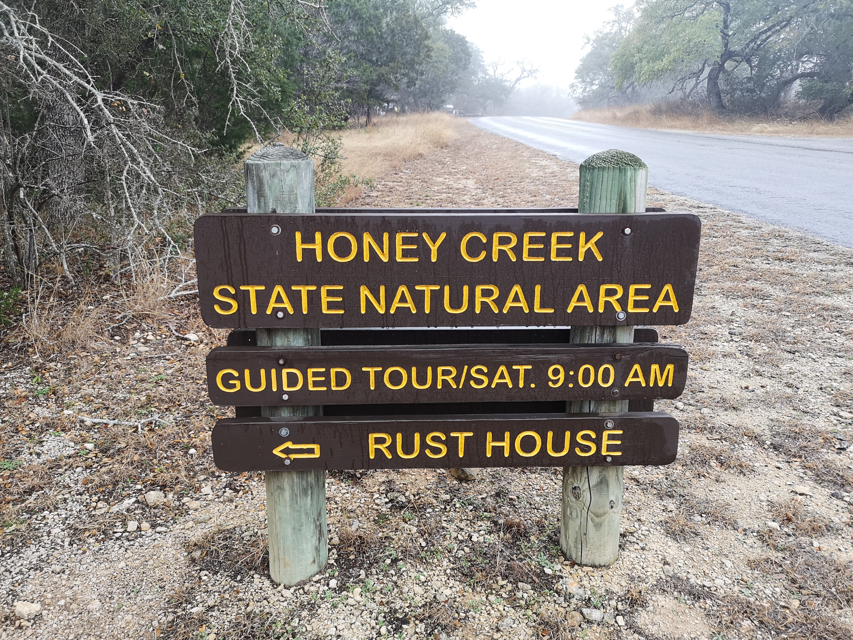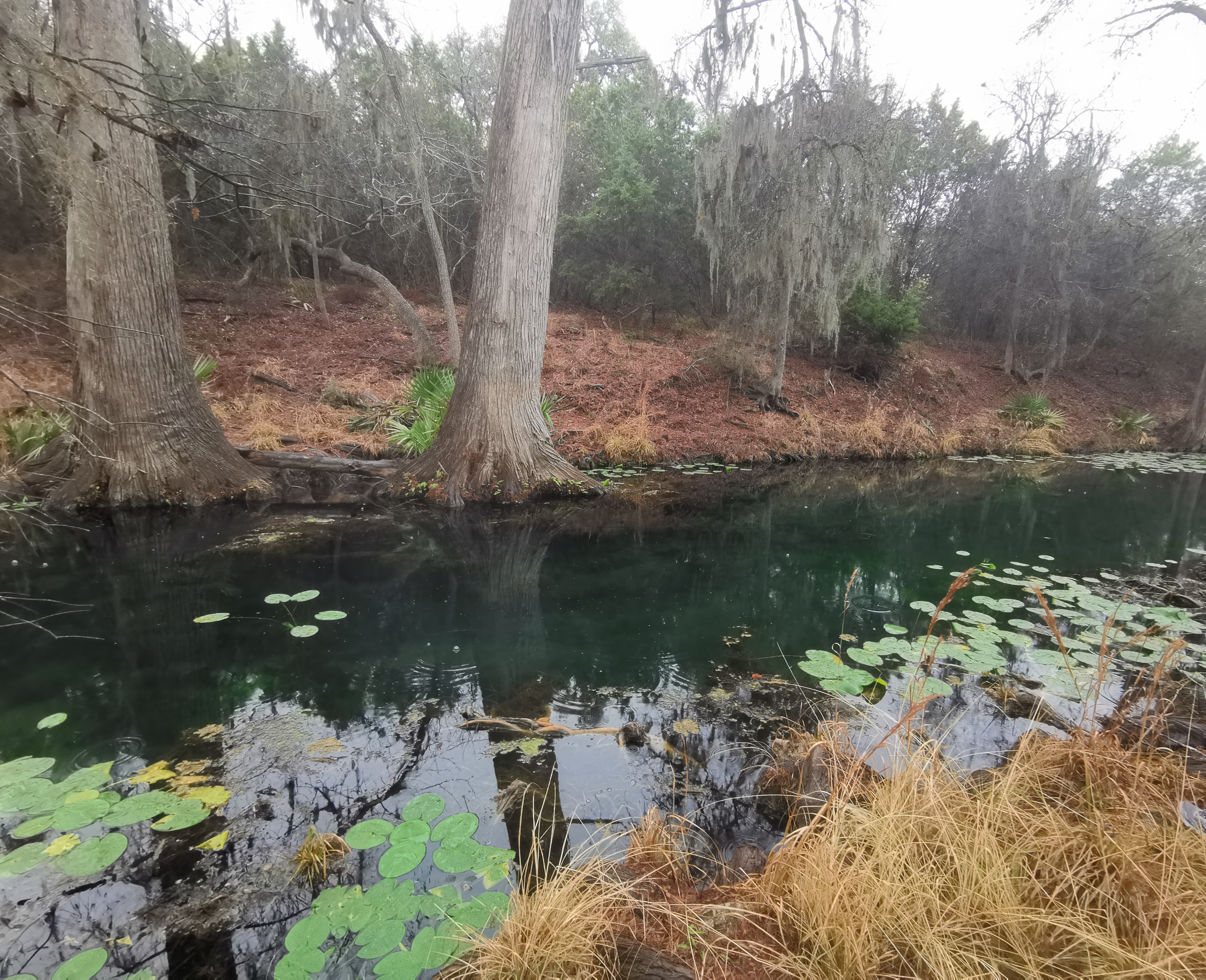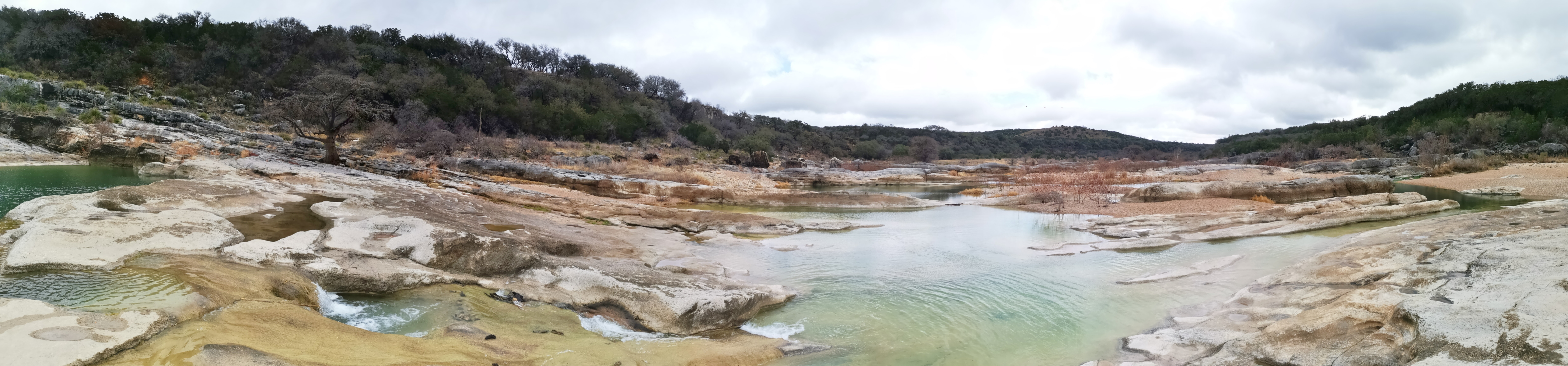The following day we had booked a volunteer led tour of Honey Creek State Natural area that started at 9 am. This area is not open to the public except for the Saturday morning led tours. The volunteers told us that Honey Creek actually was more acres than Guadalupe River SP. It was lightly raining on Saturday morning and basically rained for most of the 3 hour tour so it was good we had our rain gear with us and we were glad they hadn’t cancelled the tour. We met at the Rust House and read about the history of the Rust family. They had 2 volunteers leading the group and a volunteer in training. They mainly spoke about the various plants we saw and also about the geology. We actually thought they would give more history about the settlers in the area like the Rust German family. For example we learned that the male Ash Juniper trees have the small cones and the female trees had berries that the animals and birds like. We also saw a bird blind where they try to catch an invasive bird species (we can’t remember the name). Then we came to an overlook for Honey Creek and it’s impossible for the photos to do justice to the green/aqua colour of the creek since we had such a grey day. Then we went down beside the creek and were totally blown away by the beauty of the area. When we left the creek, we climbed back up the escarpment and saw a large Live Oak and amazingly there was a Prickly Pear Cactus living on one of it’s branches. Honey Creek was such a beautiful unique area and we were glad we were able to come on a weekend and get slots on the guided tour.