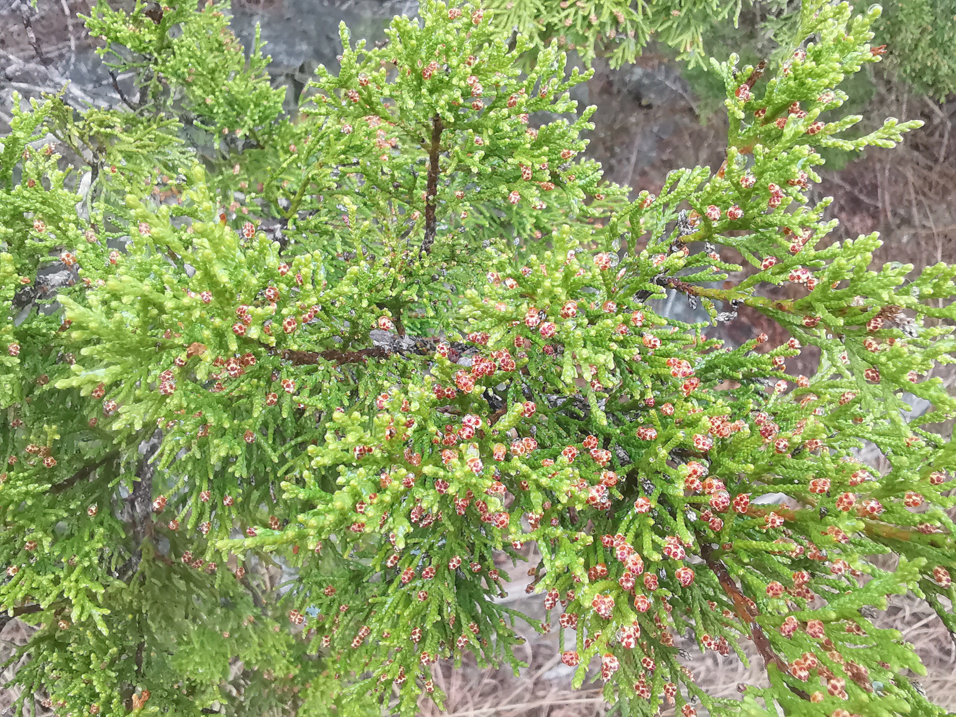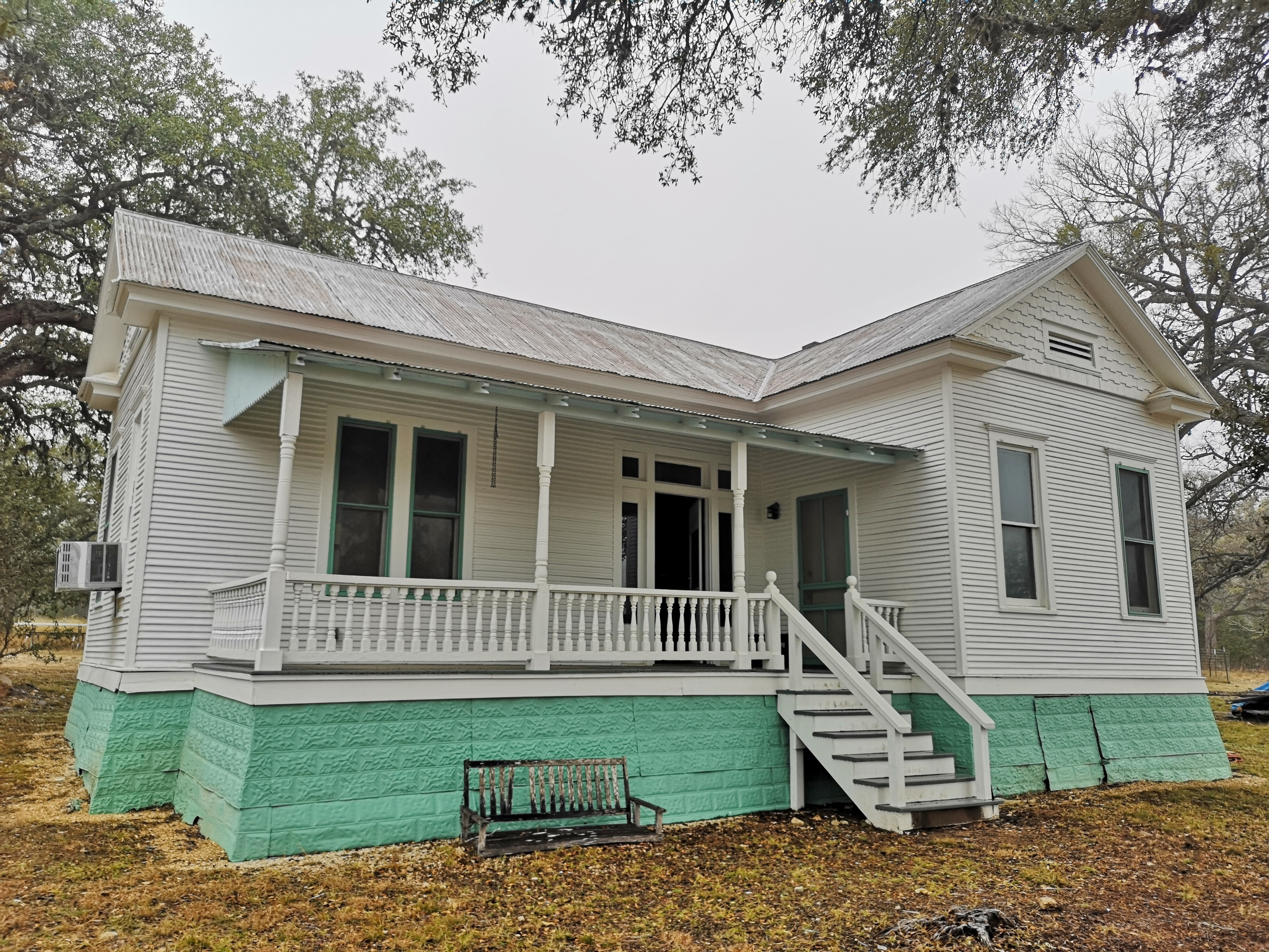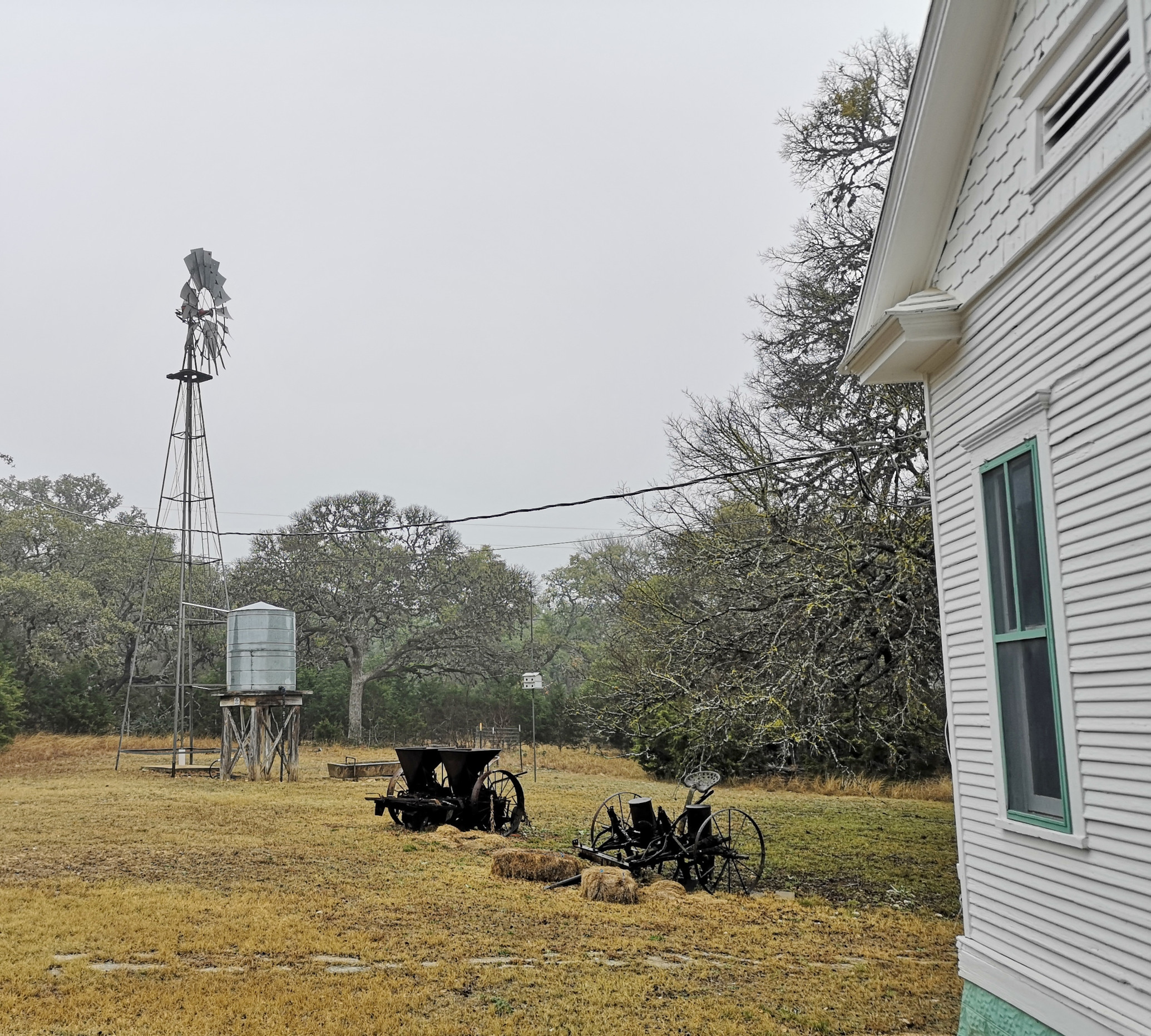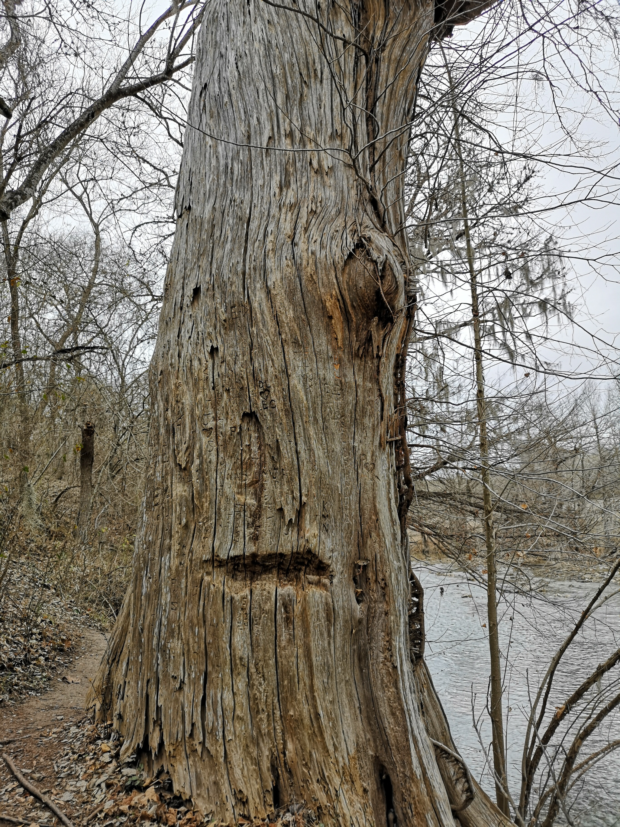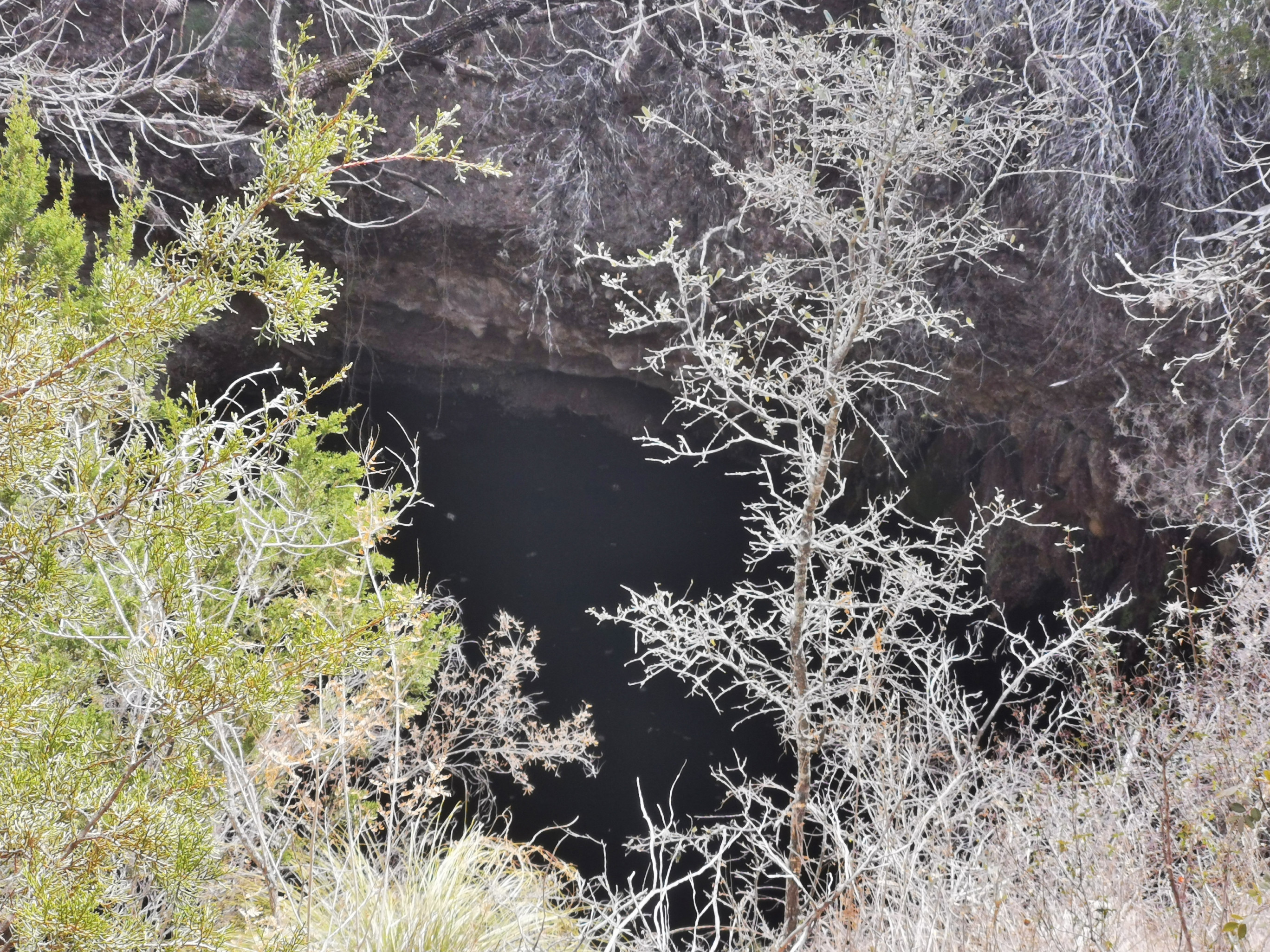 The following day we had booked a volunteer led tour of Honey Creek State Natural area that started at 9 am. This area is not open to the public except for the Saturday morning led tours. The volunteers told us that Honey Creek actually was more acres than Guadalupe River SP. It was lightly raining on Saturday morning and basically rained for most of the 3 hour tour so it was good we had our rain gear with us and we were glad they hadn’t cancelled the tour. We met at the Rust House and read about the history of the Rust family. They had 2 volunteers leading the group and a volunteer in training. They mainly spoke about the various plants we saw and also about the geology. We actually thought they would give more history about the settlers in the area like the Rust German family. For example we learned that the male Ash Juniper trees have the small cones and the female trees had berries that the animals and birds like. We also saw a bird blind where they try to catch an invasive bird species (we can’t remember the name). Then we came to an overlook for Honey Creek and it’s impossible for the photos to do justice to the green/aqua colour of the creek since we had such a grey day. Then we went down beside the creek and were totally blown away by the beauty of the area. When we left the creek, we climbed back up the escarpment and saw a large Live Oak and amazingly there was a Prickly Pear Cactus living on one of it’s branches. Honey Creek was such a beautiful unique area and we were glad we were able to come on a weekend and get slots on the guided tour.