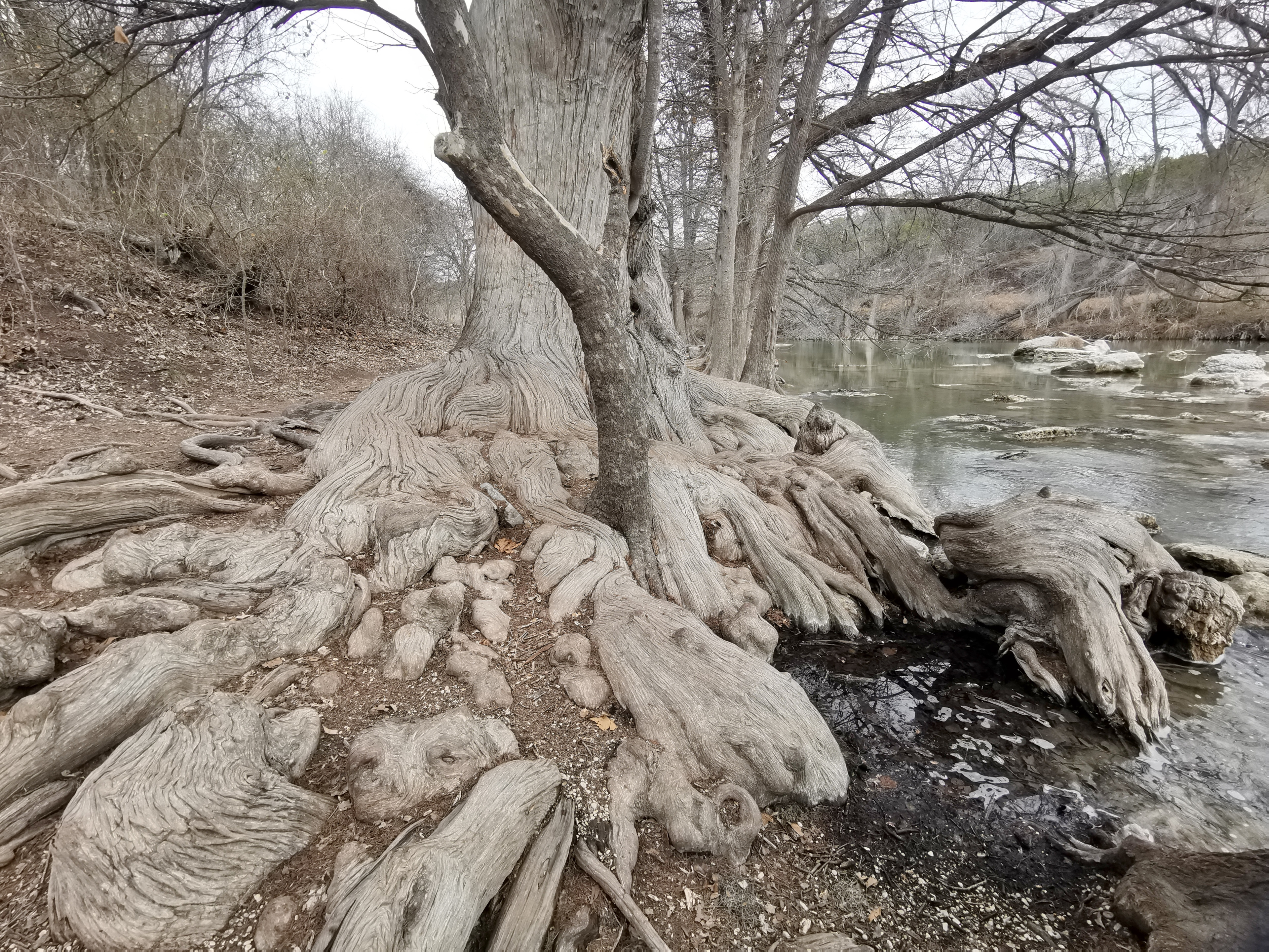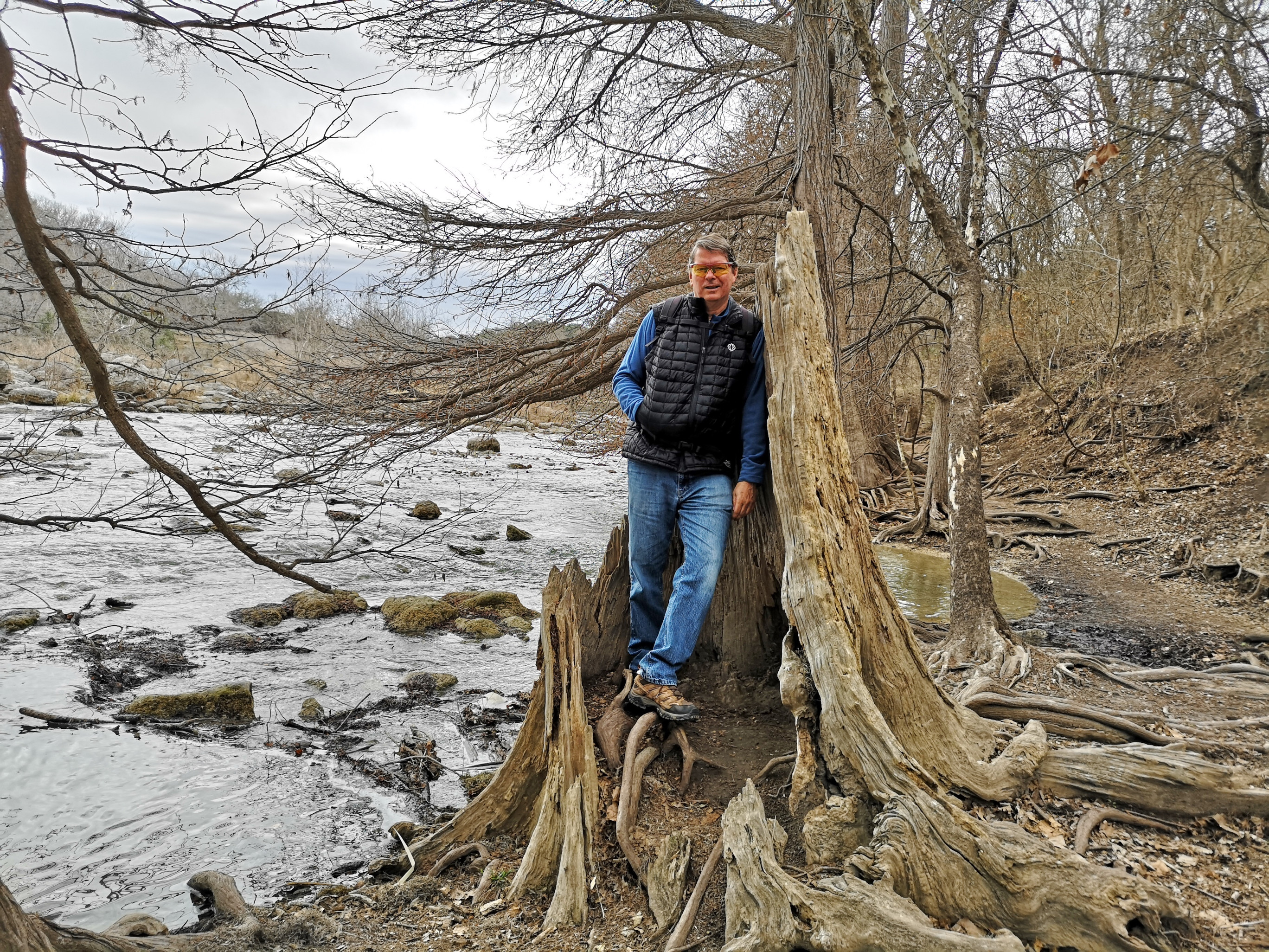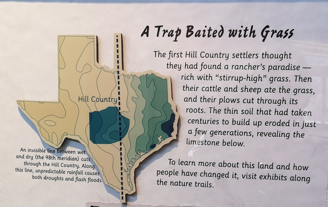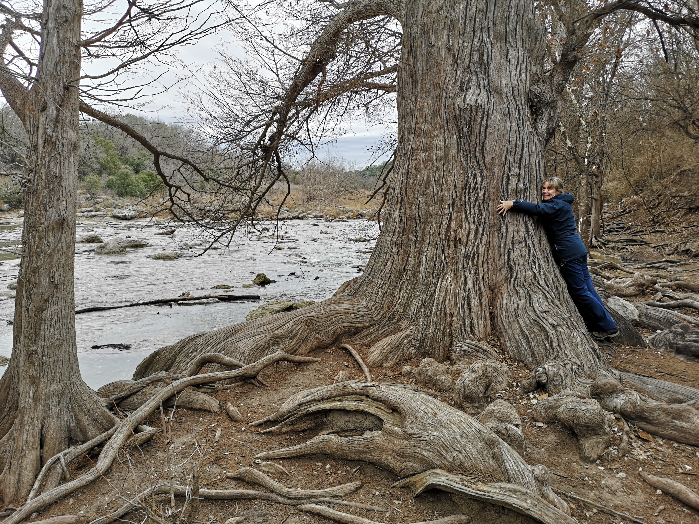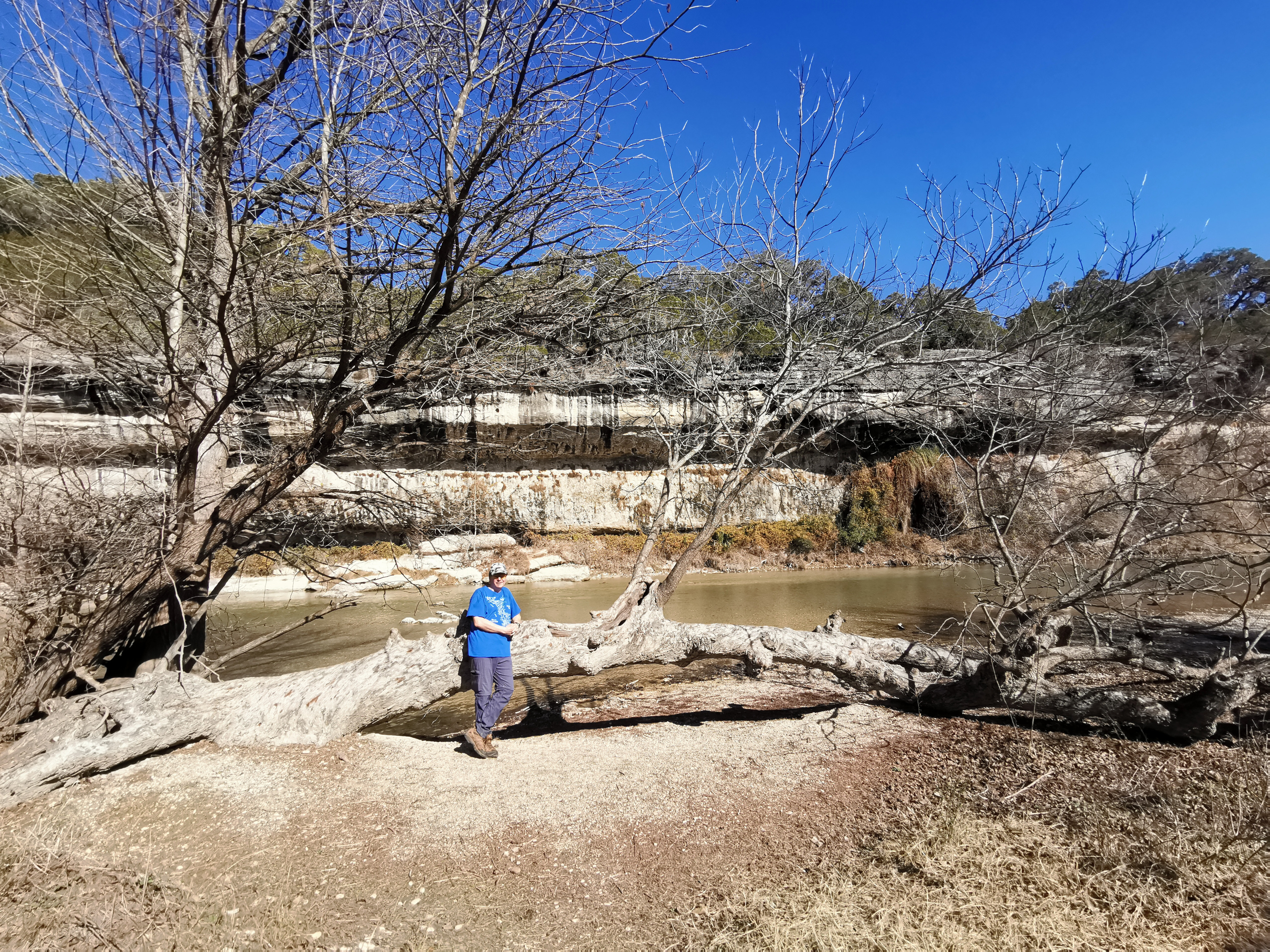 After several hours touring LBJ Ranch we headed south to Guadalupe River SP with a quick stop for groceries. The office was closed so we just proceeded to our site. The only problem, we had to drive back 2.5 kms in the morning to check-in since it was raining. Once the weather cleared, we took the Turkey Sink trail to the Bald Cypress trail by the river. The roots of the Cypress trees are very interesting to see how they twist and turn and hold onto the river bank. At the Swallow Cliffs we talked to a local about fishing in the area. Then we went to the discovery center to see the displays and to talk with the rangers. Lastly we finished off with the Cedar Sage, River Overlook, Barred Owl, and Live Oak trails (for a total just over 9 kms). Our boots were getting caked with mud from the trails due to the rain we had that morning. As we got close to the campground, we saw a couple of young Armadillo’s after seeing several others on the trails.