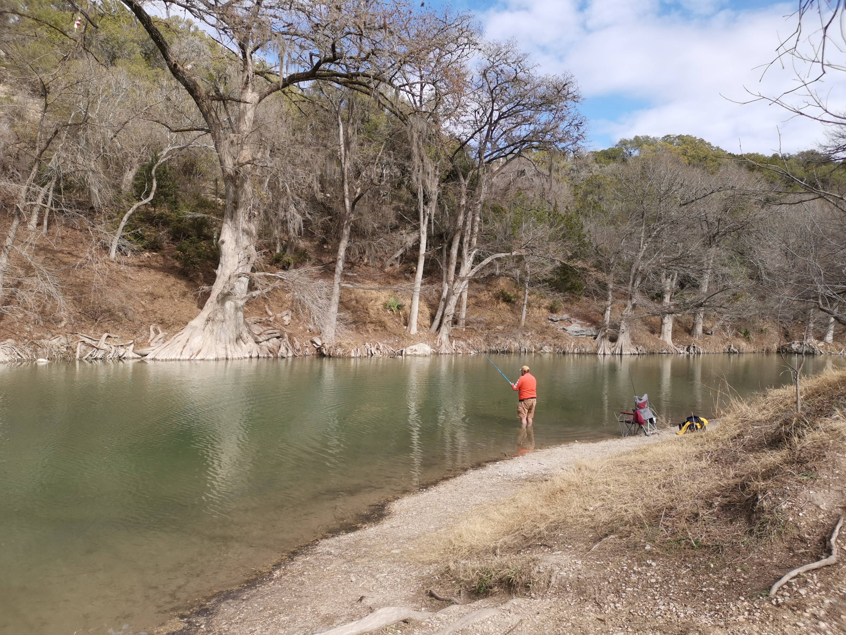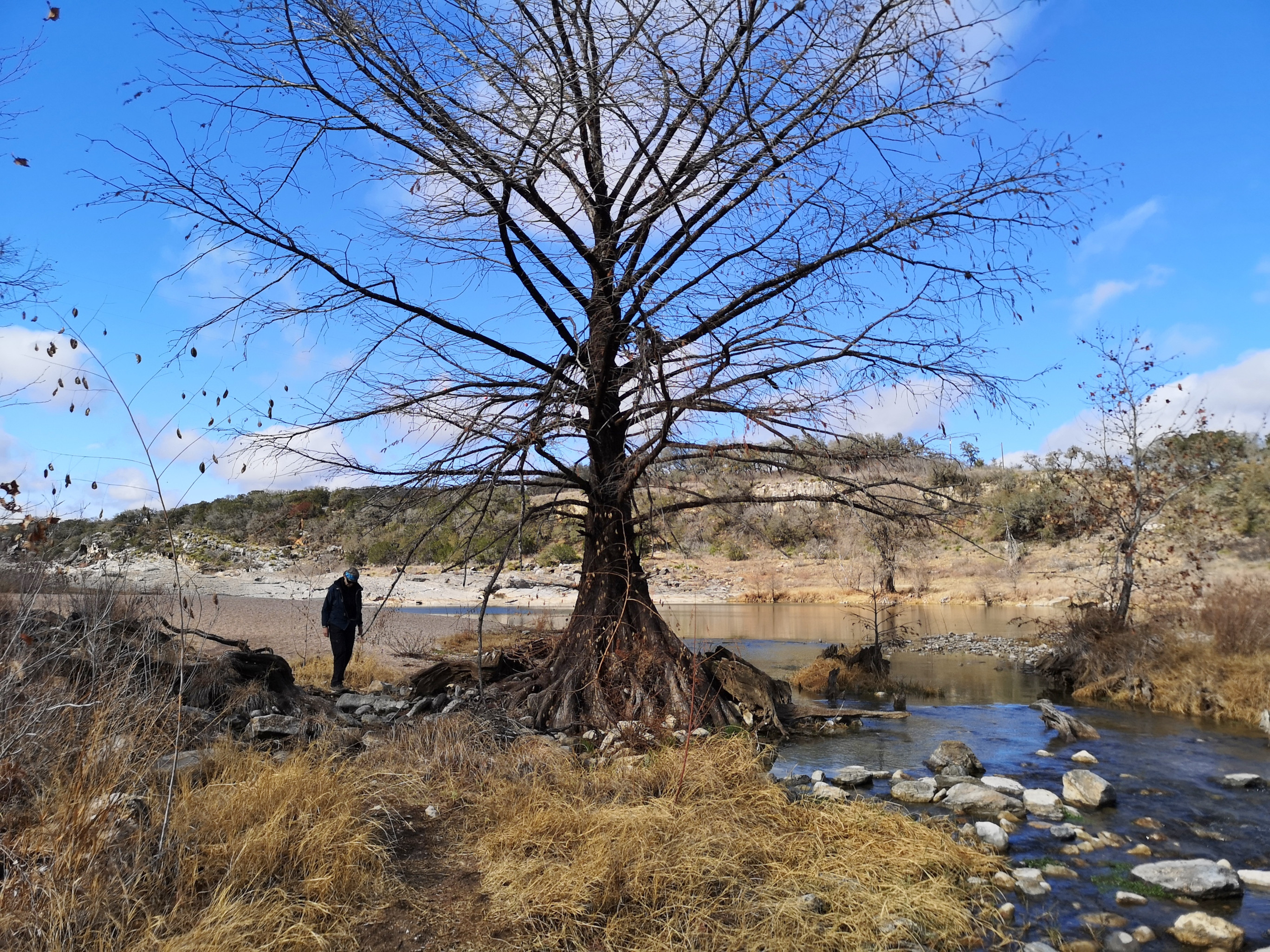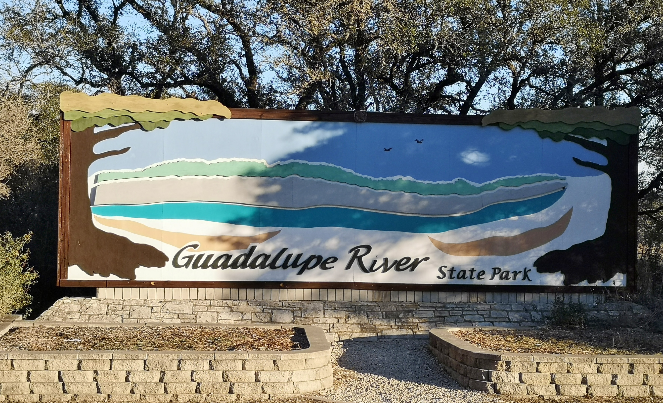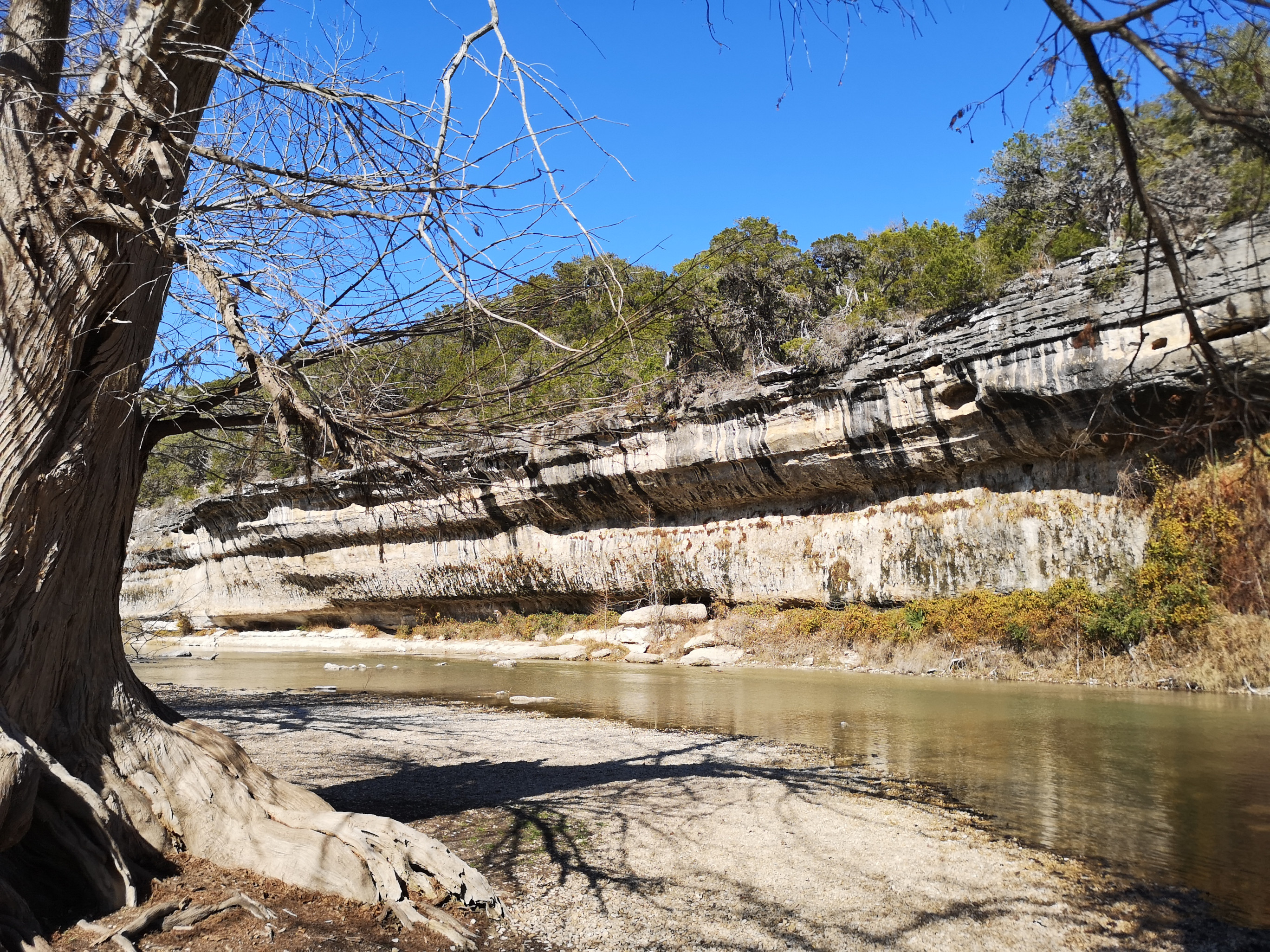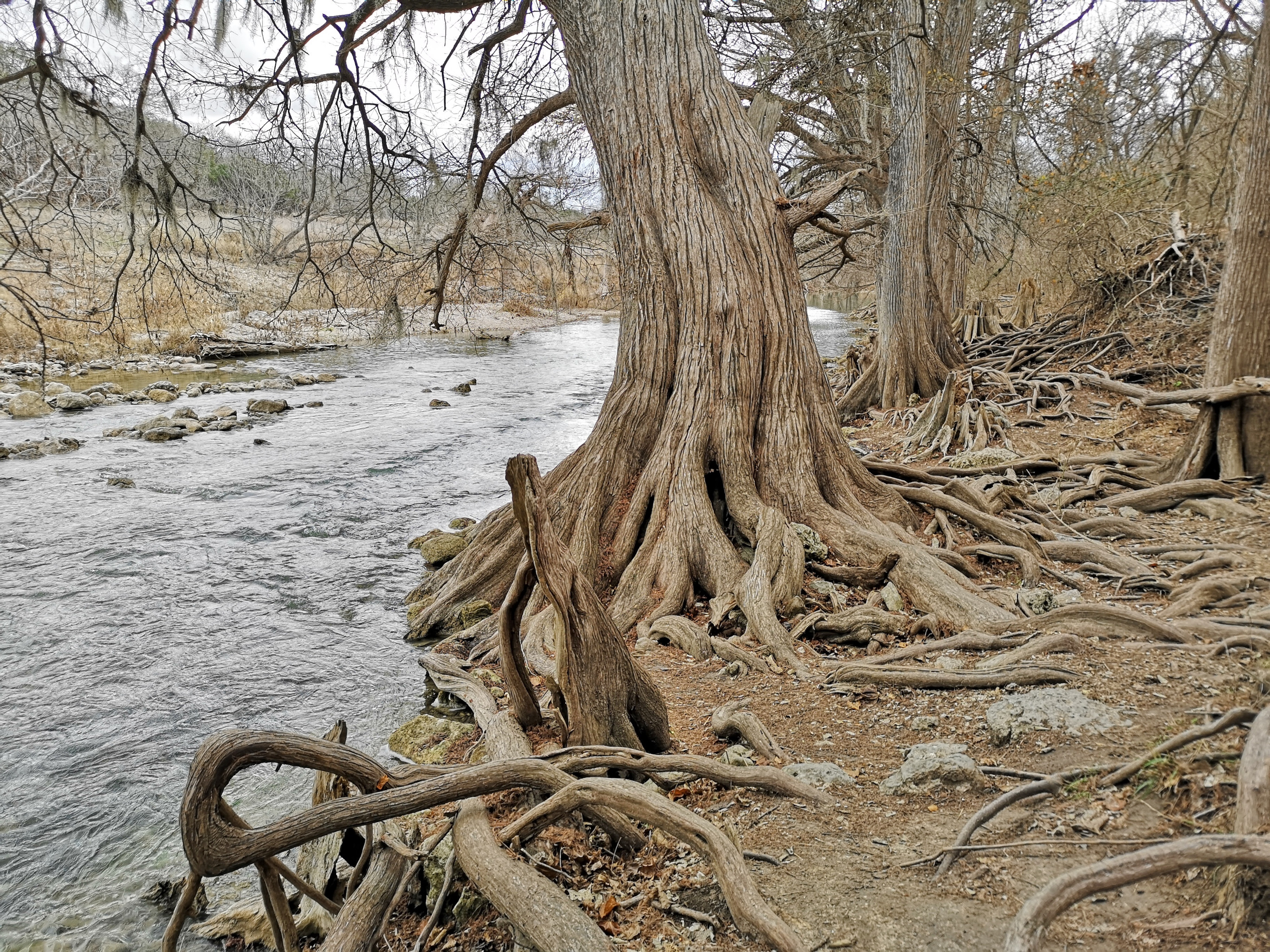 After several hours touring LBJ Ranch we headed south to Guadalupe River SP with a quick stop for groceries. The office was closed so we just proceeded to our site. The only problem, we had to drive back 2.5 kms in the morning to check-in since it was raining. Once the weather cleared, we took the Turkey Sink trail to the Bald Cypress trail by the river. The roots of the Cypress trees are very interesting to see how they twist and turn and hold onto the river bank. At the Swallow Cliffs we talked to a local about fishing in the area. Then we went to the discovery center to see the displays and to talk with the rangers. Lastly we finished off with the Cedar Sage, River Overlook, Barred Owl, and Live Oak trails (for a total just over 9 kms). Our boots were getting caked with mud from the trails due to the rain we had that morning. As we got close to the campground, we saw a couple of young Armadillo’s after seeing several others on the trails.