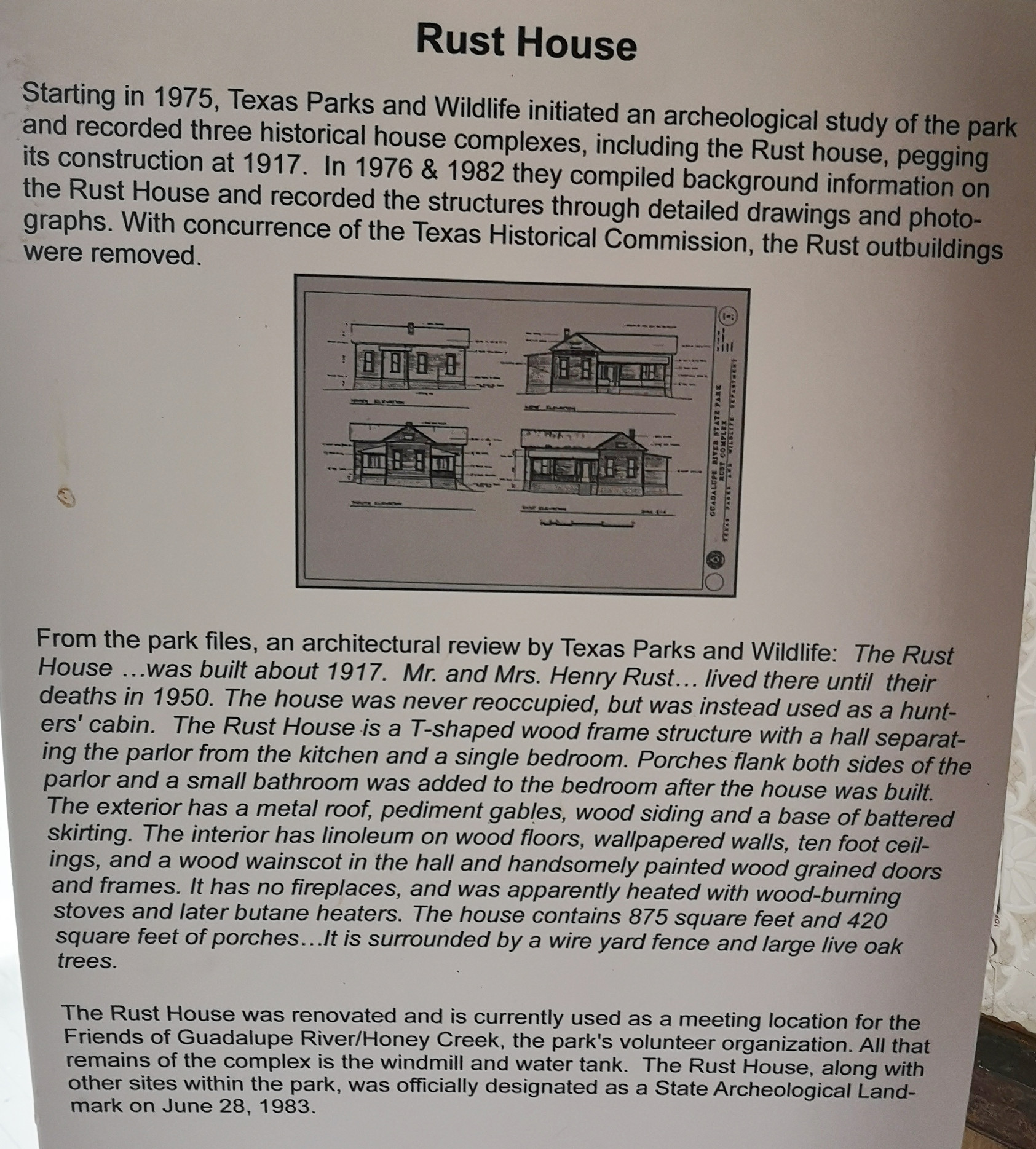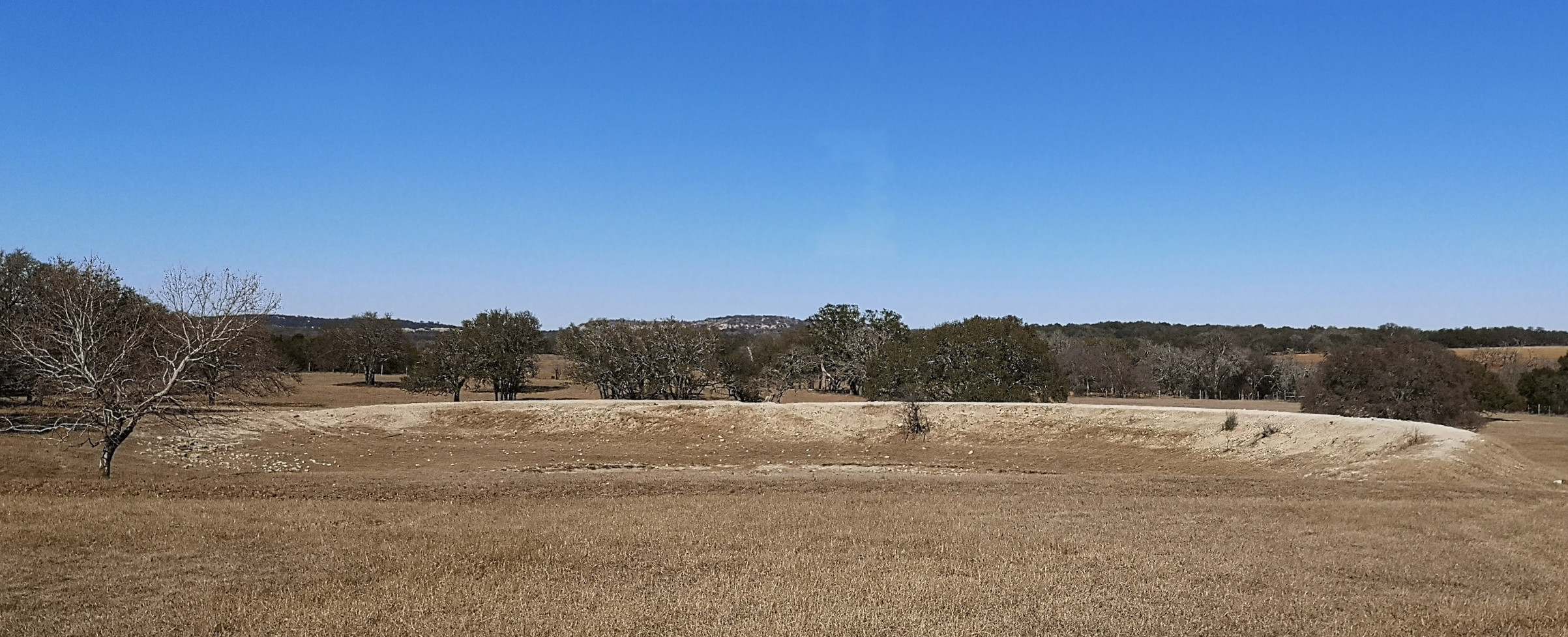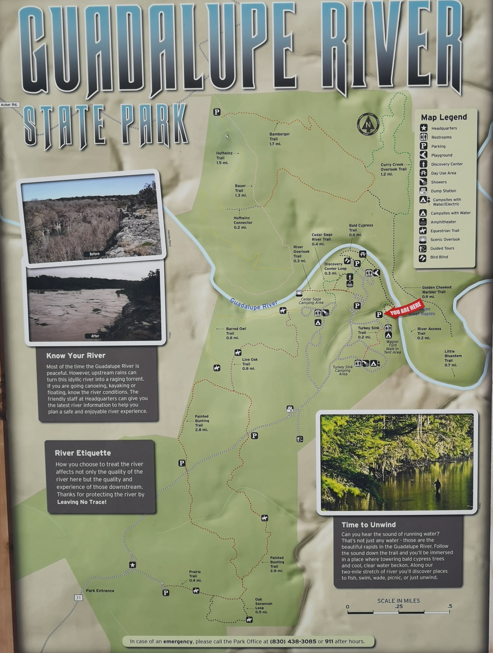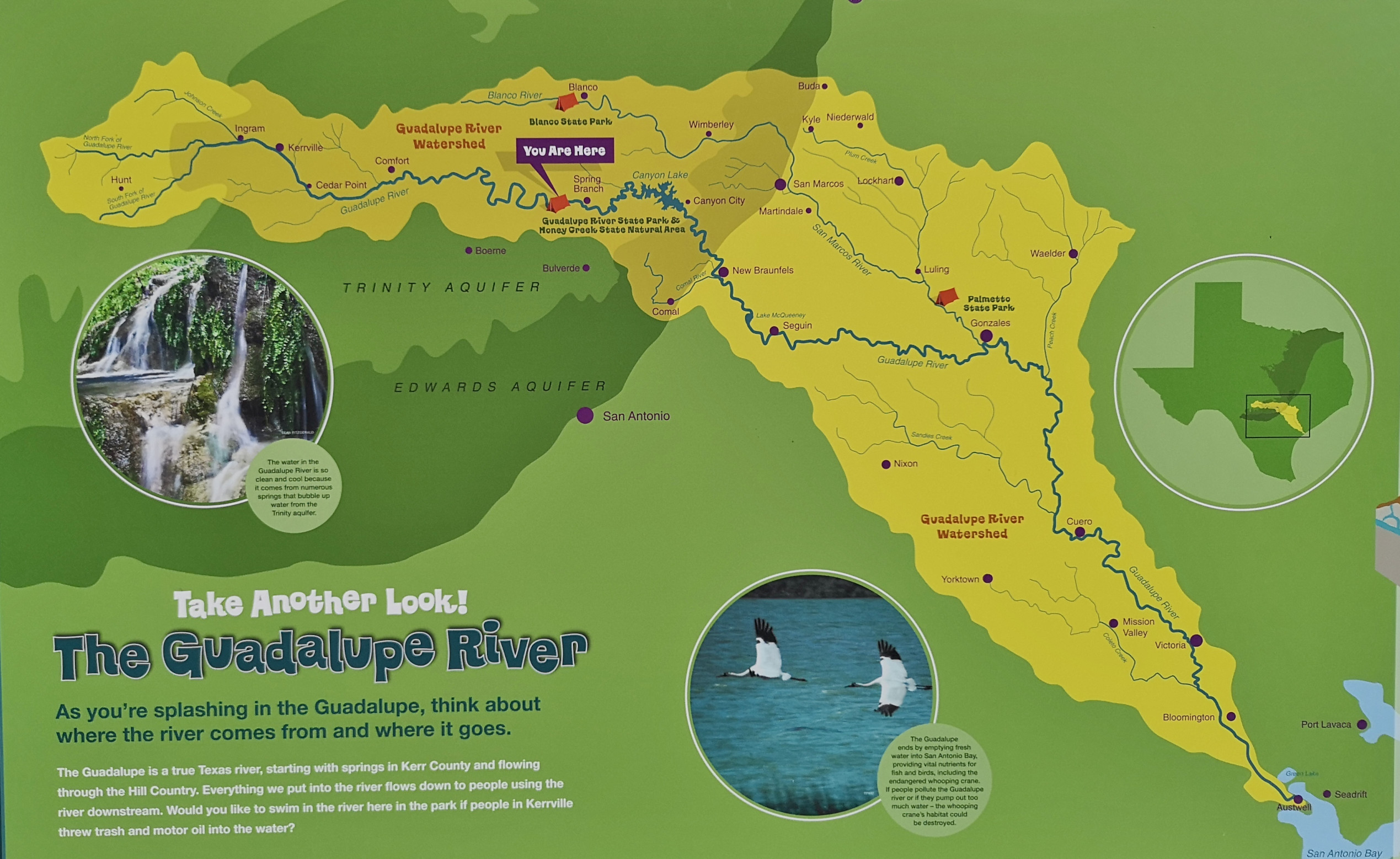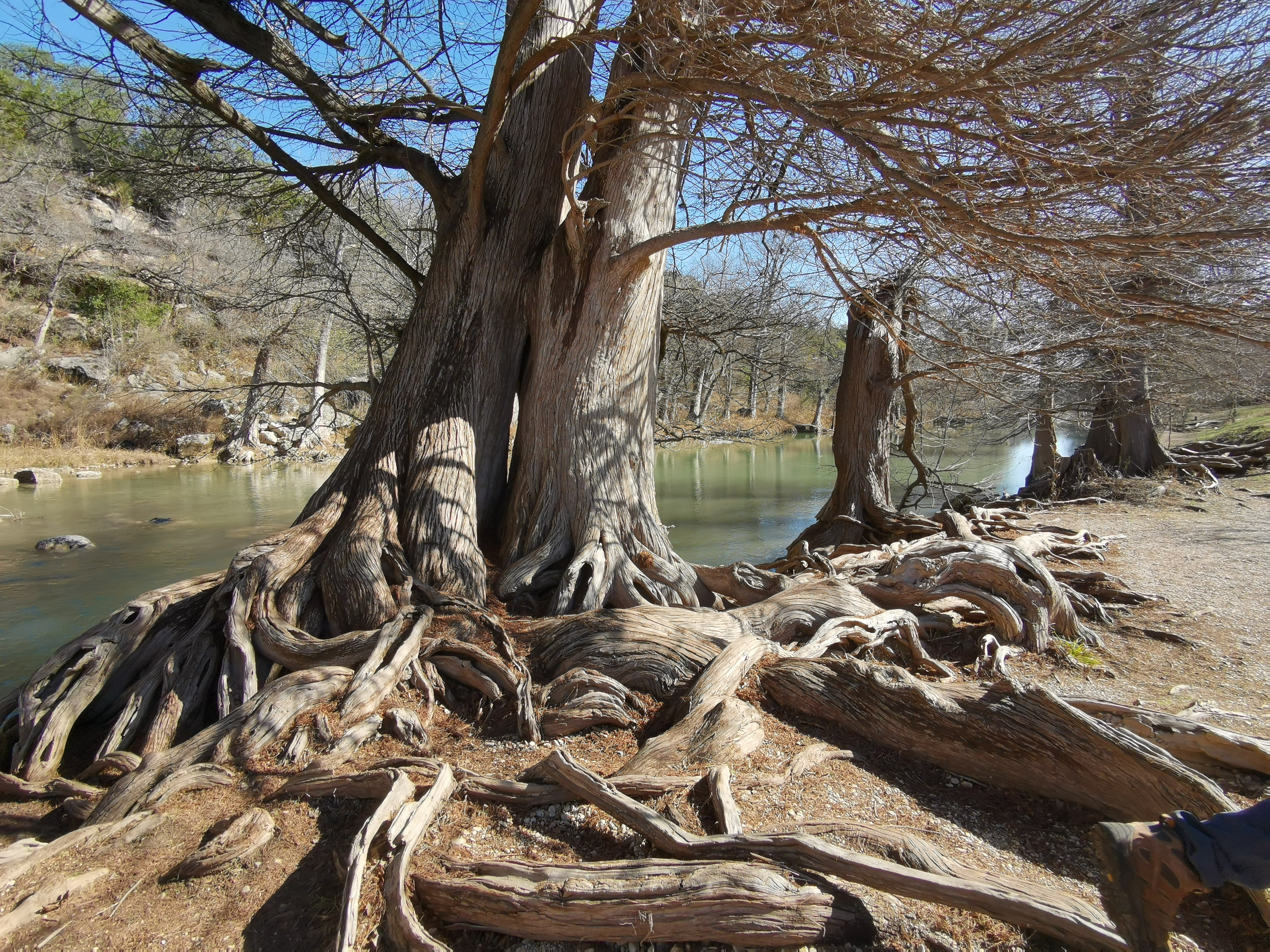 After several hours touring LBJ Ranch we headed south to Guadalupe River SP with a quick stop for groceries. The office was closed so we just proceeded to our site. The only problem, we had to drive back 2.5 kms in the morning to check-in since it was raining. Once the weather cleared, we took the Turkey Sink trail to the Bald Cypress trail by the river. The roots of the Cypress trees are very interesting to see how they twist and turn and hold onto the river bank. At the Swallow Cliffs we talked to a local about fishing in the area. Then we went to the discovery center to see the displays and to talk with the rangers. Lastly we finished off with the Cedar Sage, River Overlook, Barred Owl, and Live Oak trails (for a total just over 9 kms). Our boots were getting caked with mud from the trails due to the rain we had that morning. As we got close to the campground, we saw a couple of young Armadillo’s after seeing several others on the trails.