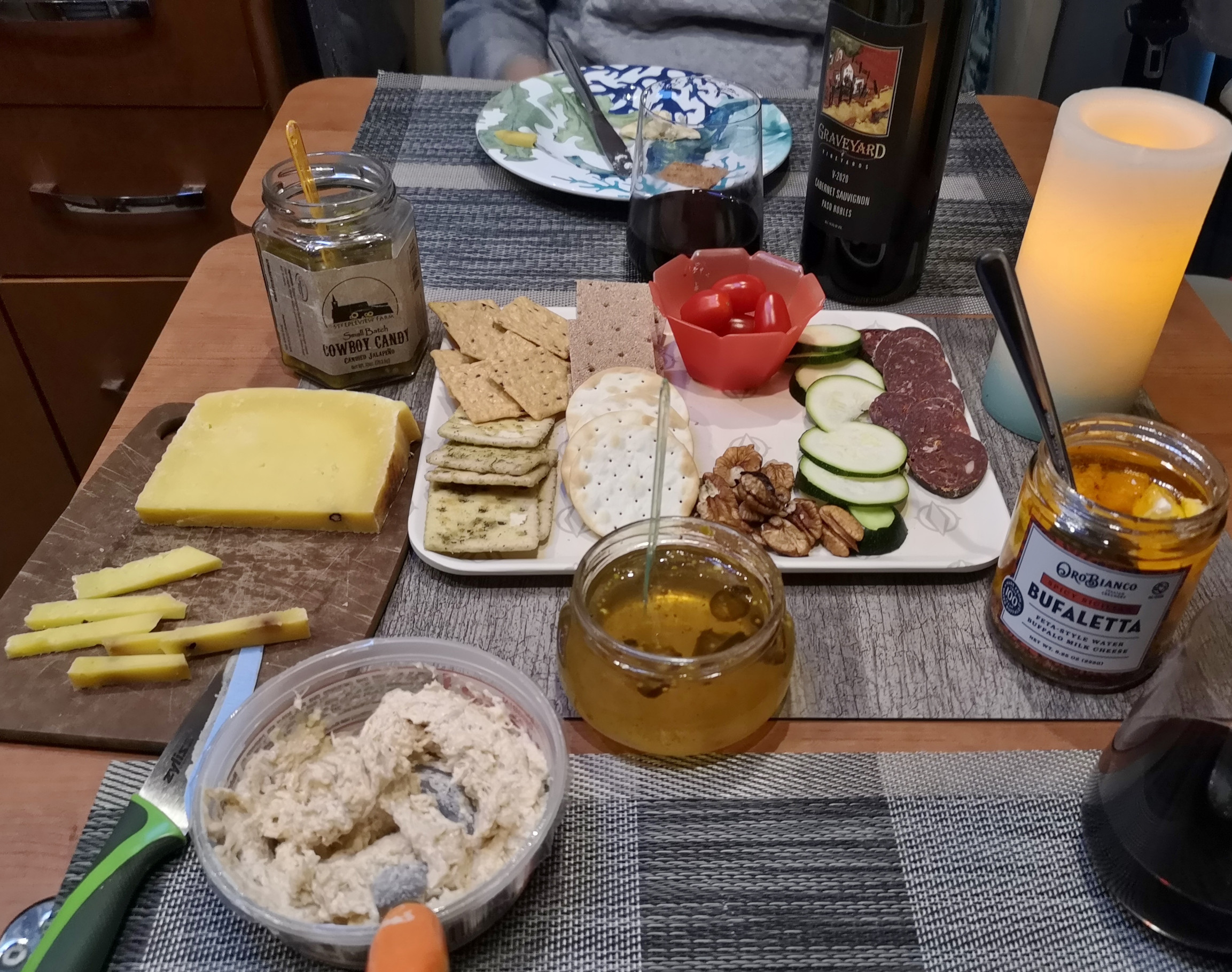 The next day I rode from the campground to the Juniper Ridge East trailhead. This MTB trail is listed as challenging and it soon proved that label. It didn’t have a lot of elevation gain but it made up for that with lots of rocks and roots and many of the rocks were loose. I did the full Juniper Ridge East trail and then cut over to the Wolf Mountain loop to return for a total of 22 kms. This was definitely the most challenging MTB ride I had ever done but that’s what made it fun. There were sections where I had to walk the bike when it was too difficult but in general I was able to ride most of it. I have a couple of slides to show what the trail was like and the last slide shows my latest beer selection and my favourite was the Russian Imperial Stout (9.8%) which was my prize at the end of the MTB ride😉 Sharon had a relaxing “spa day”, as much as you can in the RV. She took time to read her book. Luckily several campgrounds have book exchanges so you can always pick up a new book. That evening we had a picky food dinner with our wood buffalo cheese and salami from the Oro Bianco Italian Creamery and one of our wines from Graveyard Vineyards.