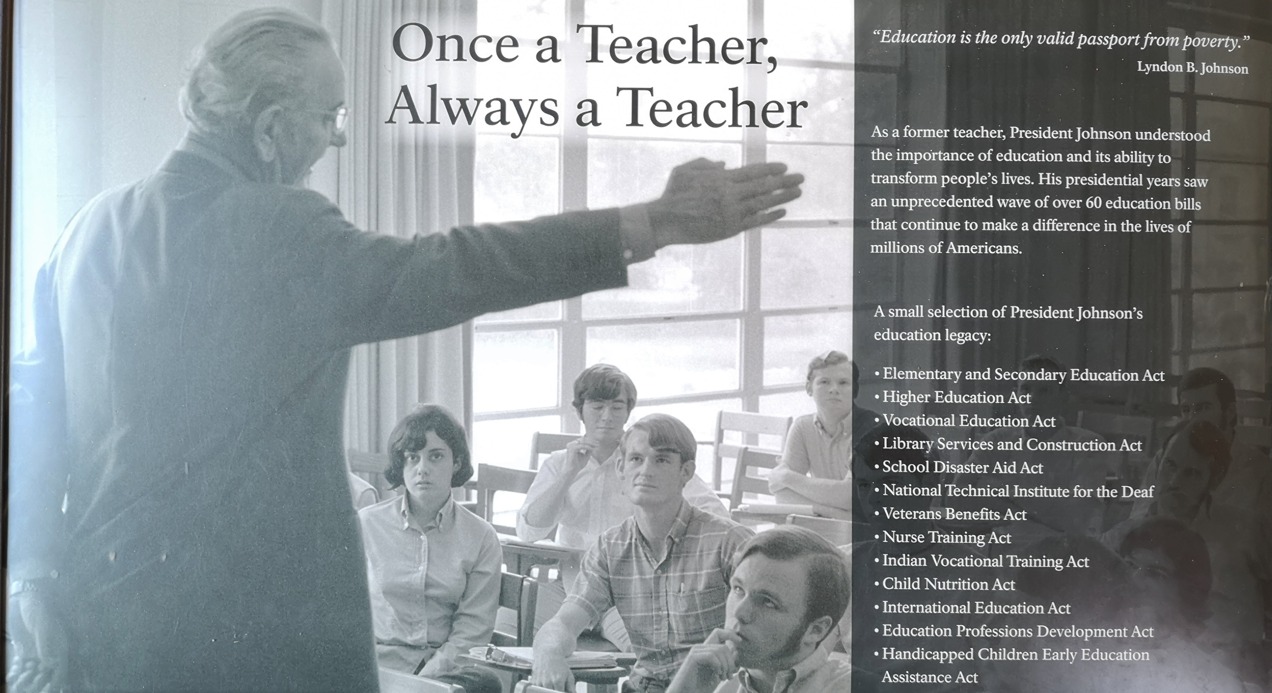 - Junction School, the school LBJ attended at age 4 and the location where, as president he signed one of his major education bills. His administration passed over 30 education bills, prior to that, only 6 education bills were passed.