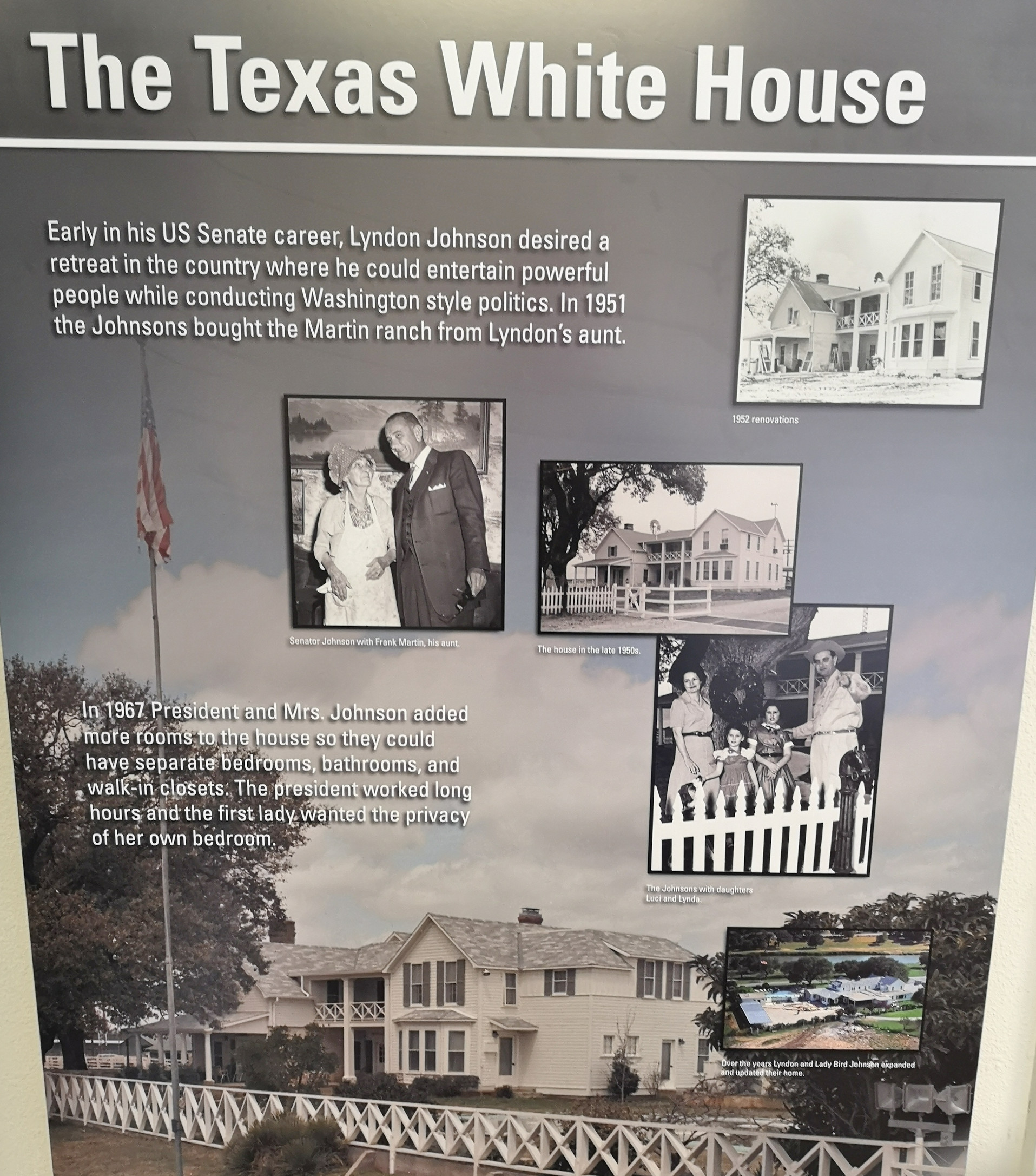 - The Johnson’s purchased the home and some acreage from LBJ’s Aunt in 1951. They nicknamed it the Texas White House. Outside there are small living quarters that the secret service used until Lady Bird’s death in 2007.
