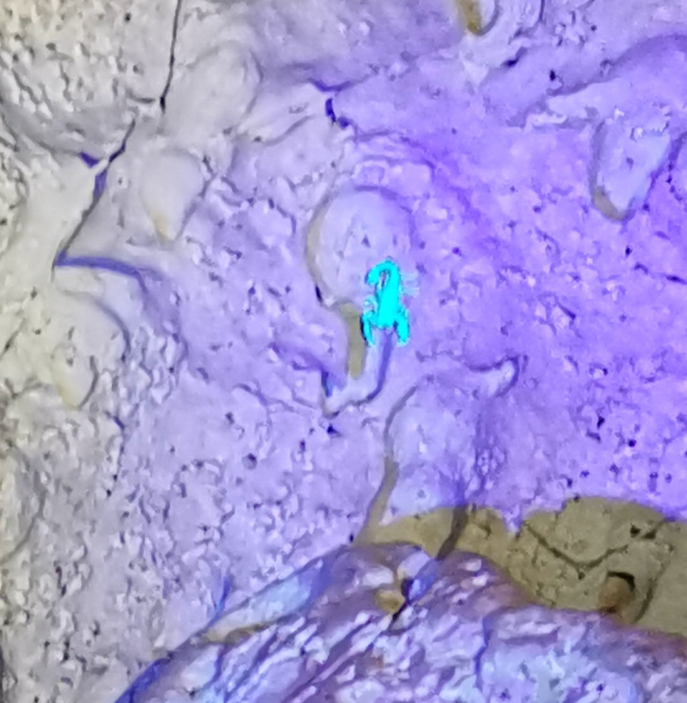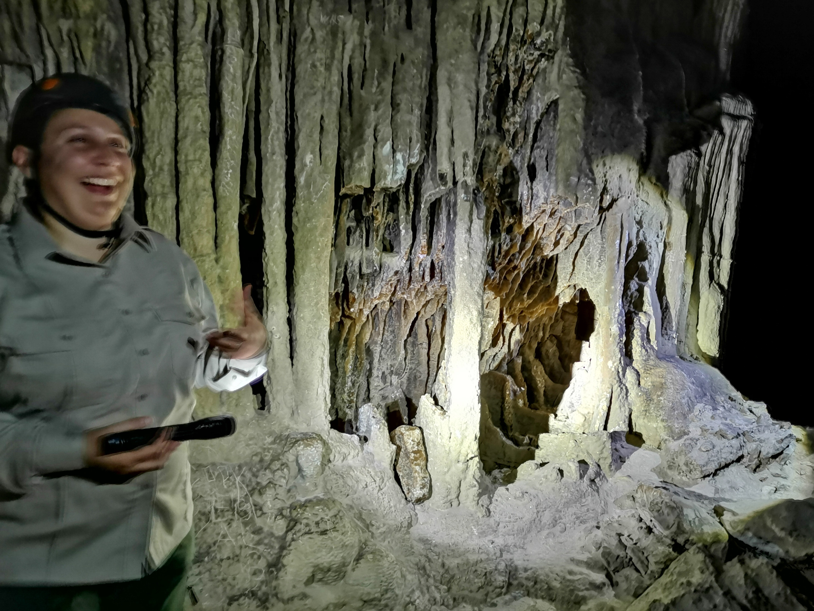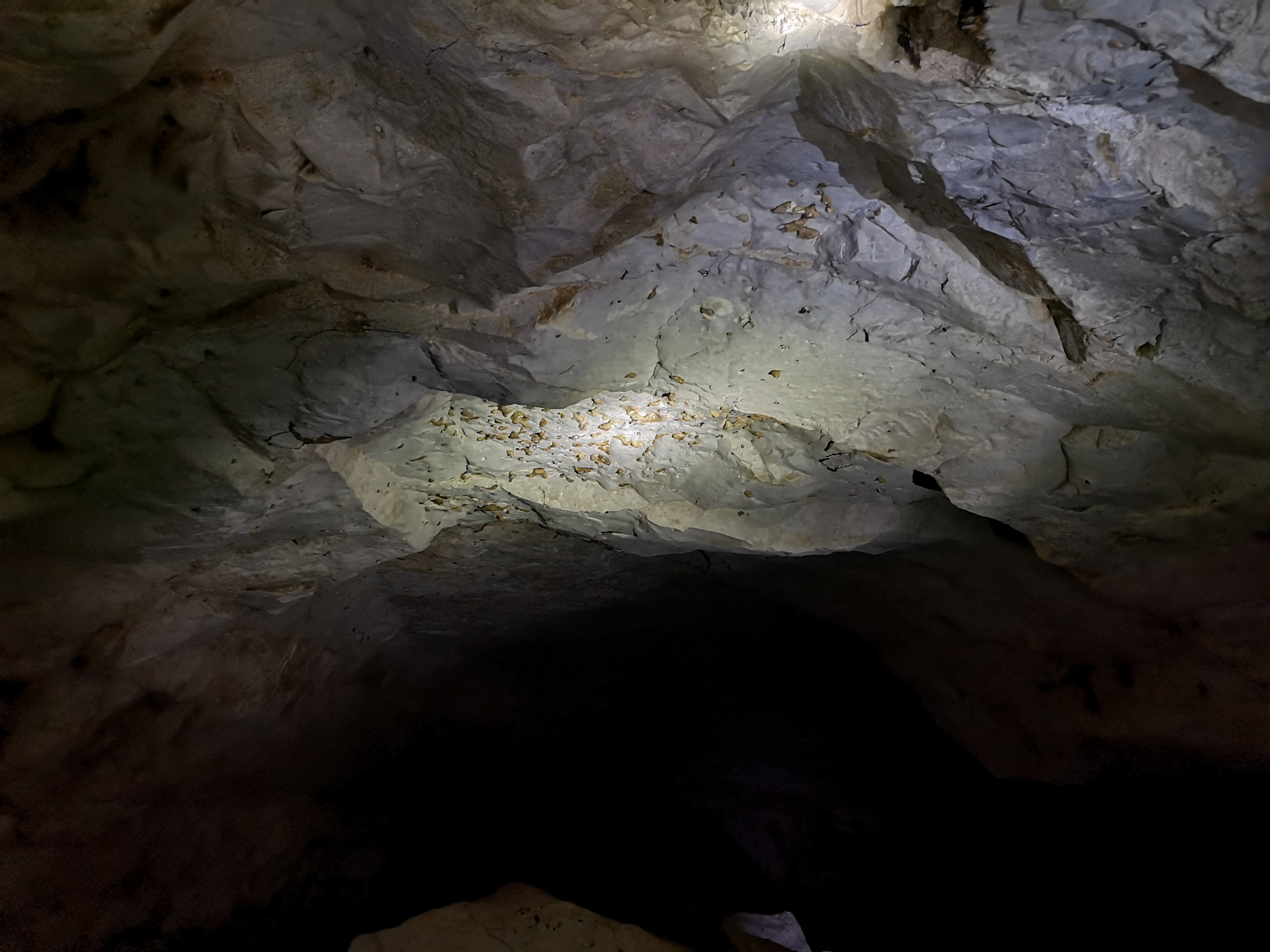 The cavern tour started at 1 pm and there were 9 people on it (max is 10). Ashley the ranger had us get a caving helmet, which we attached our headlamp to, and then drove us in a van back to the park entrance where we took a very bumpy rock road to get to the cavern. The cactus and brush along the road kept scratching the van and it sounded like someone scratching their nails on a chalkboard. Ashley went through the safety aspects before entering the cavern since the hike inside was basically boulder scrambling with a flashlight in your hands. She warned us animals can get in the cave and if there was one certain animal in the cave the tour would be cancelled. There were lots of guesses…the answer, a skunk!! Luckily no skunks. We first climbed up a fairly steep hill to get to the entrance to the cave. The park had replaced the gate that the Seargeant’s had used to control access so the bars had wider openings so animals could go in and out of the cave. The overall opening was too small for bats as they need to circle to fly out of a larger opening but in the park they have Stuart Cave which does have bats from the spring through the fall. As we climbed down through the entrance you could immediately start feeling the humidity in the cave. The temperature is a constant 78F with high humidity which I was glad they had pre told us so we could wear lighter clothes. Our heads were sweating with the helmets on as we proceeded into the cave. This cave is what they call a dead cave, in other words there isn’t any moisture dripping, so the formations will not change over time. The formations we saw dated back 4 million years! Since it was a dead cave we were allowed to touch formations, which was a good thing as you needed 3 point balance as you climbed over the boulders. There were also some connected caverns that were live but they don’t allow people to go into those so they can continue to form. The 2 main features in the cave are the massive columns (1 was 8 stories tall!) and the Helictite’s which formed when the cave was alive, and wind blew the formations as they were dripping. We explored for about 2 hours inside the cave and there were even small vent tubes you could climb in and out of. The tour was awesome but we were blown away that they didn’t require us to sign some sort of liability waiver to do this exploring. Just when we left the cave Ashley spotted a Black Scorpion (they live in the cave) and they have an iridescence when you shine the light on them. This tour was really worthwhile😉