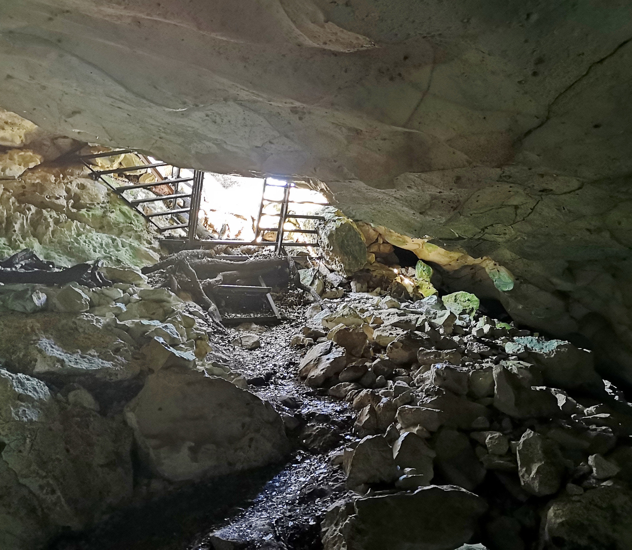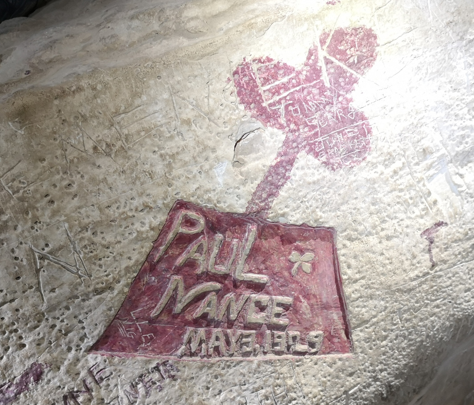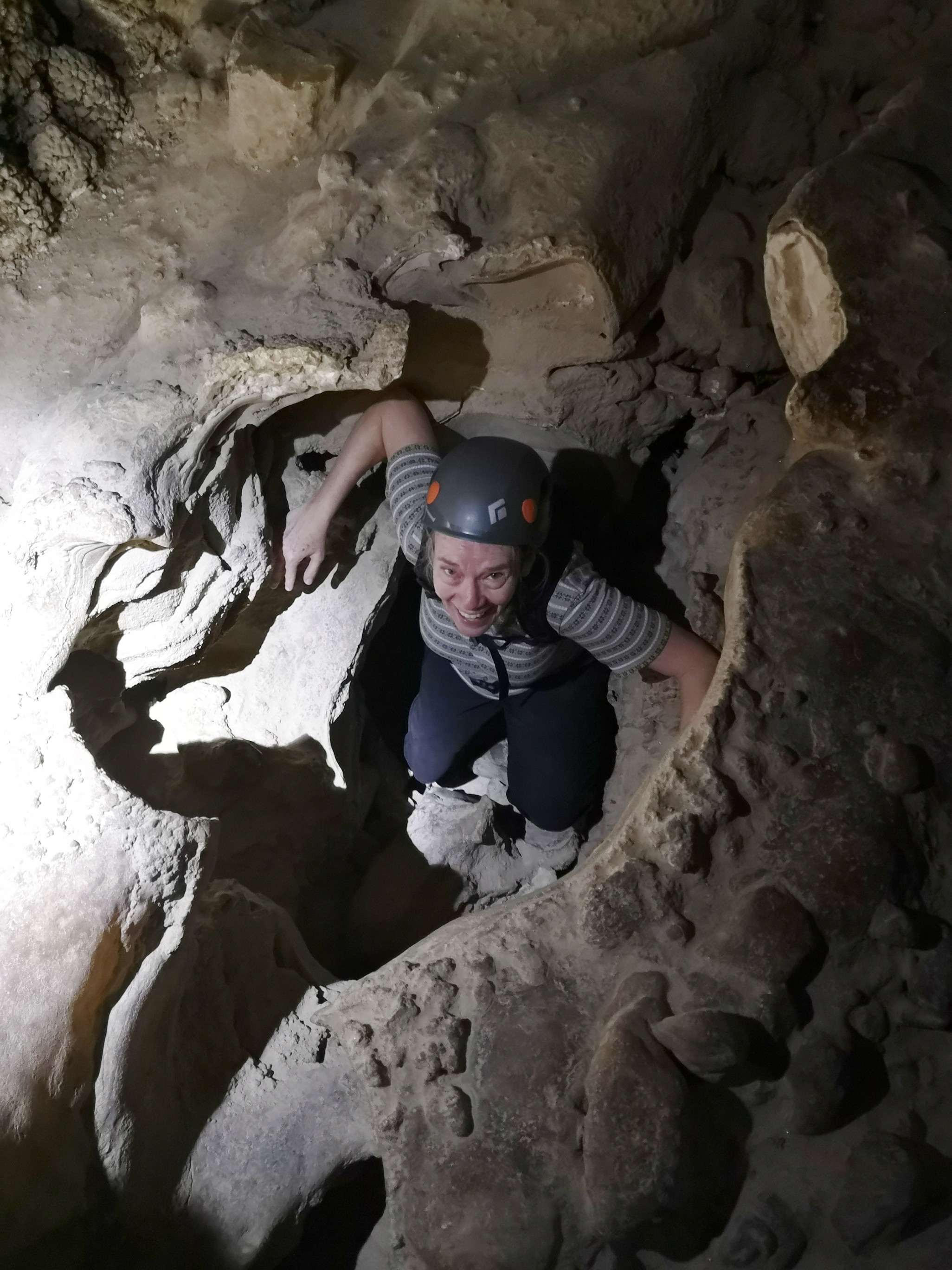 The cavern tour started at 1 pm and there were 9 people on it (max is 10). Ashley the ranger had us get a caving helmet, which we attached our headlamp to, and then drove us in a van back to the park entrance where we took a very bumpy rock road to get to the cavern. The cactus and brush along the road kept scratching the van and it sounded like someone scratching their nails on a chalkboard. Ashley went through the safety aspects before entering the cavern since the hike inside was basically boulder scrambling with a flashlight in your hands. She warned us animals can get in the cave and if there was one certain animal in the cave the tour would be cancelled. There were lots of guesses…the answer, a skunk!! Luckily no skunks. We first climbed up a fairly steep hill to get to the entrance to the cave. The park had replaced the gate that the Seargeant’s had used to control access so the bars had wider openings so animals could go in and out of the cave. The overall opening was too small for bats as they need to circle to fly out of a larger opening but in the park they have Stuart Cave which does have bats from the spring through the fall. As we climbed down through the entrance you could immediately start feeling the humidity in the cave. The temperature is a constant 78F with high humidity which I was glad they had pre told us so we could wear lighter clothes. Our heads were sweating with the helmets on as we proceeded into the cave. This cave is what they call a dead cave, in other words there isn’t any moisture dripping, so the formations will not change over time. The formations we saw dated back 4 million years! Since it was a dead cave we were allowed to touch formations, which was a good thing as you needed 3 point balance as you climbed over the boulders. There were also some connected caverns that were live but they don’t allow people to go into those so they can continue to form. The 2 main features in the cave are the massive columns (1 was 8 stories tall!) and the Helictite’s which formed when the cave was alive, and wind blew the formations as they were dripping. We explored for about 2 hours inside the cave and there were even small vent tubes you could climb in and out of. The tour was awesome but we were blown away that they didn’t require us to sign some sort of liability waiver to do this exploring. Just when we left the cave Ashley spotted a Black Scorpion (they live in the cave) and they have an iridescence when you shine the light on them. This tour was really worthwhile😉