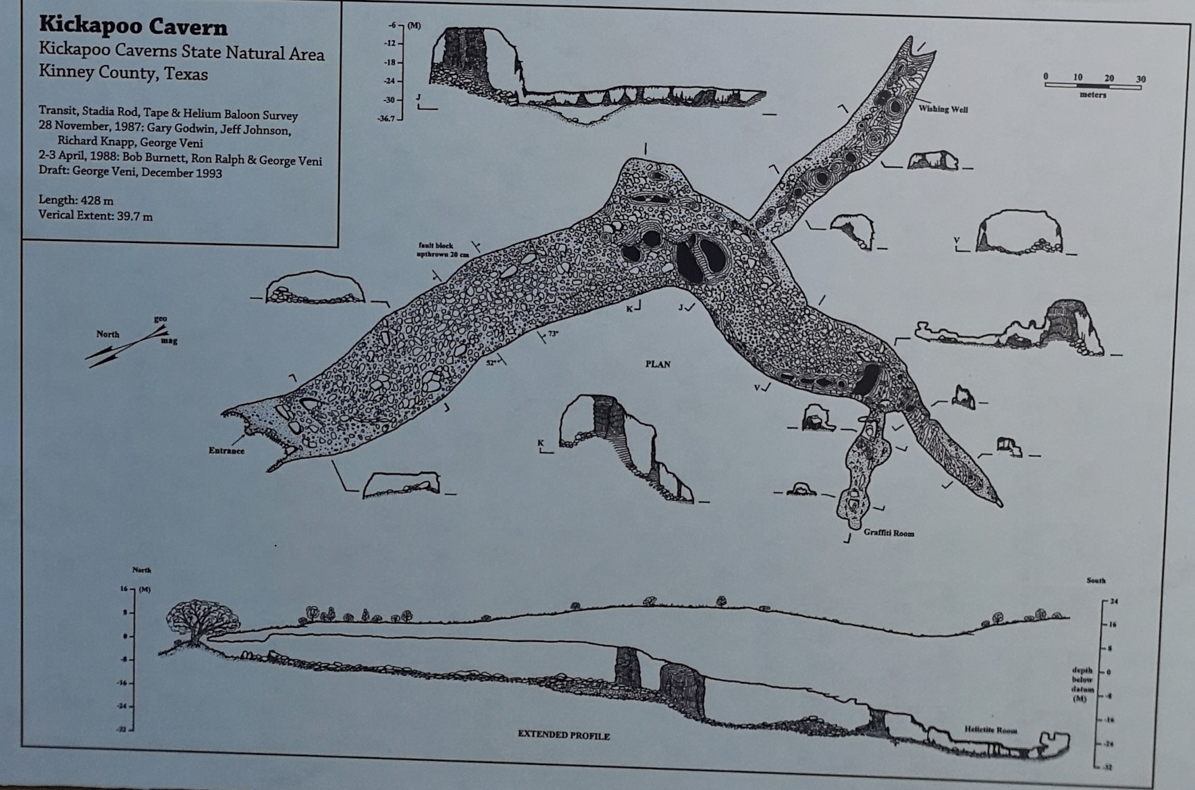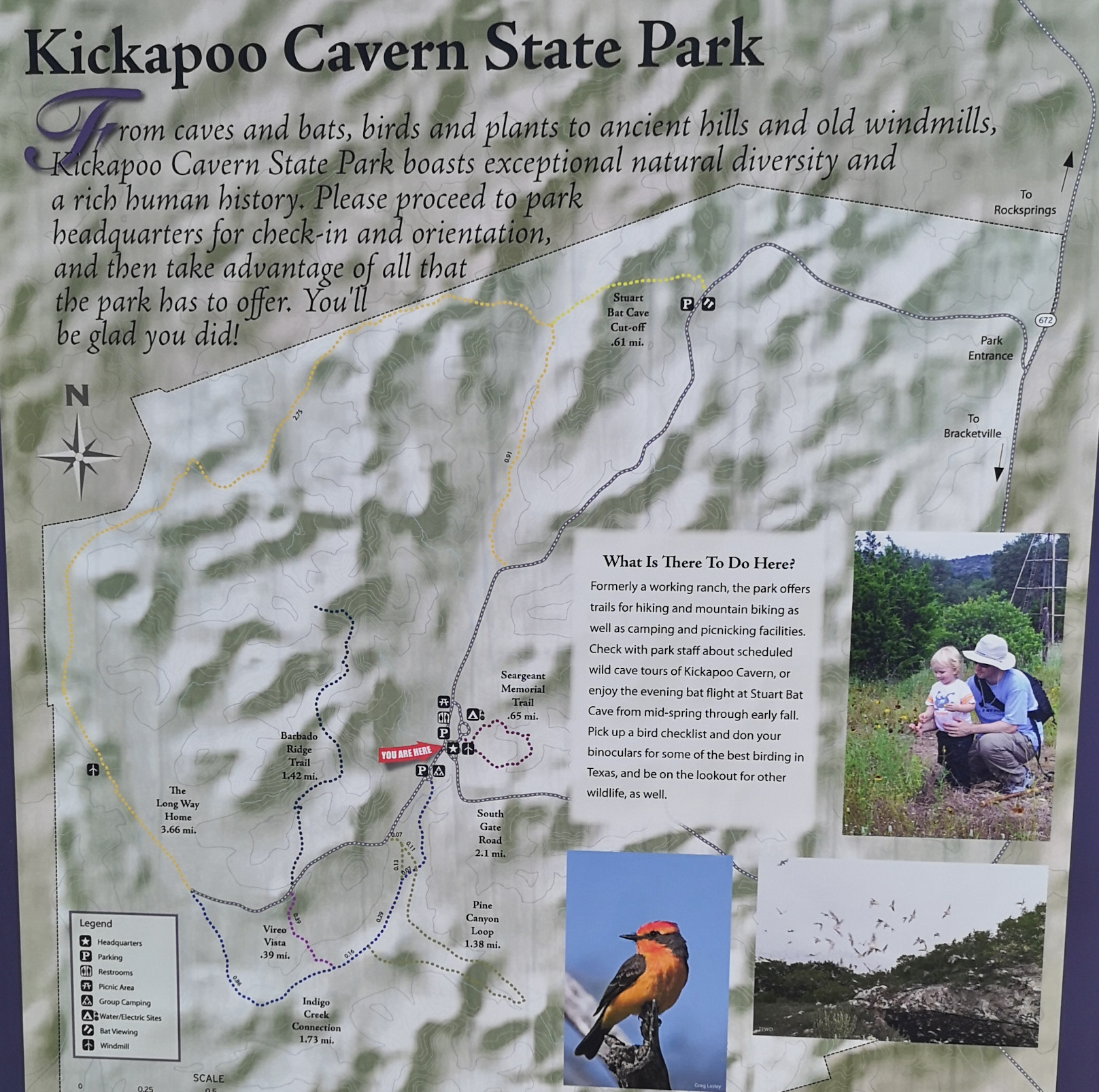 In order to go on the Cavern tour (which is guided) you need to go to Kickapoo Cavern SP for the weekend, the tour is only done on Saturday. We checked in on Friday and on Saturday morning did a short 3 km hike on the Seargeant Major trail and around the campground. It was called Seargeant as that was the ranch family that had owned the property from the 1920’s through to the 1980’s. It was donated to the state for a park in 1986 but didn’t actually open until 2010 so it is the newest of the Texas state Parks. The Seargeant family raised sheep and goats and built a network of piping and windmills to have water for the animals. They also removed the cedar trees to raise the water level (cedar trees use lots of water) so grasses could grow. There are some Pinyon Pines now growing and this is one of the most southerly locations where they grow. The one photo also shows a dipping vat which was used to treat the animals for ticks and parasites.