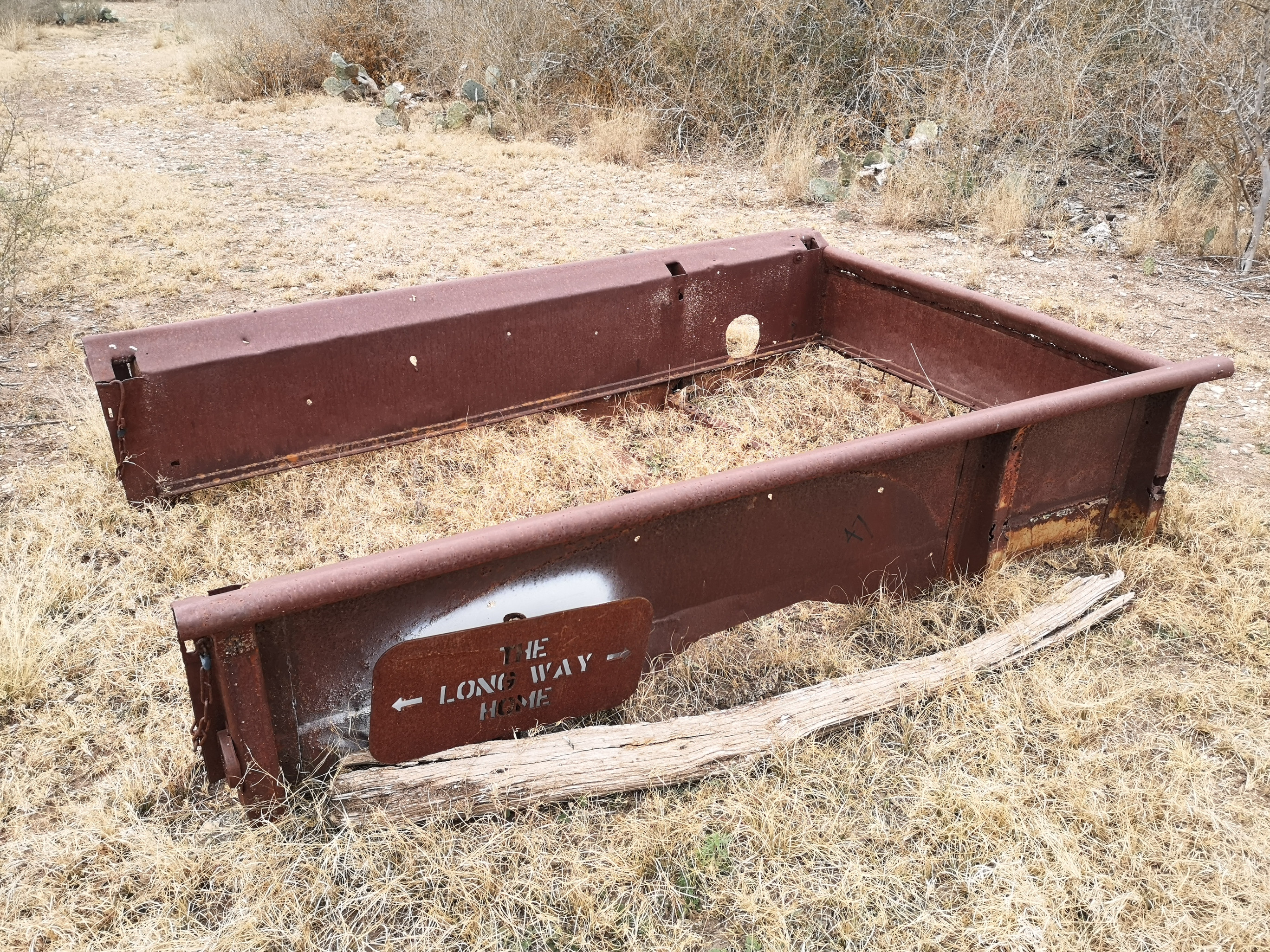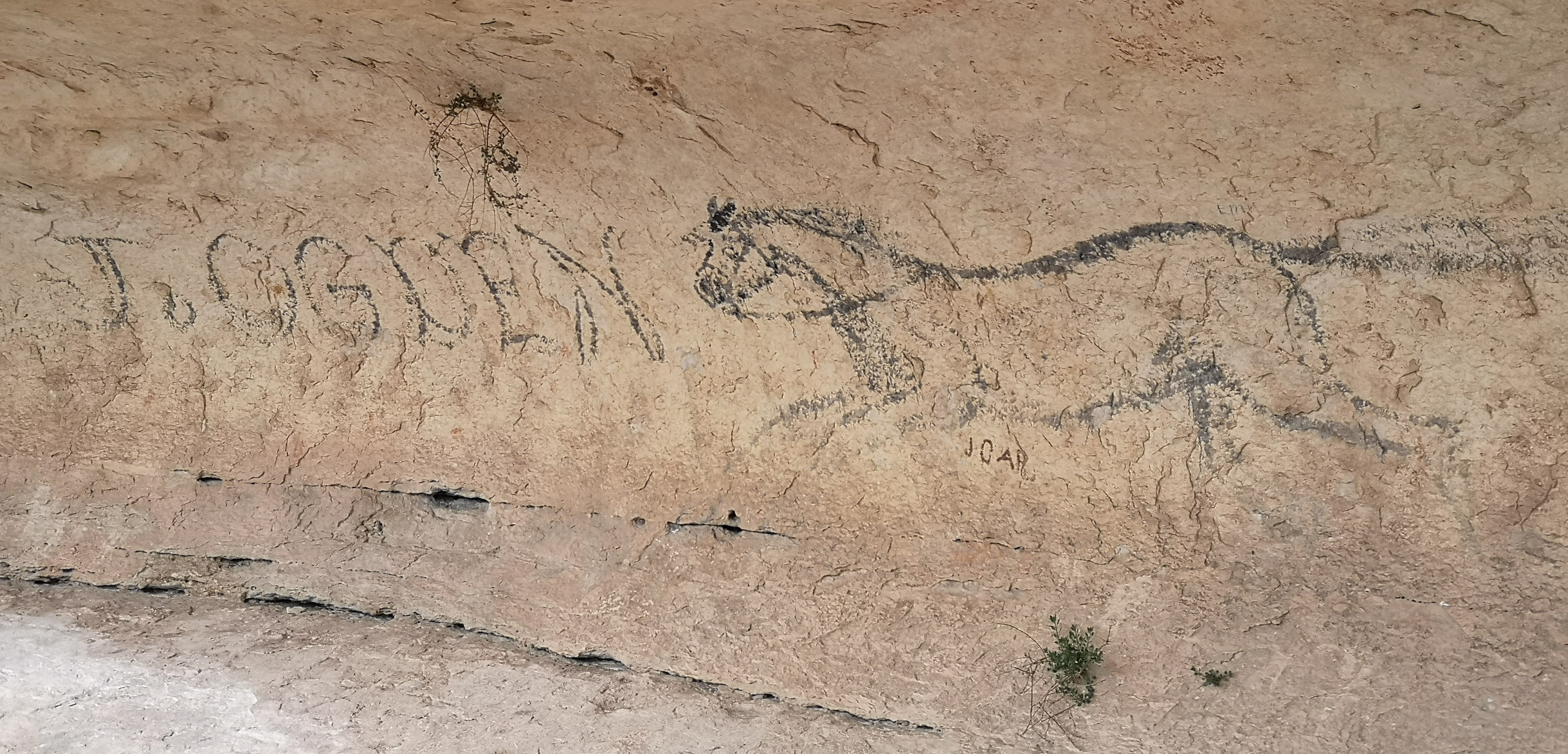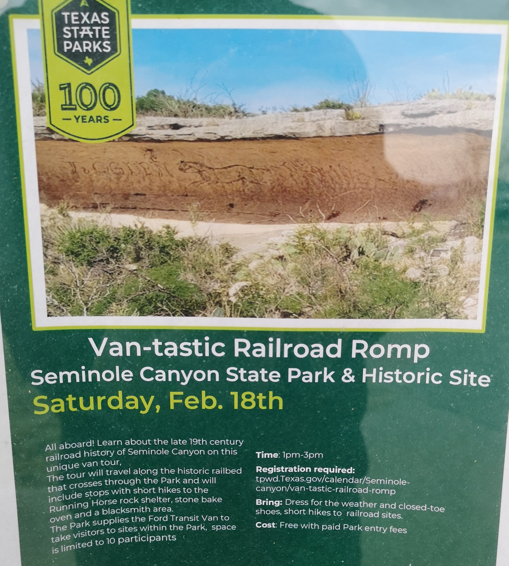We had noticed a pamphlet on a Van-tastic tour of railroad history so opted to add a day (had to move sites for the one night) and stay so we could check out the tour. We had no camping reservations past Seminole so didn’t have to be anywhere. We were on the inaugural tour, they were trying out something new. In 1883 they built the Southern Railroad through what is now Seminole Canyon SP. This historic railway connected the east and the west. Once completed, the railway was only used for 10 years when the engineering technology for train bridges improved, and they decided to move the tracks further north. They basically took all the material and used it in the new location. All that remained of the tracks were the raised rail beds. We drove to the park entrance, and they pointed out where the old train tracks were, you could certainly see it. Our first stop was the Black Horse Shelter. This was an area where they stored their blasting powder behind a wall of rock, taking advantage of the flat wall and overhang. There were some pictographs in the shelter, but they were very faded, they also had historic graffiti, the black horse being the largest of them. In this area and all around the park you also find “historic” artifacts like rusty tins, broken glass and pottery shards. They leave these as part of the history. We passed the drainage tunnel under the railbed before stopping at the old rock oven. We had seen both of these while walking to the visitors center but now got the history of the oven. The oven was moved from its original location when a new highway was built near the park. They labelled each stone and then attempted to put it back together. They said the park builders weren’t as good as the original stone masons since they had to reinforce it with some steal and wood. They built the oven in the camps of the rail workers and used them to make bread. Since they were asking for our input on this tour, we suggested it would be nice to have some fresh made bread at this point😉 Our last stop was down the Rio Grande trail. We parked the van and headed inland a bit to an old blacksmith forge. We enjoyed getting all the extra history and hope they continue the tour.