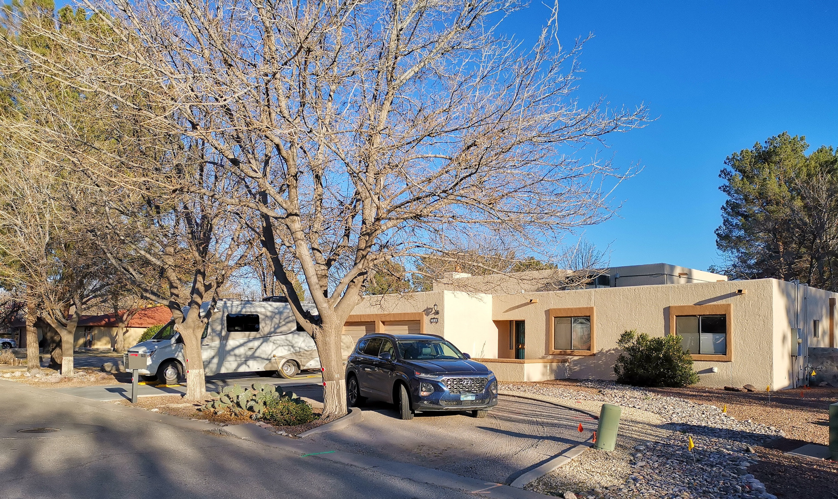 We had hoped to have a leisurely morning at the park before leaving to head into New Mexico but the winds were picking up and we wanted to get on the road before they got too bad. It was a short drive from Franklin Mountains to our friend’s house (Becky and Ed) in Las Cruces. The interstate isn’t the place to be with the RV in high winds, so we took back roads, driving along the pecan farm lined road. Ed works from home so there wasn’t any issue with our early arrival. We were happy to take over their couch for blogging and use their laundry facilities. When Becky got home from work, we headed to one of their favourite local restaurants Thai Delight for dinner, I had the Spicy Beef Thai Delight and Sharon had the Shrimp Thai Delight as well as some really good Spring Rolls.