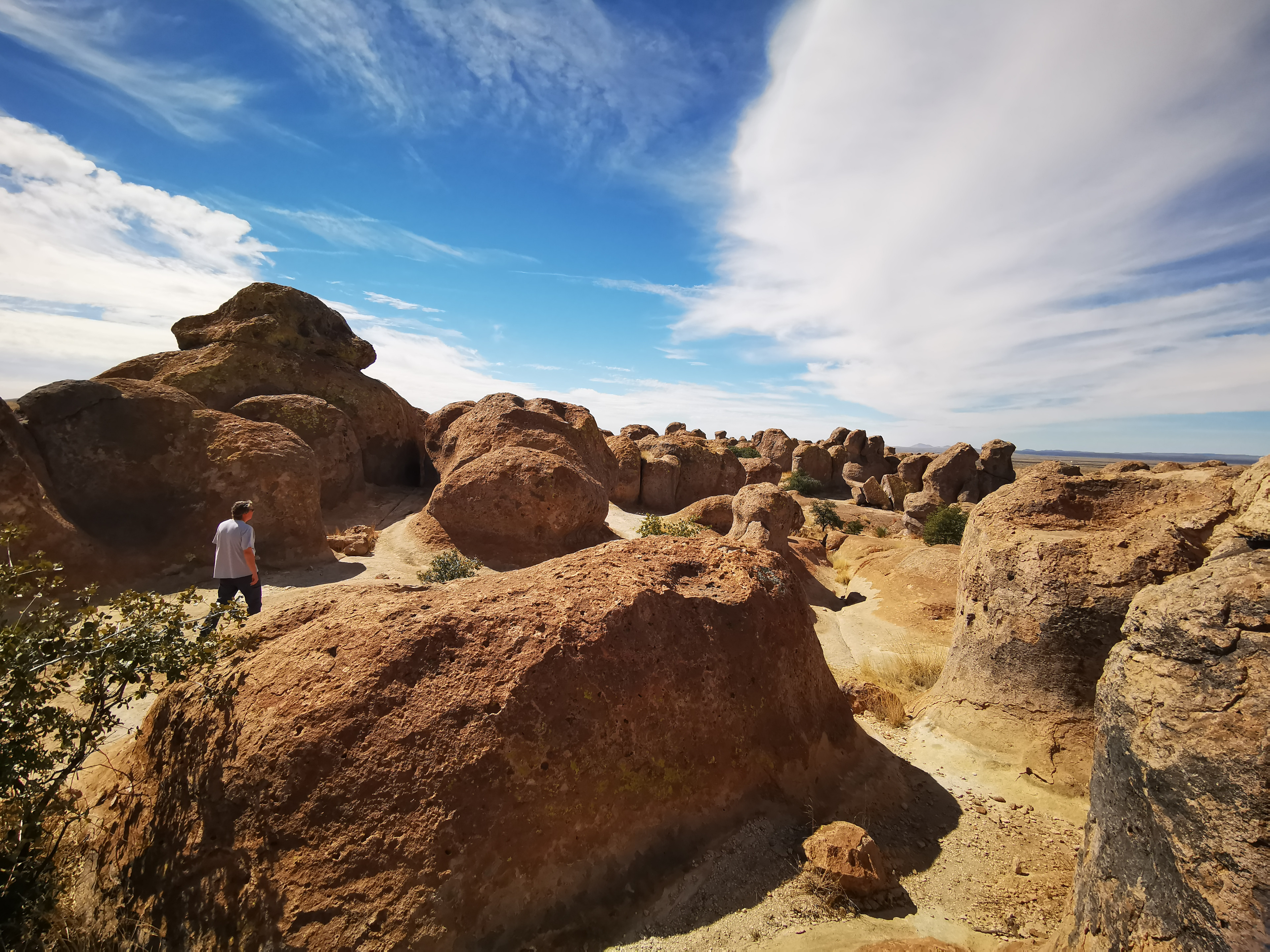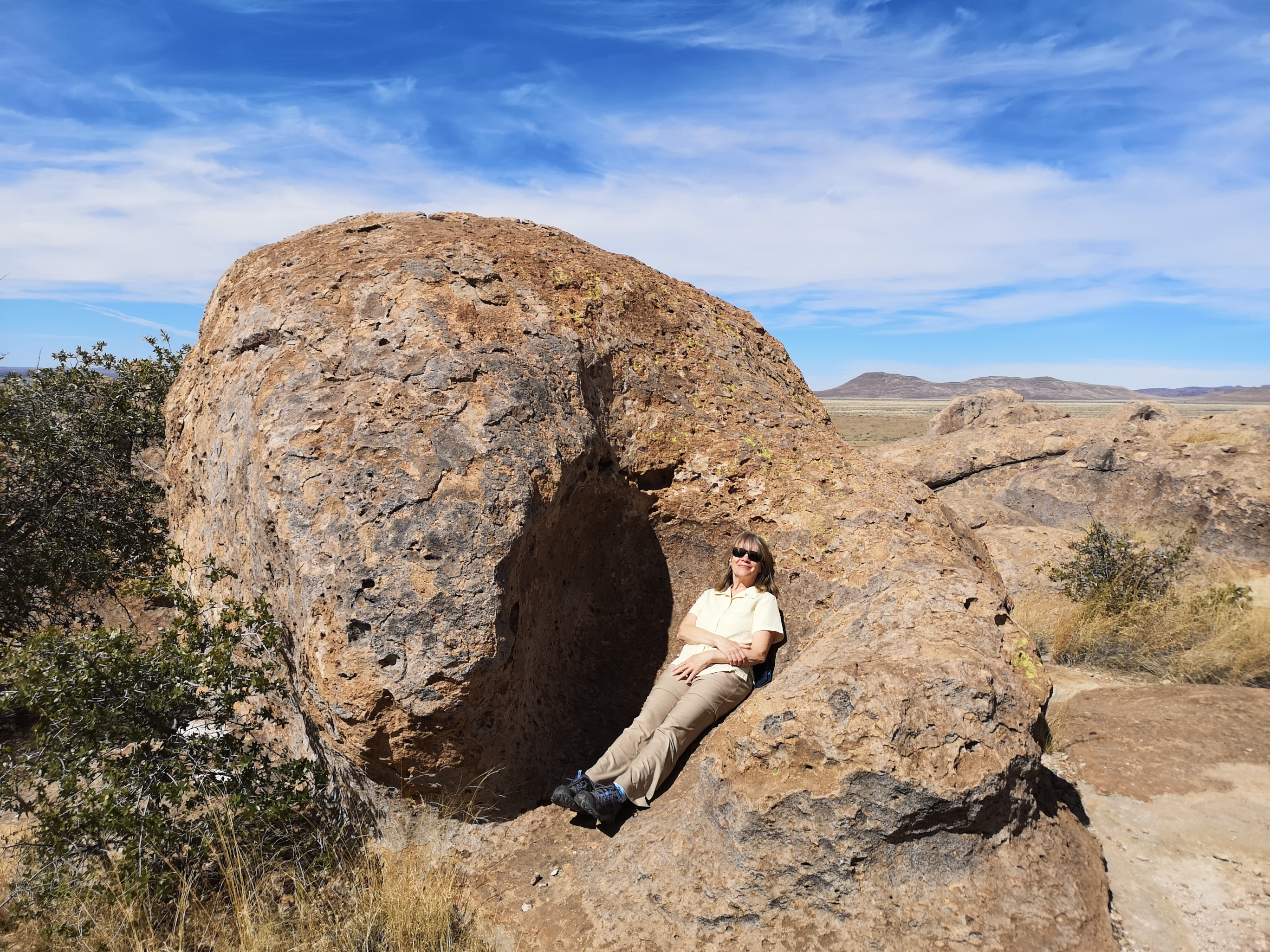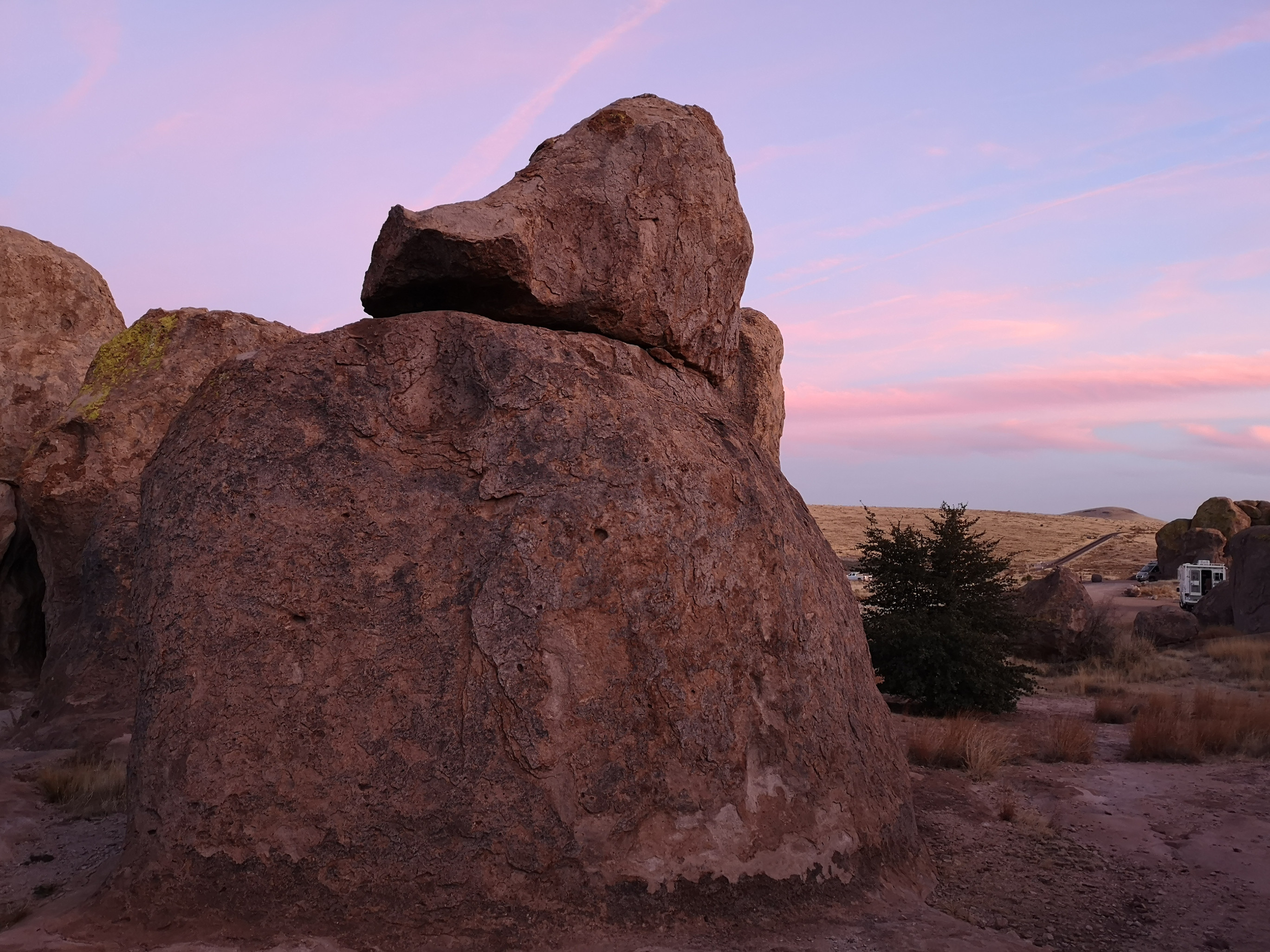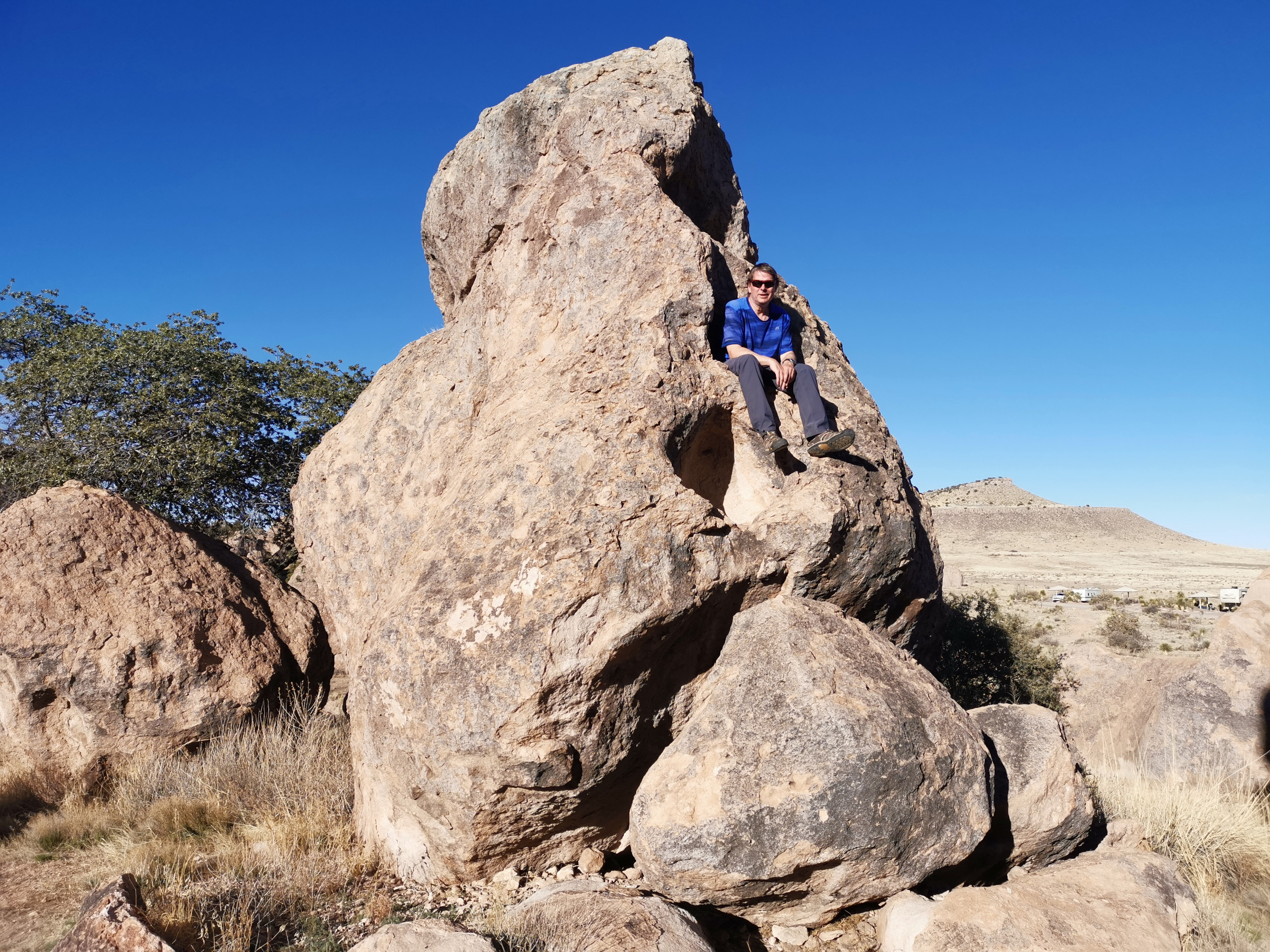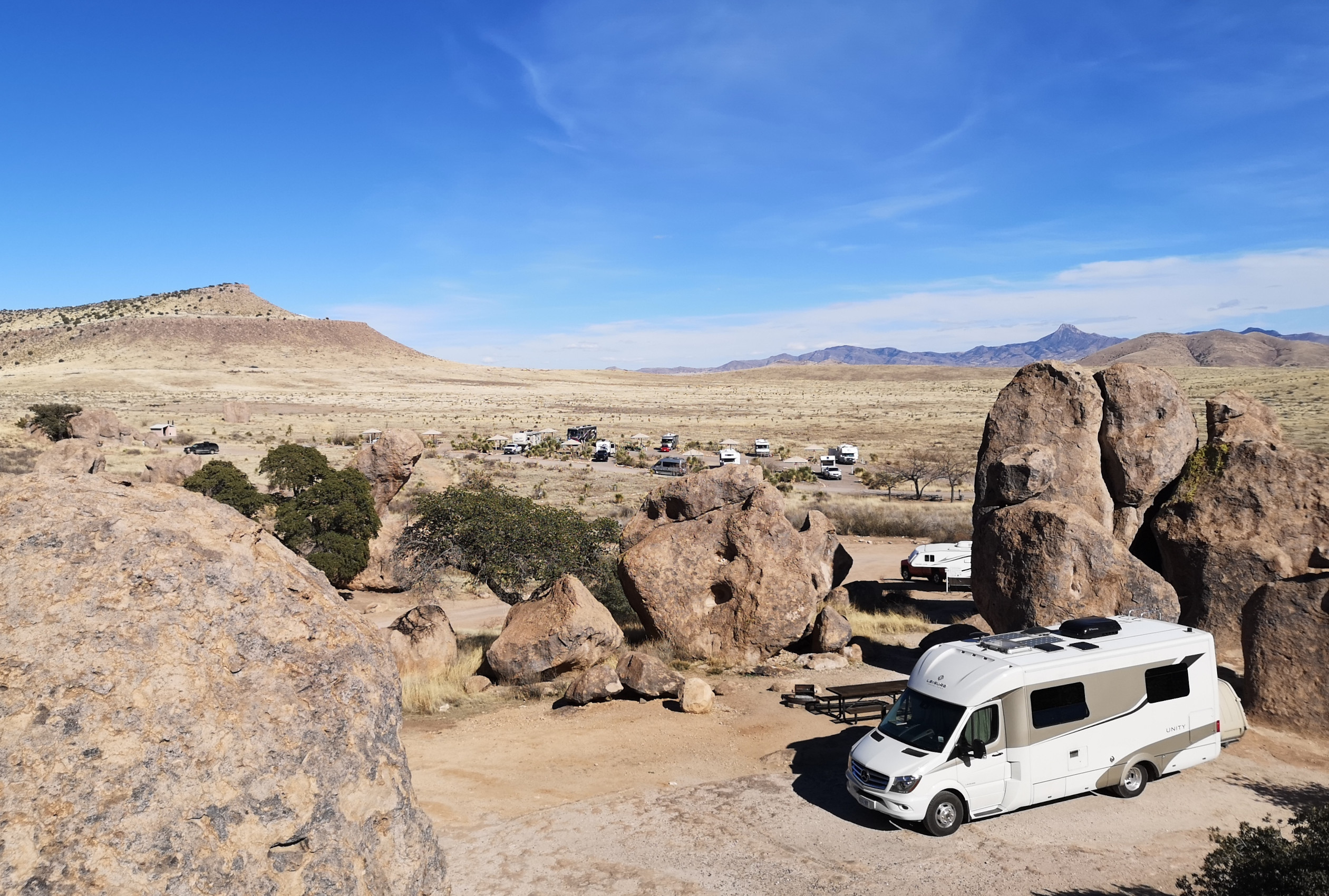 As we hit the road with clean clothes, we decided we should clean the RV, so we found a big RV wash to get some of the dirt road dust off!! We headed to Deming where we had a fantastic lunch at a Mexican restaurant called Si Senor. I had Shredded Beef Gorditas and Sharon had a combo platter, so we pretty well covered all of the menu items. We had lots of leftovers for another meal! They had the best homemade hot salsa we’ve had, so we bought some to go which they put in a takeaway drink glass😊 We drove north to City of Rocks State Park. We’d been here before and really enjoyed it so wanted to go back. We couldn’t believe it when the site we booked turned out to be the exact same site we had 5 years ago!