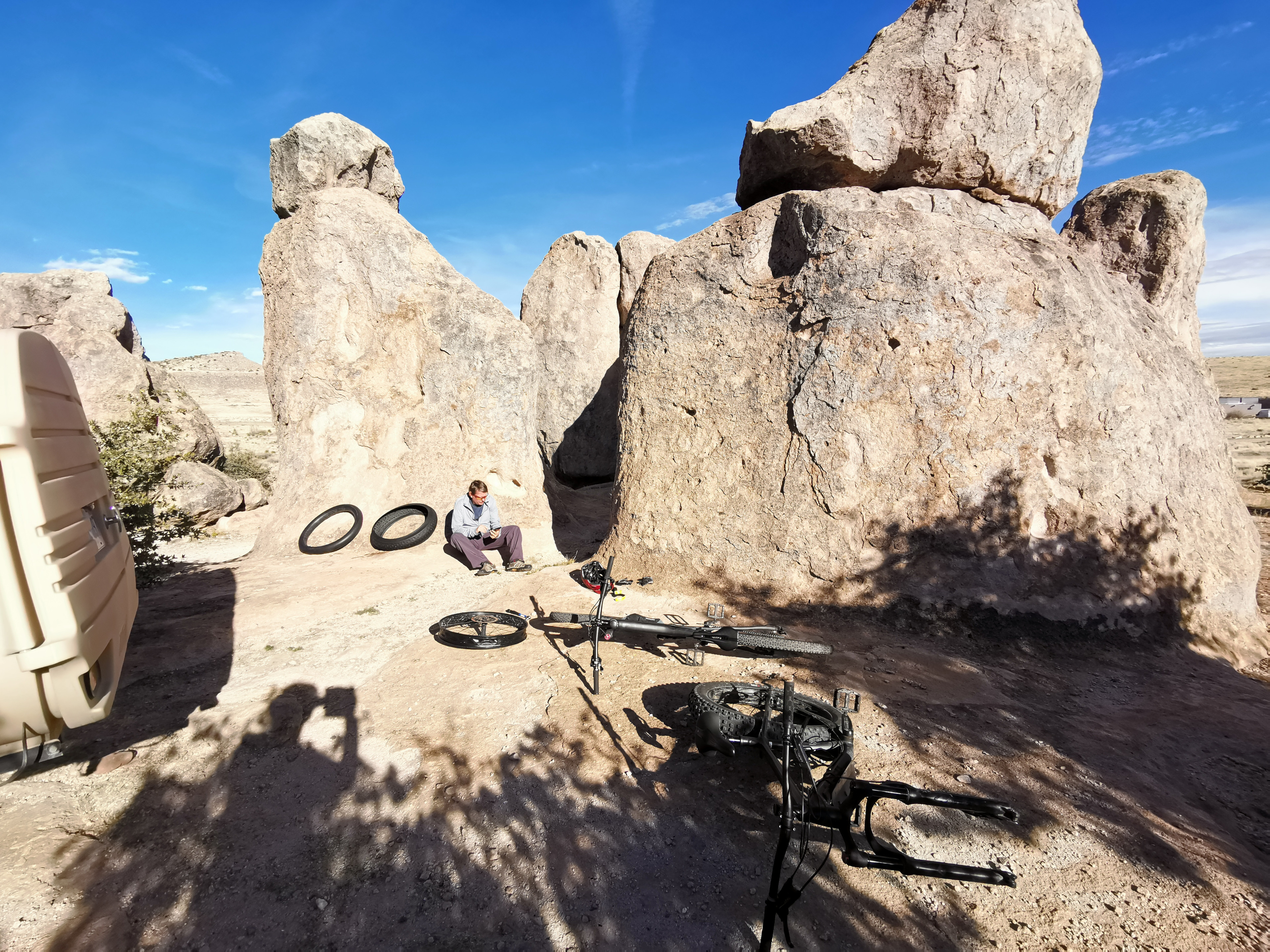 On our first day we decided to use our bikes and ride the trails. We knew Sharon’s tire was flat, so I fixed it before we headed out. We did the Hydra Trail around the campground and up to the observation point trail where we enjoyed the view of the rocks. We then rode 3 kms down the road to the Cienega Trail. We were halfway through the 3.5km trail when Sharon got ANOTHER flat tire!! The hazard of riding on a thorny desert trail. As she pushed her bike out and we tried filling the tire in hopes of riding back. A couple just finishing a hike on the trail offered her a ride since they had an empty bike carrier on the back of their vehicle. Sharon was happy to accept as there was no way air was staying in the tire. Time to patch the hole in the brand new tube, that just lasted 1 hour, we hope it holds!