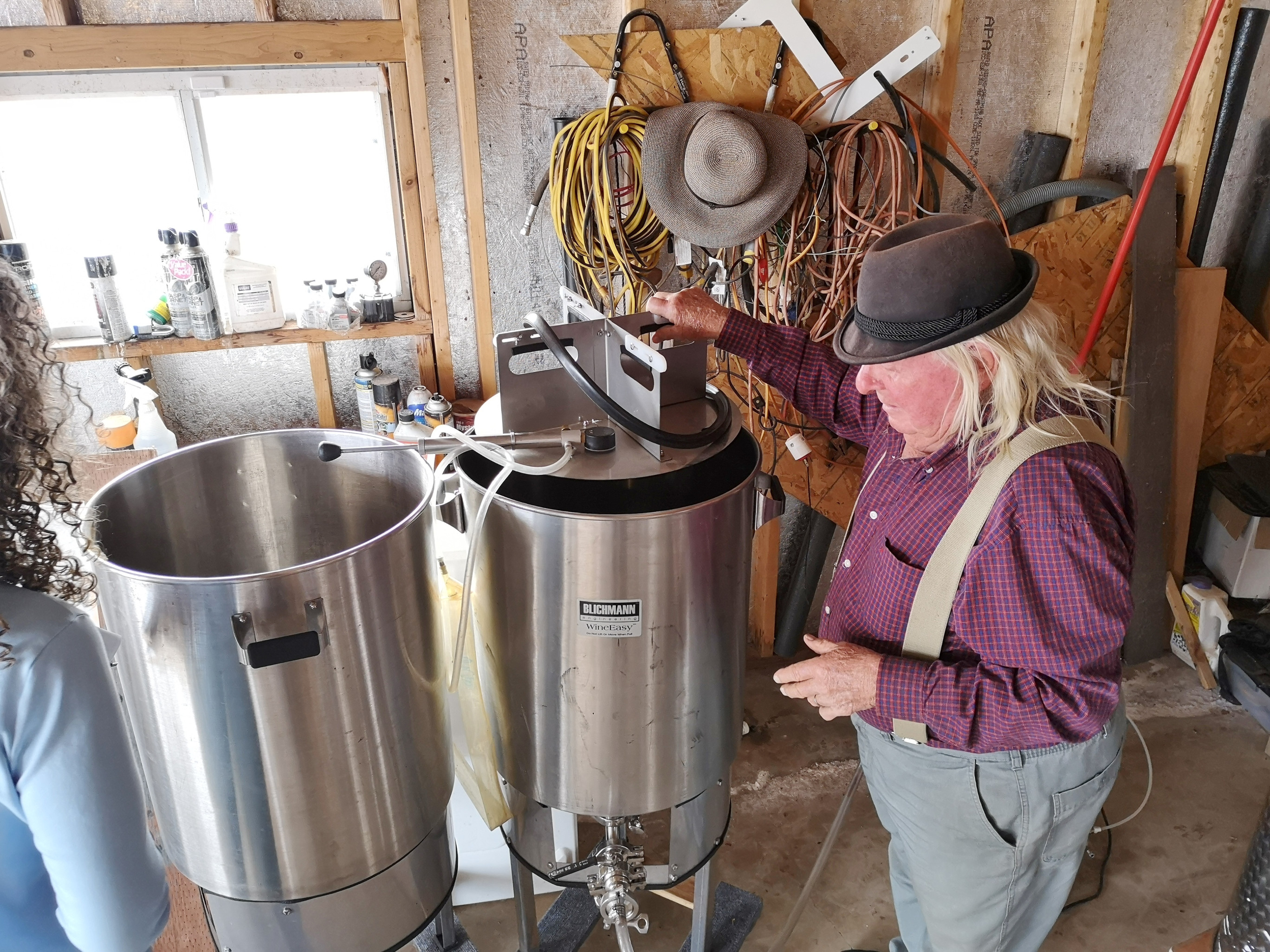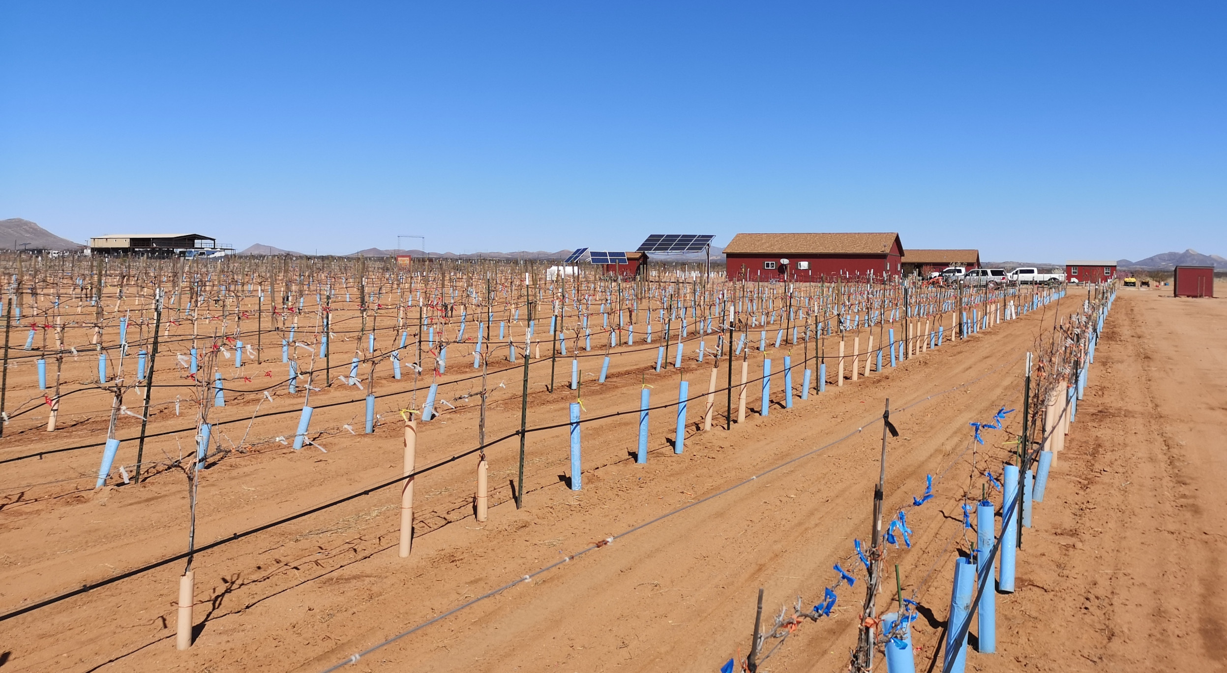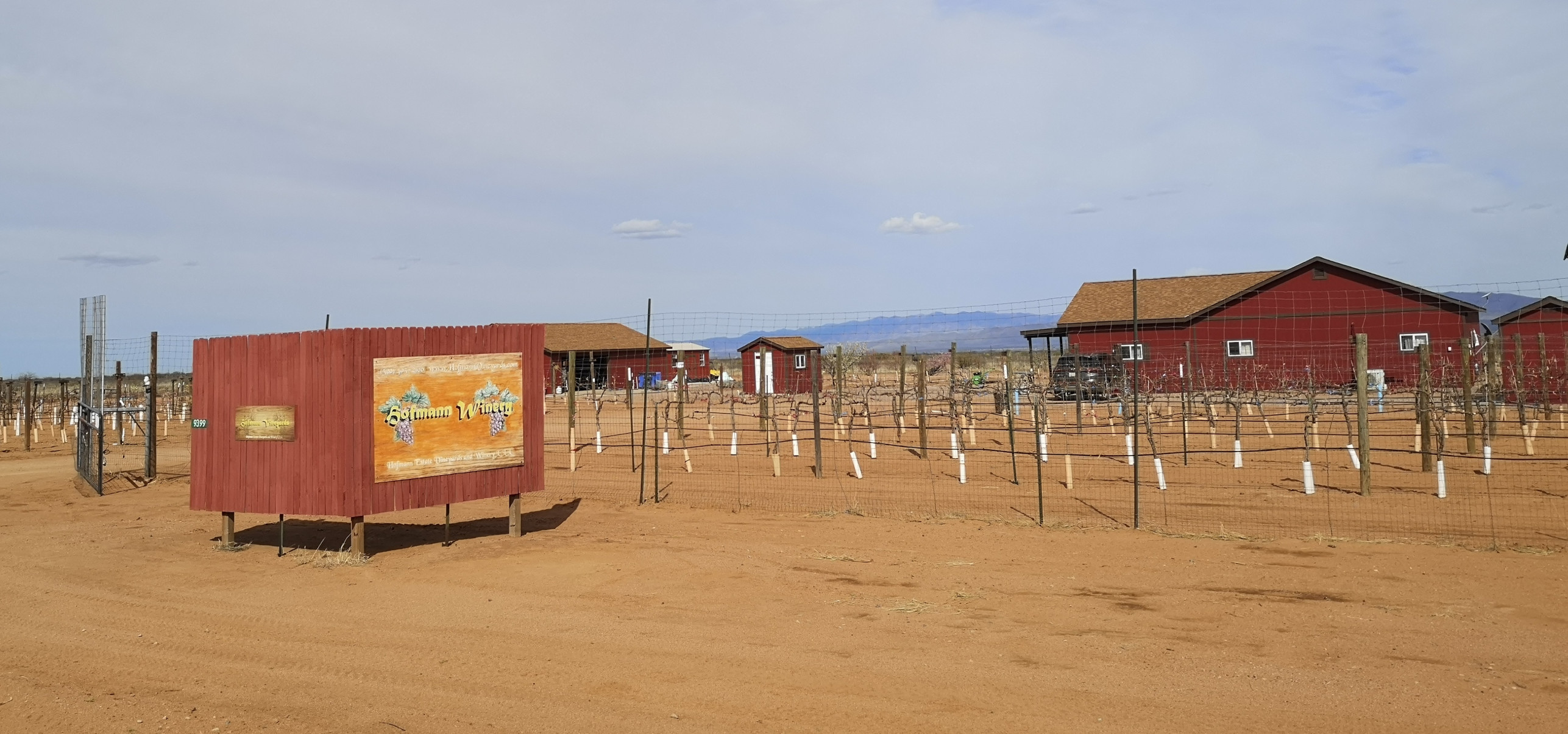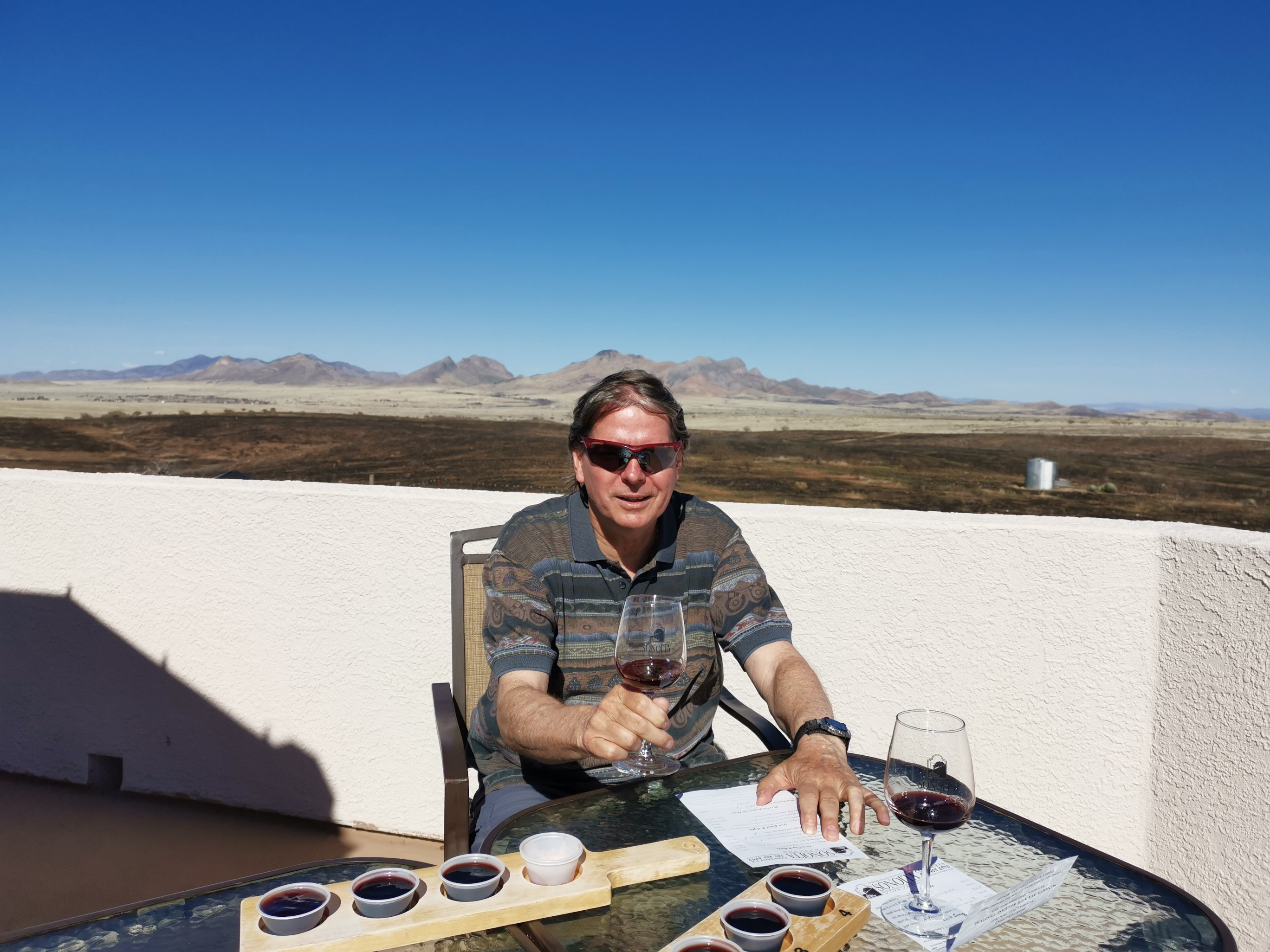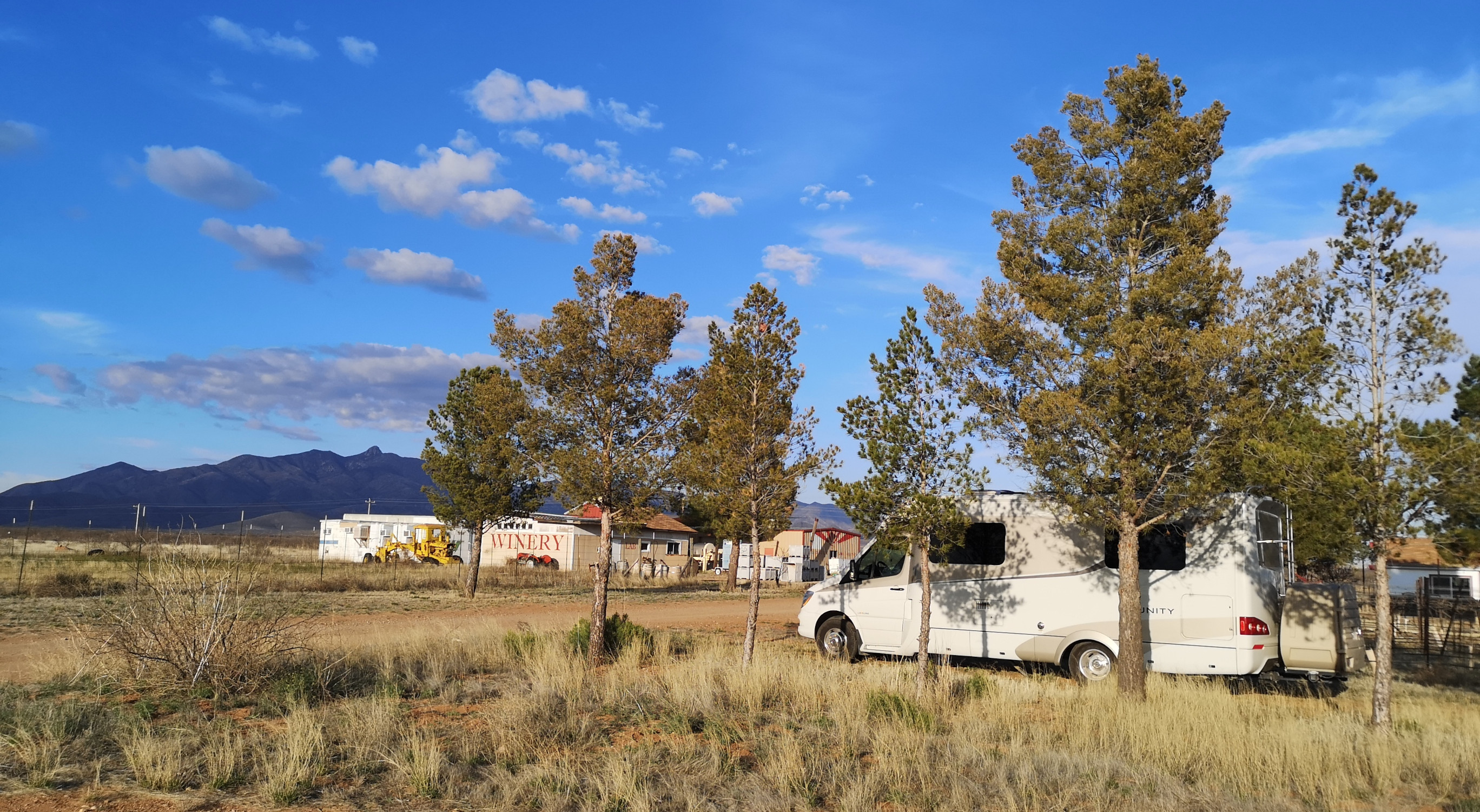 The winds were a bit strong when we started the 370 km drive to Arizona, so we took some back roads instead of I-10, and we actually crossed the Continental Divide 3 times. We were also surprised by how much snow was in the top of the mountains as we entered Arizona. When we arrived at our Harvest Host (HH) stay the host had just started a wine tasting with 2 other couples staying overnight so we quickly got parked and joined in. Hofmann Vineyards does German style wines. We had 13 samples in the tasting room before heading out for a tour of the Vineyard barn and a few more samples. The good thing about a Harvest Host location is that you don’t have to worry about driving after sampling. Turns out the owner was making small batches of wine as a retirement hobby. He had worked for IBM for many years in the lab in Rochester, so we chatted for a while after we’d made our purchases.