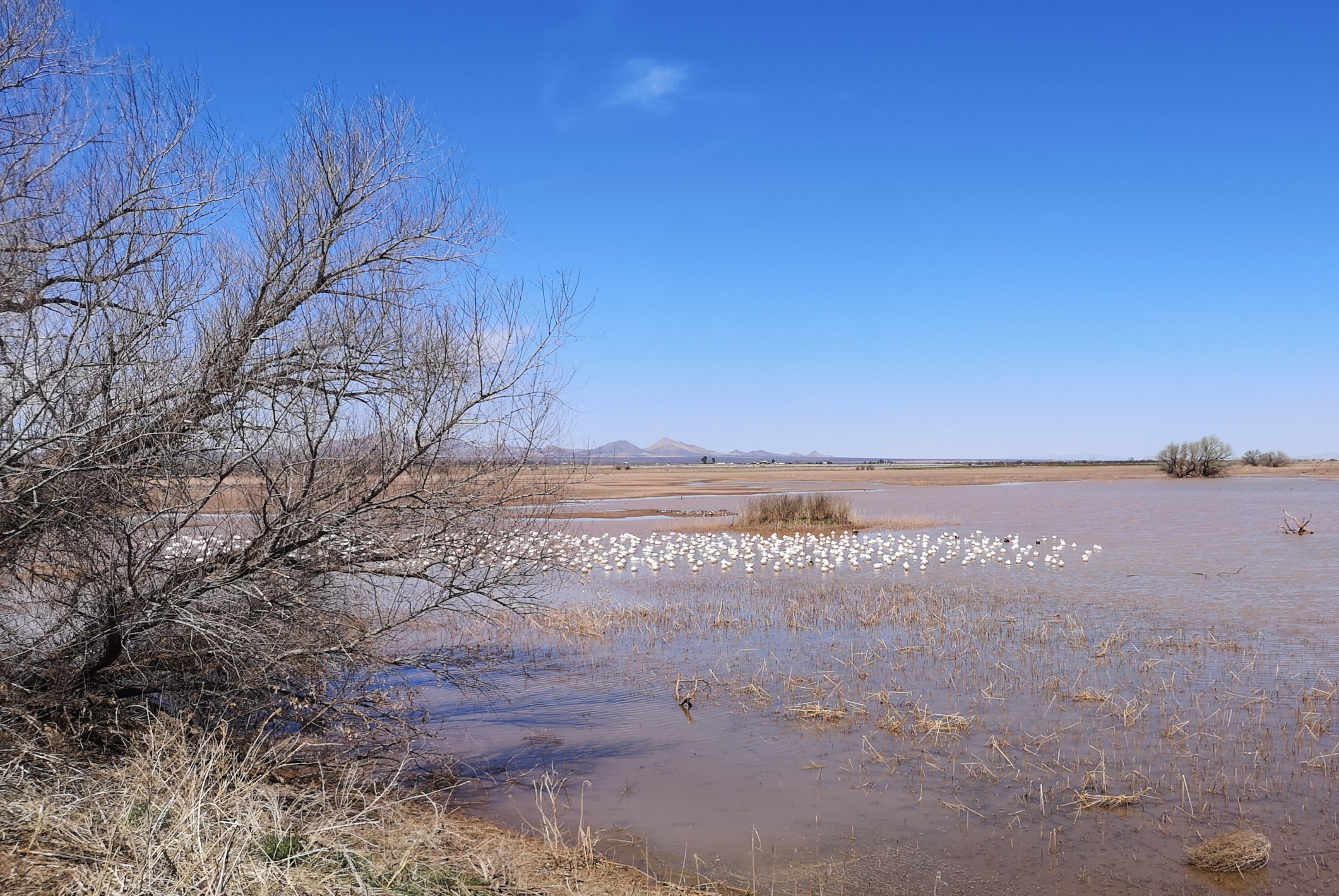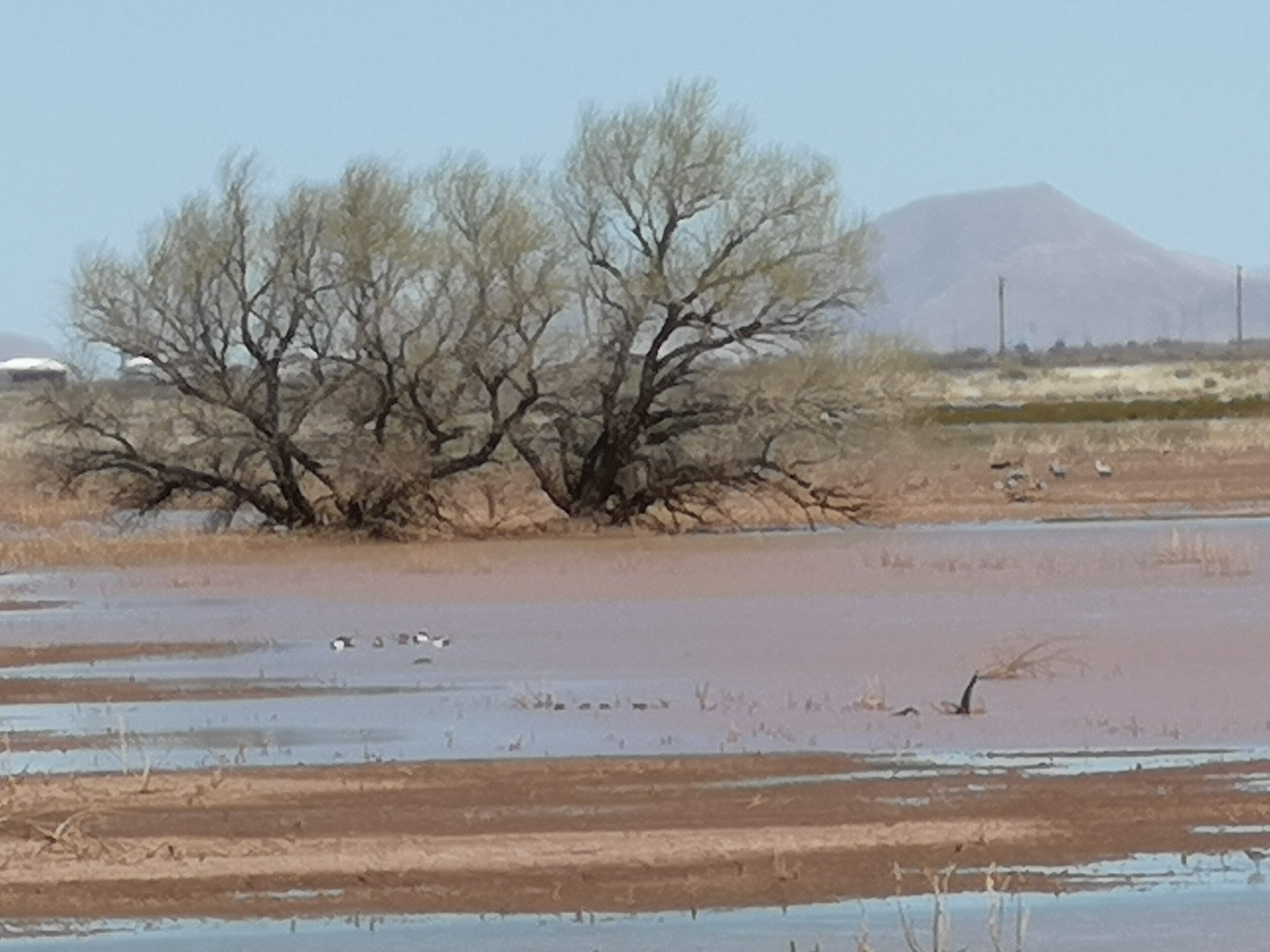 The next morning before driving to our next HH location we went to the Whitewater Draw Wildlife Area famous for the Sandhill Cranes. They are usually there until mid-March, so I think we missed most of them. We did see a few young ones off in the distance with binoculars. The white geese were all in the water when we walked by but must have gotten spooked by something as they all took flight. It was interesting watching them fly around the area but beware when they fly overhead!!