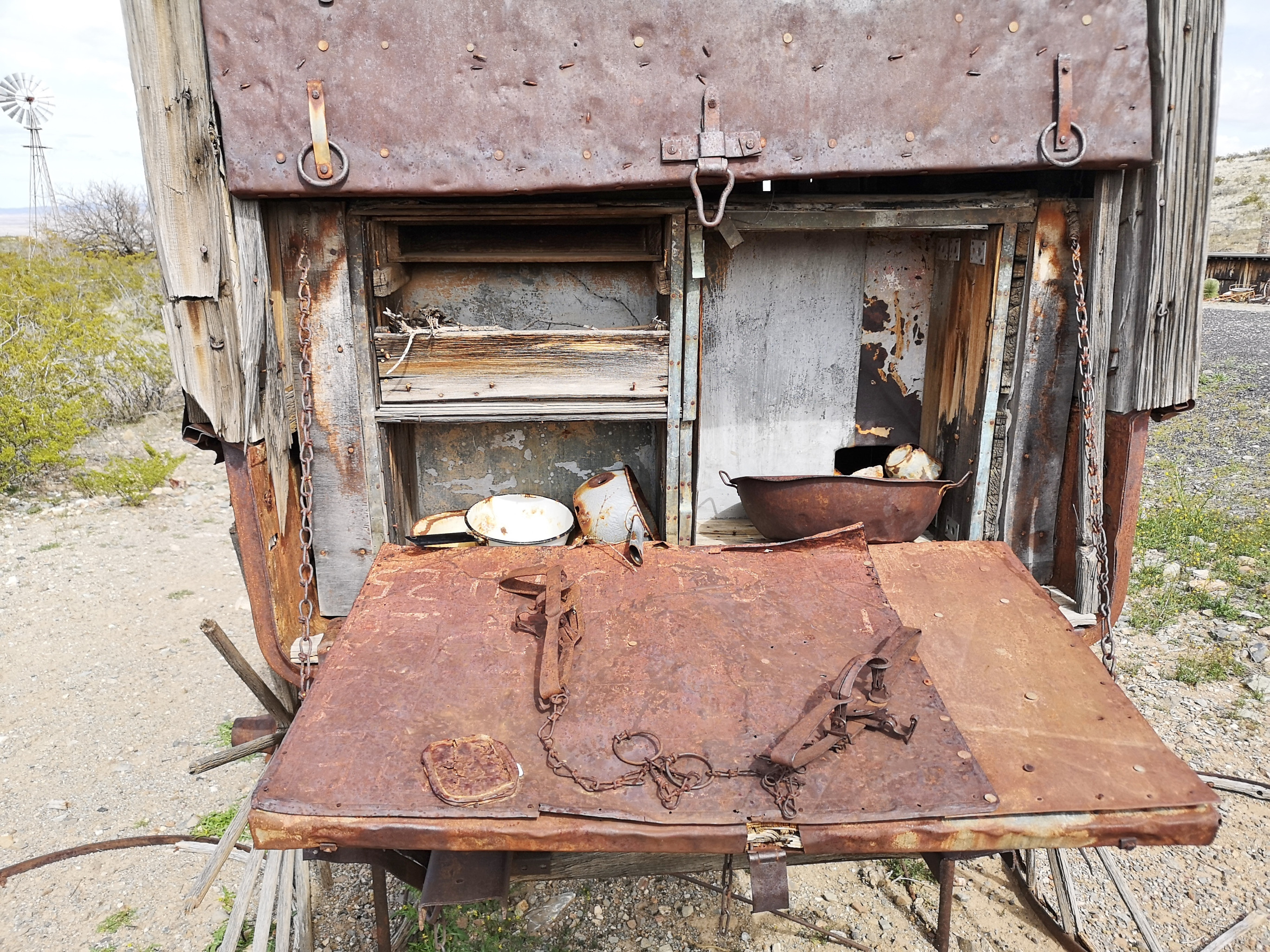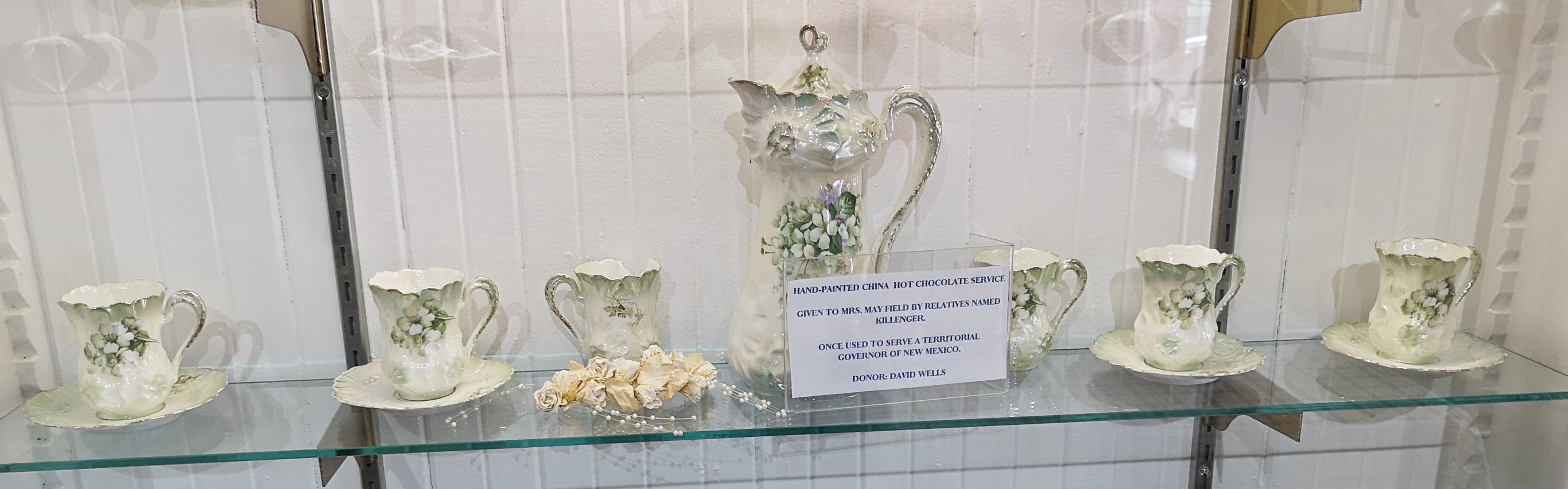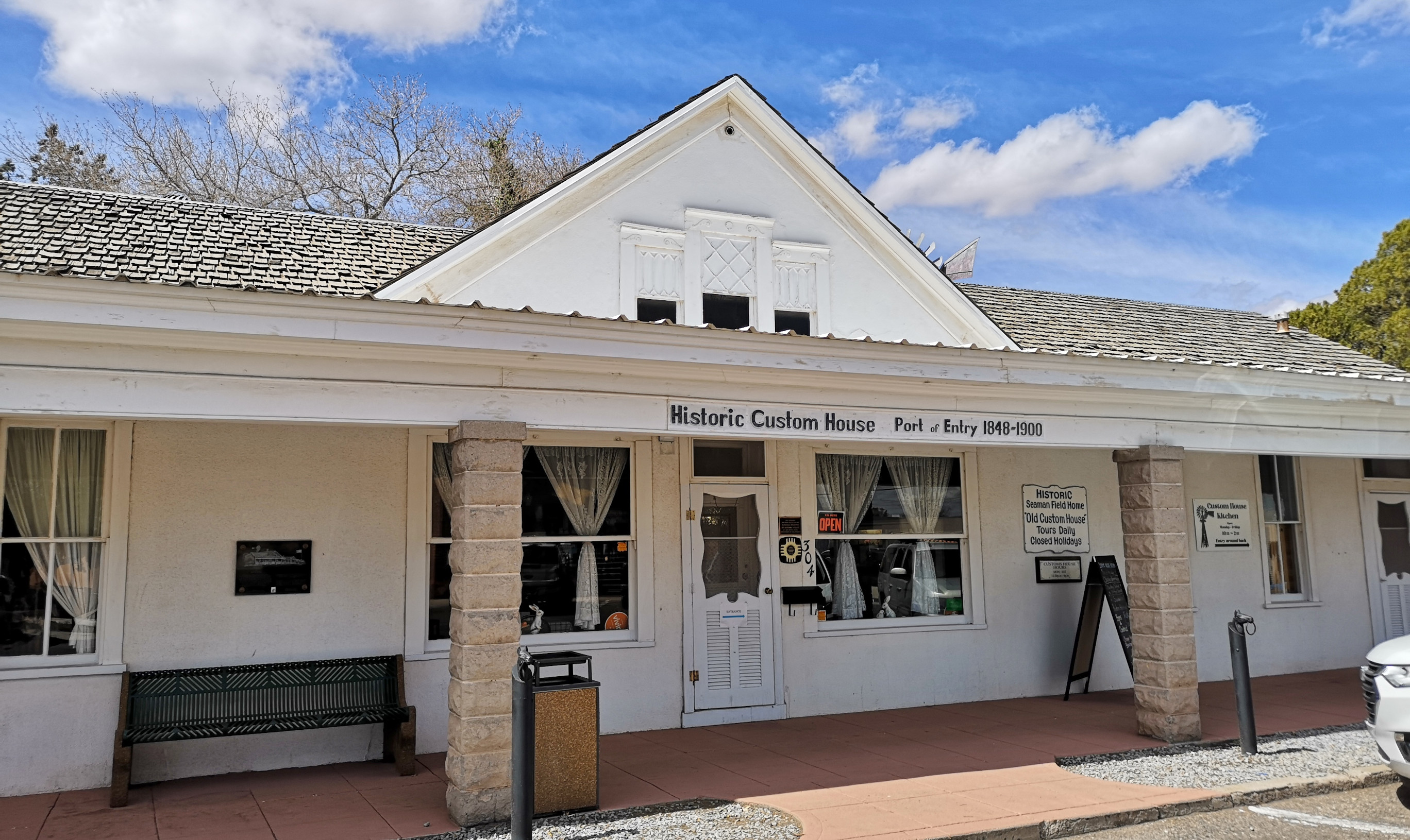 The next day we headed back into Deming, getting diesel at the cheap station and filling our propane at the expensive place. Since it was lunchtime, we decided to find a place to eat. We ended up at the Custom House, a historic building that was trying something new by offering light lunches. I had the Sonora hot dog with really good chips and Sharon had a corn meal muffin and a tomato stuffed with chicken salad. They had interesting displays of dishes; Sharon’s favourite was the hot chocolate set. The building was the original custom house from 1848-1900 so there was a display dedicated to that.