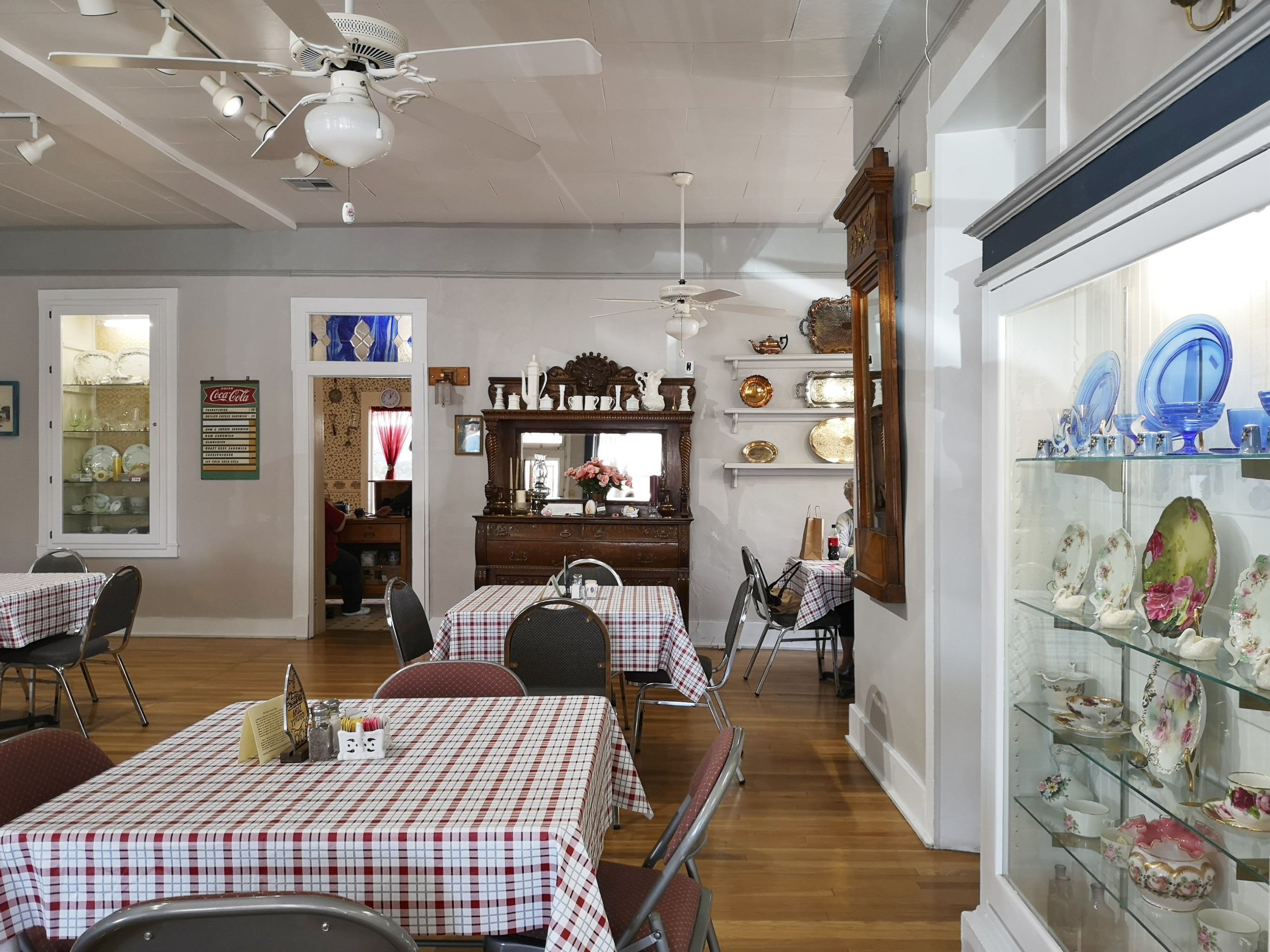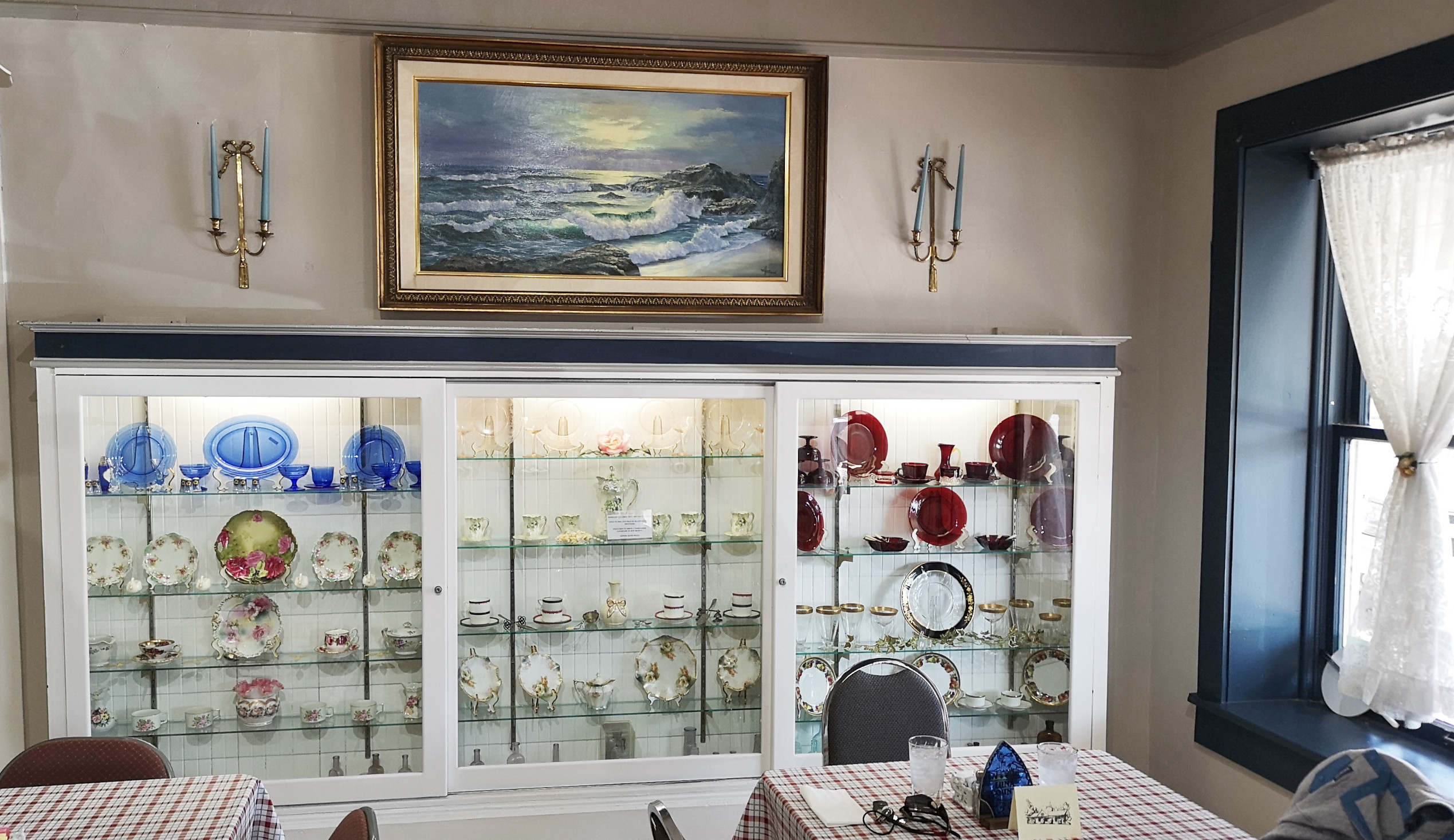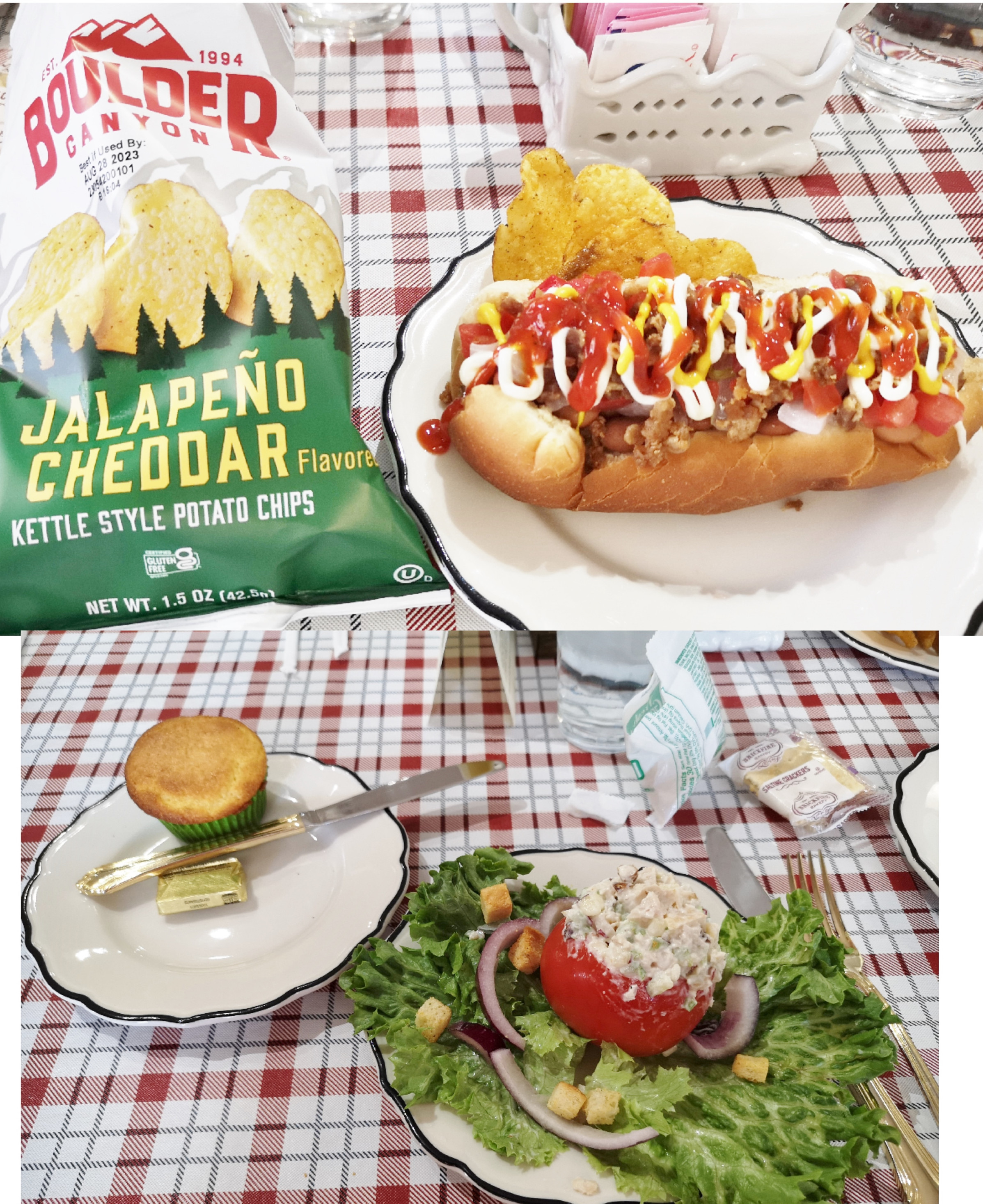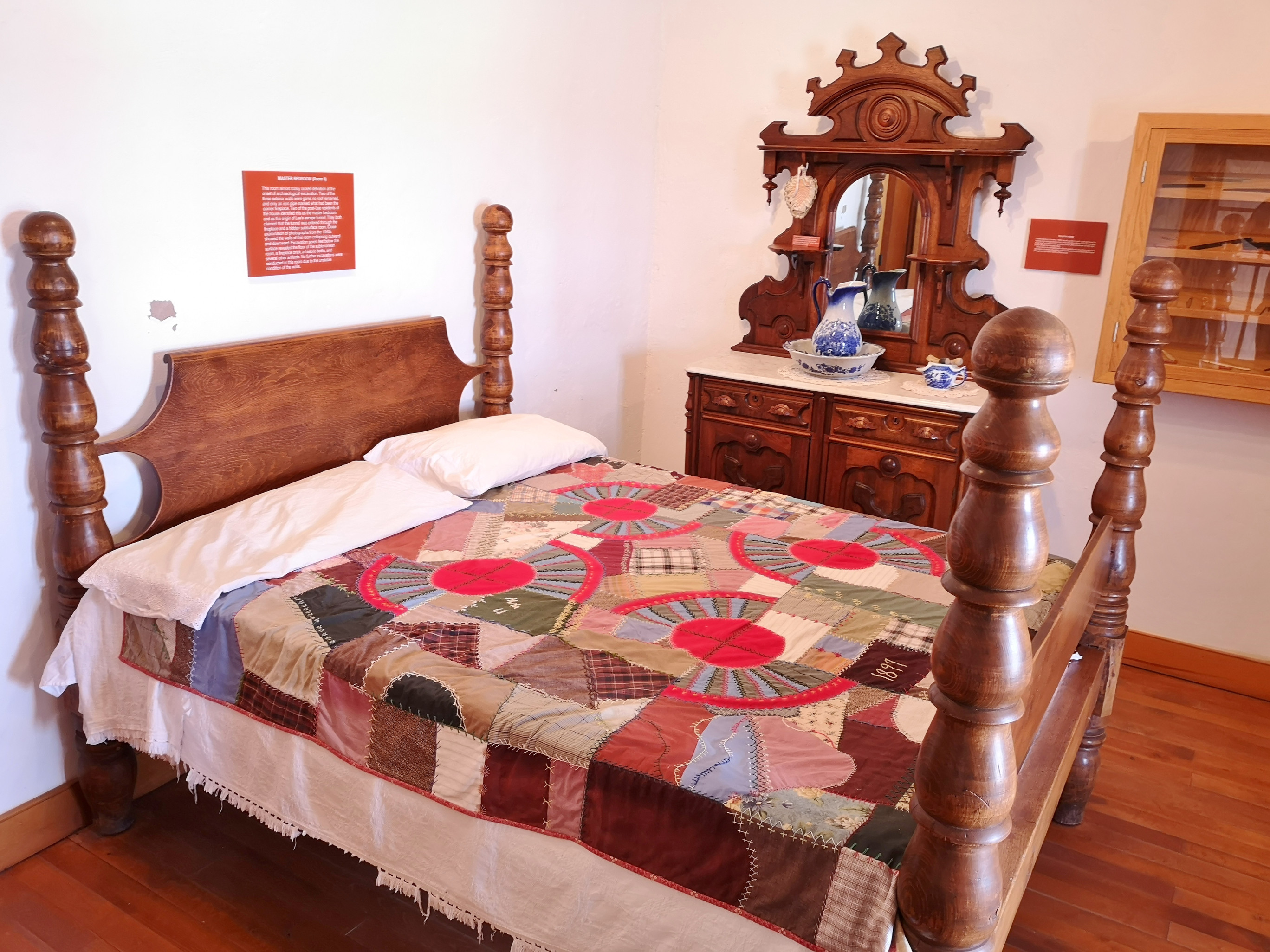 The next day we headed back into Deming, getting diesel at the cheap station and filling our propane at the expensive place. Since it was lunchtime, we decided to find a place to eat. We ended up at the Custom House, a historic building that was trying something new by offering light lunches. I had the Sonora hot dog with really good chips and Sharon had a corn meal muffin and a tomato stuffed with chicken salad. They had interesting displays of dishes; Sharon’s favourite was the hot chocolate set. The building was the original custom house from 1848-1900 so there was a display dedicated to that.
