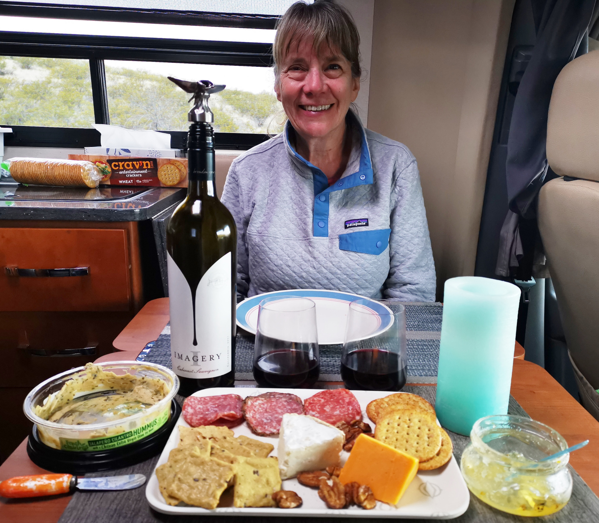 The next morning after a quick museum tour, we drove to Spring Canyon up the road with a 17% grade hill to get there. We did the Lover’s Leap trail of 5 kms straight up 330 m and when we got to the top the wind was blowing like crazy. We had done this trail the last time we were here, and it was windy then as well. We weren’t as tired as last time since we drove the RV instead of riding bikes! We didn’t have far to drive to the HH where Sharon sampled bubbly and I had a glass of wine before heading to the RV to enjoy some of the wine and cheese we’d purchased.