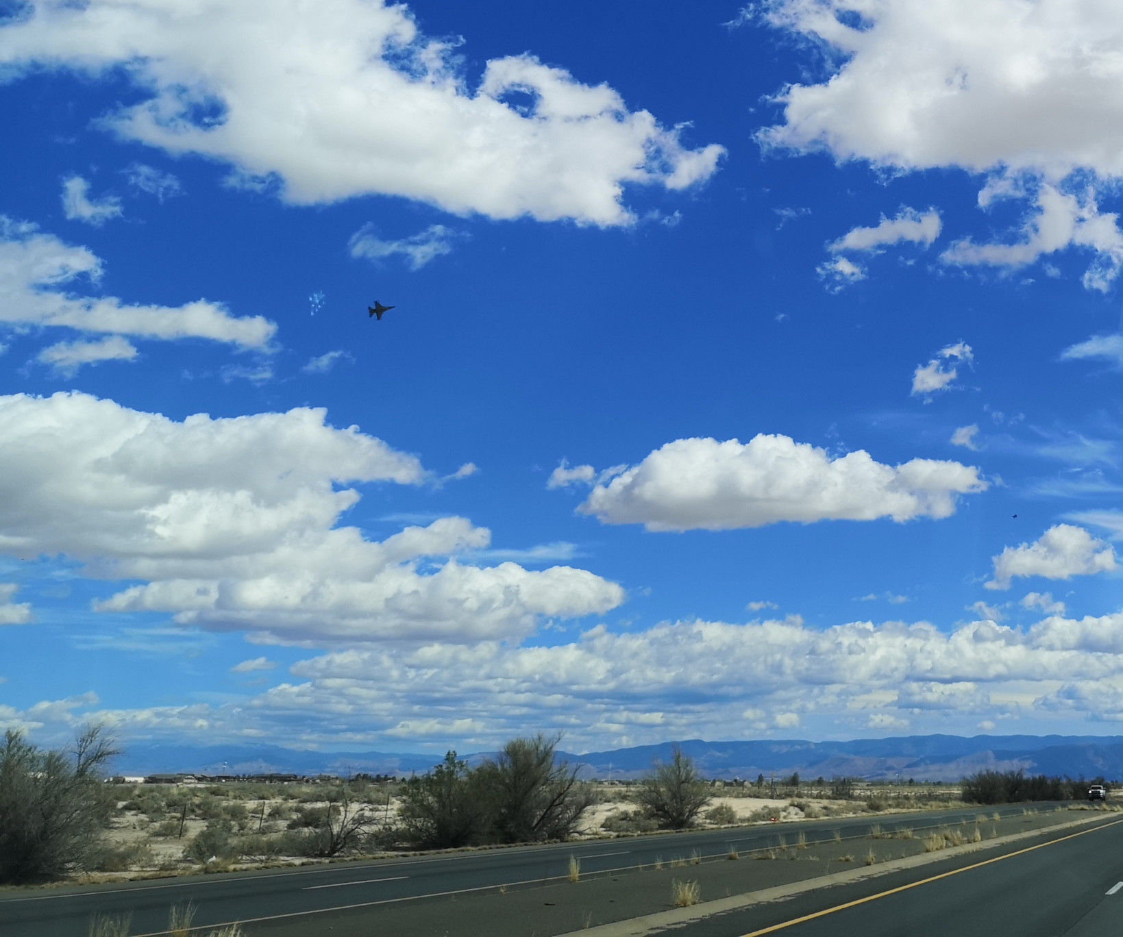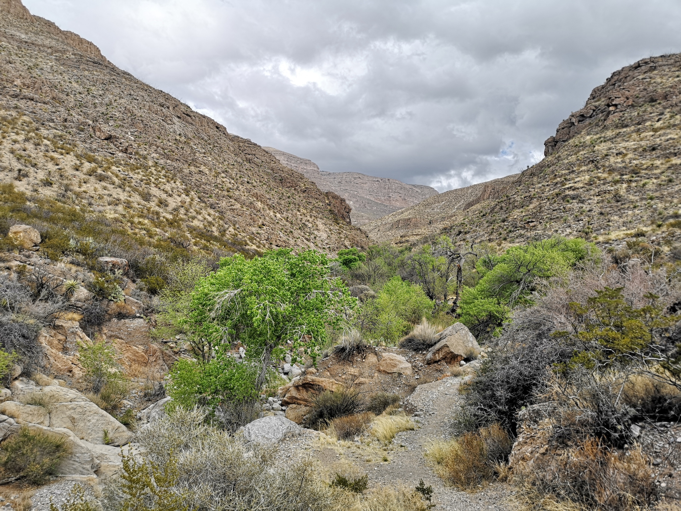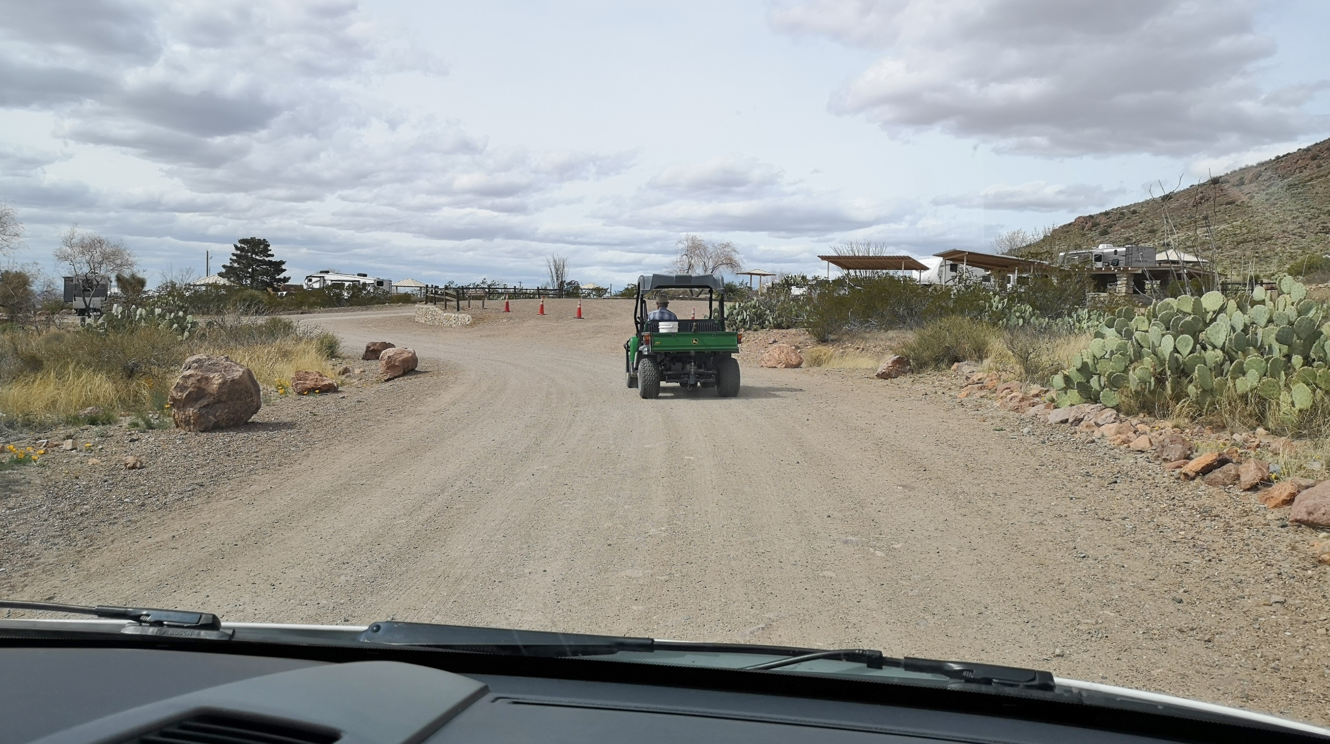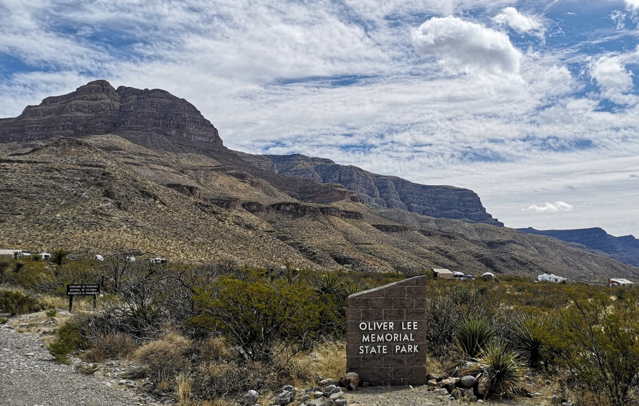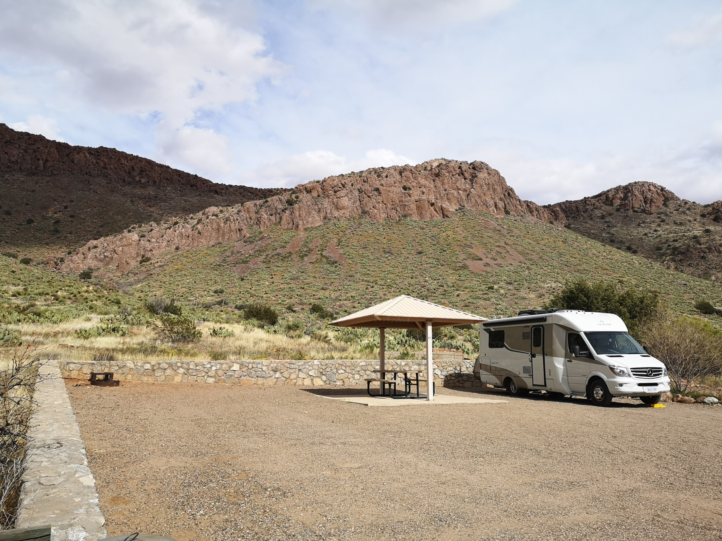 We were headed to Oliver Lee Memorial SP that only had first come first serve sites available, so we hit the road early in hopes of getting a site but also to avoid the wind that was coming in. On the way we drove by White Sands National Monument, but we could see that the wind was already starting to blow the sand around. We also saw the fighter jets practicing out of Holloman Air Force Base. All the sites at Oliver Lee were gone but they let us go in an overflow area for the night (which wasn’t very level). We have been to this park before but this time we did several different things. First was a short hike to Lawson’s Spring. You can tell where it was based on the green tress in the desert. One cool thing along the trail was finding the Torrey Yucca starting to bloom. There certainly wasn’t much water in the spring but that was to be expected. We saw another LTV in the campground and had a nice chat with Dawn and Kirby from Saskatchewan.