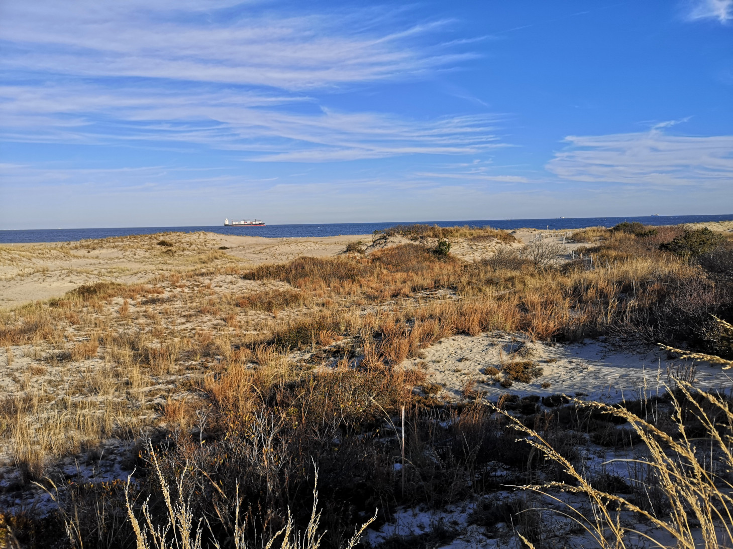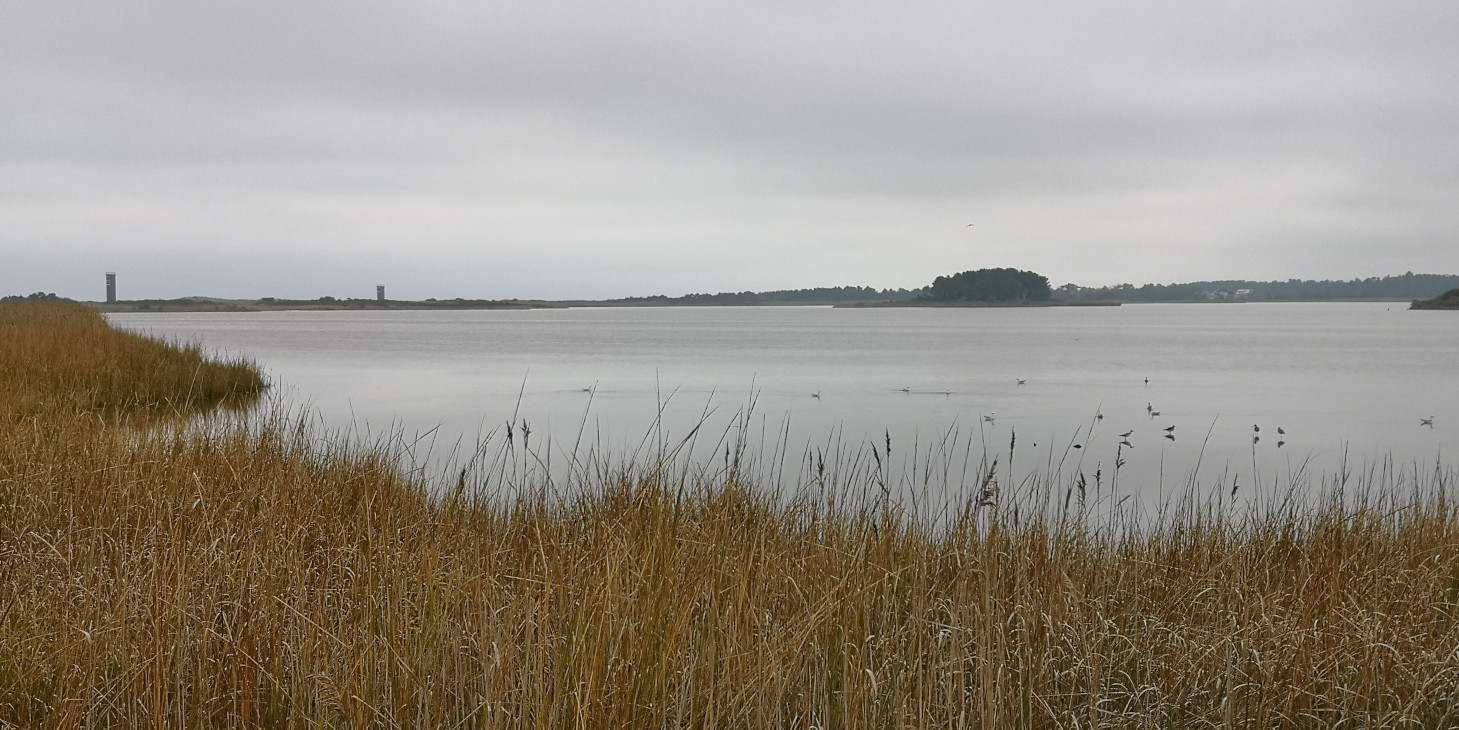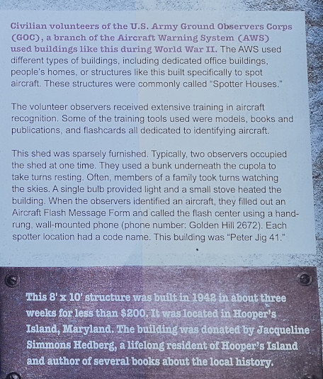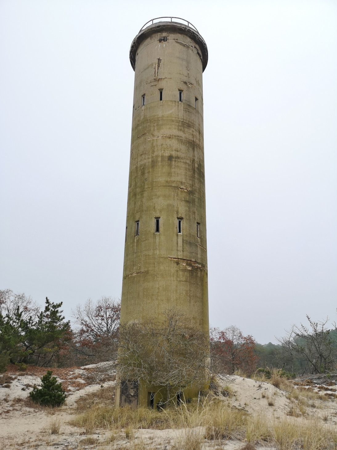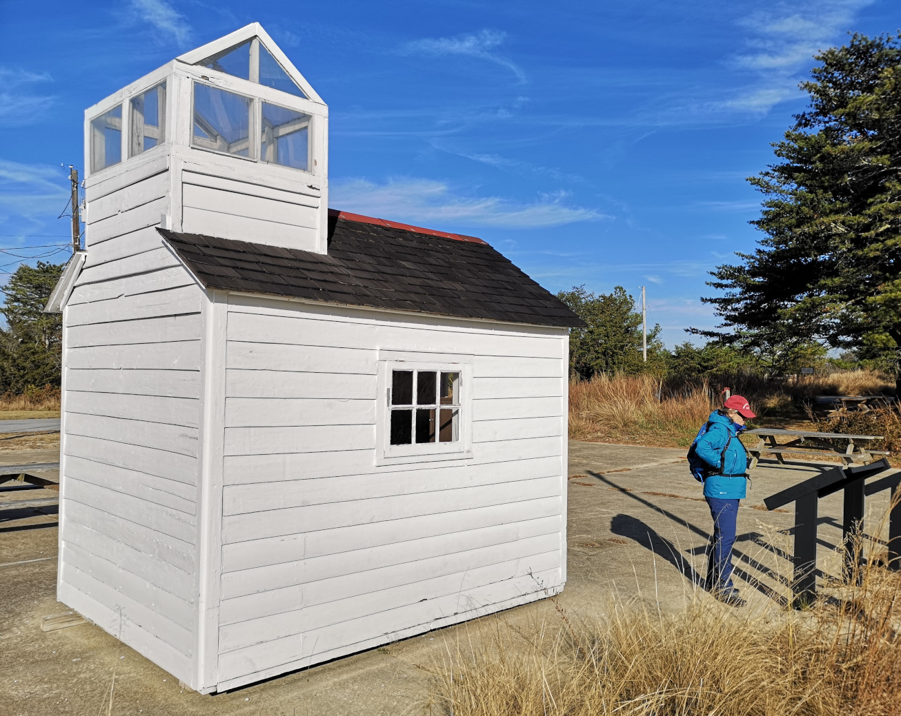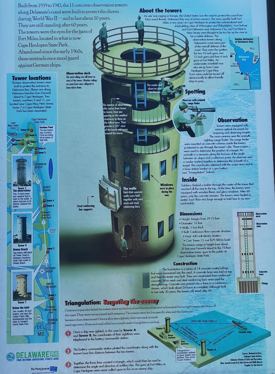 Our first day in Cape Henlopen was sunny so we did a 12 km hike to see the Observation Tower, the outside exhibits at Fort Miles and then walked around the Point on the beach. There are 11 concrete observation towers along the Delaware coast, built from 1939 to 1942 so they could watch out for any German ship attacks and in turn inform the gun posts in the Batteries along the coast. They were built to last 20 years but are still standing! We climbed to the top of the main tower so we could get a view of the park and coastline. Fort Miles consisted of the concrete buildings that were used to house the soldiers that manned the guns in Battery 519 and later were used as recreation area prior to the military donating the land for the State Park. On the grounds they have examples of all the different sized guns that were originally used at the Battery, the most impressive being the 16” gun that could actually fire up to 25 miles out to sea. The Fort also maintained a minefield that stretched between Cape Henlopen and Cape May to protect Delaware Bay. We also saw an example of a Spotter house that was used by volunteers to help triangulate sightings to any enemy ships so they could aim the guns properly.