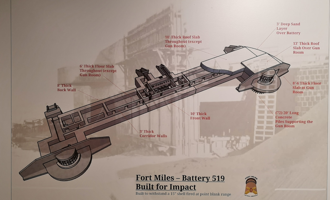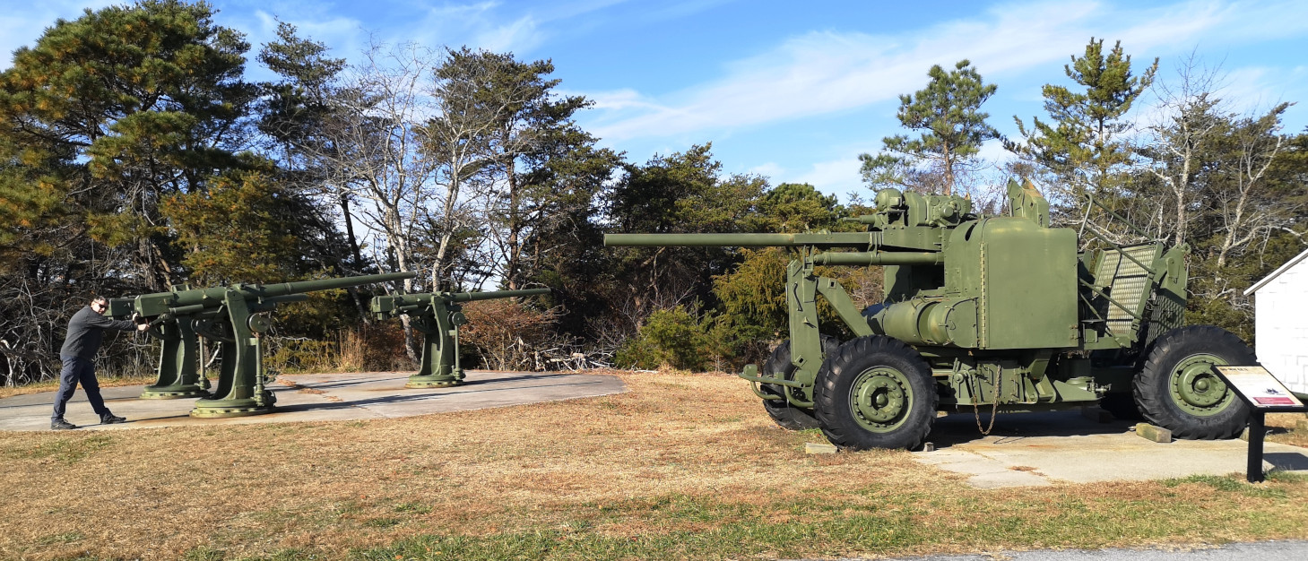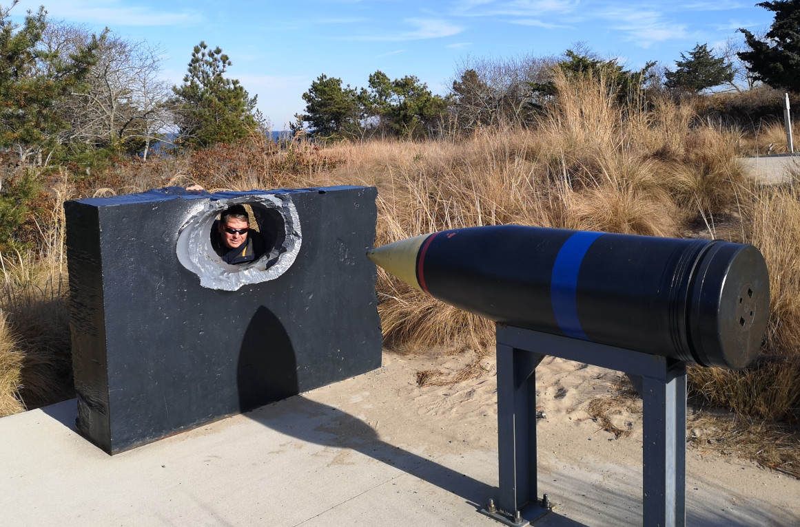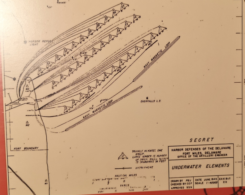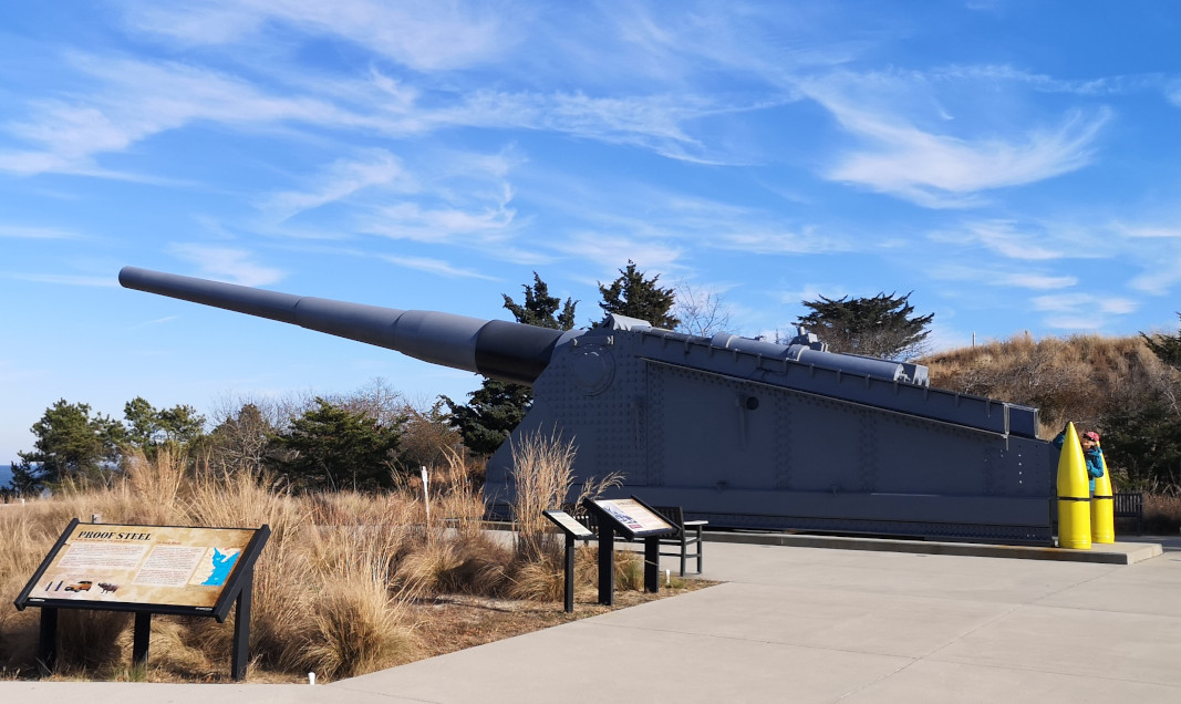 We found out they had a tour of the inside of Battery 519 the following day so we signed up for the $5-1 hour tour. We were a bit early arriving which gave us a chance to watch an old training video to teach the soldiers how to fire the 16” gun. It took 25 men with varying jobs to fire the guns. On the tour the volunteer guide explained about the depth of the concrete walls used to protect from enemy ship fire and also about the steel enclosed channel in the walls to hold the electrical cabling. The battery also had generator backup power so they could continue to operate if the power lines were taken out. They had a demonstration area of the plotting room where they used slide rules to calculate how to hit the ships that were spotted. The room would have been a half mile away in its own bunker. Then he showed us the powder room and the shell room where they had a hoist and rail system to move the shells to where the gun was located. In the gun room they showed us where they loaded the shells into the gun and they had a simulated firing button that Sharon got to press to let you hear 1/10th of the sound volume the guys had to listen to when a gun was fired. Of course, the 25 men had no ear protection so the majority of them completely damaged their hearing. The tour was excellent, and we were glad we had watched the video first. After the tour we went through the museum and there they had some examples of the mines that had been used to protect Delaware Bay.