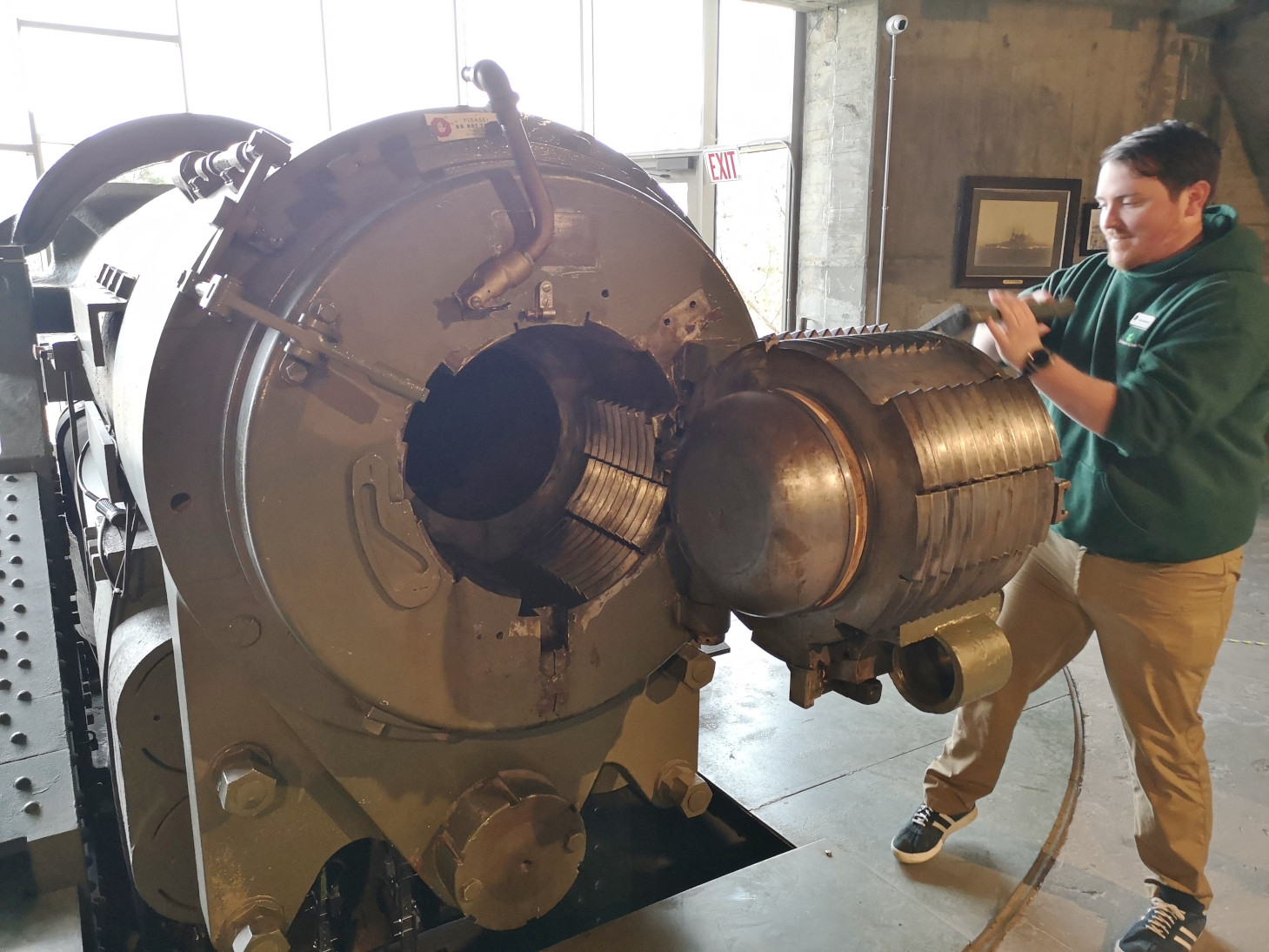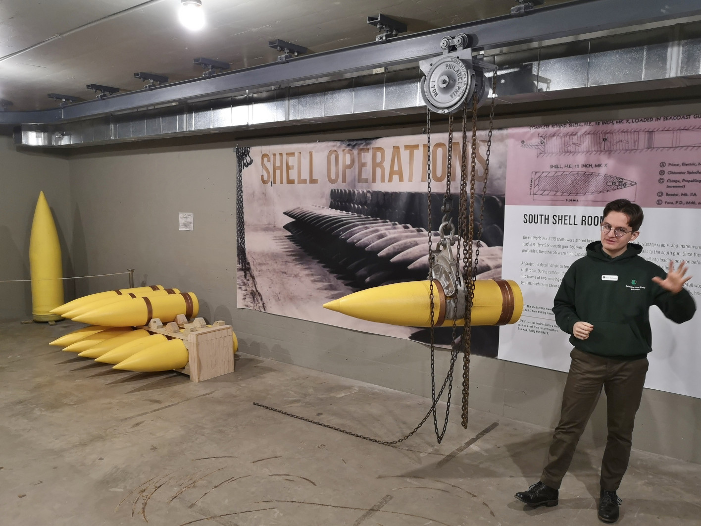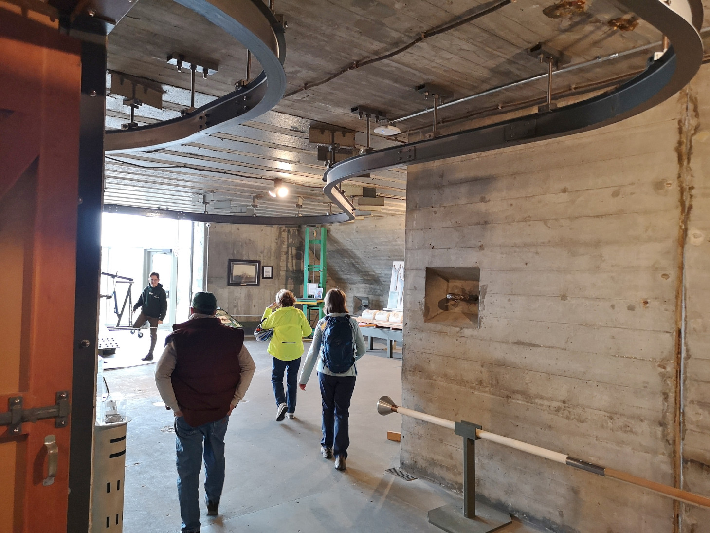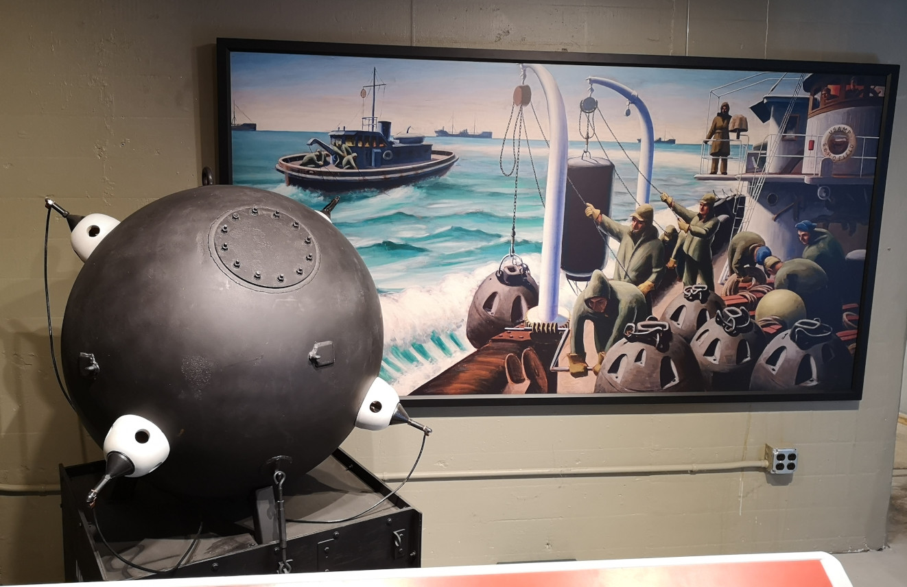 We found out they had a tour of the inside of Battery 519 the following day so we signed up for the $5-1 hour tour. We were a bit early arriving which gave us a chance to watch an old training video to teach the soldiers how to fire the 16” gun. It took 25 men with varying jobs to fire the guns. On the tour the volunteer guide explained about the depth of the concrete walls used to protect from enemy ship fire and also about the steel enclosed channel in the walls to hold the electrical cabling. The battery also had generator backup power so they could continue to operate if the power lines were taken out. They had a demonstration area of the plotting room where they used slide rules to calculate how to hit the ships that were spotted. The room would have been a half mile away in its own bunker. Then he showed us the powder room and the shell room where they had a hoist and rail system to move the shells to where the gun was located. In the gun room they showed us where they loaded the shells into the gun and they had a simulated firing button that Sharon got to press to let you hear 1/10th of the sound volume the guys had to listen to when a gun was fired. Of course, the 25 men had no ear protection so the majority of them completely damaged their hearing. The tour was excellent, and we were glad we had watched the video first. After the tour we went through the museum and there they had some examples of the mines that had been used to protect Delaware Bay.